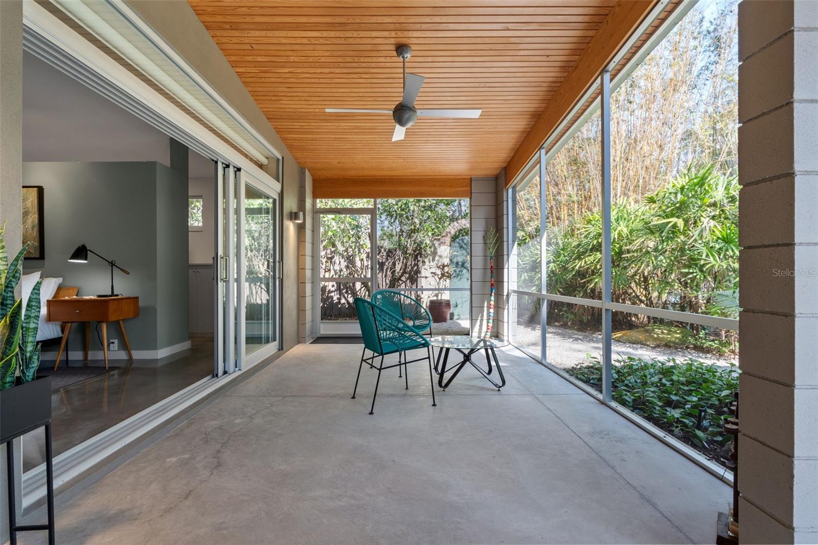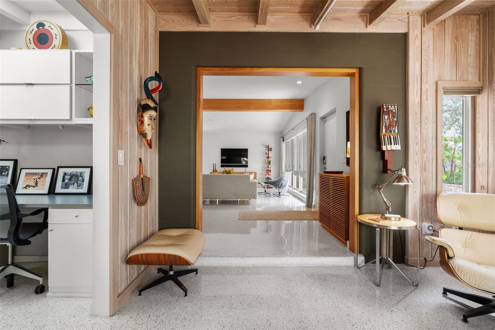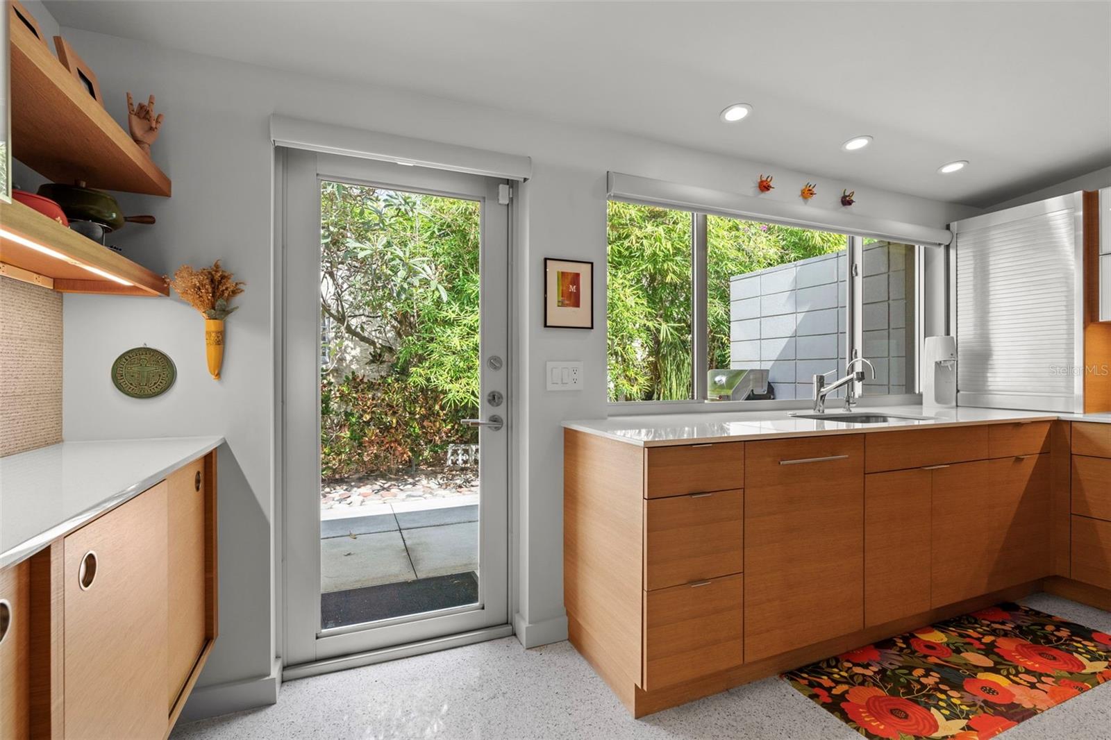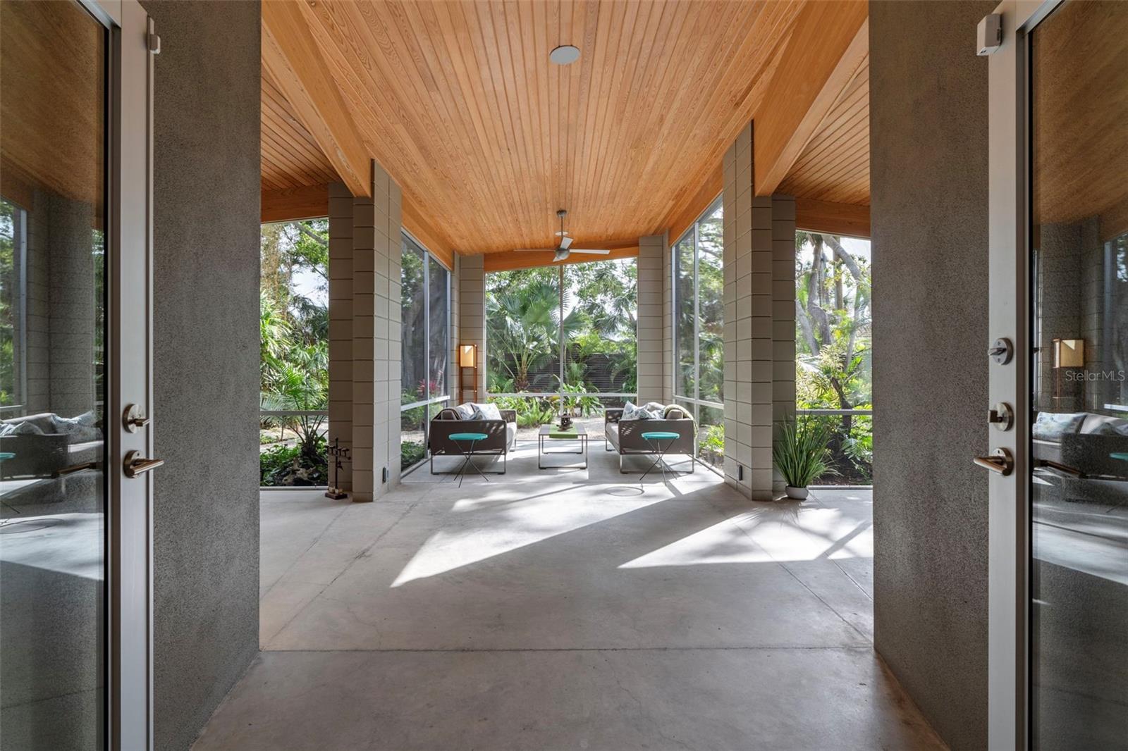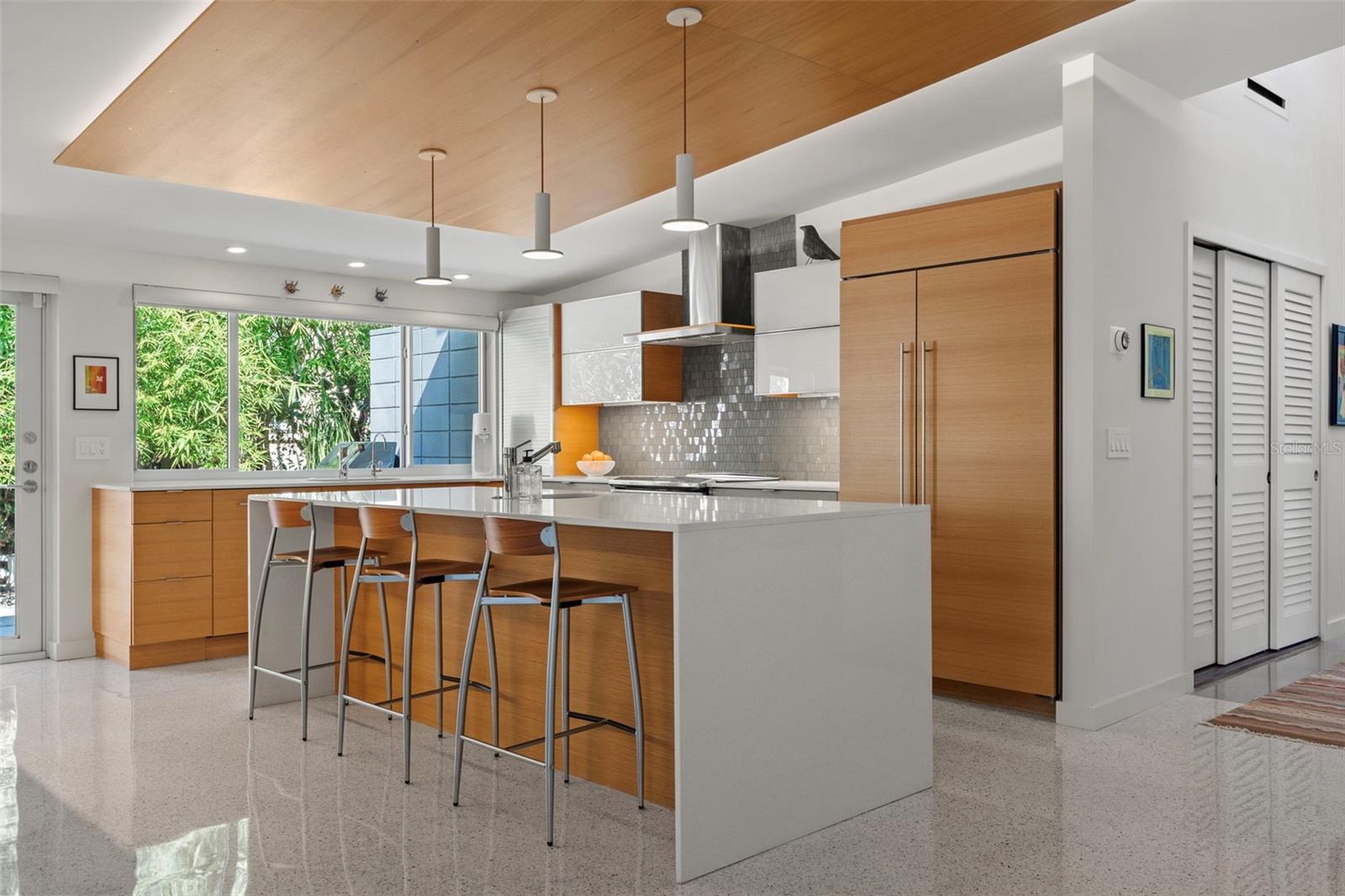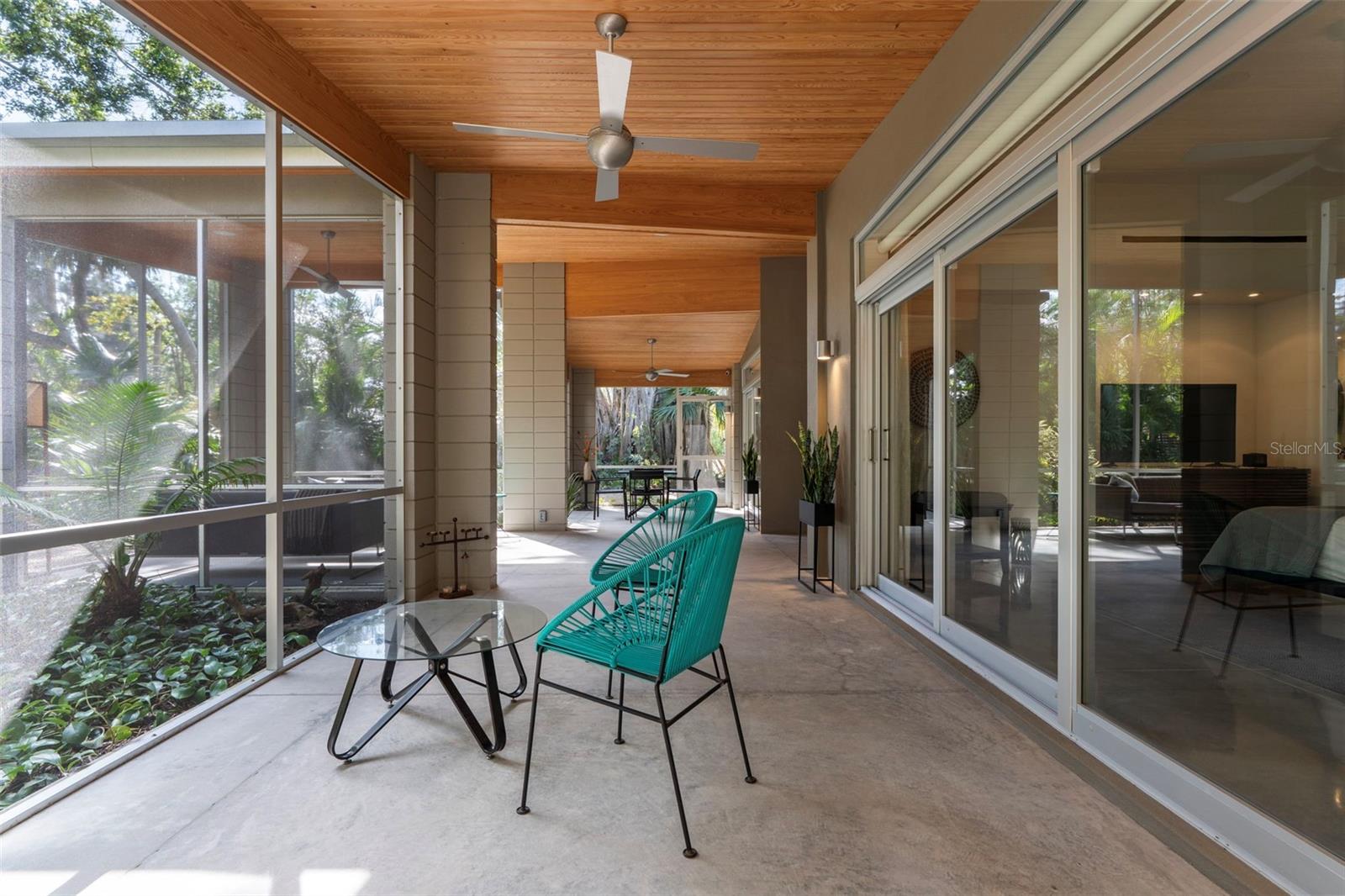 An inspirational property that epitomizes sophistication with a tranquil yet contemporary vibe. Expect to be wowed by this Venice Island gem. Originally a small 1959 structure, the property was dramatically expanded and completely renovated in 2014. This 2,285 square foot, 3 bedroom, 3.5 bath home hits a chord with those who understand what Florida mid-century homes can still aspire to be. The meticulously designed renovation, transformed a mid-century tract house into a beautiful Sarasota School of Architecture inspired home. Numerous honors for the renovation include winner of the 2016 American Institute of Architects Spirit of Sarasota Award to local architect Jon Barrick, SRQ Magazine Platinum Renovation Award and a feature article in Atomic Ranch Magazine. Located in the heart of Venezia Park Historic District, the home flows seamlessly, with windows & doors providing lush garden views from every room while maintaining privacy. There's a spacious living room, dining area, a timeless Florida Room, office, and a large open kitchen that includes rift cut white oak custom cabinets and floating ceiling, accentuated by the white quartz island and terrazzo floors. Adjacent to the art gallery-like hallway with clerestory windows and vaulted ceilings, are the three ensuite bedrooms with built-in cabinetry. The primary suite boasts a walk-in closet, soaker tub and a private outdoor shower. Two of the bedrooms have sliders out to the dramatic 700 square foot lanai with a soaring cypress tongue & groove ceiling. A brilliantly designed exterior by landscape architect Dane Spencer, includes a dramatic yet modest entry courtyard, stone paths that meander around stunning lush foliage that connects with secluded side patios. The pristine landscaping includes a bounty of tropical species including ferns, palms, crapes, oak and Cuban laurel trees. The garage is 1.5 car size, with workshop and built-in cabinets. The home is equipped with a Nuvo sound system, ADT alarm, art lighting, Rainbird sprinkler system, NEST temperature controls, Hunter Douglas window treatments, and an Ecowater filtration system in the kitchen. This home is being sold furnished with interesting contemporary and vintage pieces, and includes some art and personal items. An inventory list is available for review. This home is not in a flood zone - 16.75 elevation. Situated in Venice Island's most walkable neighborhood, everything one would desire, is within one mile of the home. Located between Venezia Park across the street and Blalock Park a half block north, the Cultural, Art & Library campus is around the corner and it is four blocks to downtown Venice where dining, entertainment, shopping, pickleball, and the weekly farmers market await you. You will find daily yoga, shark tooth hunting and the Sunday Drum circle less than a mile away at Venice Public Beach. Venice boasts excellent schools and the home is conveniently located near numerous medical facilities and the new Sarasota Memorial Hospital. Also, on Island is The Venice Municipal Airport, Freedom Boat and Venice Yacht Clubs, The Venice Golf Course and driving range (15 additional courses w/in 10 miles) and access to the 18-mile Legacy bike trail. This is the house you've been practicing for .
