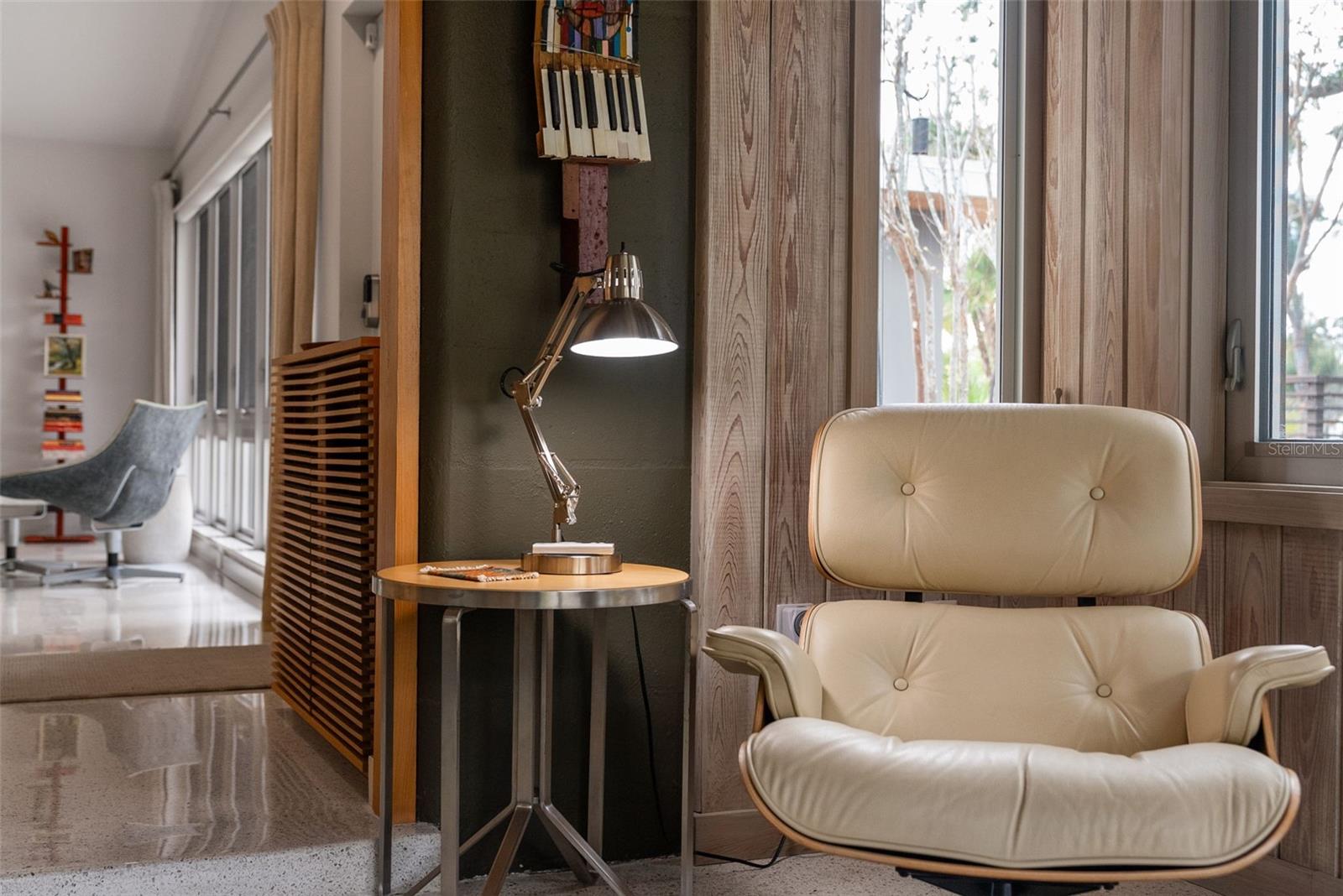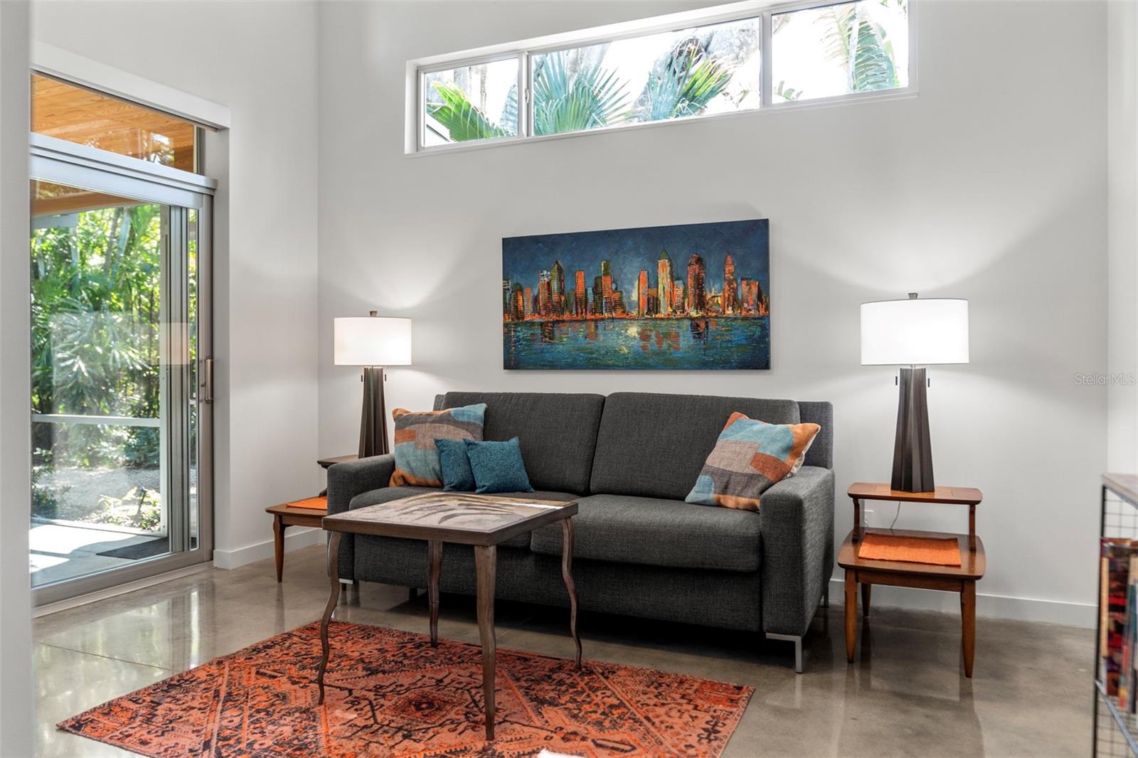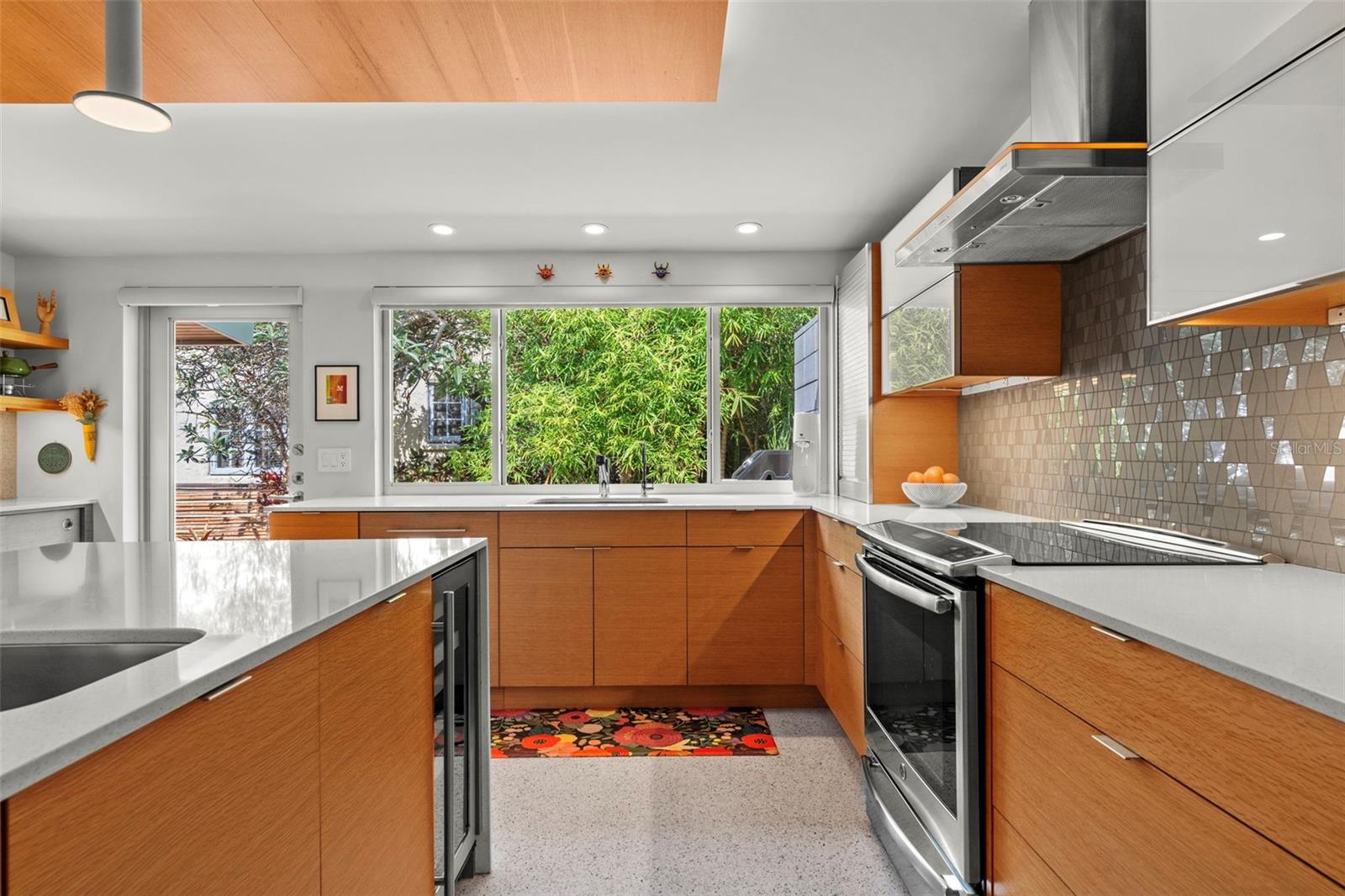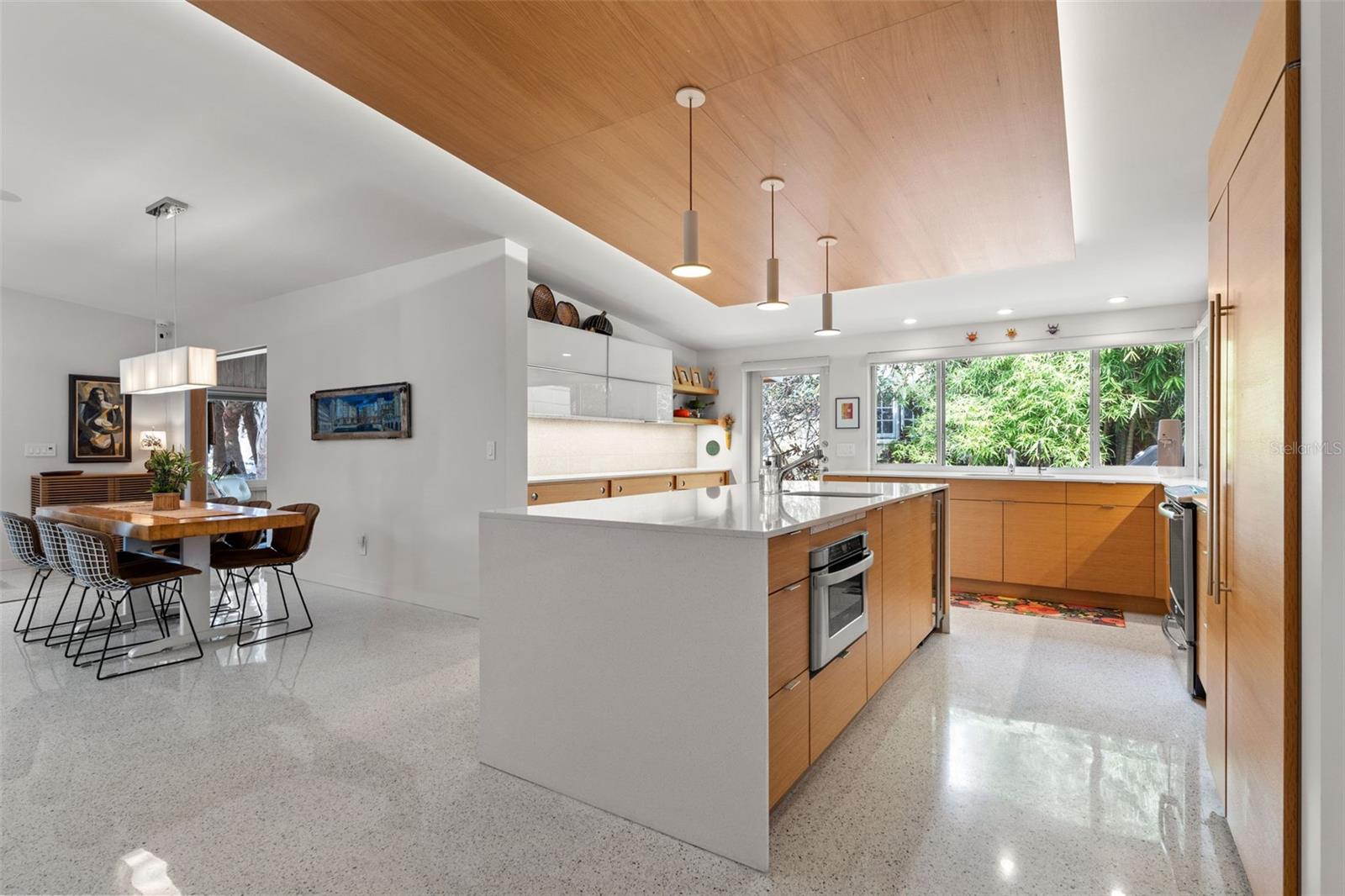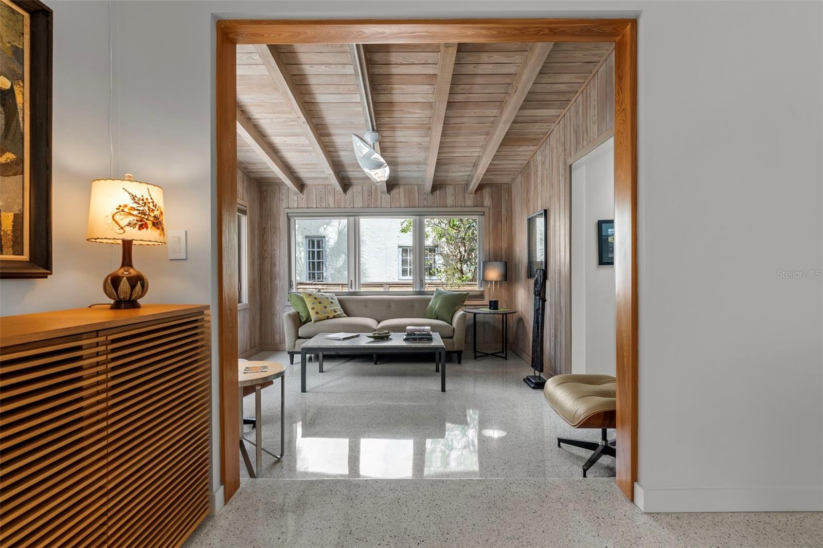 An inspirational property that epitomizes sophistication with a tranquil yet contemporary vibe. Expect to be wowed by this Venice Island gem. Originally a small 1959 structure, the property was dramatically expanded and completely renovated in 2014. This 2,285 square foot, 3 bedroom, 3.5 bath home hits a chord with those who understand what Florida mid-century homes can still aspire to be. The meticulously designed renovation, transformed a mid-century tract house into a beautiful Sarasota School of Architecture inspired home. Numerous honors for the renovation include winner of the 2016 American Institute of Architects Spirit of Sarasota Award to local architect Jon Barrick, SRQ Magazine Platinum Renovation Award and a feature article in Atomic Ranch Magazine. Located in the heart of Venezia Park Historic District, the home flows seamlessly, with windows & doors providing lush garden views from every room while maintaining privacy. There's a spacious living room, dining area, a timeless Florida Room, office, and a large open kitchen that includes rift cut white oak custom cabinets and floating ceiling, accentuated by the white quartz island and terrazzo floors. Adjacent to the art gallery-like hallway with clerestory windows and vaulted ceilings, are the three ensuite bedrooms with built-in cabinetry. The primary suite boasts a walk-in closet, soaker tub and a private outdoor shower. Two of the bedrooms have sliders out to the dramatic 700 square foot lanai with a soaring cypress tongue & groove ceiling. A brilliantly designed exterior by landscape architect Dane Spencer, includes a dramatic yet modest entry courtyard, stone paths that meander around stunning lush foliage that connects with secluded side patios. The pristine landscaping includes a bounty of tropical species including ferns, palms, crapes, oak and Cuban laurel trees. The garage is 1.5 car size, with workshop and built-in cabinets. The home is equipped with a Nuvo sound system, ADT alarm, art lighting, Rainbird sprinkler system, NEST temperature controls, Hunter Douglas window treatments, and an Ecowater filtration system in the kitchen. This home is being sold furnished with interesting contemporary and vintage pieces, and includes some art and personal items. An inventory list is available for review. This home is not in a flood zone - 16.75 elevation. Situated in Venice Island's most walkable neighborhood, everything one would desire, is within one mile of the home. Located between Venezia Park across the street and Blalock Park a half block north, the Cultural, Art & Library campus is around the corner and it is four blocks to downtown Venice where dining, entertainment, shopping, pickleball, and the weekly farmers market await you. You will find daily yoga, shark tooth hunting and the Sunday Drum circle less than a mile away at Venice Public Beach. Venice boasts excellent schools and the home is conveniently located near numerous medical facilities and the new Sarasota Memorial Hospital. Also, on Island is The Venice Municipal Airport, Freedom Boat and Venice Yacht Clubs, The Venice Golf Course and driving range (15 additional courses w/in 10 miles) and access to the 18-mile Legacy bike trail. This is the house you've been practicing for .