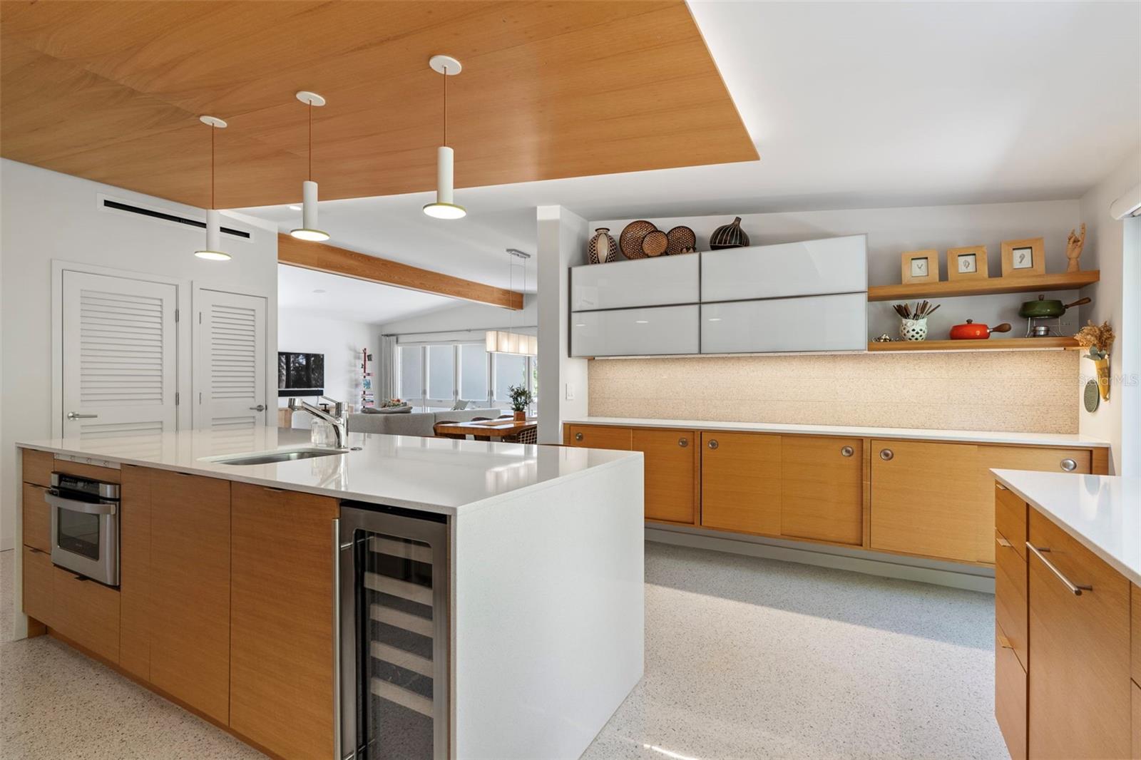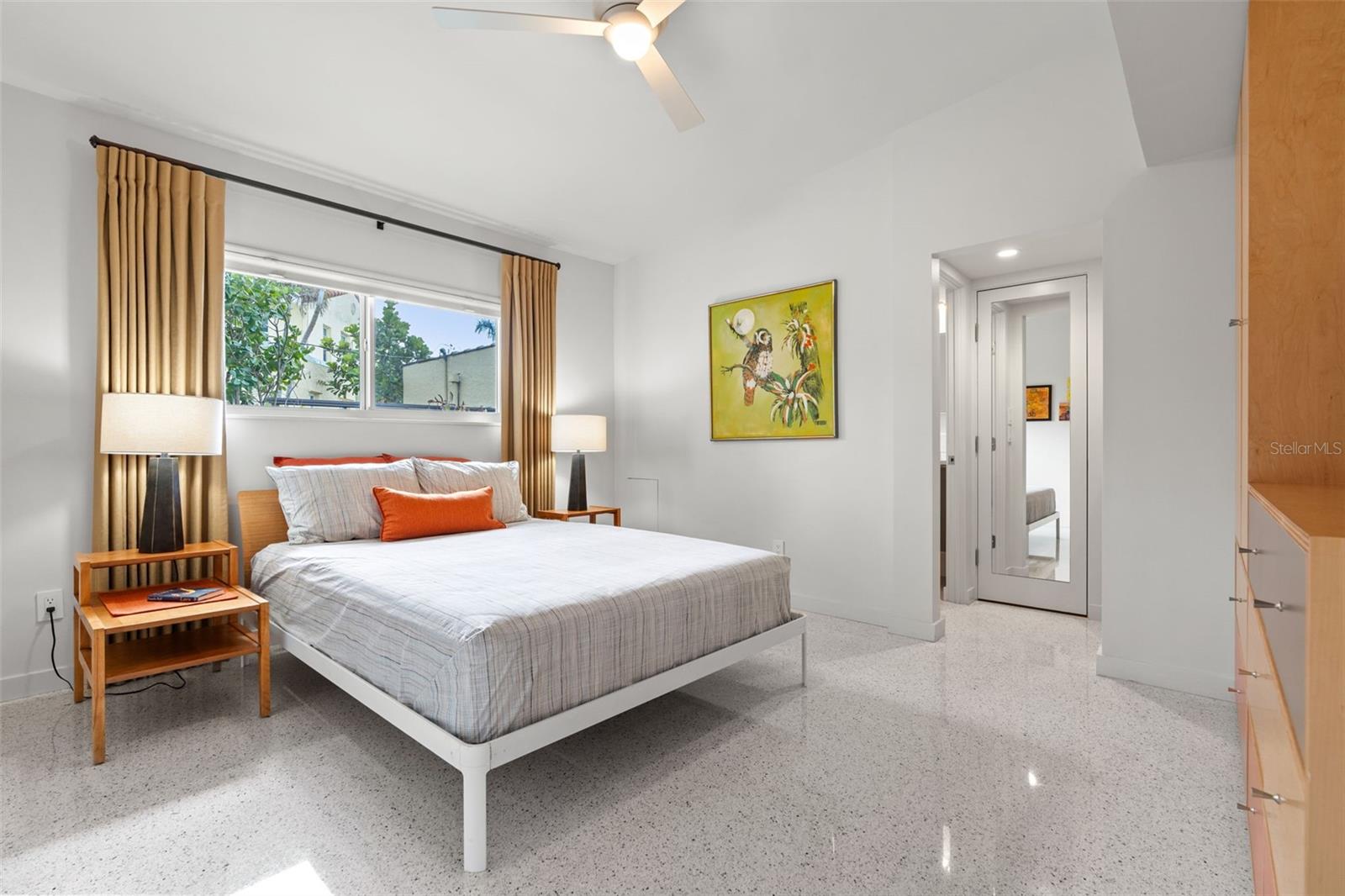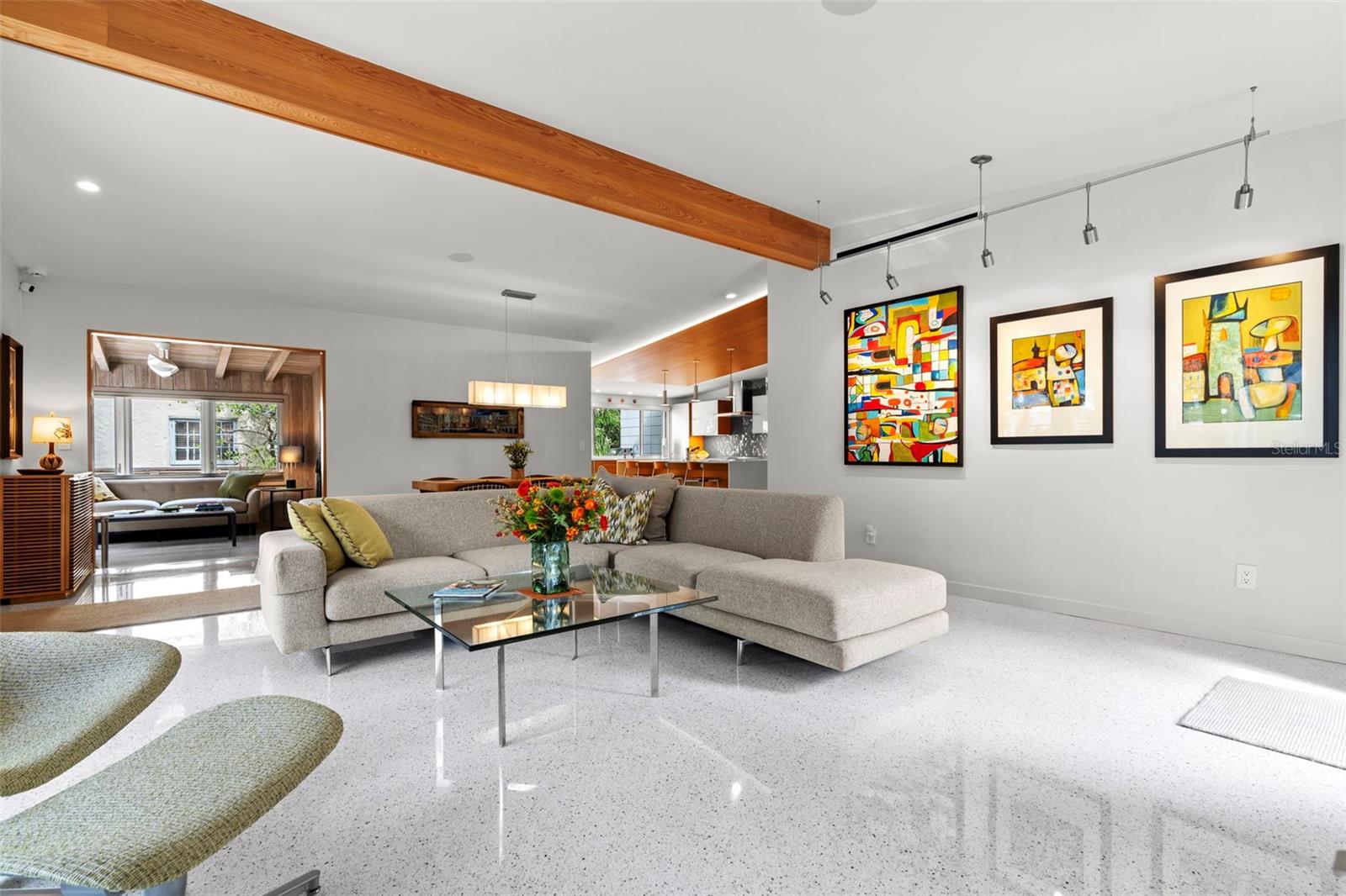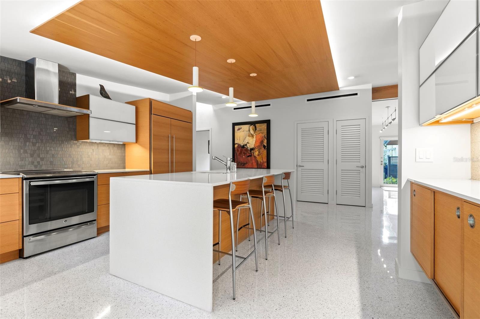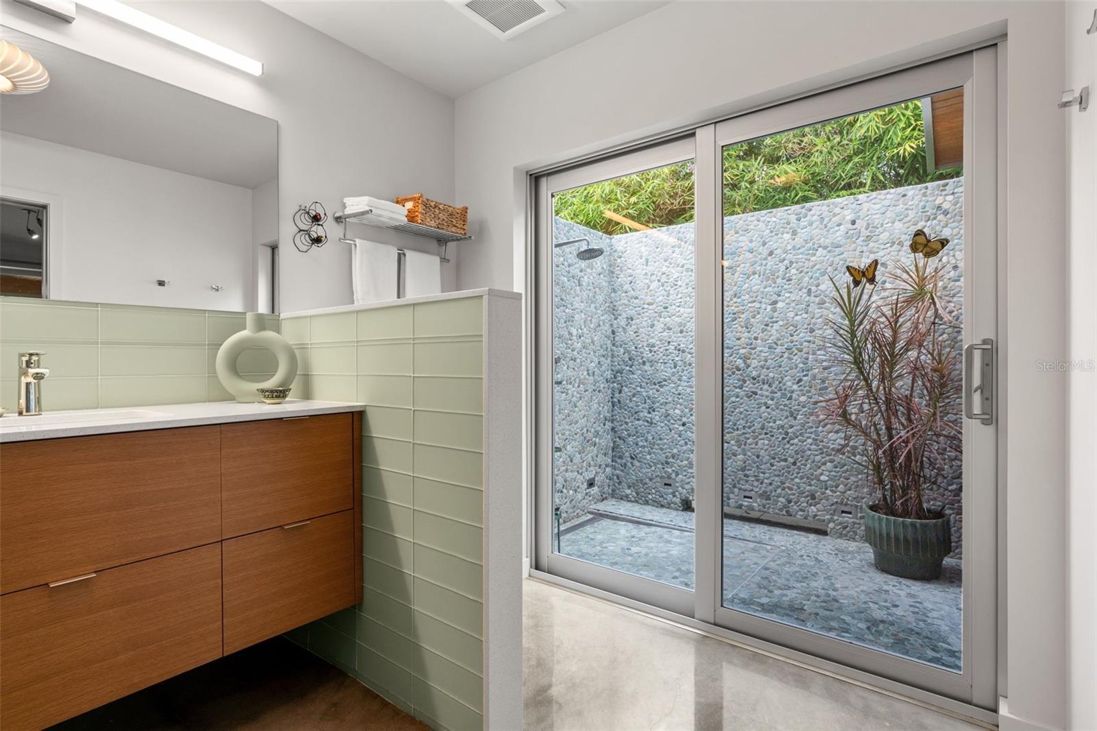 An inspirational property that epitomizes sophistication with a tranquil yet contemporary vibe. Expect to be wowed by this Venice Island gem. Originally a small 1959 structure, the property was dramatically expanded and completely renovated in 2014. This 2,285 square foot, 3 bedroom, 3.5 bath home hits a chord with those who understand what Florida mid-century homes can still aspire to be. The meticulously designed renovation, transformed a mid-century tract house into a beautiful Sarasota School of Architecture inspired home. Numerous honors for the renovation include winner of the 2016 American Institute of Architects Spirit of Sarasota Award to local architect Jon Barrick, SRQ Magazine Platinum Renovation Award and a feature article in Atomic Ranch Magazine. Located in the heart of Venezia Park Historic District, the home flows seamlessly, with windows & doors providing lush garden views from every room while maintaining privacy. There's a spacious living room, dining area, a timeless Florida Room, office, and a large open kitchen that includes rift cut white oak custom cabinets and floating ceiling, accentuated by the white quartz island and terrazzo floors. Adjacent to the art gallery-like hallway with clerestory windows and vaulted ceilings, are the three ensuite bedrooms with built-in cabinetry. The primary suite boasts a walk-in closet, soaker tub and a private outdoor shower. Two of the bedrooms have sliders out to the dramatic 700 square foot lanai with a soaring cypress tongue & groove ceiling. A brilliantly designed exterior by landscape architect Dane Spencer, includes a dramatic yet modest entry courtyard, stone paths that meander around stunning lush foliage that connects with secluded side patios. The pristine landscaping includes a bounty of tropical species including ferns, palms, crapes, oak and Cuban laurel trees. The garage is 1.5 car size, with workshop and built-in cabinets. The home is equipped with a Nuvo sound system, ADT alarm, art lighting, Rainbird sprinkler system, NEST temperature controls, Hunter Douglas window treatments, and an Ecowater filtration system in the kitchen. This home is being sold furnished with interesting contemporary and vintage pieces, and includes some art and personal items. An inventory list is available for review. This home is not in a flood zone - 16.75 elevation. Situated in Venice Island's most walkable neighborhood, everything one would desire, is within one mile of the home. Located between Venezia Park across the street and Blalock Park a half block north, the Cultural, Art & Library campus is around the corner and it is four blocks to downtown Venice where dining, entertainment, shopping, pickleball, and the weekly farmers market await you. You will find daily yoga, shark tooth hunting and the Sunday Drum circle less than a mile away at Venice Public Beach. Venice boasts excellent schools and the home is conveniently located near numerous medical facilities and the new Sarasota Memorial Hospital. Also, on Island is The Venice Municipal Airport, Freedom Boat and Venice Yacht Clubs, The Venice Golf Course and driving range (15 additional courses w/in 10 miles) and access to the 18-mile Legacy bike trail. This is the house you've been practicing for .