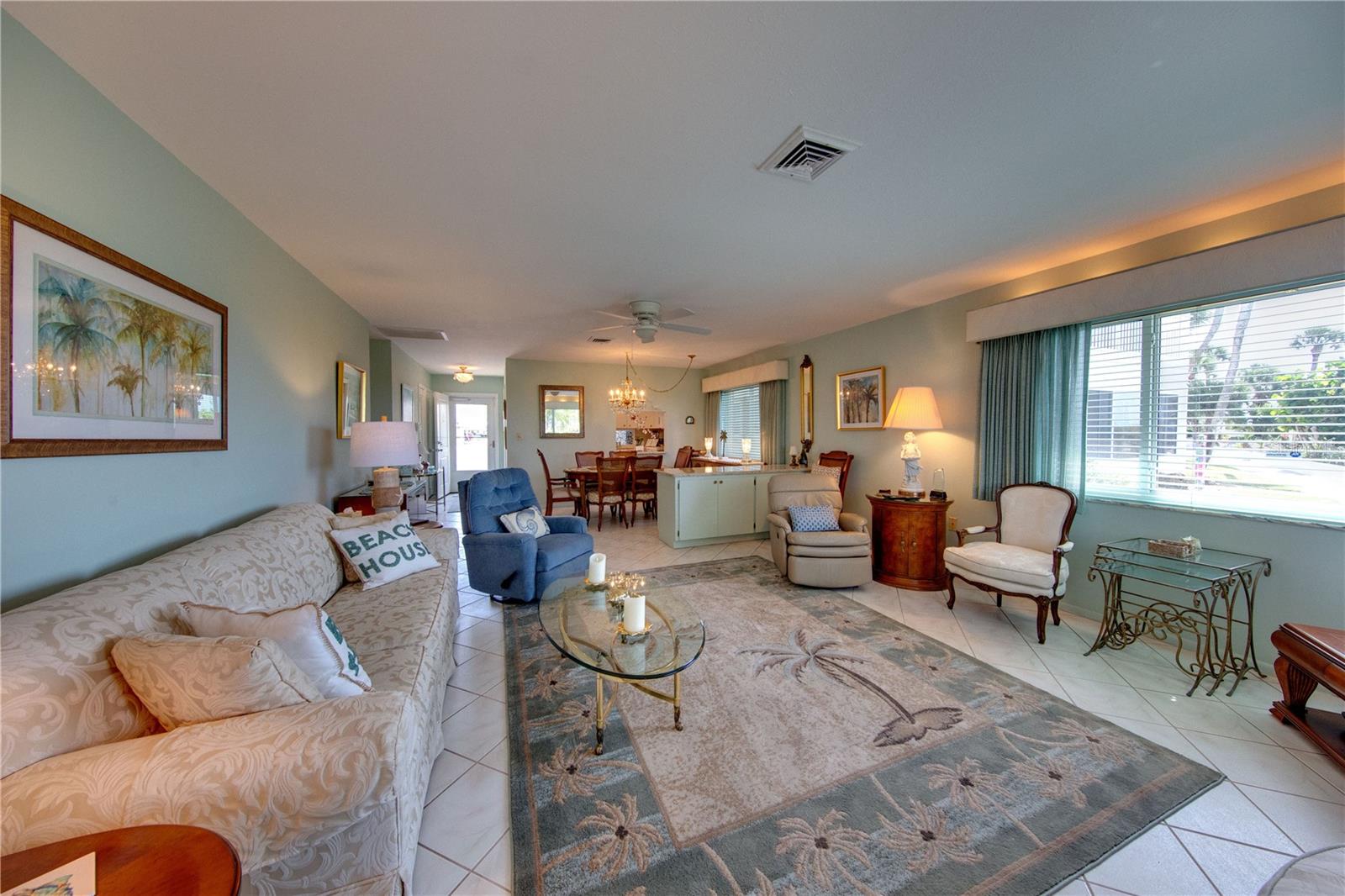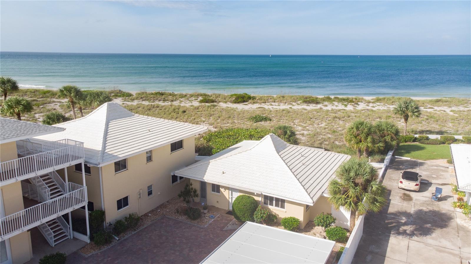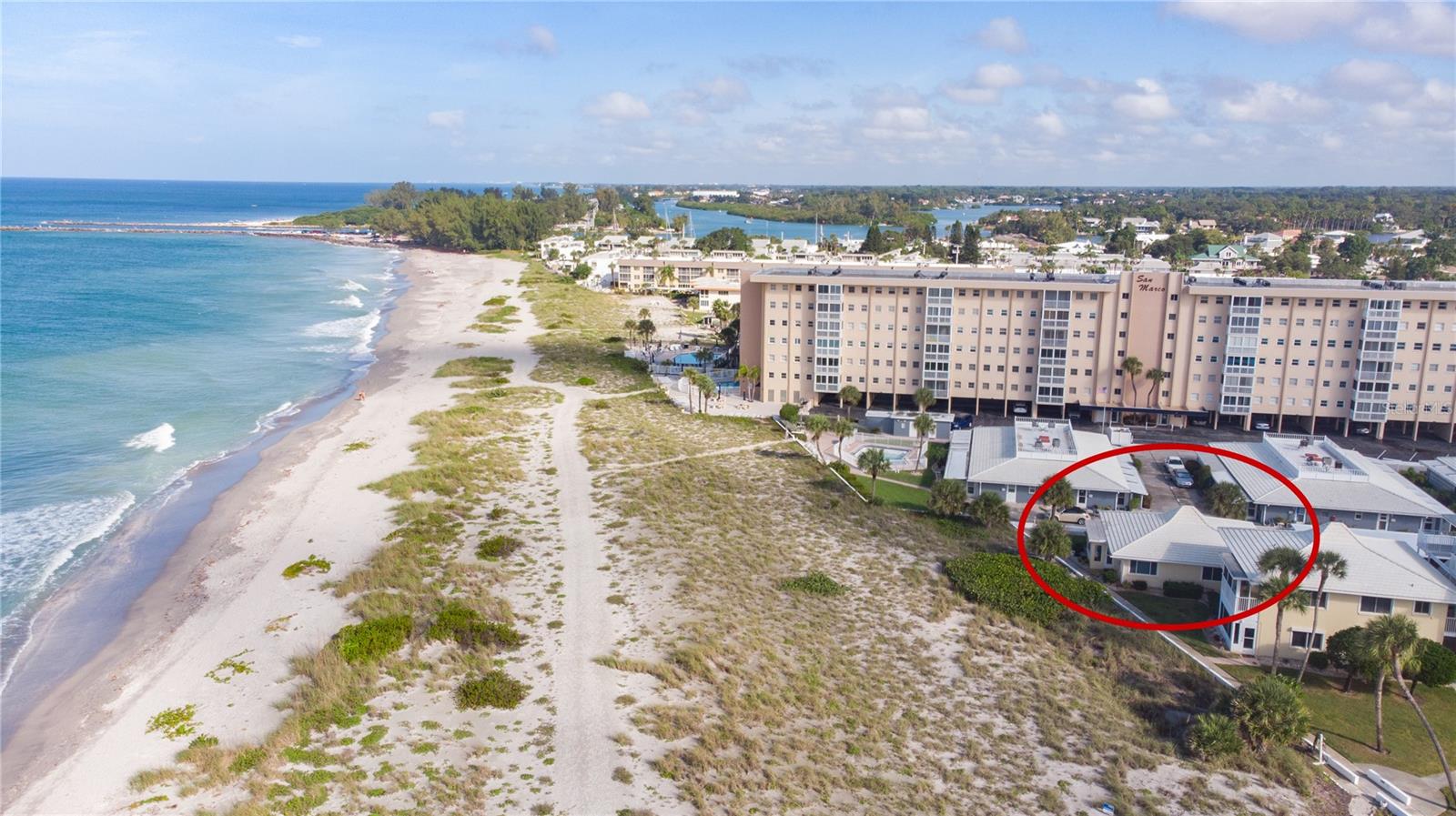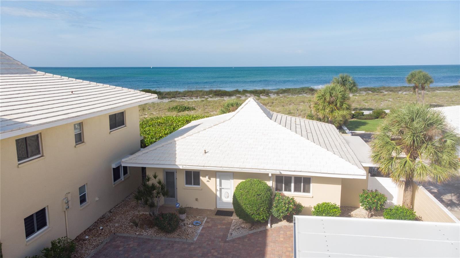 Just steps to beautiful Venice Beach, this spacious TURNKEY FURNISHED villa with 2 bedrooms & 2 baths is gem & a rarity in Venice! It’s one of the very few free-standing one-story condos & has its own washer & dryer. The Master bedroom has a king-sized bed with 2 closets & built-in drawers. The Guest bedroom has a double bed. The Living room has a sofa bed for guests. While part of the Chateaugay condo high-rise complex, you will have the privacy of a stand-alone one-level living villa. Want to cook? There is a granite countertop, bright kitchen with all the utensils and appliances that you can imagine. There is a smart TV with cable & Wi-Fi. The bright & cheerful Florida room has large windows and access door to outdoors. There is also an attached exterior storage room and screened porch for your bikes & toys. This villa has a dune & sunset view with a private beach access point. There is one designated covered parking space right outside the front door. With 2 designated guest parking spaces on the property. Watch the most gorgeous sunsets from your beach chair while tickling your toes in the warm Gulf. Chateaugy is a very social community with sunset cocktails, under the stars movie nights, book & card clubs and food truck get togethers, heated pool, grill, and possible soon to come bocce court. All the charm of Venice Island, with its free beaches, top-notch restaurants & shopping, is there for the taking! If you want to say, “I could live there,” this is a MUST SEE. Roof replaced in late 2022, A/C replaced in 2024, and updated plumbing 8/24. Service animals meeting certain criteria allowed. Private appraisal in January stated market value at $1,125,000 wth heated area as 1324 SqFt.