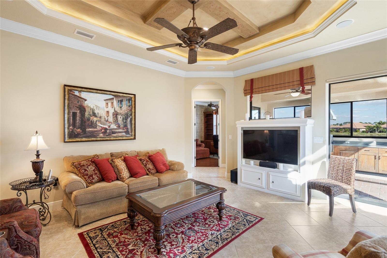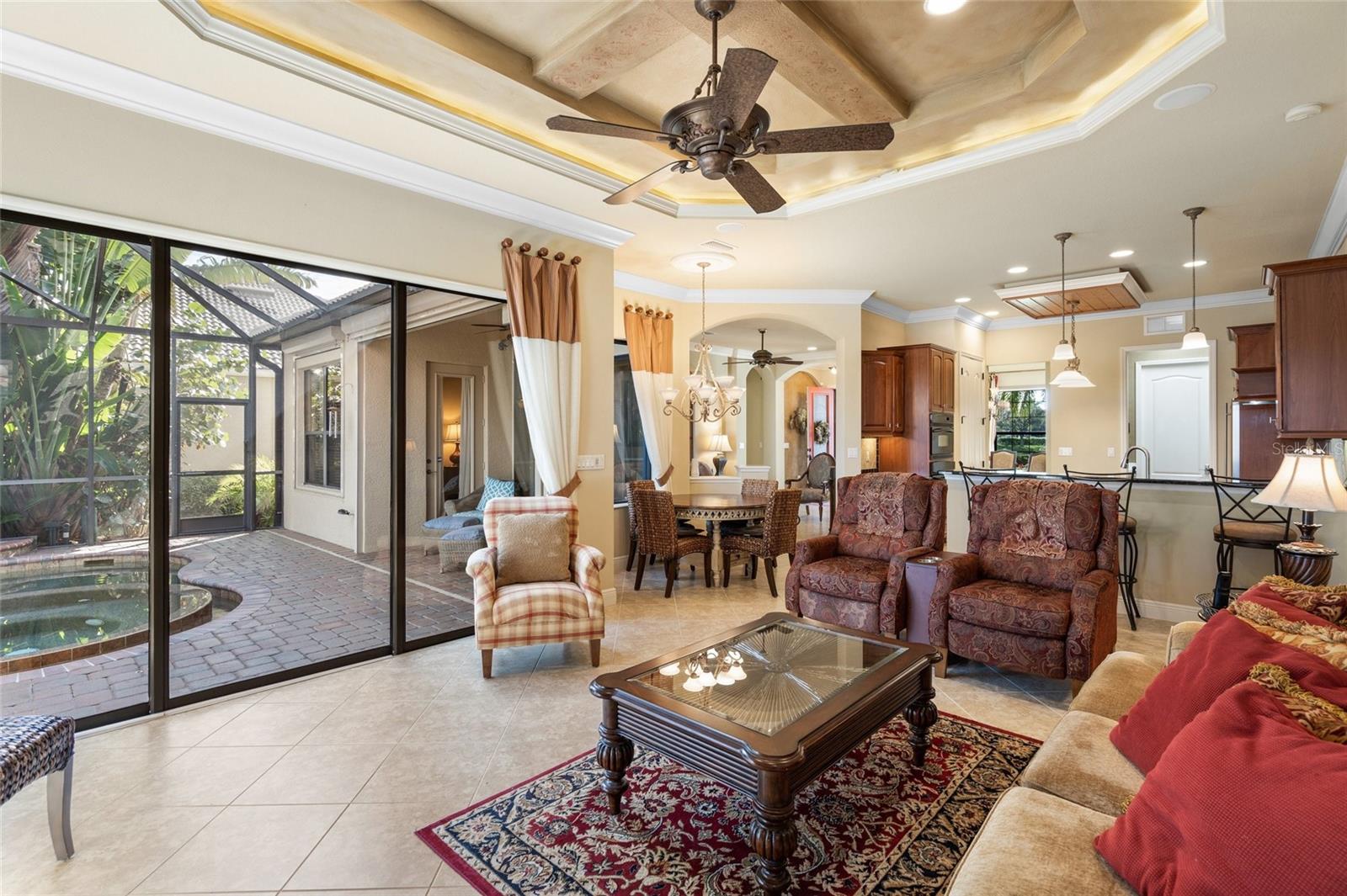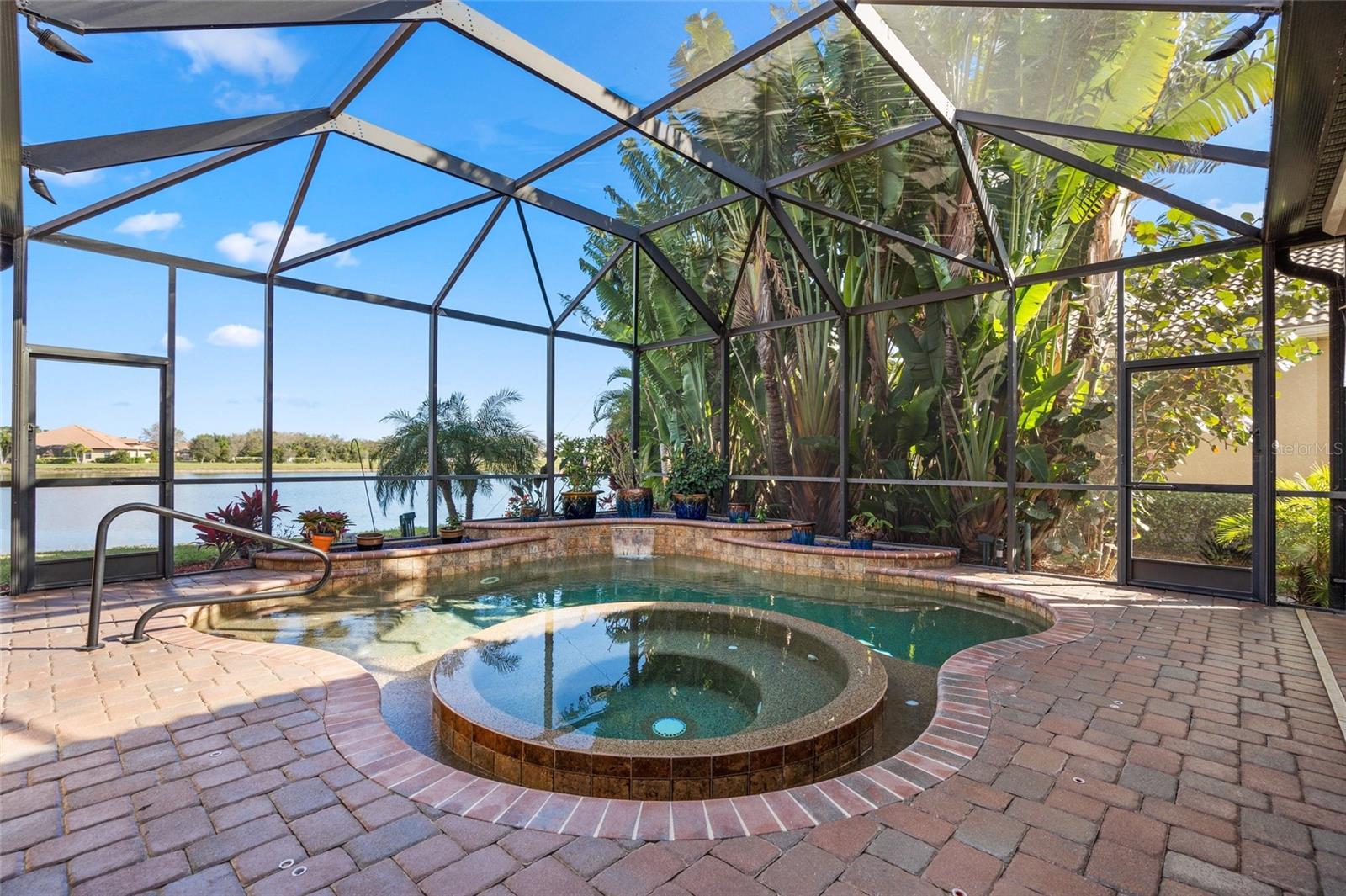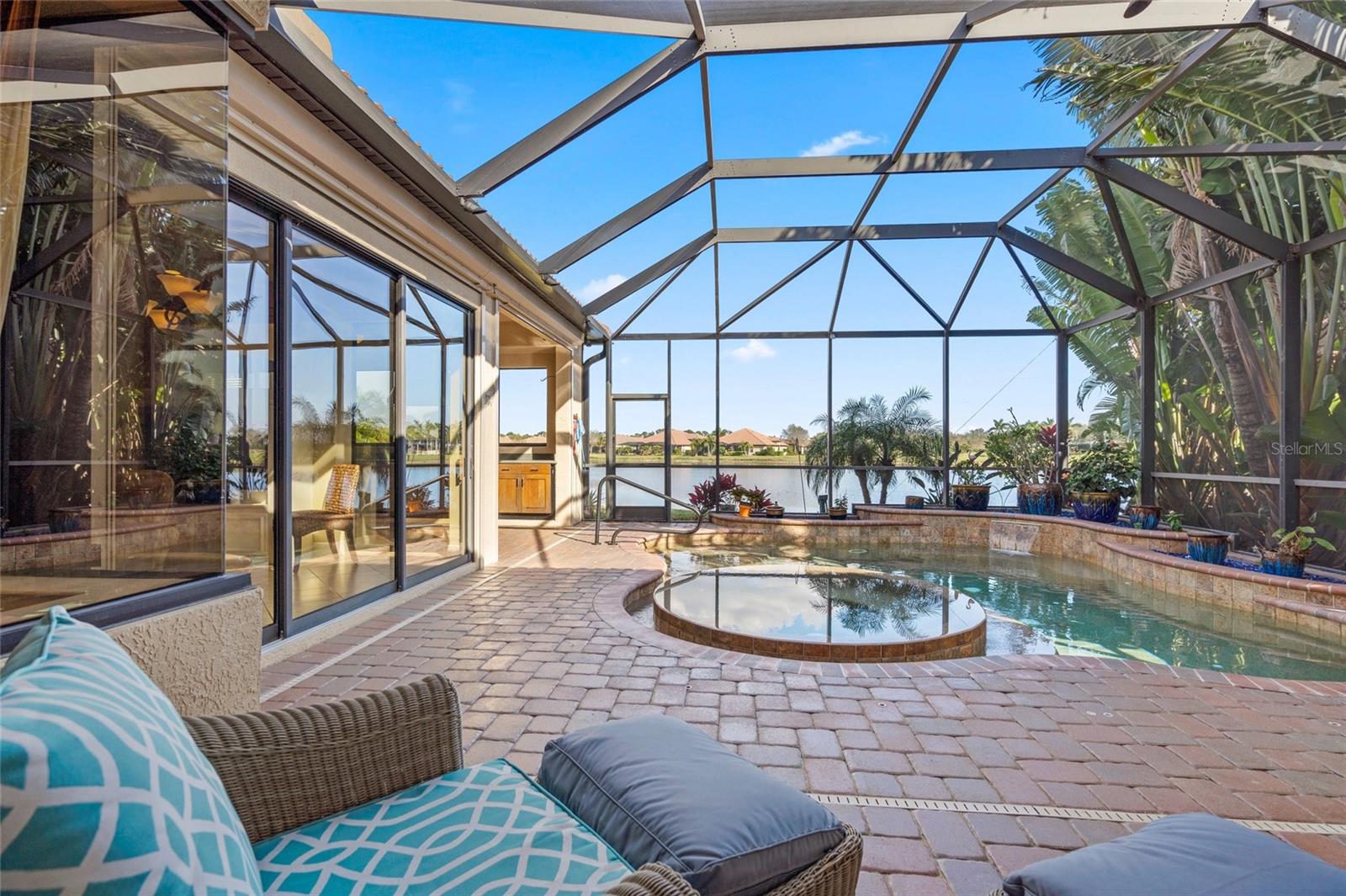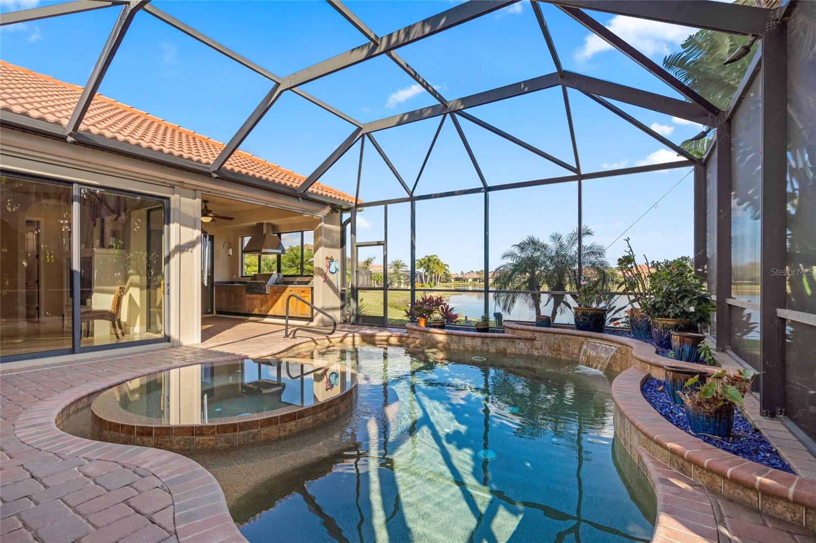 Welcome Home to the beautiful gated community of Gran Paradiso, located just south of Venice in Wellen Park. This stunning, well-built estate home is a former model built by Lee Wetherington, and is one of only a handful of custom Lee Wetherington homes built in Gran Paradiso. This property has a unique setting with a water view both in front and in the rear of the home. Lee Wetherington's Ariel model was built for the buyer who appreciates quality. Step inside and you are greeted with a spectacular marble inlay design on the floor that is truly a work of art. The gourmet kitchen holds top-of-the line appliances, granite countertops, and cherry wood cabinets. This model has four bedrooms, one of which features custom designed cabinetry which could transform the bedroom into a den or home office. The primary bedroom is spacious with a sitting area to hide away, read or just relax. The primary bedroom closets have been custom designed to maximize the space efficiently. The bedrooms all feature wood flooring with the rest of the home featuring porcelain tile. The primary bath has a glass block Roman shower (which is one of the Lee Wetherington signatures), dual sinks with a vanity and chair, and a large whirlpool tub. The split floor plan of this home is a great feature, especially when family and guests come to visit, offering privacy for all. One of the beautiful, custom designed bathrooms features a Bidet Commode. The lanai and pool area have a built-in kitchen, with teakwood cabinetry in a tropical setting that offers total privacy. The custom saltwater pool and spa have a brand new AquaCal heater. As a bonus, you'll have a perfect view of the fireworks from Atlanta Braves Stadium in Wellen Park! This fully furnished home has a new hot water heater, a whole-house water system, Simply Safe alarm system on windows and doors, and impact windows in the front of the home. For peace of mind there is a 20 KW whole-house propane gas Kohler generator with an auto transfer switch and a buried 500 lb. supply tank. In addition, you will find Storm Smart roll-down fabric hurricane screens (some motorized) at all other openings, including a motorized metal roll-down panel for the beveled glass front door. The seller has graciously paid off the CDD bonds. This beautiful home is within walking distance of the community clubhouse and all amenities.