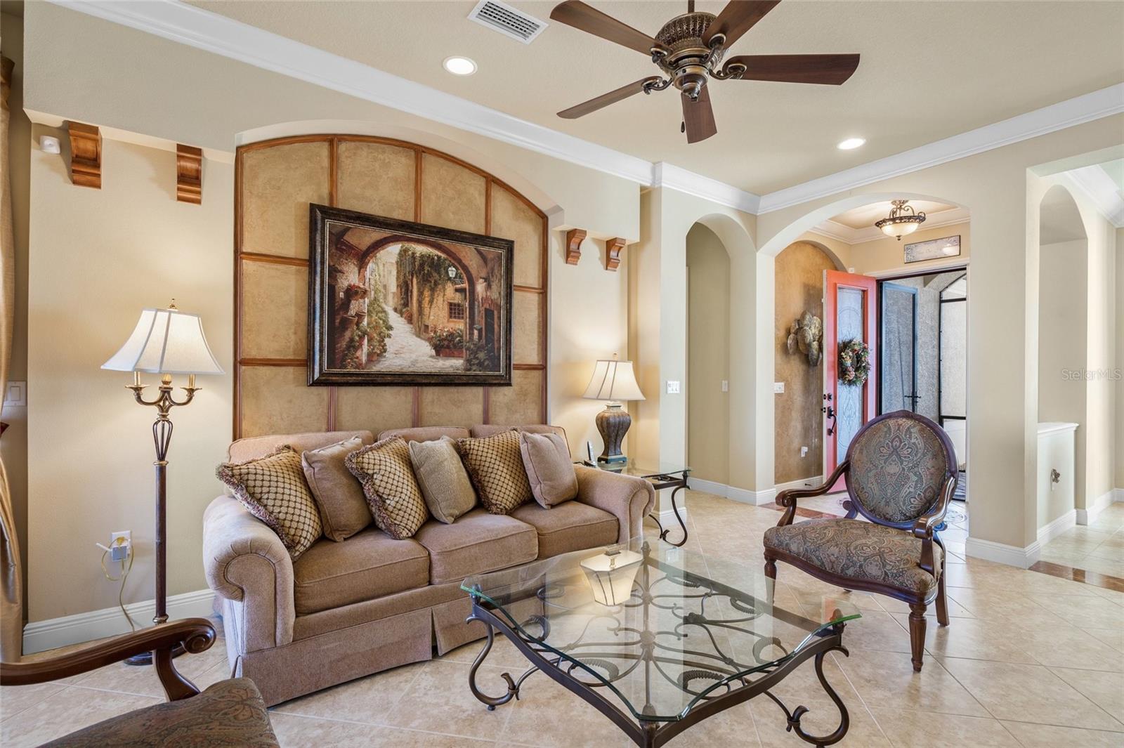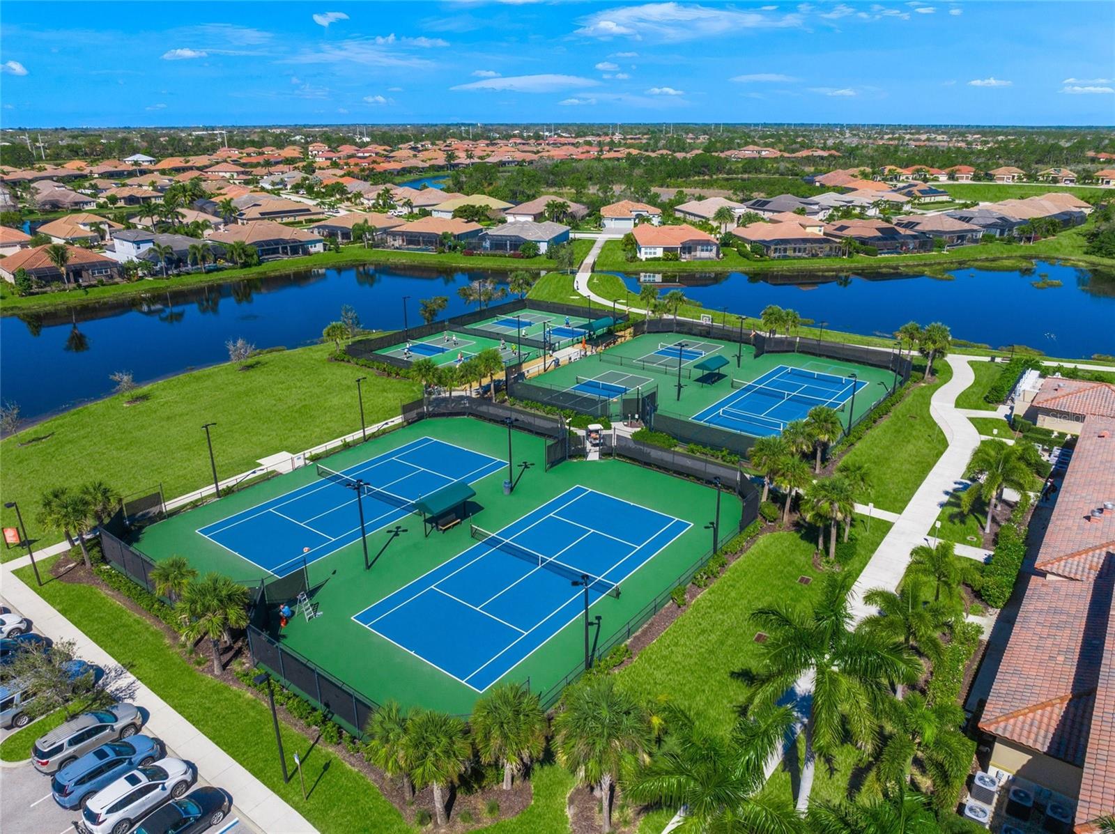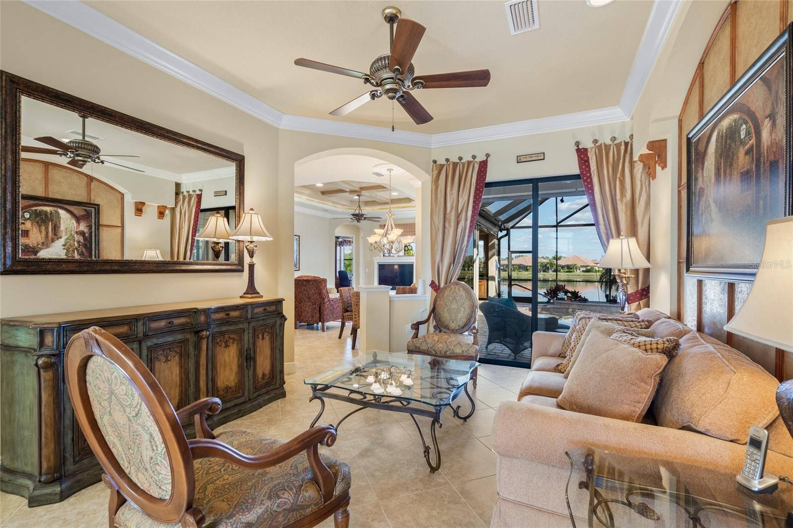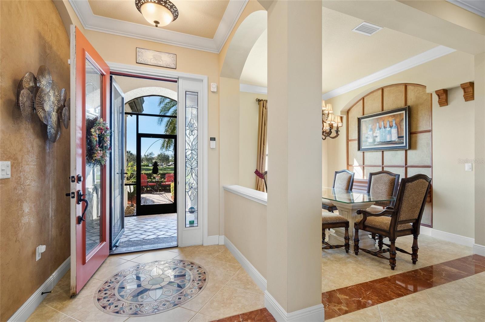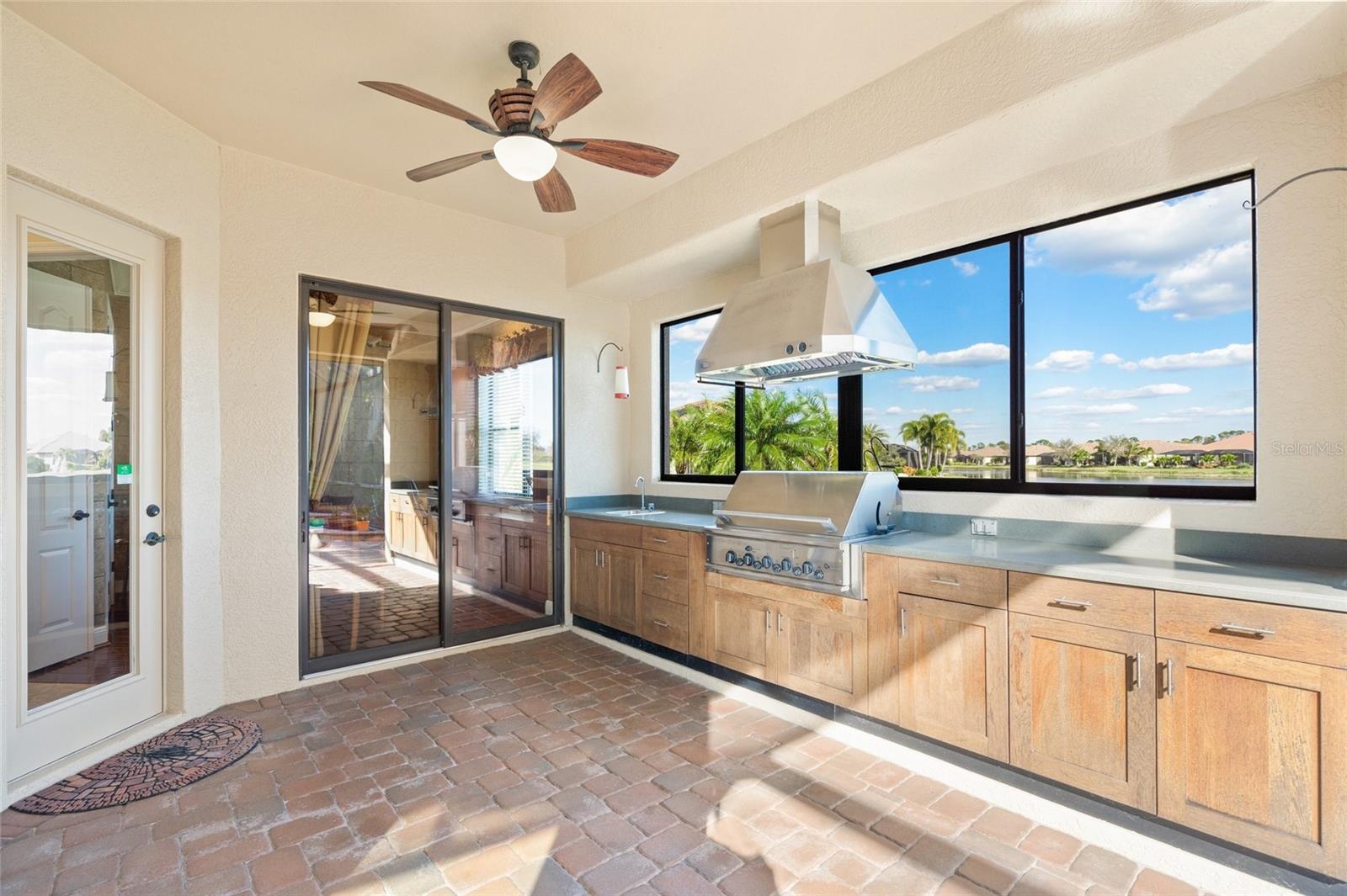 Welcome Home to the beautiful gated community of Gran Paradiso, located just south of Venice in Wellen Park. This stunning, well-built estate home is a former model built by Lee Wetherington, and is one of only a handful of custom Lee Wetherington homes built in Gran Paradiso. This property has a unique setting with a water view both in front and in the rear of the home. Lee Wetherington's Ariel model was built for the buyer who appreciates quality. Step inside and you are greeted with a spectacular marble inlay design on the floor that is truly a work of art. The gourmet kitchen holds top-of-the line appliances, granite countertops, and cherry wood cabinets. This model has four bedrooms, one of which features custom designed cabinetry which could transform the bedroom into a den or home office. The primary bedroom is spacious with a sitting area to hide away, read or just relax. The primary bedroom closets have been custom designed to maximize the space efficiently. The bedrooms all feature wood flooring with the rest of the home featuring porcelain tile. The primary bath has a glass block Roman shower (which is one of the Lee Wetherington signatures), dual sinks with a vanity and chair, and a large whirlpool tub. The split floor plan of this home is a great feature, especially when family and guests come to visit, offering privacy for all. One of the beautiful, custom designed bathrooms features a Bidet Commode. The lanai and pool area have a built-in kitchen, with teakwood cabinetry in a tropical setting that offers total privacy. The custom saltwater pool and spa have a brand new AquaCal heater. As a bonus, you'll have a perfect view of the fireworks from Atlanta Braves Stadium in Wellen Park! This fully furnished home has a new hot water heater, a whole-house water system, Simply Safe alarm system on windows and doors, and impact windows in the front of the home. For peace of mind there is a 20 KW whole-house propane gas Kohler generator with an auto transfer switch and a buried 500 lb. supply tank. In addition, you will find Storm Smart roll-down fabric hurricane screens (some motorized) at all other openings, including a motorized metal roll-down panel for the beveled glass front door. The seller has graciously paid off the CDD bonds. This beautiful home is within walking distance of the community clubhouse and all amenities.