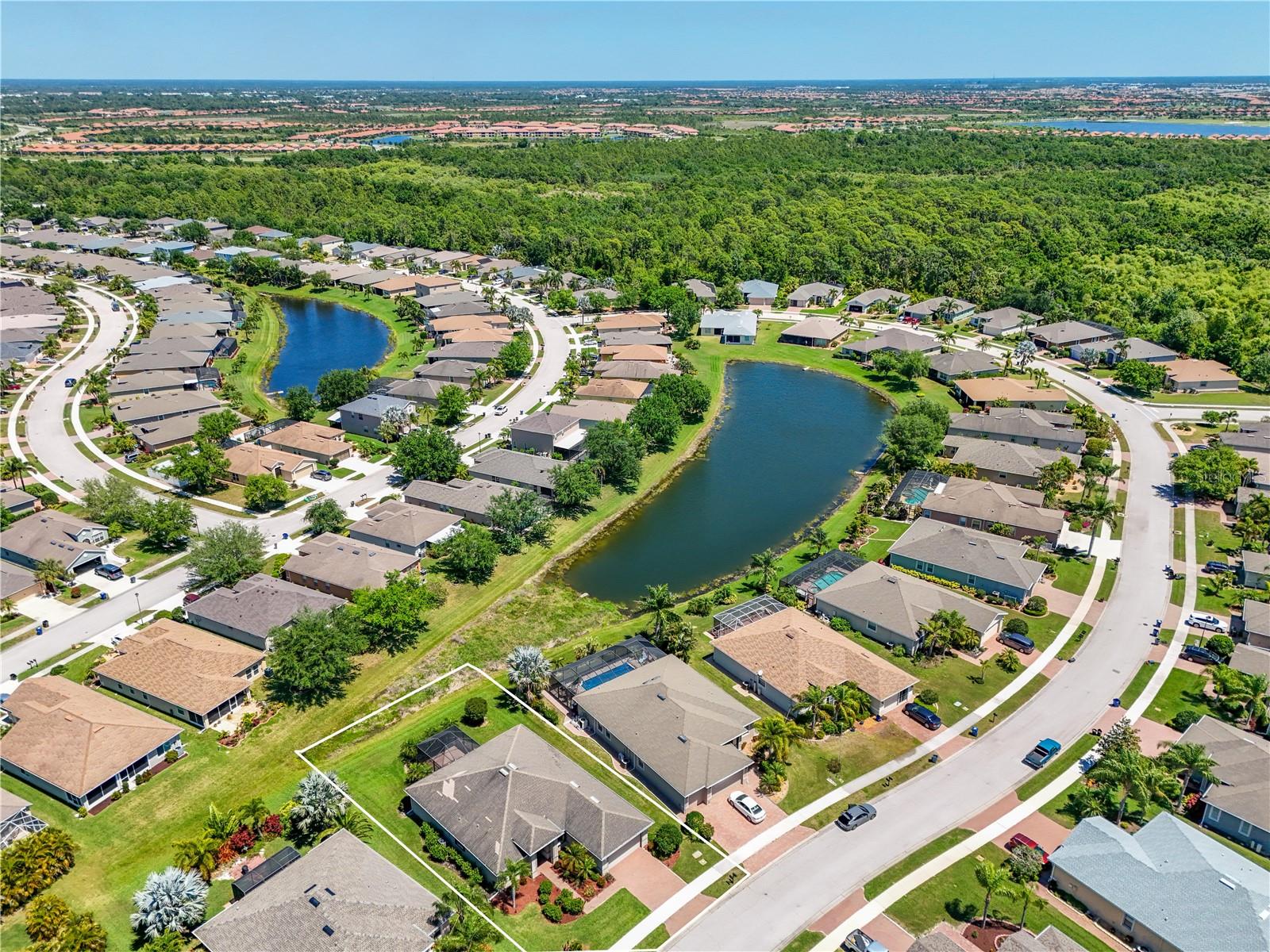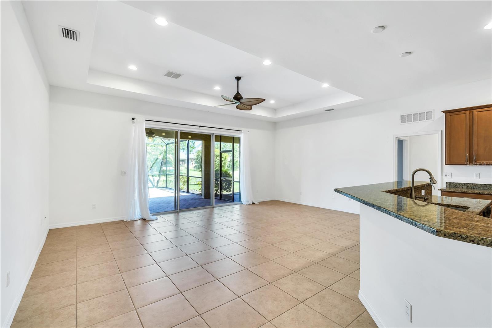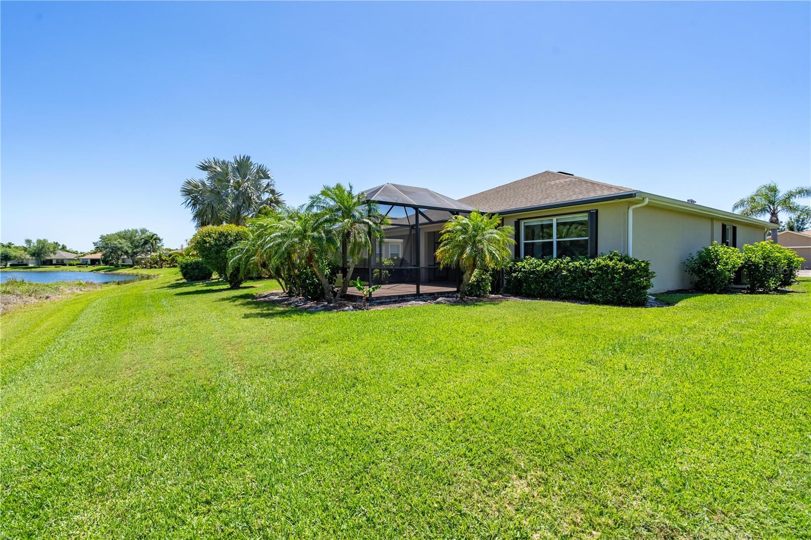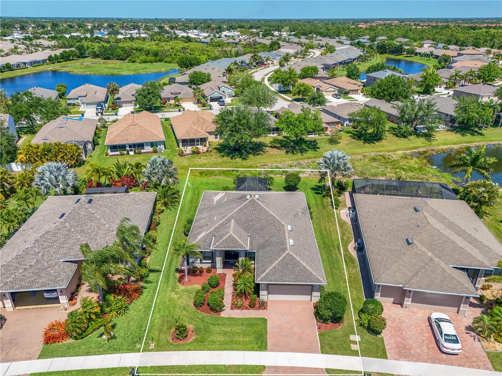 This home shows like new. Charming home has three bedrooms, two baths and two-car garage with over 2,250 square feet of heated and cooled living space is located conveniently in the gated community of Ventura Village. Ceramic tile is throughout the formal dining, great room/kitchen and over sized den with French doors. The great room opens to the kitchen with stainless steel appliances, granite counter tops, and a large breakfast bar. Primary Bedroom opens up the the lanai. Primary bath has a garden tube, dual sinks and a roman shower. The spacious paver screened lanai is 17 x 28 and has lake views, plus an open, under covered open air patio. Yes , there is room for a pool too.