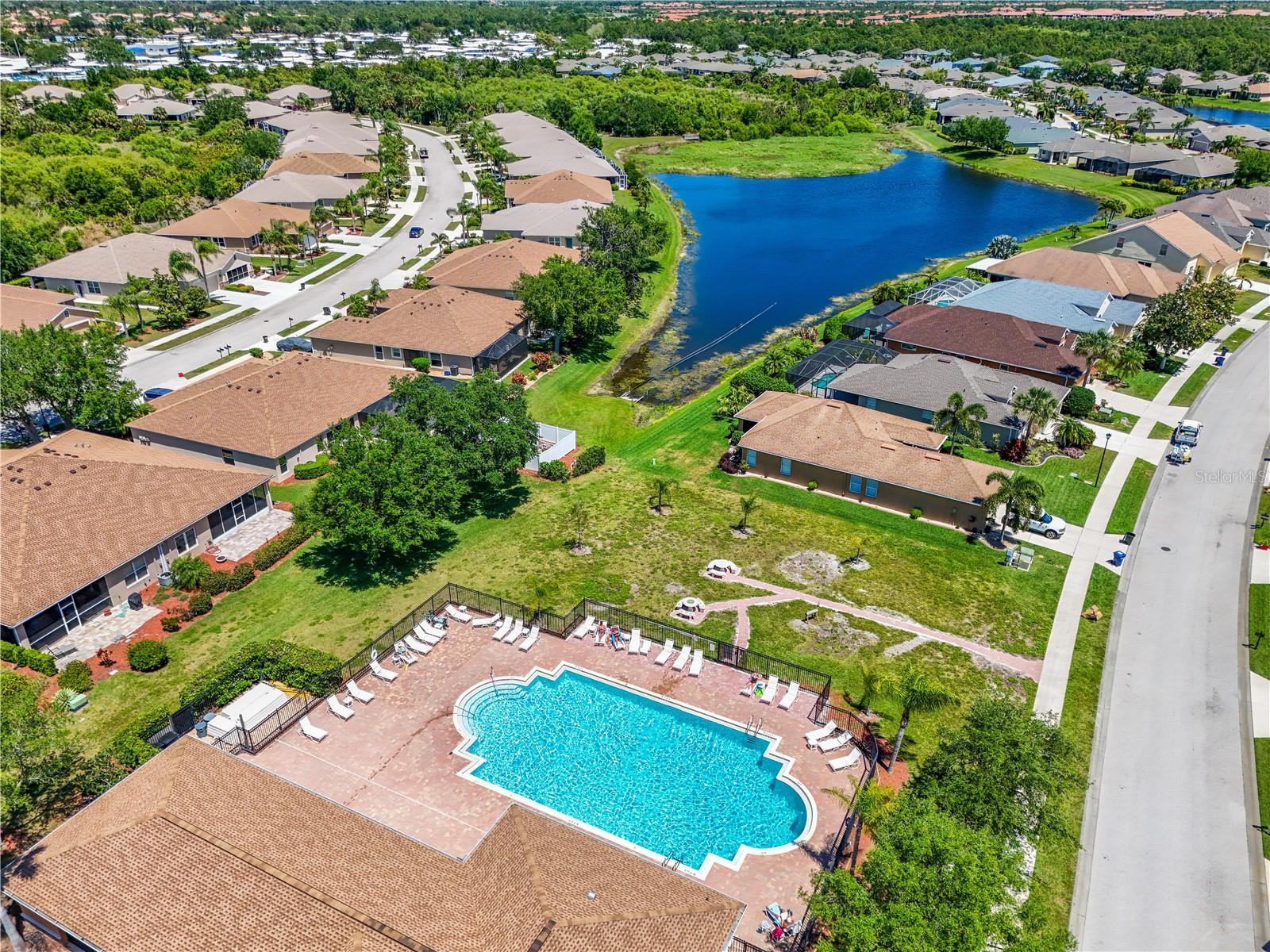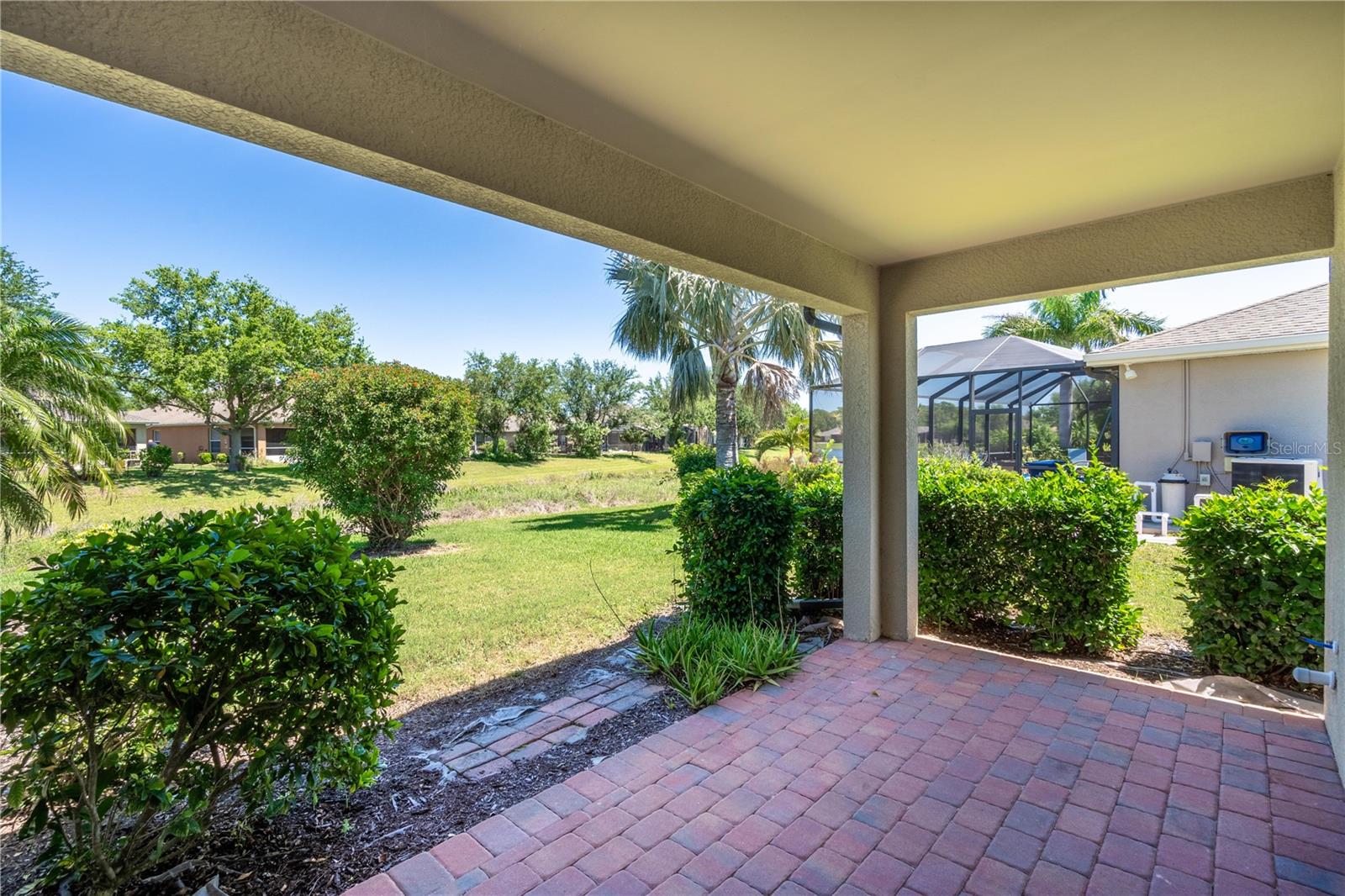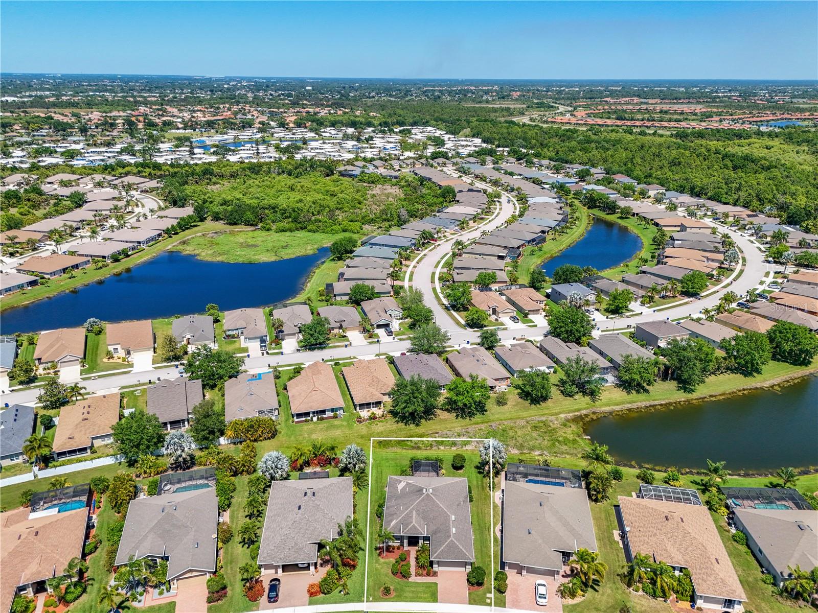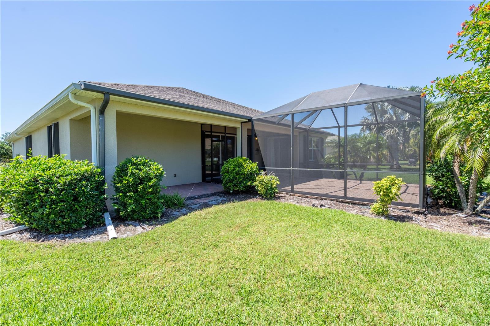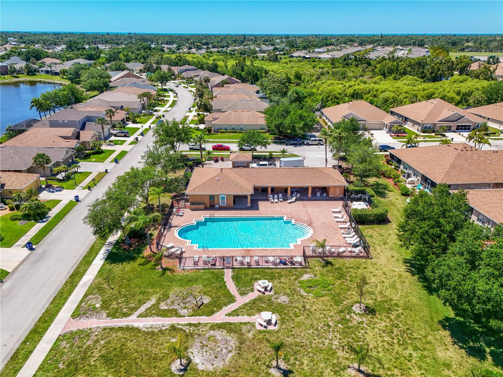 This home shows like new. Charming home has three bedrooms, two baths and two-car garage with over 2,250 square feet of heated and cooled living space is located conveniently in the gated community of Ventura Village. Ceramic tile is throughout the formal dining, great room/kitchen and over sized den with French doors. The great room opens to the kitchen with stainless steel appliances, granite counter tops, and a large breakfast bar. Primary Bedroom opens up the the lanai. Primary bath has a garden tube, dual sinks and a roman shower. The spacious paver screened lanai is 17 x 28 and has lake views, plus an open, under covered open air patio. Yes , there is room for a pool too.