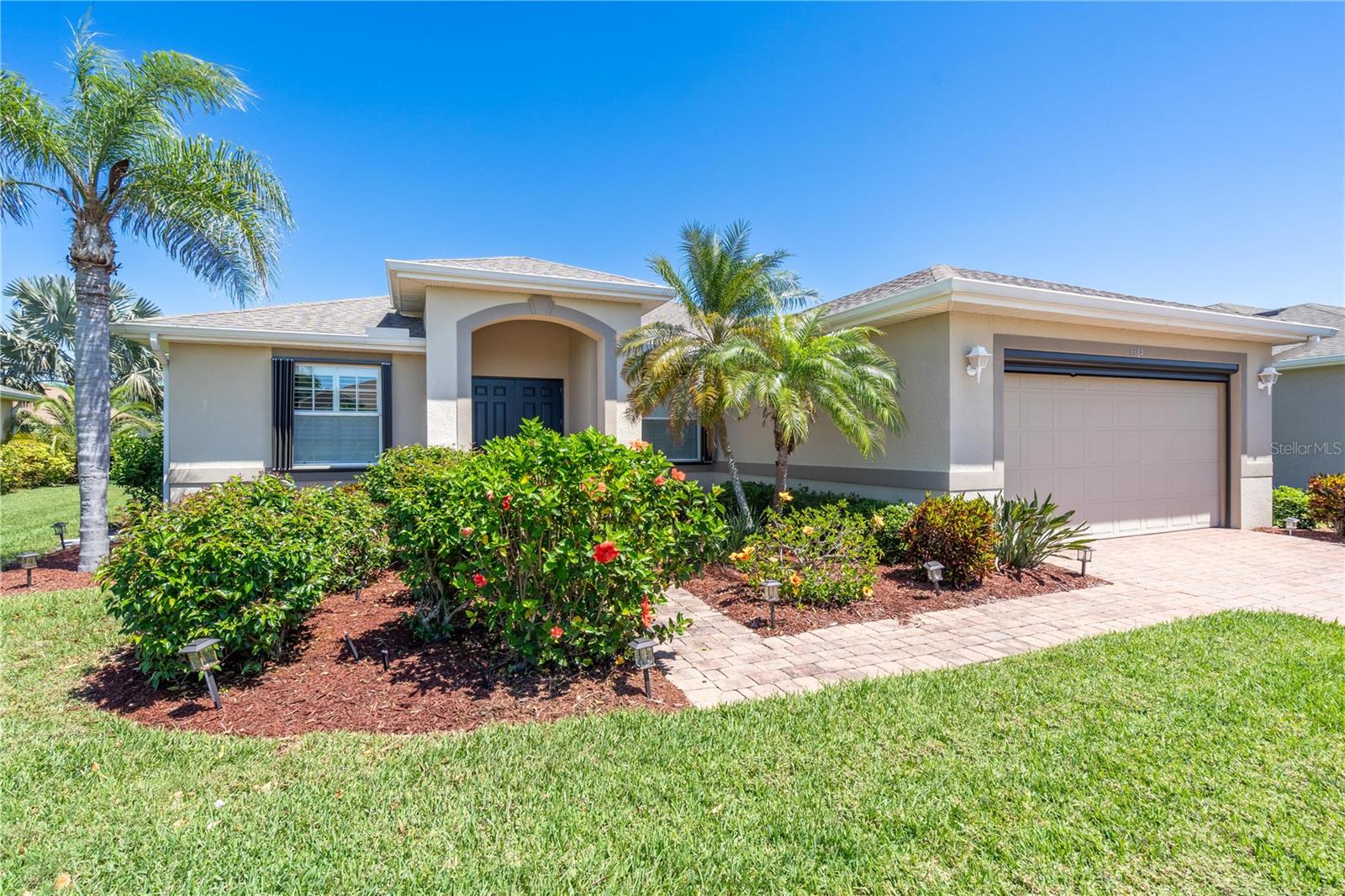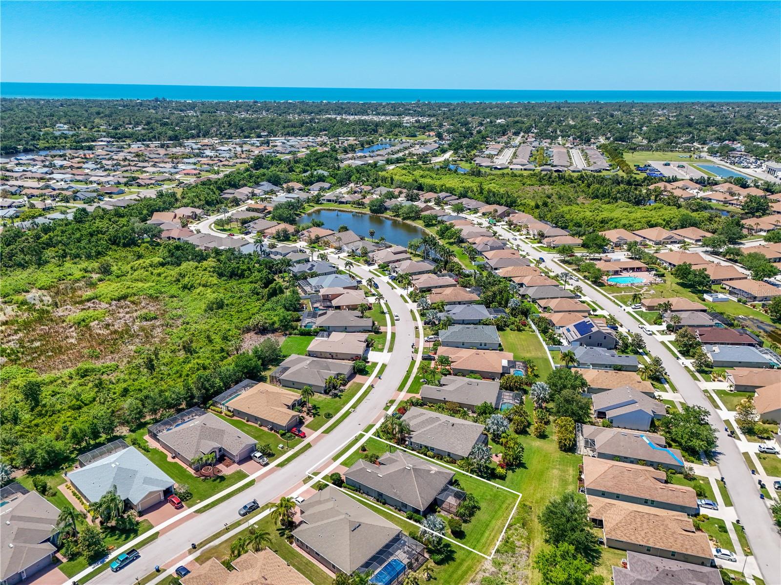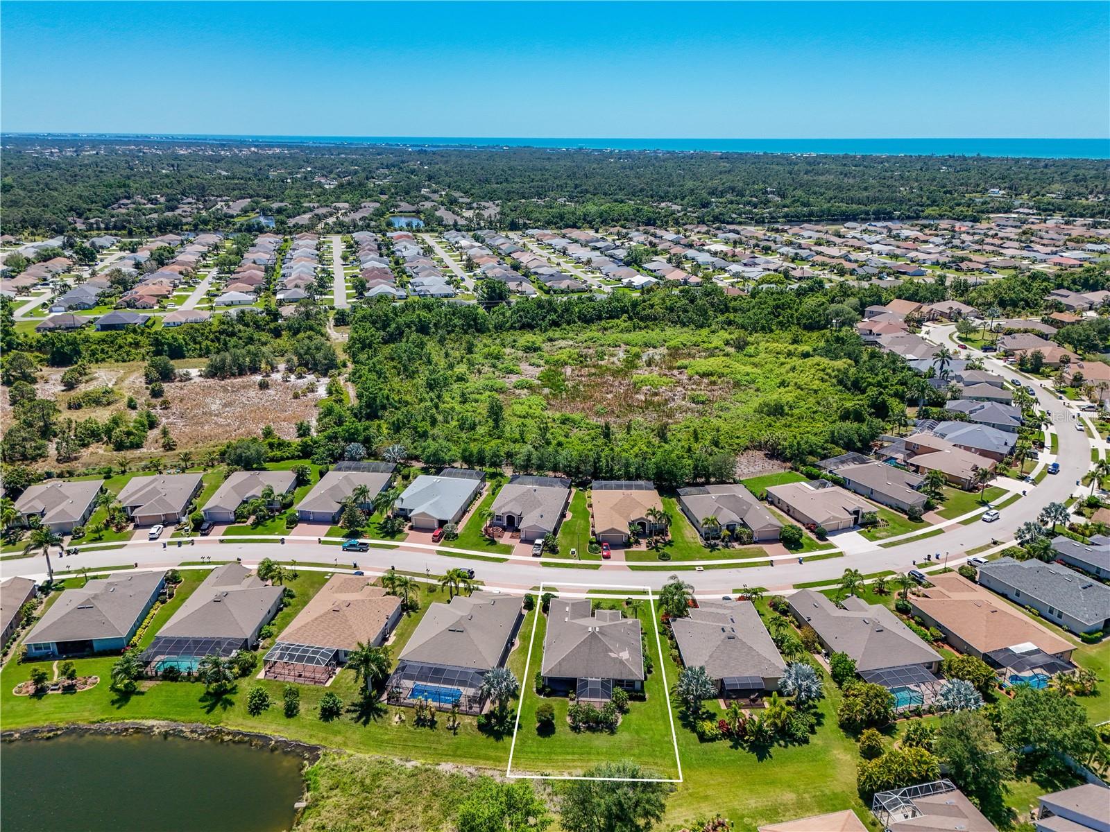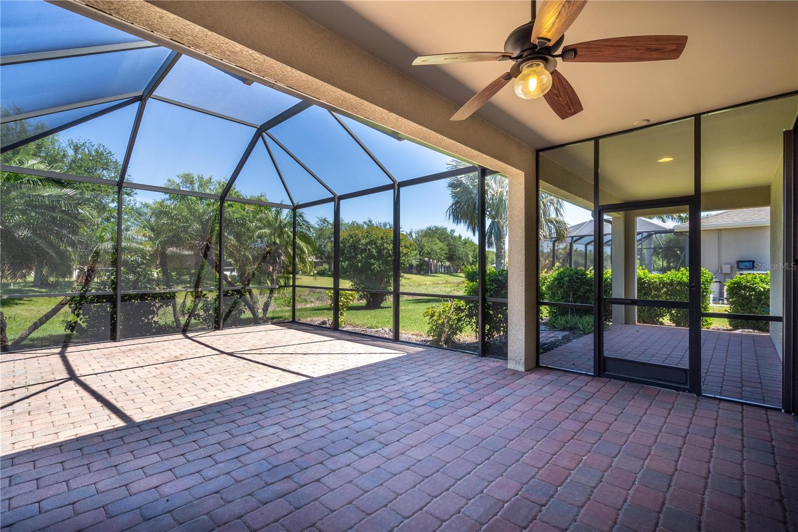 This home shows like new. Charming home has three bedrooms, two baths and two-car garage with over 2,250 square feet of heated and cooled living space is located conveniently in the gated community of Ventura Village. Ceramic tile is throughout the formal dining, great room/kitchen and over sized den with French doors. The great room opens to the kitchen with stainless steel appliances, granite counter tops, and a large breakfast bar. Primary Bedroom opens up the the lanai. Primary bath has a garden tube, dual sinks and a roman shower. The spacious paver screened lanai is 17 x 28 and has lake views, plus an open, under covered open air patio. Yes , there is room for a pool too.