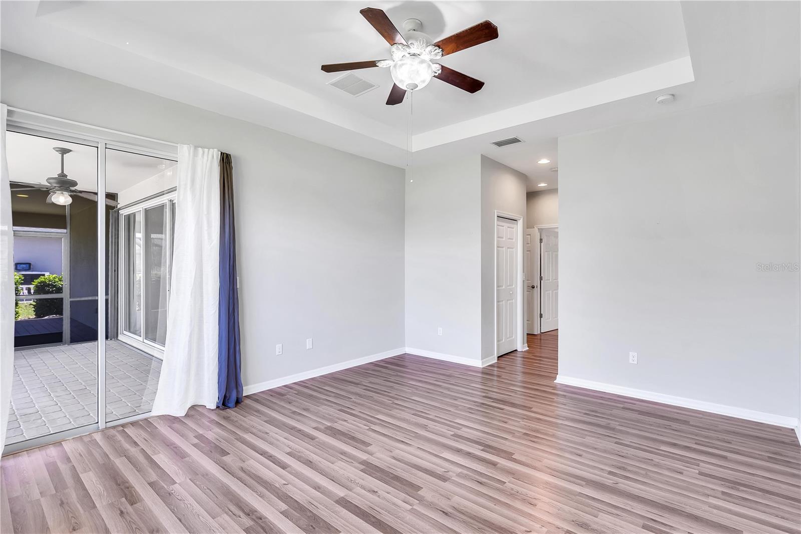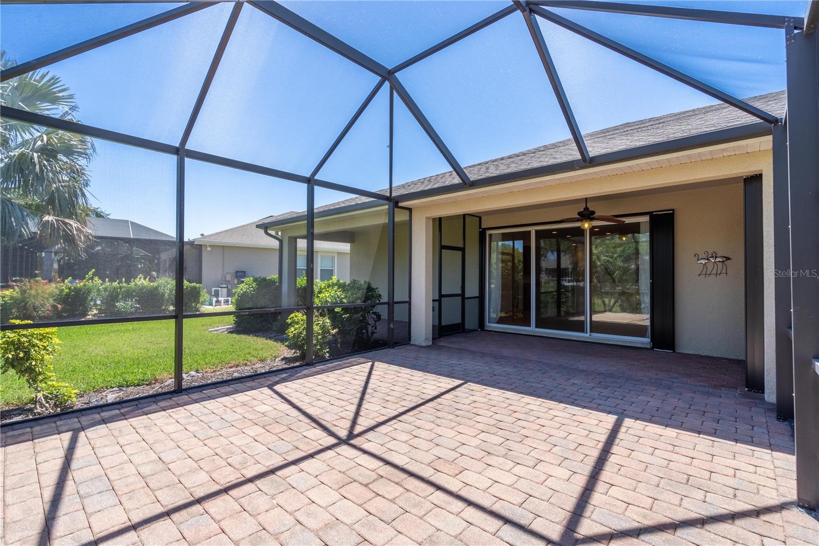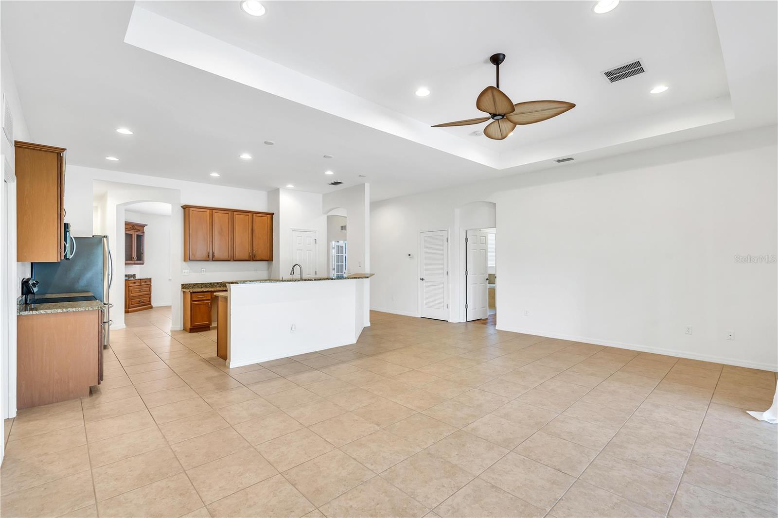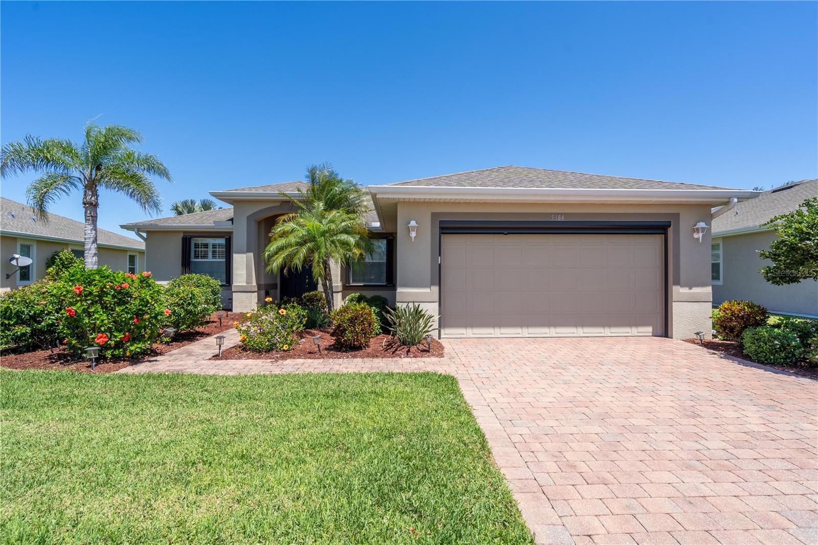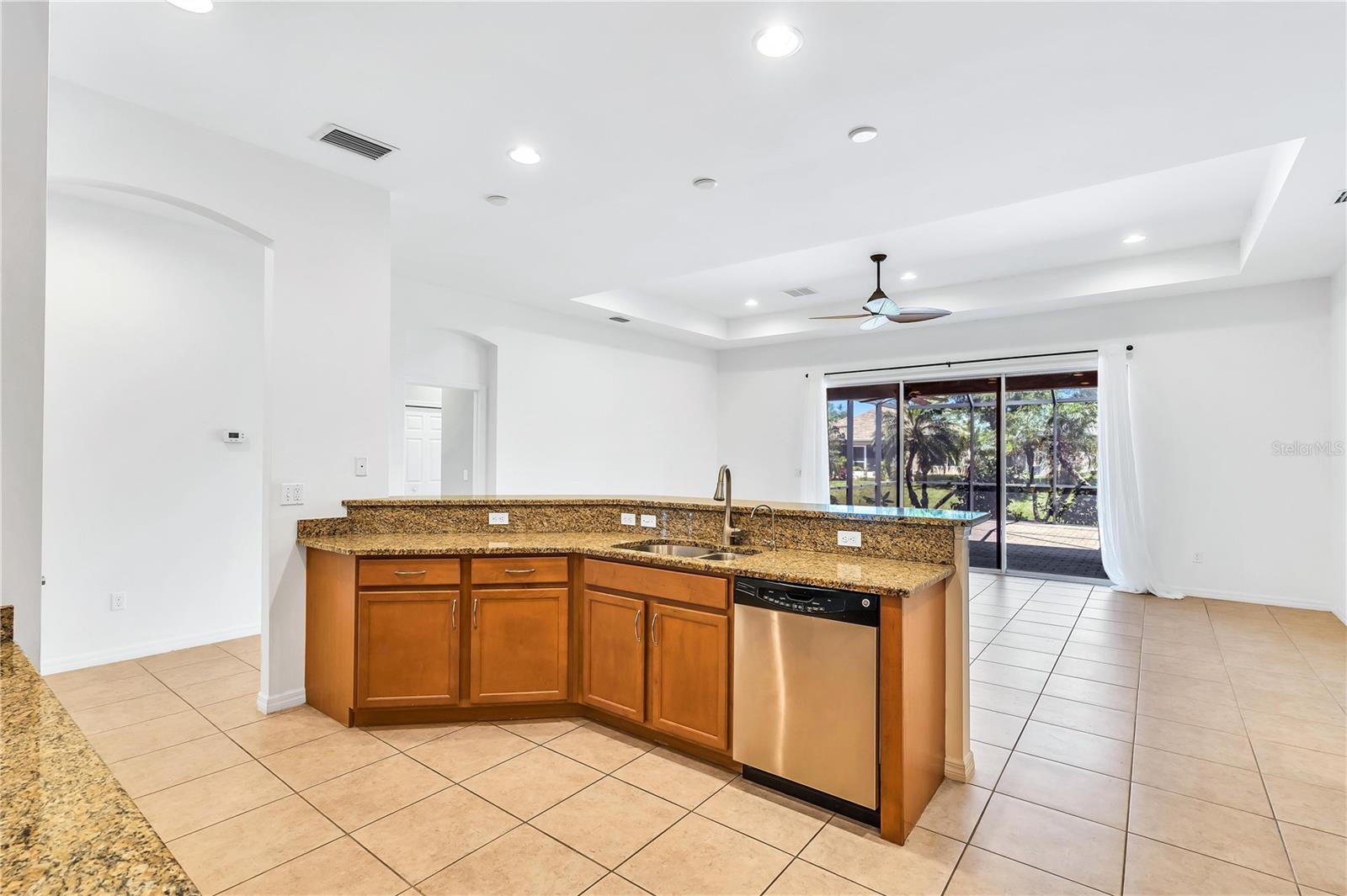 This home shows like new. Charming home has three bedrooms, two baths and two-car garage with over 2,250 square feet of heated and cooled living space is located conveniently in the gated community of Ventura Village. Ceramic tile is throughout the formal dining, great room/kitchen and over sized den with French doors. The great room opens to the kitchen with stainless steel appliances, granite counter tops, and a large breakfast bar. Primary Bedroom opens up the the lanai. Primary bath has a garden tube, dual sinks and a roman shower. The spacious paver screened lanai is 17 x 28 and has lake views, plus an open, under covered open air patio. Yes , there is room for a pool too.