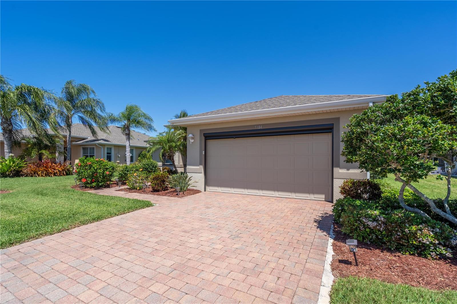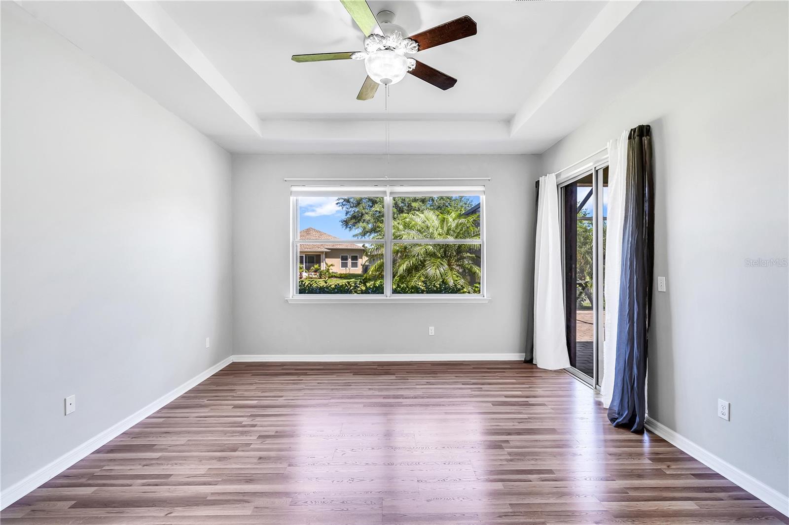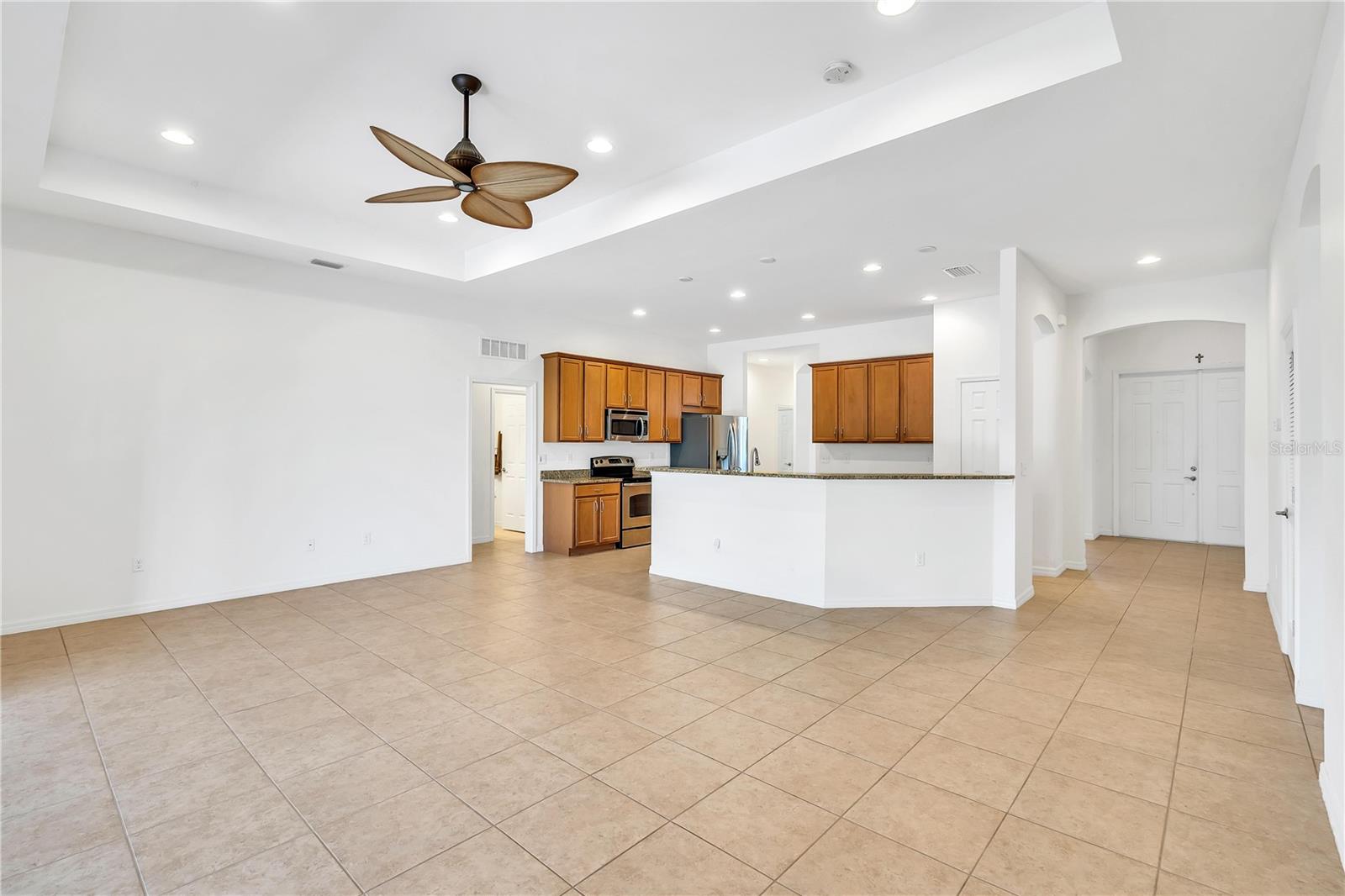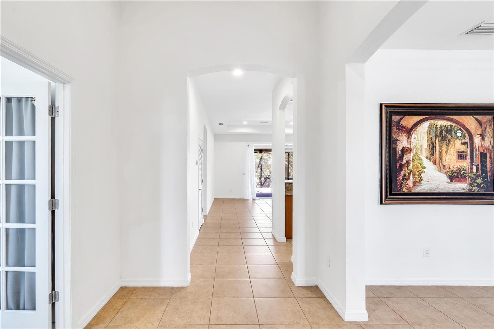 This home shows like new. Charming home has three bedrooms, two baths and two-car garage with over 2,250 square feet of heated and cooled living space is located conveniently in the gated community of Ventura Village. Ceramic tile is throughout the formal dining, great room/kitchen and over sized den with French doors. The great room opens to the kitchen with stainless steel appliances, granite counter tops, and a large breakfast bar. Primary Bedroom opens up the the lanai. Primary bath has a garden tube, dual sinks and a roman shower. The spacious paver screened lanai is 17 x 28 and has lake views, plus an open, under covered open air patio. Yes , there is room for a pool too.
