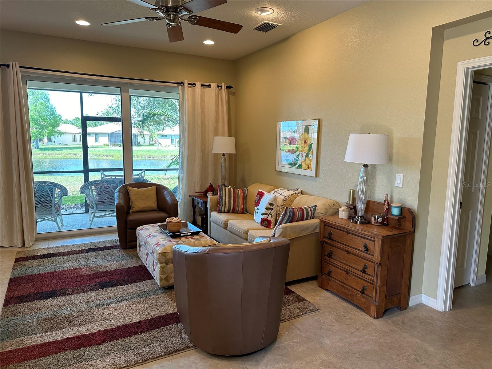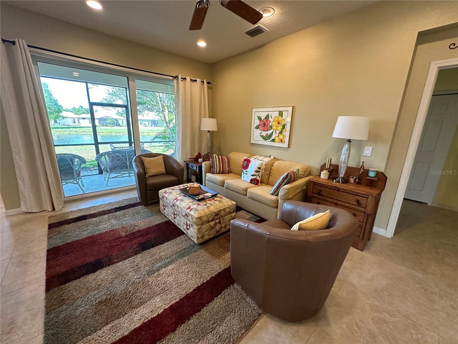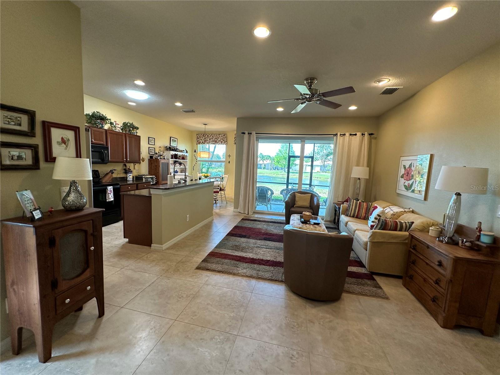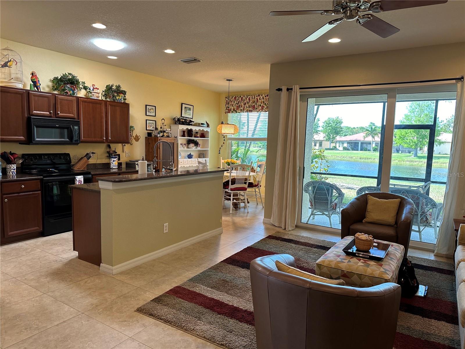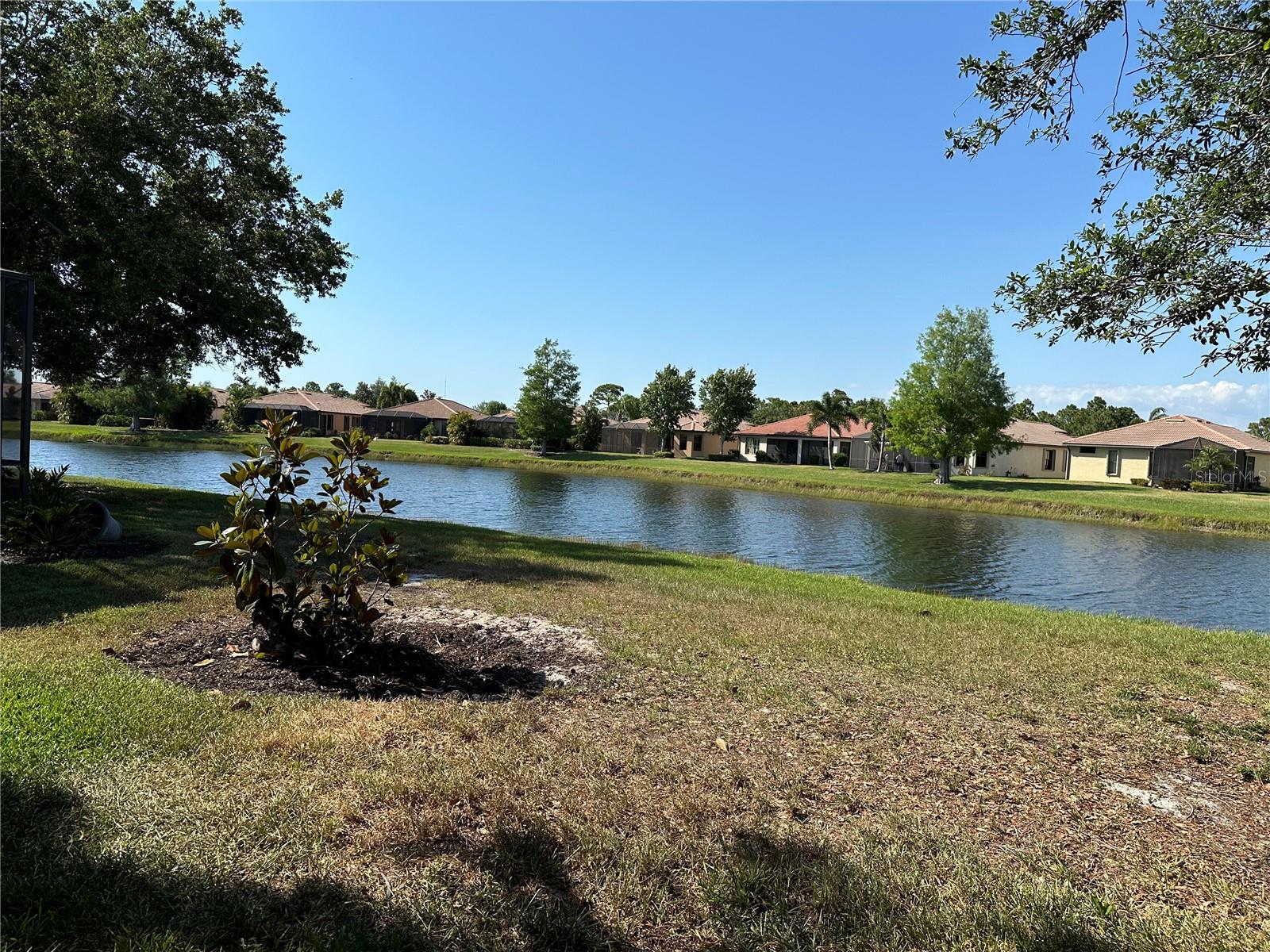 Price adjustment! Enjoy your maintenance free resort life style in the popular 55+ Venetian Falls community – NO CDD. This home has a 2-car garage, 2 bedrooms, 2 bathrooms and a den with tile floors throughout for easy care. You will see the peaceful environment and glittering lake view with trees from your kitchen, breakfast bar, dinette, dining & living room, and your primary bedroom. All windows, sliding glass door and front door are new with 150 mph wind resistance. There are 2 solar tube skylights- in the kitchen and primary bathroom to save energy & reduce your electric bill. It has an easy access walk-in shower in the En Suite bathroom. Shelving and cabinets in the laundry room and garage for storage. The kitchen has a walk-in pantry. HOA fees include Cable TV, internet, road, lawn mowing, weeding, edging, mulching & irrigation service. Tree & shrubs trimming which were installed by the builder. Roof washing on a four-year rotation. Exterior painting on an eight-year rotation. Onsite HOA management & activity director. Luxury resort clubhouse with heated pool, spa & resistance pool, fitness center with strength & weight training equipment. Ballroom for banquet, dancing etc. Billiards & card room. Putting green, bocce ball. If you prefer to swim in the ocean, Venice Beach is about 15 minutes away.