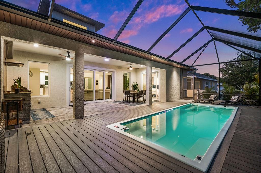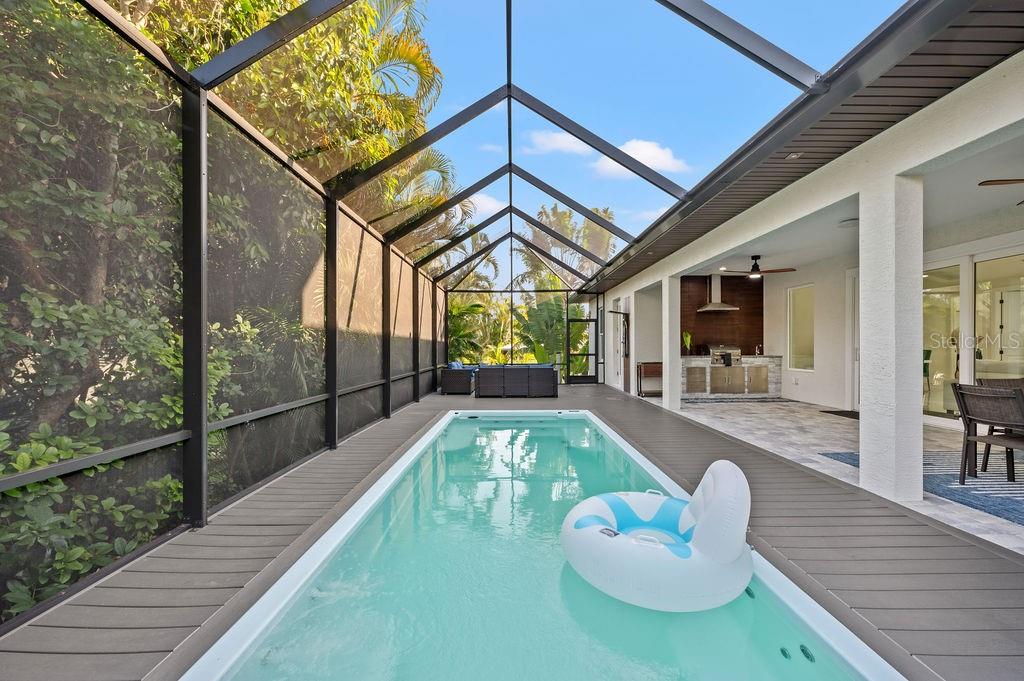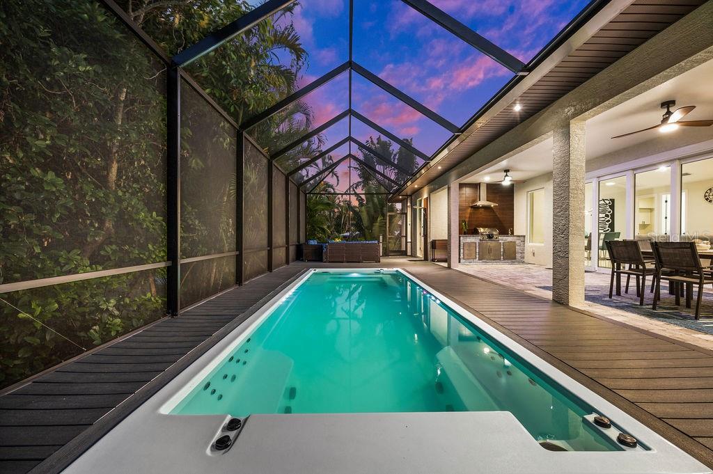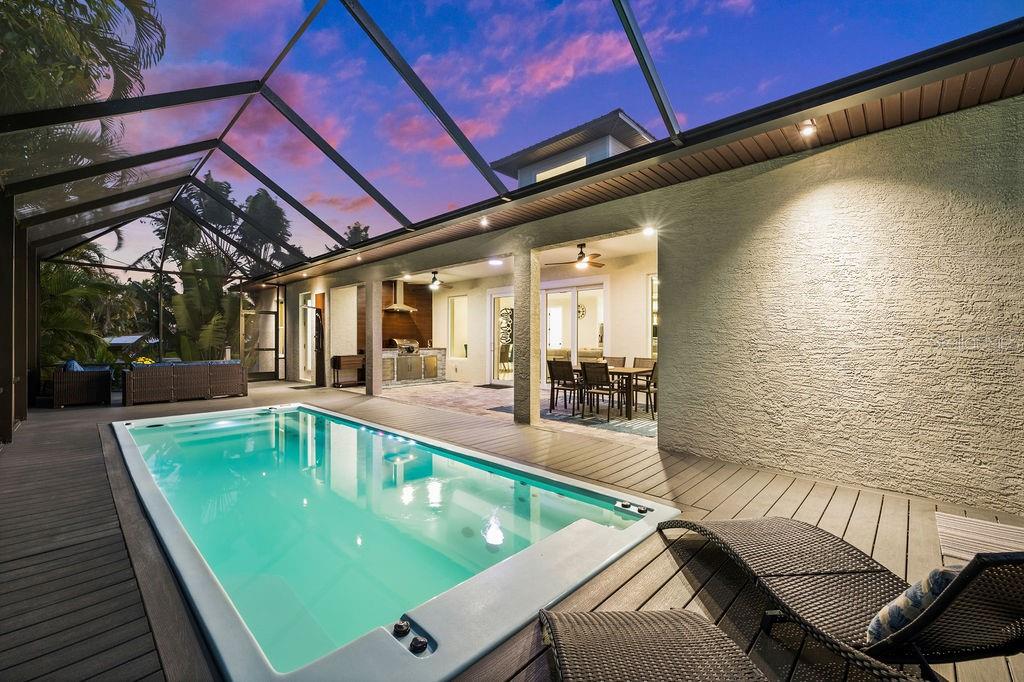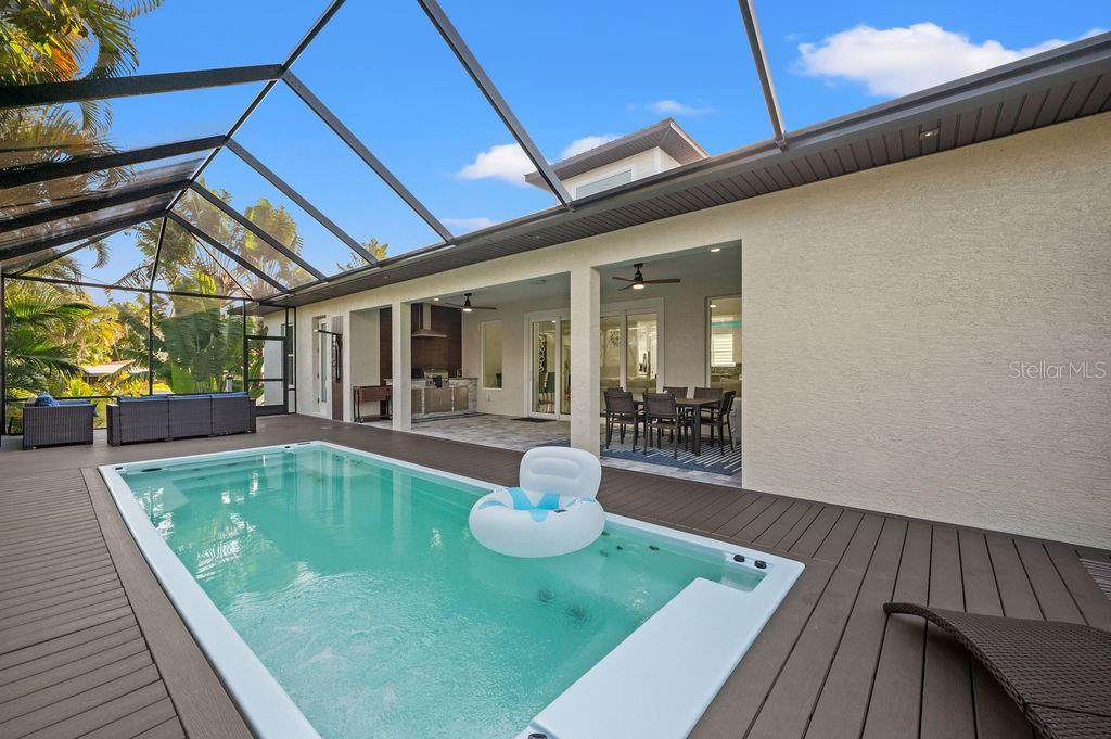 Move into this exquisite, completed in 2023 custom built home with a pool! Embrace the exclusive Floridian lifestyle in this outstanding residence located just 10 minutes from both Venice Beach and Downtown. Nestled at the end of a street for optimal privacy and convenience, this stunning, nearly 3,400 sqft home boasts a modern open floor plan featuring 3 spacious bedrooms, 3 baths and an expansive 780 sqft. garage. Built on a 7-course stem wall, it offers Hurricane Impact windows and doors for added security. Step into the 14' high exterior foyer and discover the primary suite with 2 generous walk-in closets and an ensuite bathroom featuring a walk-in shower and freestanding tub. The sleek chef’s kitchen showcases a large island, granite blue pearl countertops, and modern high gloss cabinetry with lighting. Porcelain high-quality tiles adorn the main floor. Premium building materials include floors, appliances, metal roof, a 50x18 feet Trex deck with railings and a paved driveway. Entertain effortlessly in the spacious 800 sqft. living room, or venture outside to the expansive lanai with a summer kitchen and a magnificent 24 x 9 feet modern heated swim spa pool. Revel in the lush backyard adorned with palm trees and exotic mature plants. Consider purchasing an annual ferry pass to a private beach or an access to the boat ramp. This home is also located near to Alligator Creek and the South Venice Yacht Club for an easy kayak launch! Enjoy a short bike ride to the Shamrock Park with Legacy Trail (1 mile) as well as South Venice Ferry Beach (1.5 miles). Schedule a showing today!