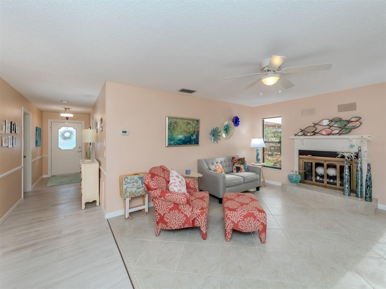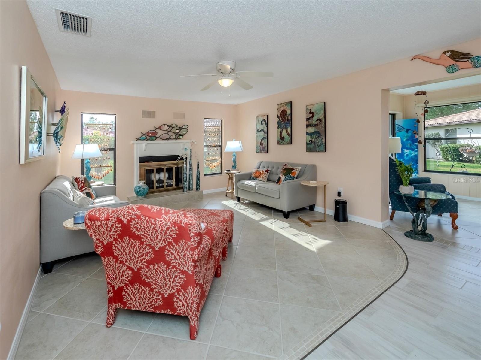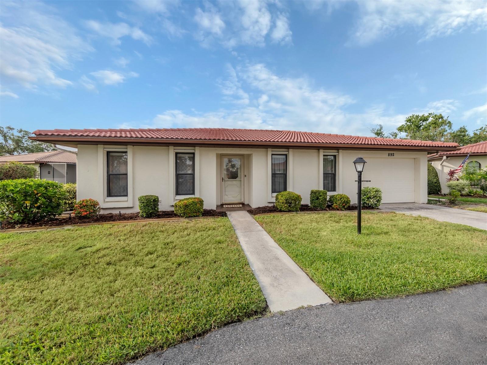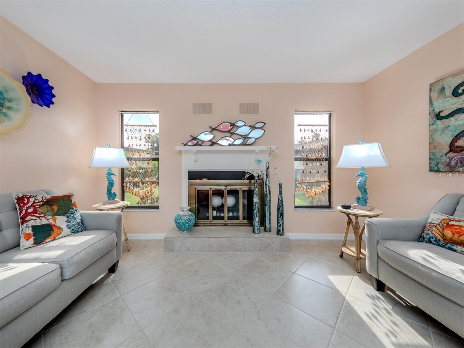 Welcome to Vivienda, an exclusive 27-unit enclave designed for 55+ living, located just moments from downtown Venice's shopping, dining, and beautiful beaches. Nestled on a quiet cul-de-sac, this stand-alone condo unit with an attached garage offers both privacy and convenience. Step inside to a light and bright coastal ambiance, with tile flooring throughout. The living room features a cozy fireplace, perfect for relaxing evenings. The spacious kitchen boasts a stainless steel sink, a new backsplash, solid surface counters, updated cabinets, and a pantry. This home includes two en-suite bedrooms, each with remodeled bathrooms. One suite features a walk-in closet and a high-end mirror/medicine cabinet with interior outlets, along with a walk-in shower. The second suite offers dual sinks and another walk-in shower. A versatile den/office includes an interior laundry closet with a sink. Enjoy the Florida lifestyle in the large Florida room with a garden view, featuring glass windows and sliders at each end—one leading to the enclosed lanai and the other to a patio area perfect for grilling. Additional updates include new garage, exterior, laundry, and interior doors with lever handles, whole-house hurricane panels, a new A/C and hot water heater (replaced in 2023), and a replumbed system (completed in 2015). The tile roof was installed in 2011. Roof and exterior stucco are covered in the monthly HOA fee. Just steps away from the community pool, this home offers the perfect blend of comfort, style, and convenience. Discover your new coastal retreat at Vivienda.