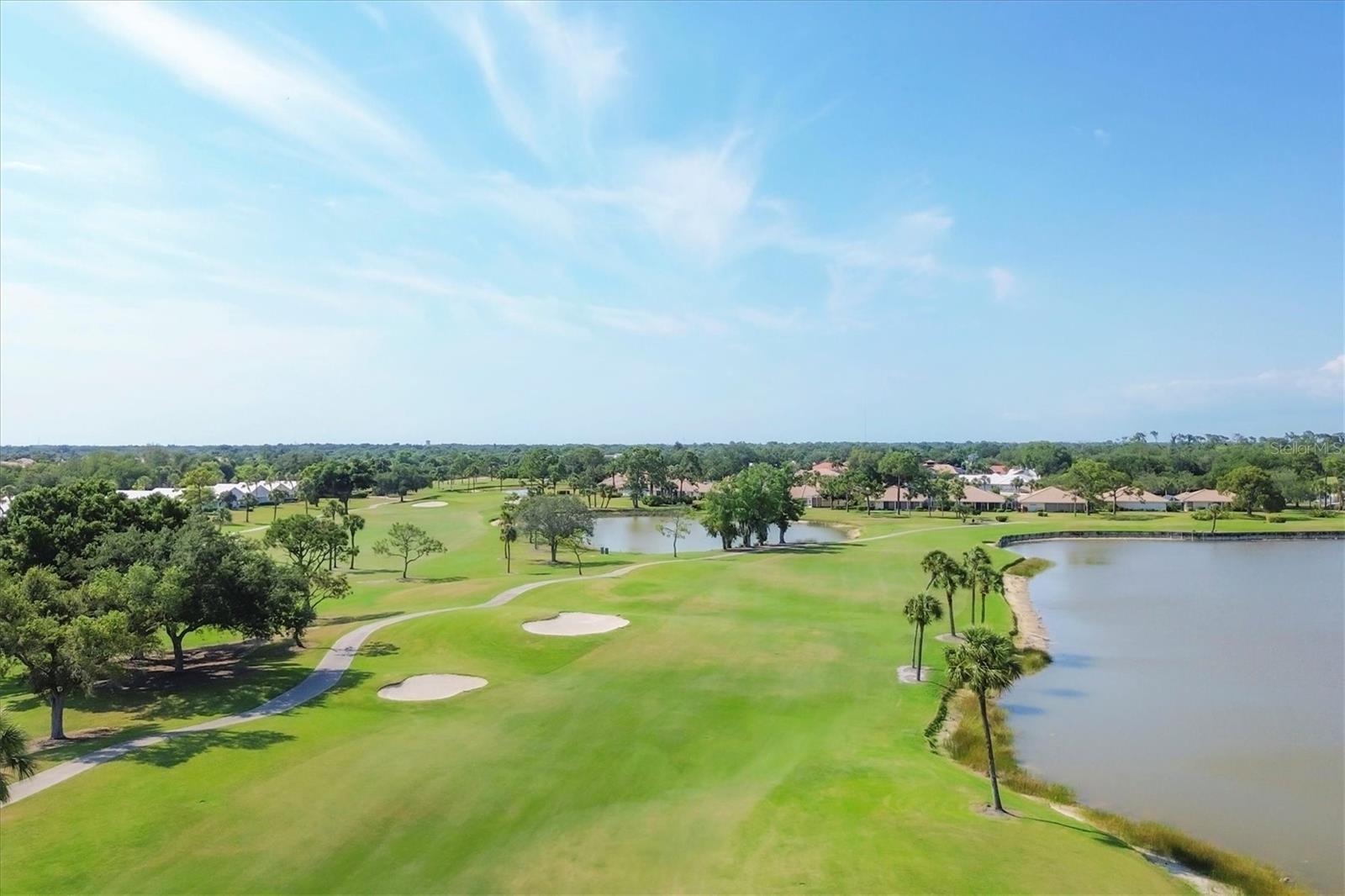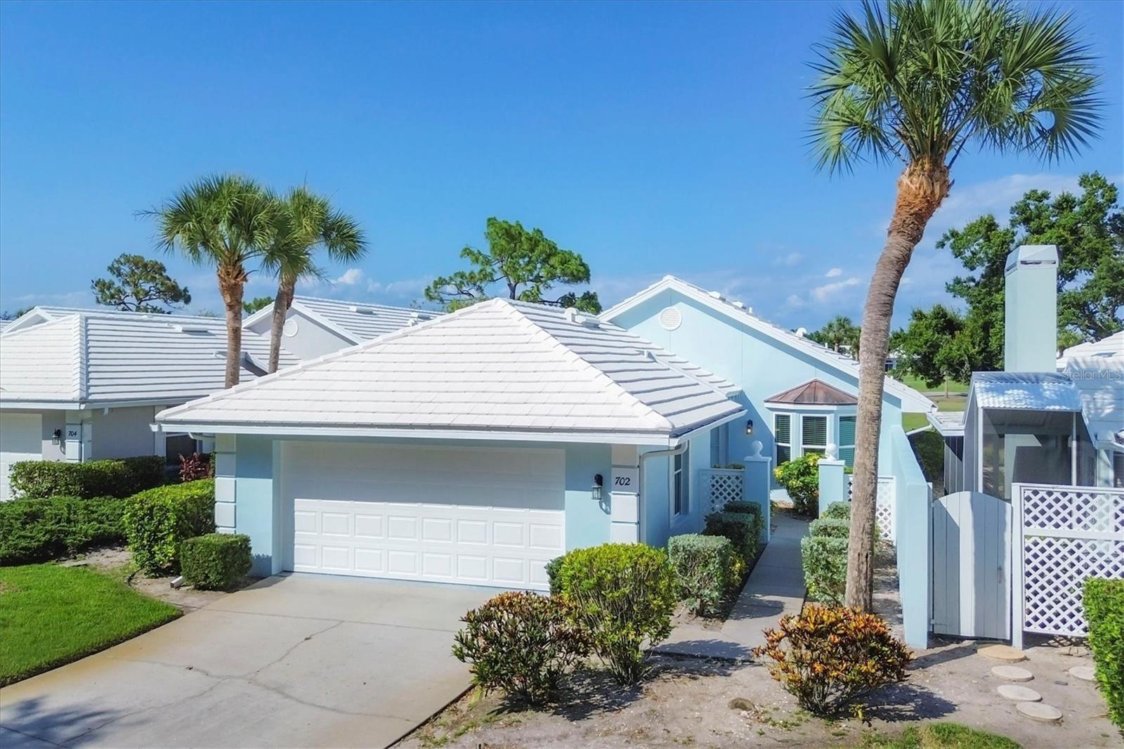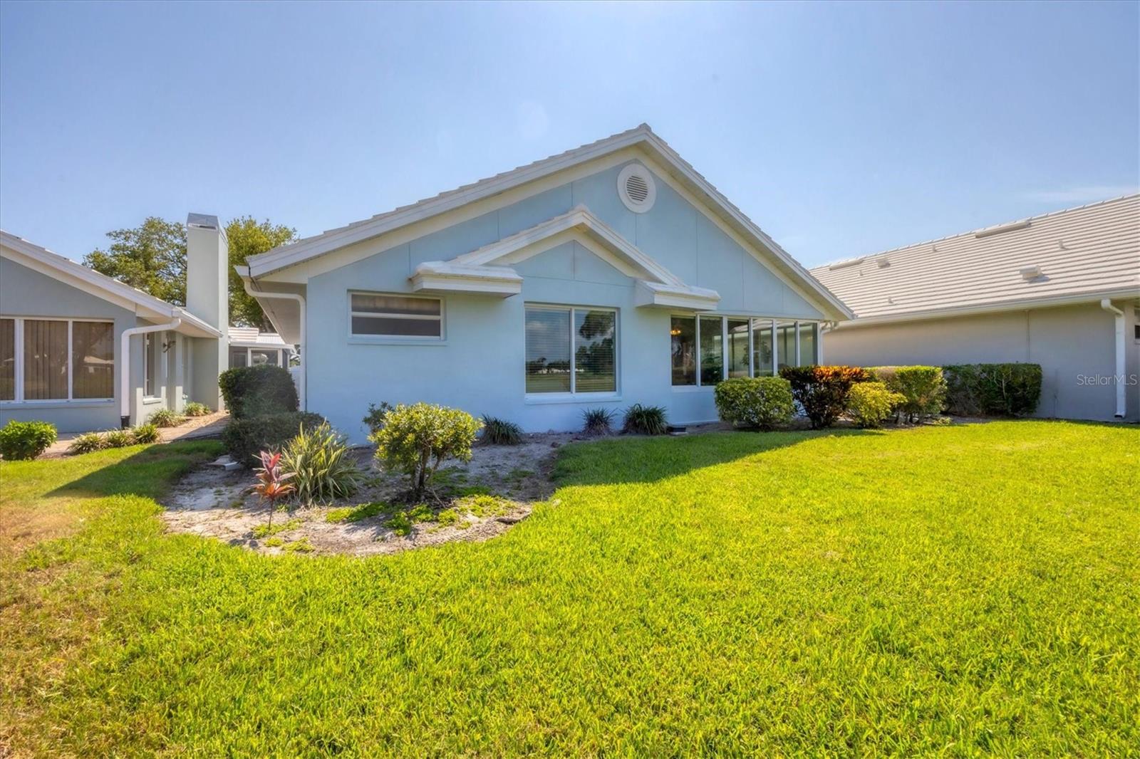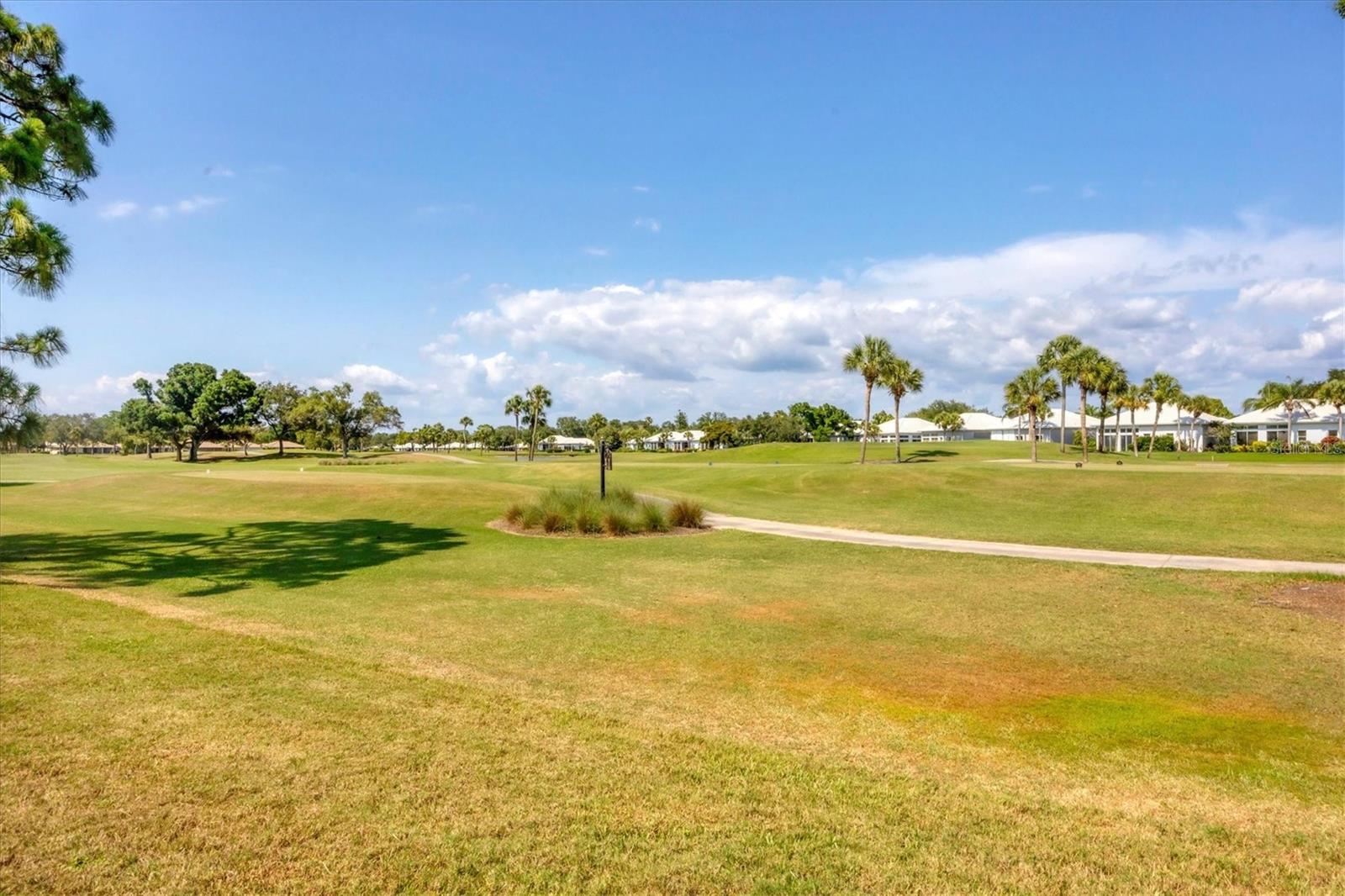 Wake up to sunrise across the verdant fairway from the 2 bedroom/2 bath patio home. Enter into a great room that opens to the Florida room and the view beyond. An eat-in kitchen will delight the chef in the family. The desirable split bedroom plan provides privacy for all. An attached two car garage house the laundry area, storage and a place to keep you vehicle out of the sun. The exterior has a fresh coat of paint. This home is ready for a new owner to make it their own. This 40 unit community has its own pool and clubhouse where you can relax and socialize. Fee includes all exterior building and grounds maintenance, insurance on the building, pest control and basic cable. NO CDD FEES. Membership in the private golf & country club is optional.
