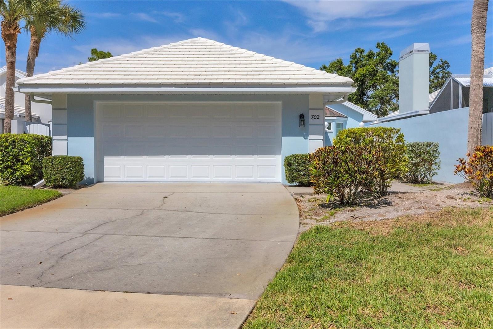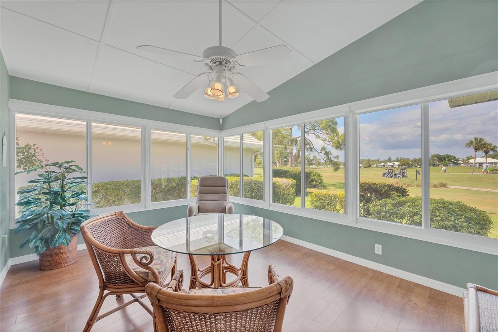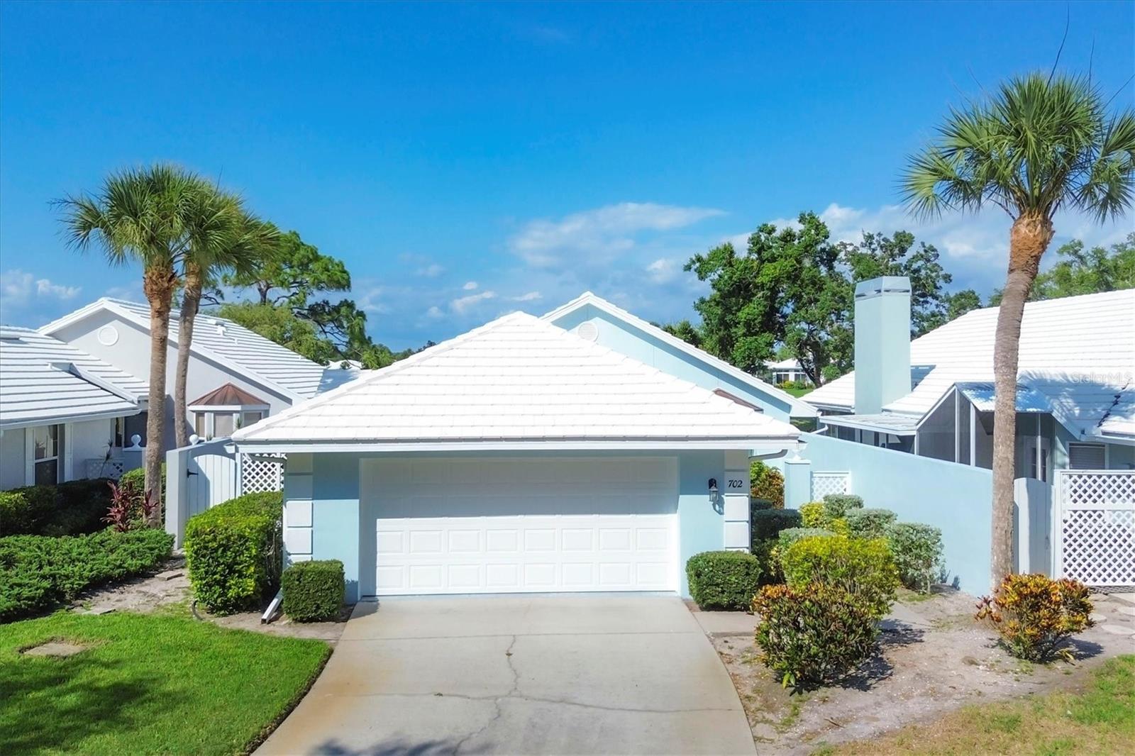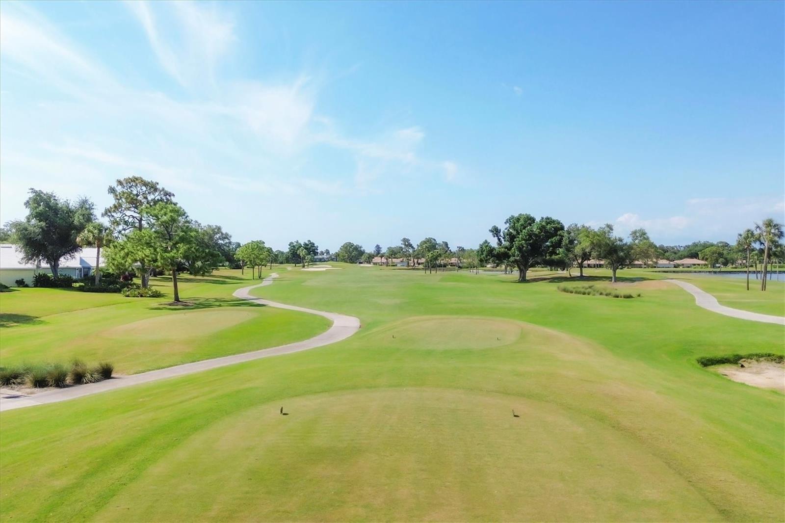 Wake up to sunrise across the verdant fairway from the 2 bedroom/2 bath patio home. Enter into a great room that opens to the Florida room and the view beyond. An eat-in kitchen will delight the chef in the family. The desirable split bedroom plan provides privacy for all. An attached two car garage house the laundry area, storage and a place to keep you vehicle out of the sun. The exterior has a fresh coat of paint. This home is ready for a new owner to make it their own. This 40 unit community has its own pool and clubhouse where you can relax and socialize. Fee includes all exterior building and grounds maintenance, insurance on the building, pest control and basic cable. NO CDD FEES. Membership in the private golf & country club is optional.