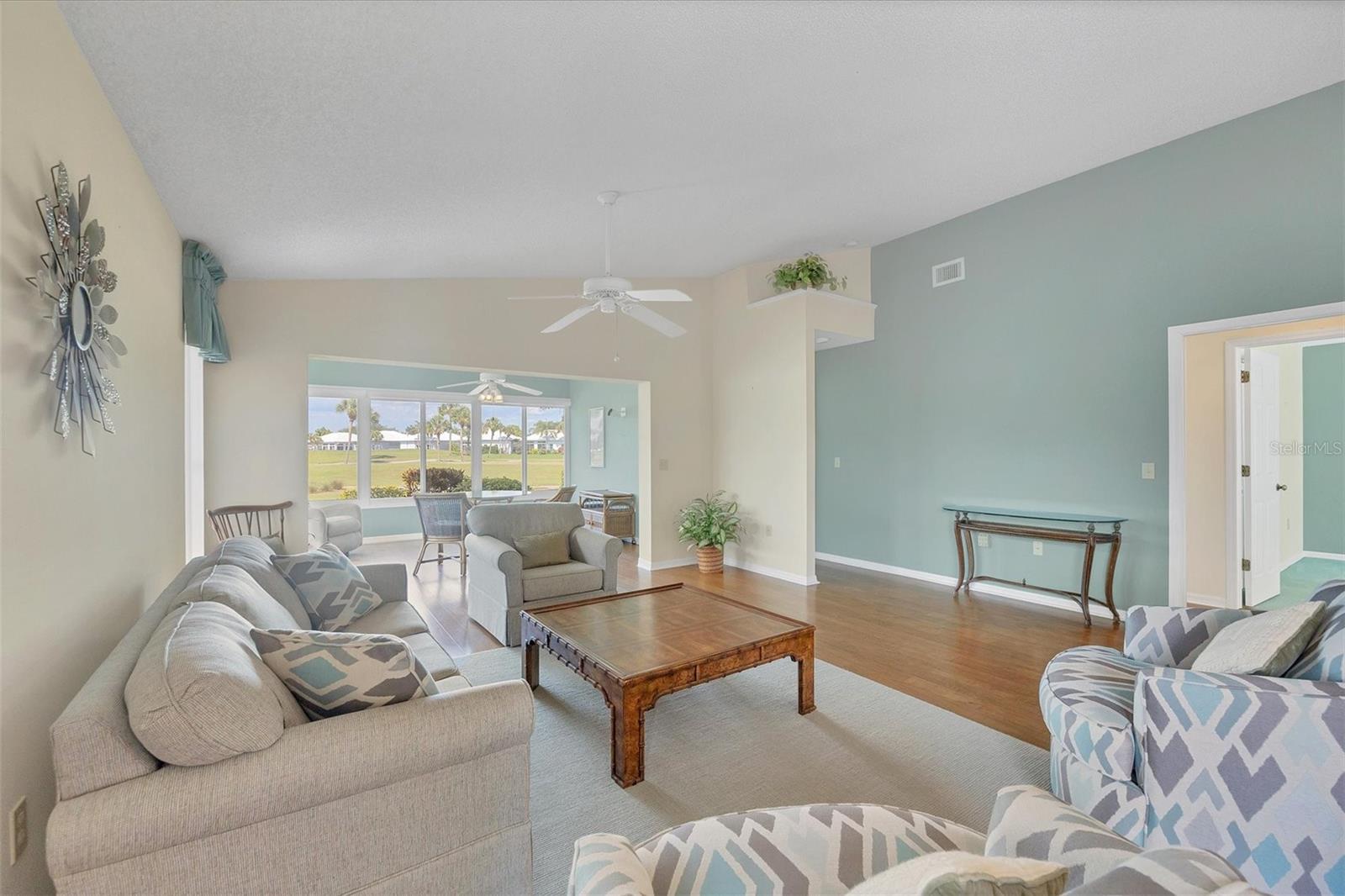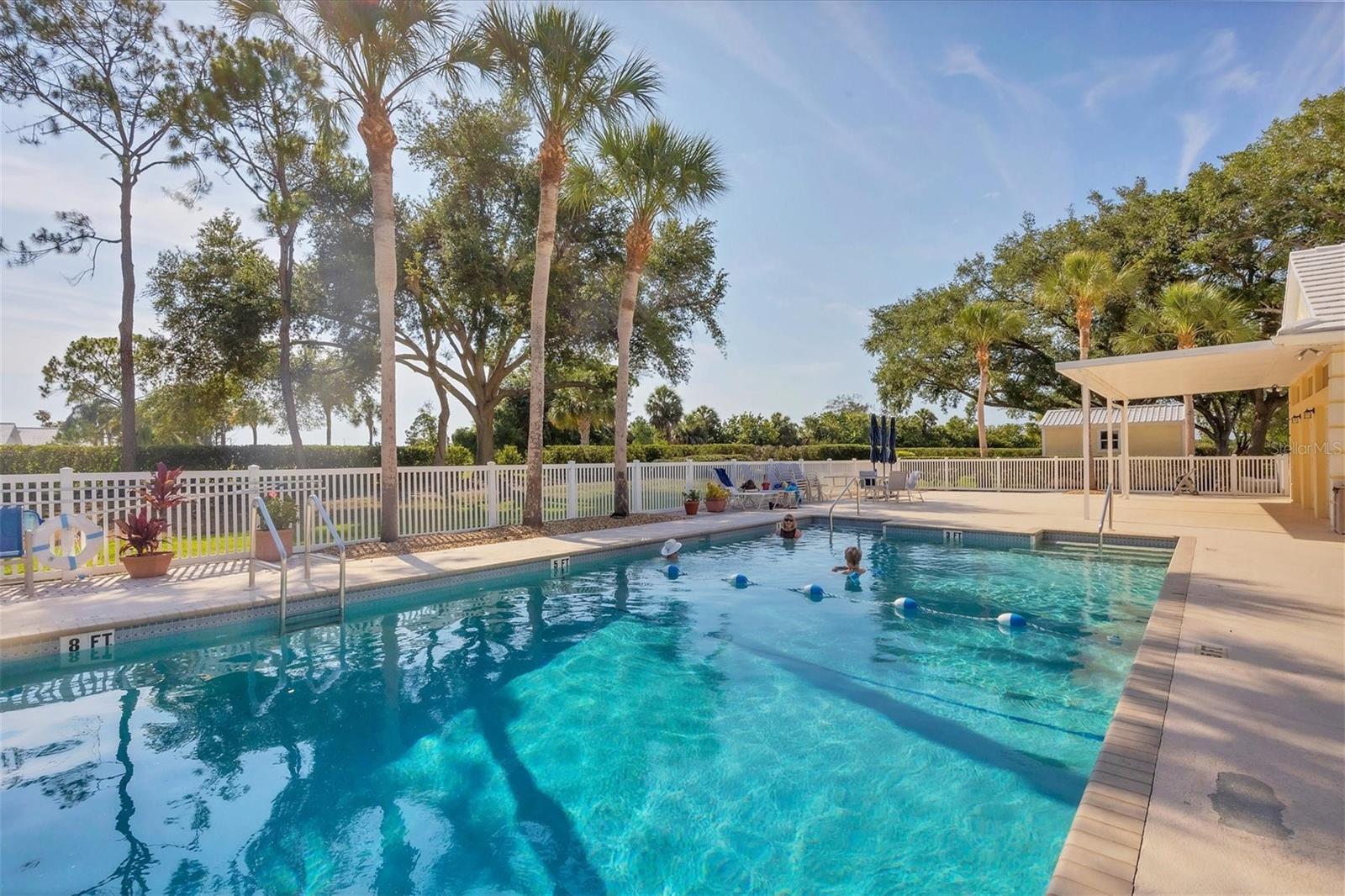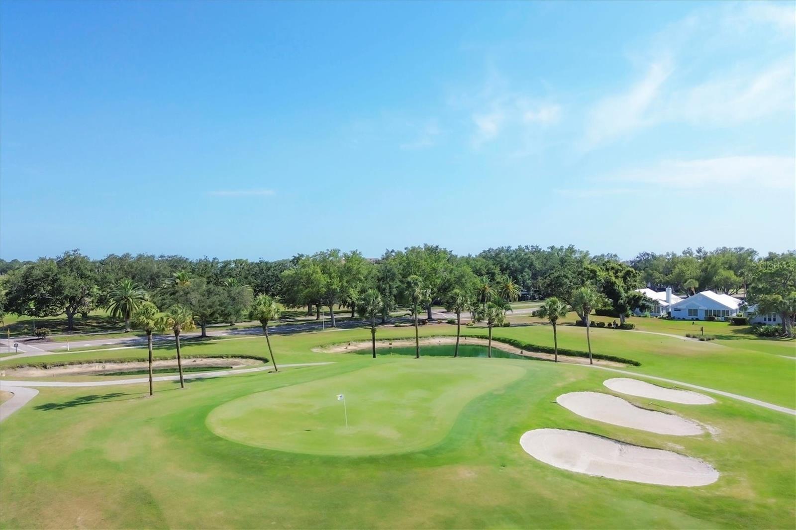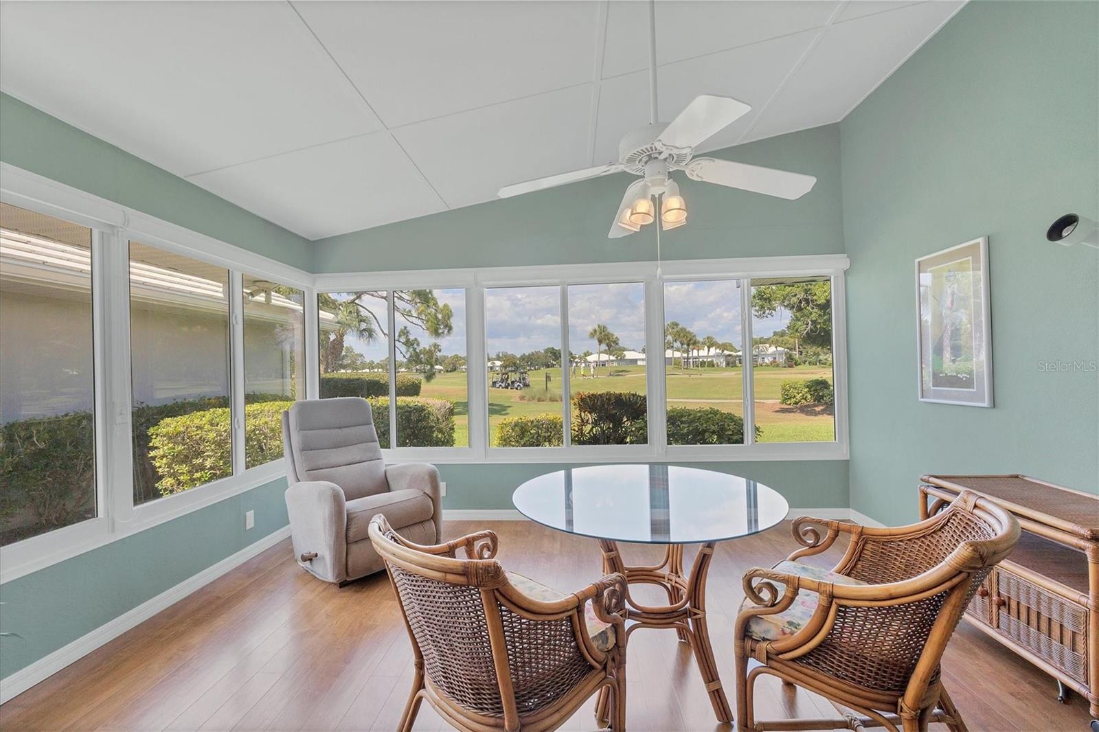 Wake up to sunrise across the verdant fairway from the 2 bedroom/2 bath patio home. Enter into a great room that opens to the Florida room and the view beyond. An eat-in kitchen will delight the chef in the family. The desirable split bedroom plan provides privacy for all. An attached two car garage house the laundry area, storage and a place to keep you vehicle out of the sun. The exterior has a fresh coat of paint. This home is ready for a new owner to make it their own. This 40 unit community has its own pool and clubhouse where you can relax and socialize. Fee includes all exterior building and grounds maintenance, insurance on the building, pest control and basic cable. NO CDD FEES. Membership in the private golf & country club is optional.