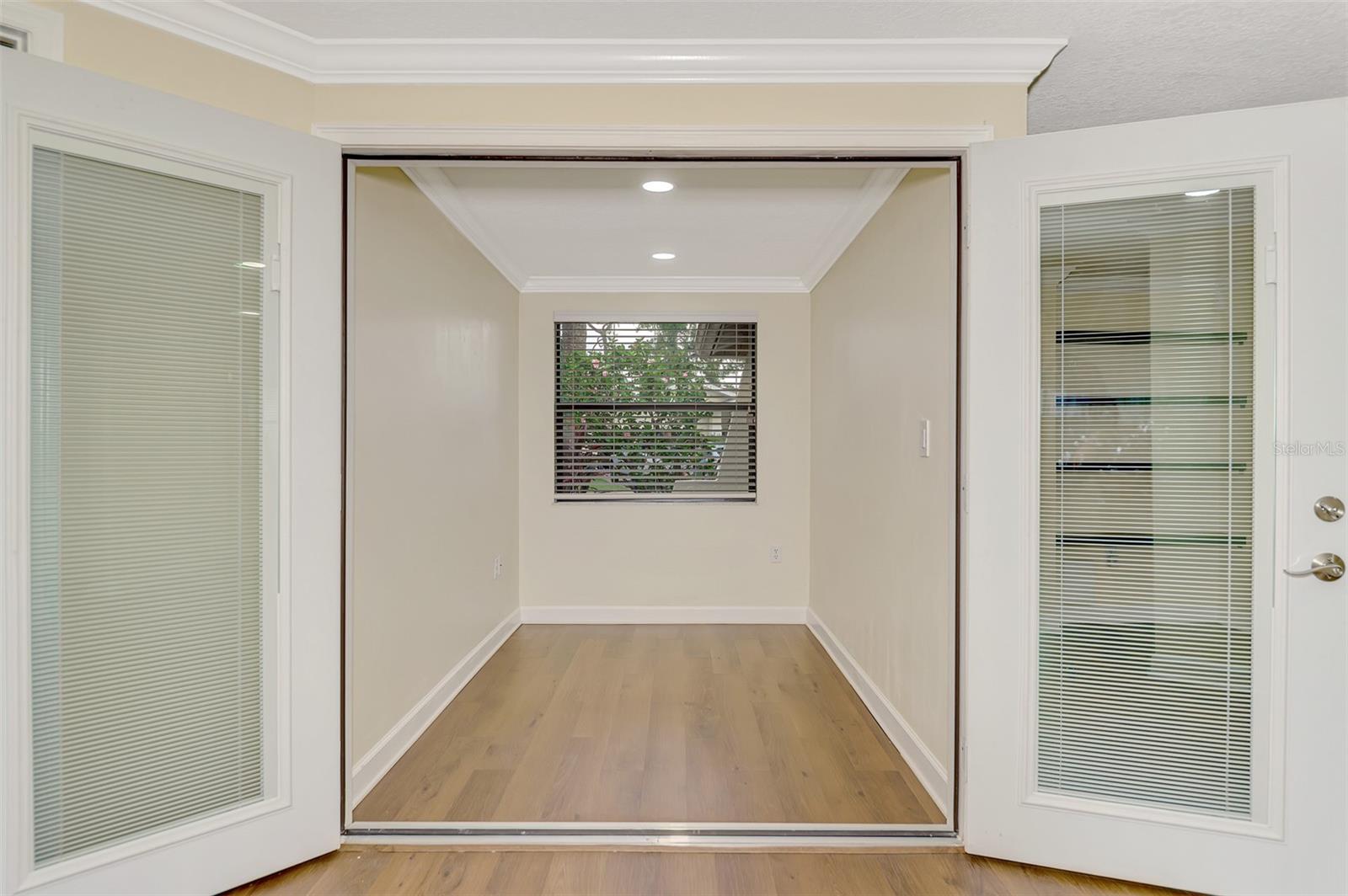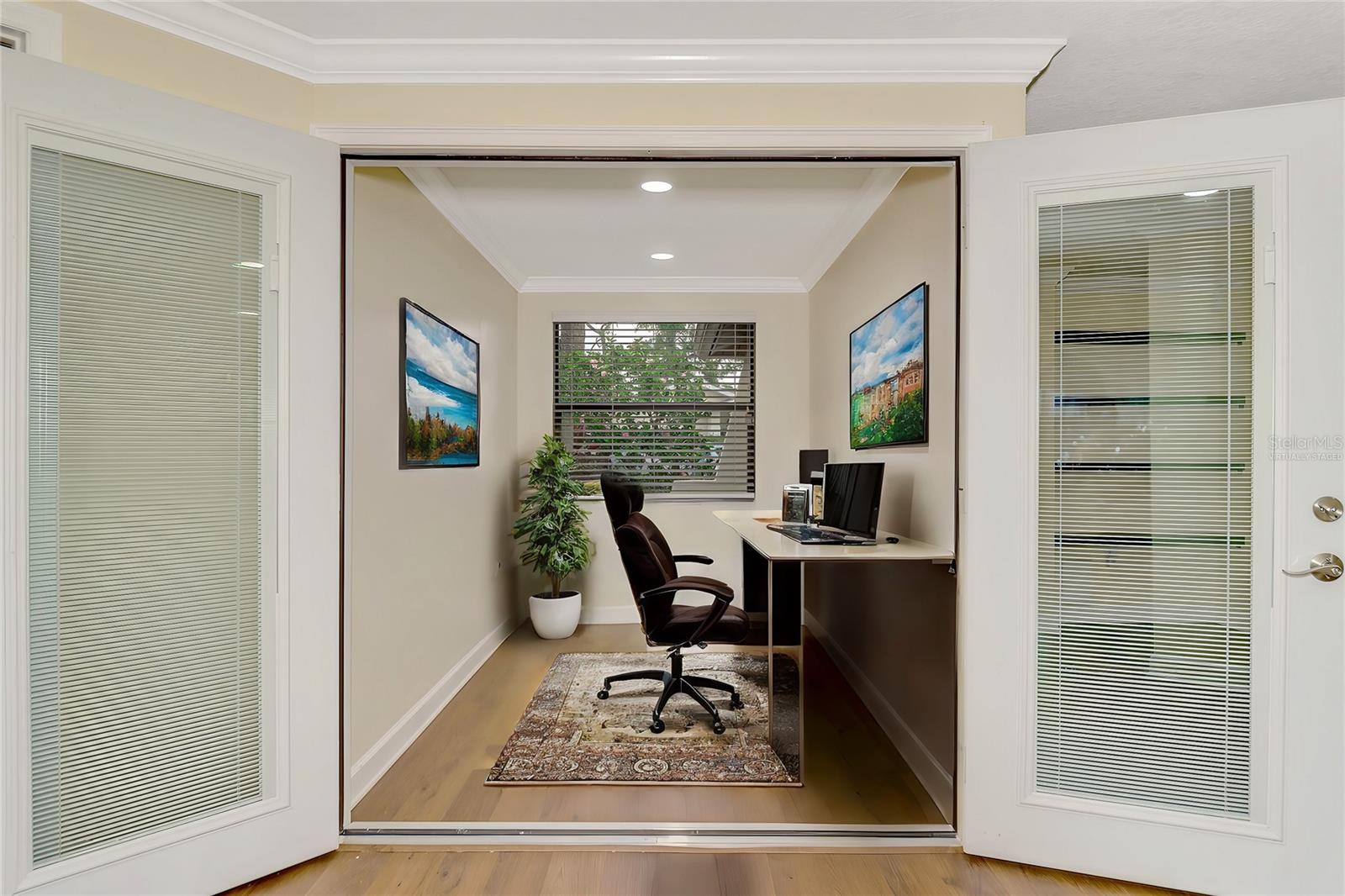 One or more photo(s) has been virtually staged. Discover your ideal retreat in this beautifully appointed 2-bedroom, 2-bathroom home boasting spectacular GOLF COURSE VIEWS. Nestled in a serene setting, this residence offers a perfect blend of elegance and comfort. Enjoy panoramic views of the golf course from your spacious lanai, perfect for relaxing or entertaining guests. The home features luxury vinyl flooring throughout, complemented by crown molding and new recessed lighting for a modern touch. A wood-burning fireplace enhances the charm of the great room, creating a cozy atmosphere. Utilize the bonus room as an office, hobby space, or additional guest accommodation, offering flexibility to suit your lifestyle. Benefit from the convenience of a 2-car garage, providing secure parking and additional storage space. New garage door 2023, NEW ROOF and electrical panel 2022 and A/C 2021. Whether you're relaxing indoors by the fireplace or enjoying the scenic views from your lanai, this home offers a serene and luxurious lifestyle in a highly desirable location. No CDD and not in a flood zone. CITY WATER AND SEWER AND VERY LOW HOA FEES. Carlentini is a friendly, quaint, deed restricted community consisting of only 75 homes.....located in the heart of Venice.....just minutes to golf, shopping, restaurants, easy access to HWY 75, the new hospital....only 4 miles to Historic downtown Venice and Venice beach and 5 miles to Nokomis Beach. Several parks close by with hiking trails and a short distance to the Legacy Trail. Enjoy beautiful sunrises daily, wildlife, and a variety of birds in your backyard. You will love the peaceful setting on the quiet cul de sac of Strada D Argento.