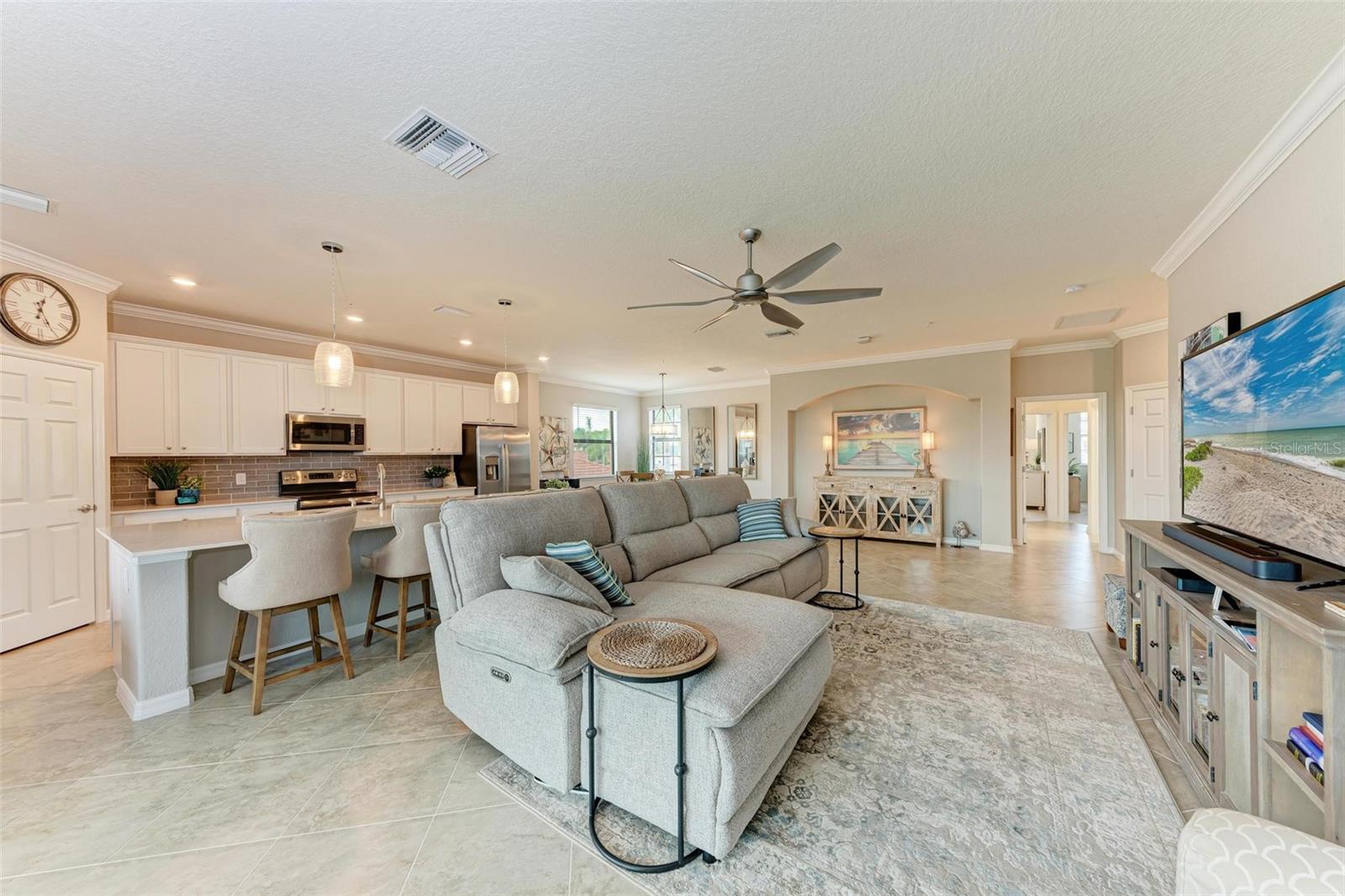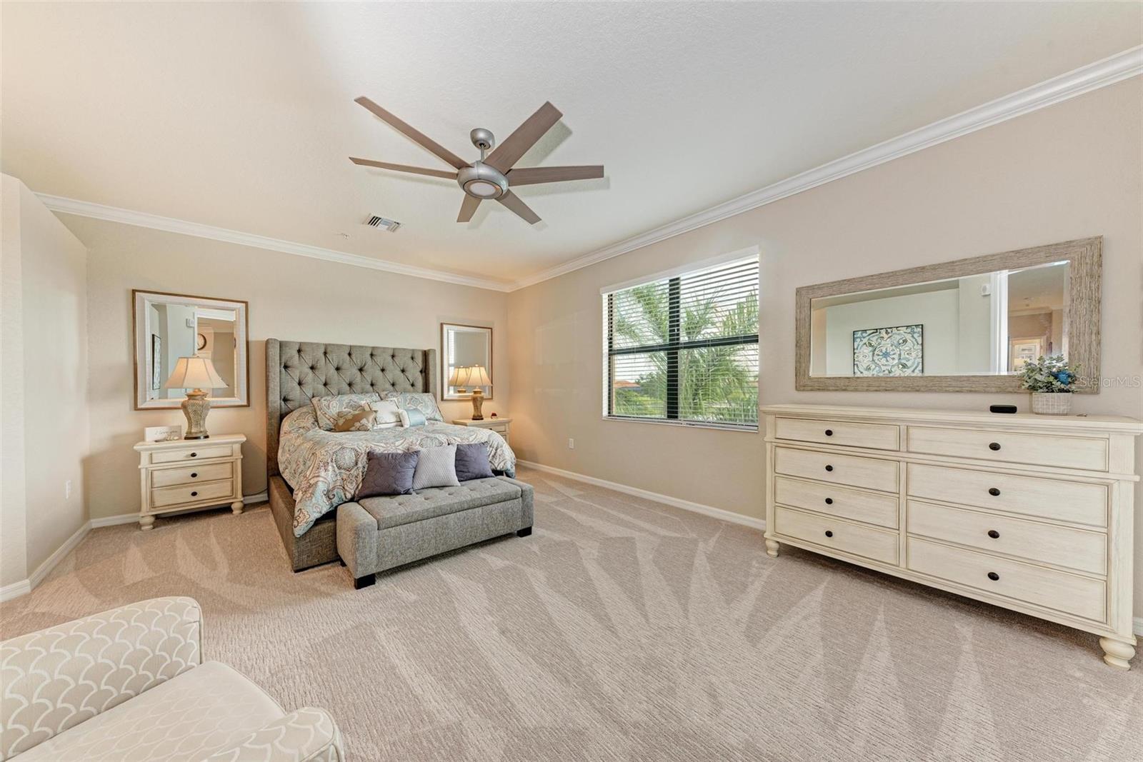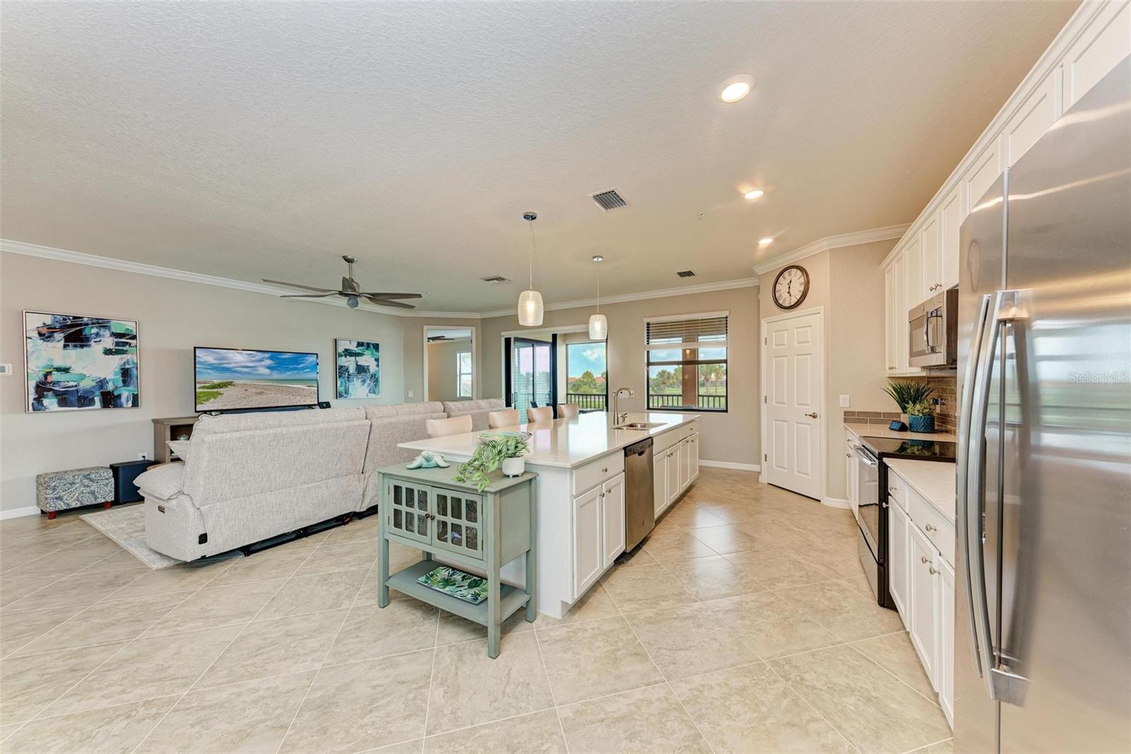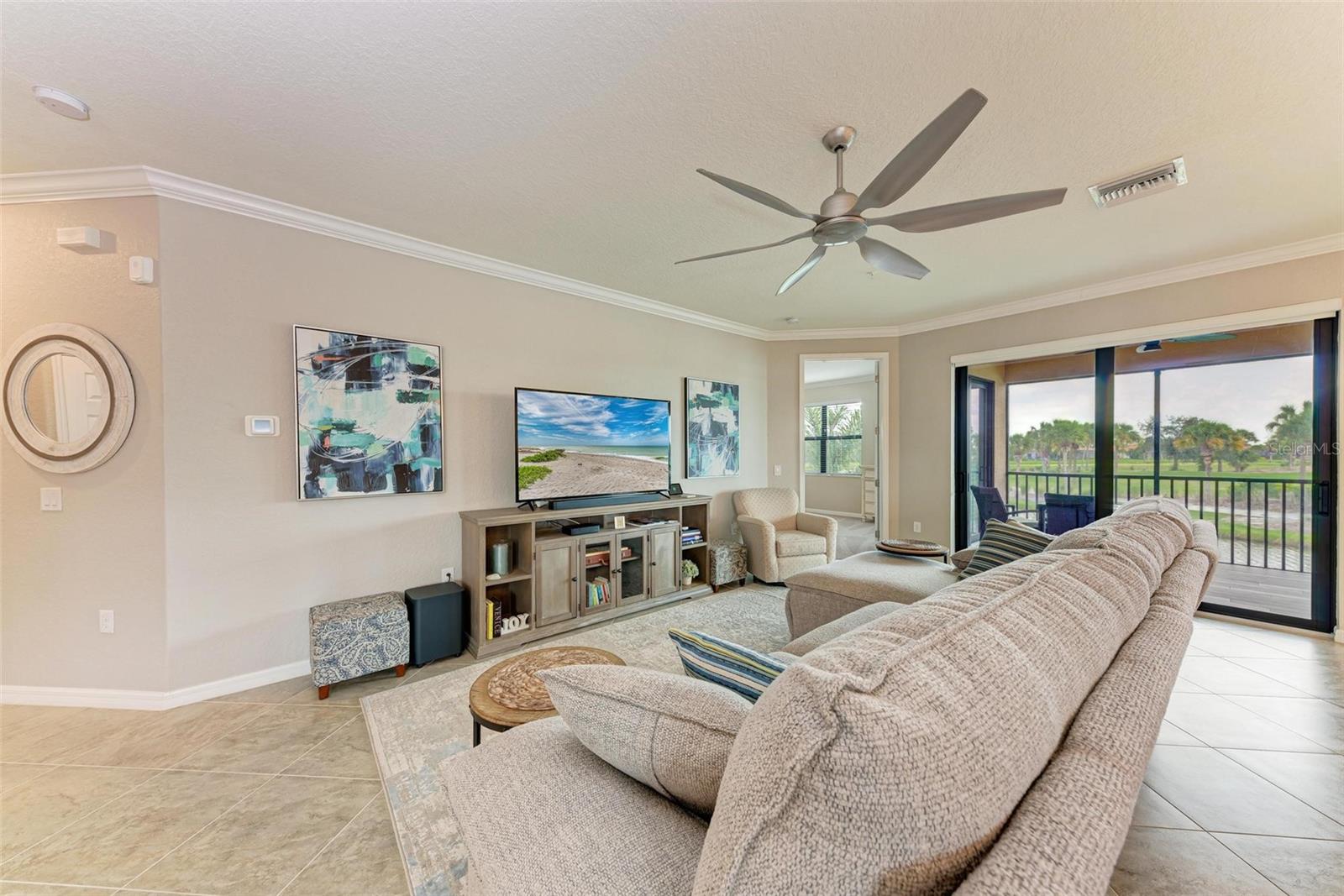 Available for IMMEDIATE OCCUPANCY and Partially Furnished Optional. HIGH IMPACT WORLD CLASS SHOWCASE VIEWS! No Flood Zone. Welcome to a life of unparalleled luxury and comfort in the sought after Sarasota National Golf Club, a gated community that embodies the essence of Florida living. Nestled within this sprawling 2,500-acre haven, this exquisite three-bedroom, two-bath, 2.5 car garage condominium offers the ultimate blend of elegance and tranquility. Situated in a coveted location within an 18-hole championship golf course community, this home overlooks the 3rd and 4th holes and comes with 2 golf memberships included. It's a golfer's paradise, offering direct access to meticulously manicured fairways and greens. Residents can also enjoy a resort-style pool, an upscale restaurant, a professional golf shop, tennis courts, pickle ball court, bocce ball and a state-of-the-art fitness center, all within the community. This newer, expansive retreat boasts breathtaking water and golf course views that are simply unmatched. The residence is ideally situated just 10 minutes from pristine, uncrowded beaches, offering the perfect balance between serene golf course living and the vibrant coastal lifestyle. Located in the esteemed Sarasota National Community in charming Venice, Florida, this home is a testament to refined living. Upon entering this polished condo, you are greeted by an abundance of natural light, thanks to the 9-foot ceilings, large windows, and oversized sliding doors, all equipped with the highest-rated hurricane impact glass for added peace of mind. The open floor plan seamlessly connects the living room, kitchen, and dining room, all adorned with crown molding and designed to maximize the stunning views. The kitchen is a culinary haven, featuring a large island, custom backsplash, upgraded refrigerator, and stylish pendant lights, making it perfect for both casual meals and entertaining. The primary bedroom is a sanctuary of comfort, featuring new high-end carpet and padding throughout the room and closets, custom window treatments, and an upgraded ceiling fan. This tranquil space includes two spacious walk-in closets and an en suite bathroom that exudes luxury with its split vanities and expansive walk-in shower. The additional two bedrooms are equally inviting, each featuring carpets and walk-in closets, offering both elegance and practicality. The second bathroom is thoughtfully designed with a tub and shower combination, providing ample space and comfort. Additionally, the home includes a designated laundry room, complete with a washer and dryer for added convenience. A true gem of this condo is the spacious 20-foot lanai, offering panoramic views of the state-of-the-art golf course and serene waterways. This outdoor space is perfect for relaxing or entertaining, allowing you to fully immerse yourself in the beauty of your surroundings. Beyond the community's luxurious offerings, the location is equally impressive. Just minutes away, you'll find the charm of Historic Downtown Venice, with its quaint shops, gourmet restaurants, and cultural attractions. The home is also close to the Atlanta Braves' spring training camp at CoolToday Park Stadium, as well as the vibrant town center of Wellen Park. With Venice Beach, Nokomis Beach and the historic downtown Venice all within a short drive, this residence offers an opportunity to experience the best of Florida living.