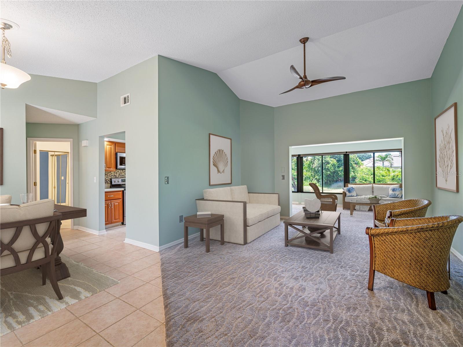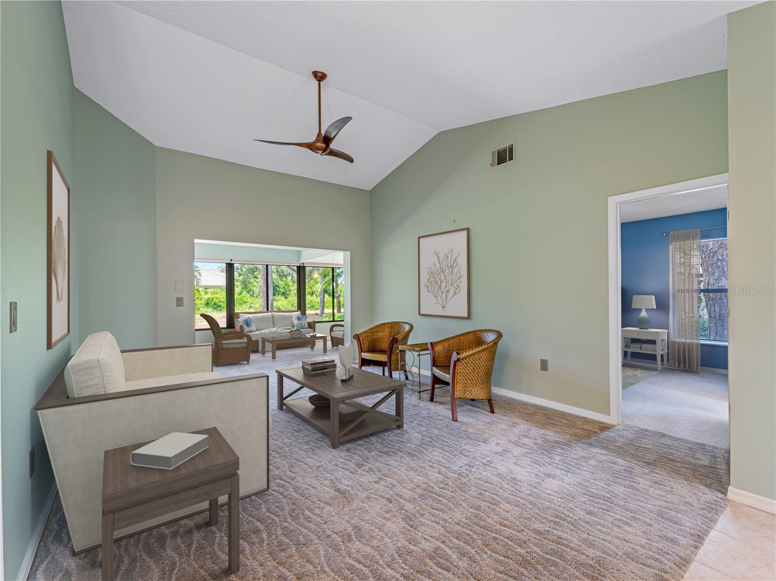 One or more photo(s) has been virtually staged. Charming Maintenance-Free villa, featuring two primary suites, two full baths and a two-car garage. Situation on a beautiful street lined with mature oak trees. Key Features include a spacious floor plan with a generous bonus room, ideal for a den or office. The foyer leads into the living room with cathedral ceilings, extending to the sunlit Florida Room at the rear of the house. The updated kitchen boasts solid surface countertops, a stylish tile backsplash, raised wood panel cabinetry with convenient pull-out shelves, and stainless steel appliances. Recent updates include an AC unit installed in 2018 and an electrical panel updated in 2014. Myrtle Trace boasts amenities such as the nearby community clubhouse which hosts various activities and features a heated community pool. An optional membership to The Plantation Golf & Country Club is available and provides access to two 18-hole championship golf courses, a fitness center, tennis courts, a heated Jr Olympic size pool, diverse dining options, and a range of activities. Whether you're seeking a winter retreat or a year-round residence, this property presents an ideal opportunity for comfortable living and leisure. Local beaches are just a 10-15 minute drive away.