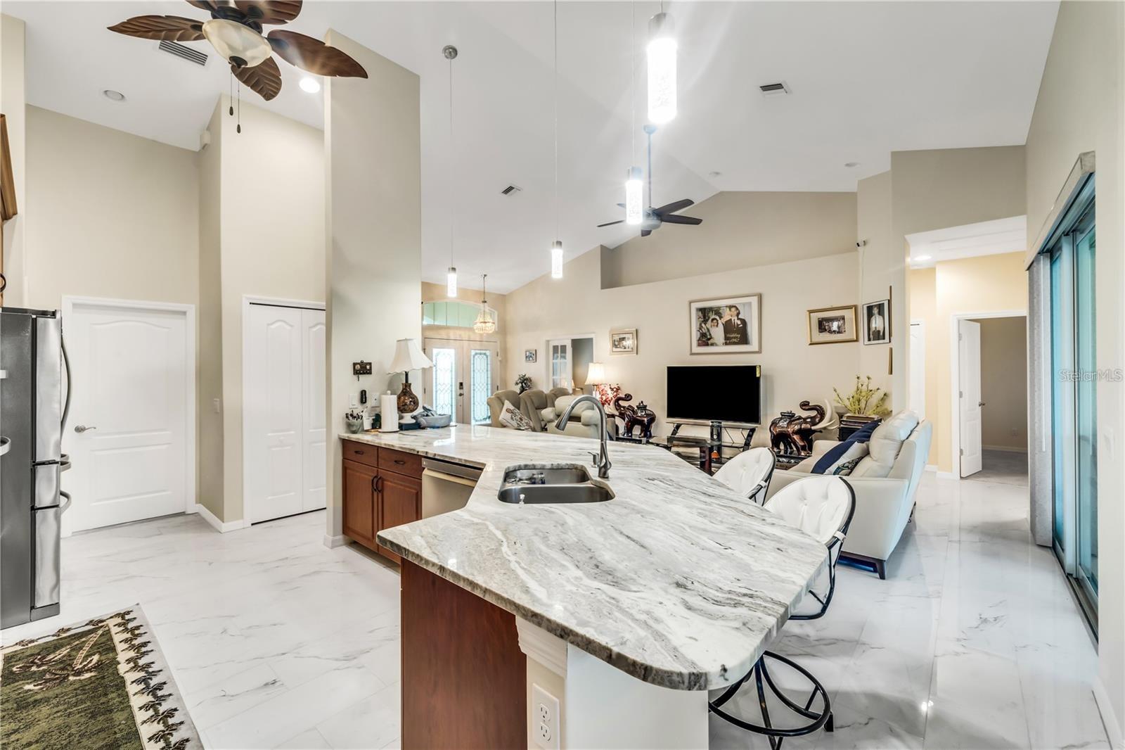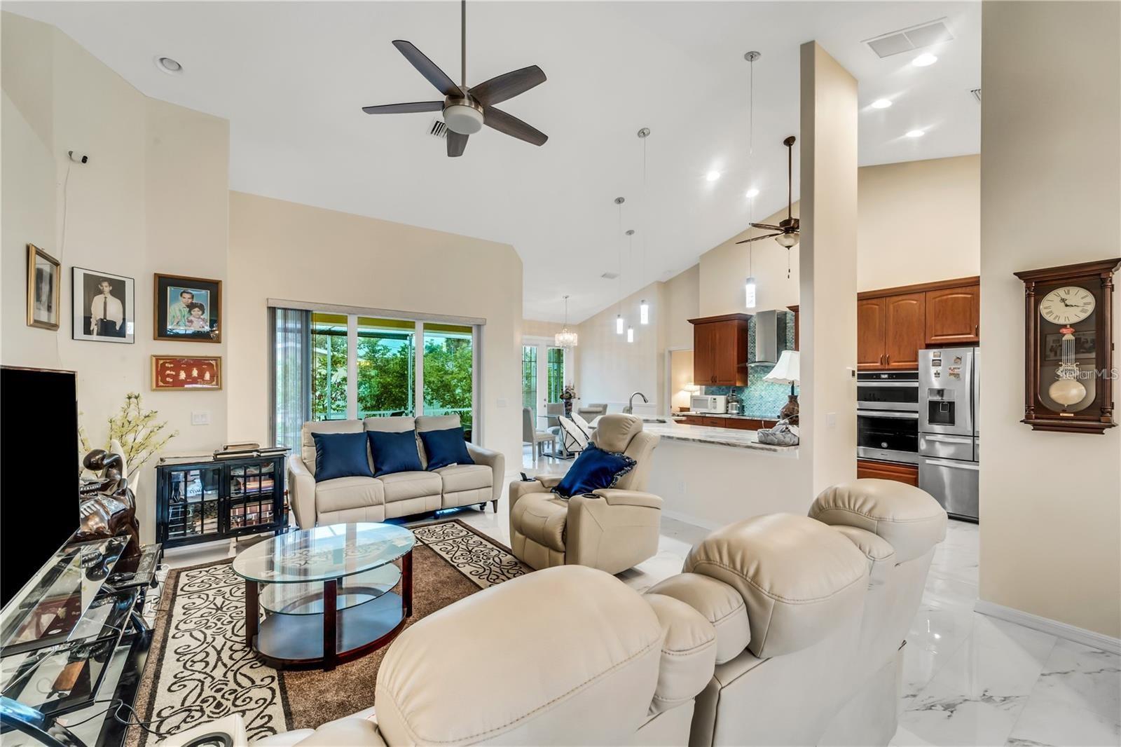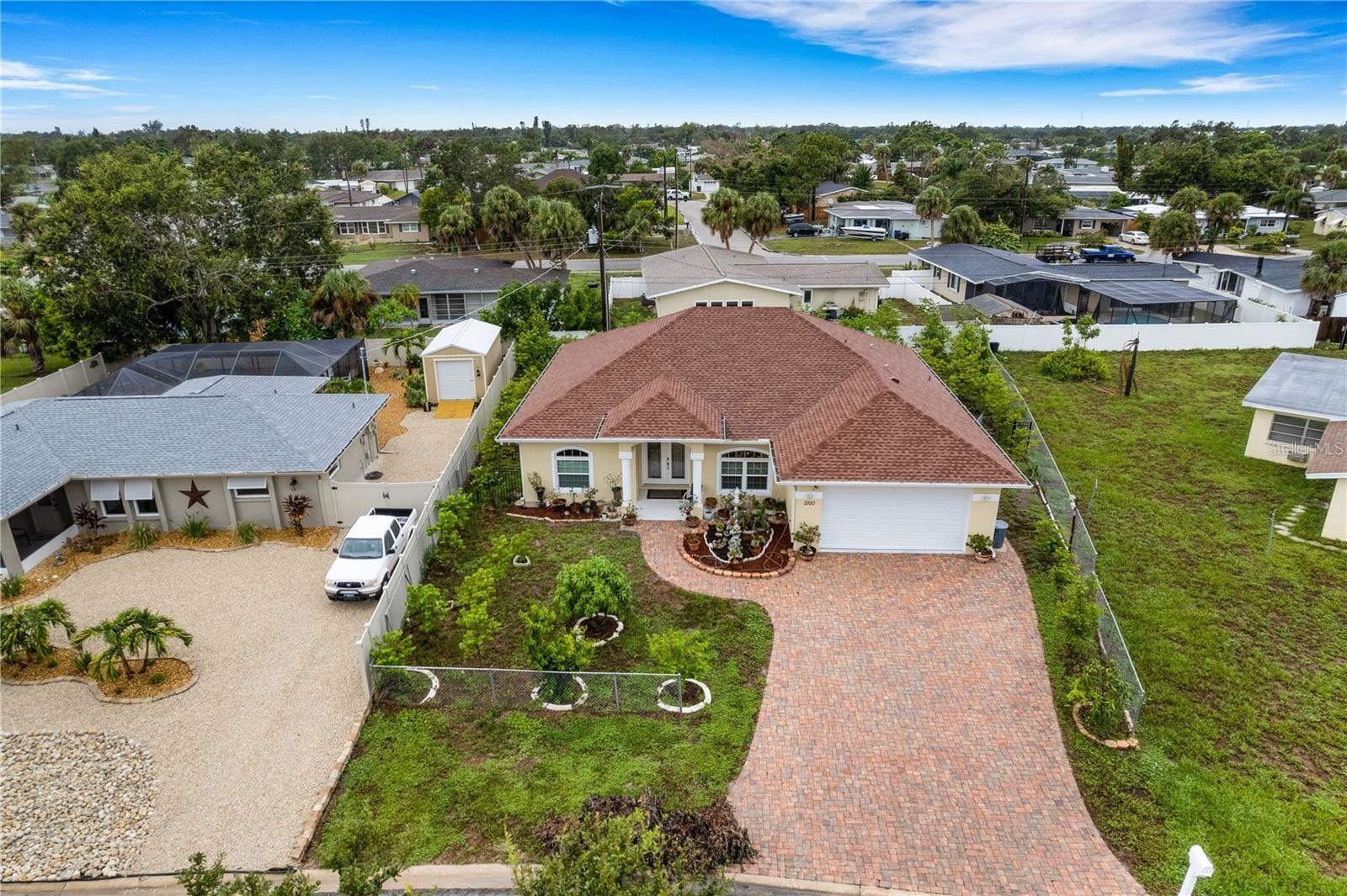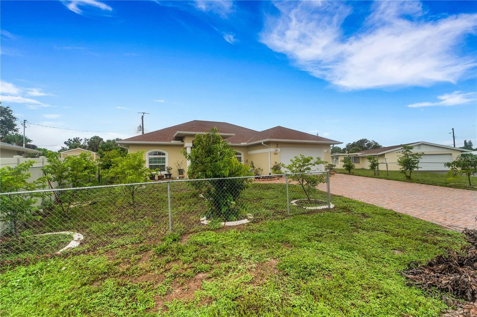 Welcome to your dream home in Venice Gardens, where comfort, style, and functionality come together in perfect harmony. This stunning residence features 3 bedrooms plus a versatile den, offering plenty of space for your family’s needs, with 2 bathrooms and a 2-car garage, convenience is paramount. Nestled in a charming neighborhood with public water and sewer services, this property provides a serene and private retreat. The fenced lot enhances your privacy, while the open floor plan ensures a seamless flow throughout the home, bathed in natural light that brightens every room. The thoughtfully designed split bedroom layout offers personal space for everyone, complemented by ceiling fans throughout to maintain a comfortable atmosphere year-round. Elegant ceramic tile flooring combines beauty with easy maintenance, and high-impact glass windows add both security and sophistication. The property’s curb appeal is enhanced by a stylish brick paver driveway, well-maintained gutters and downspouts, and a freshly installed fence. The beautifully landscaped yard invites you to relax on the screened lanai or enjoy the privacy of the fenced backyard. Step inside to find an expansive and open floor plan that connects the formal dining room and living room effortlessly. Cathedral ceilings and recessed lighting create an inviting ambiance, while sliding glass doors open to the extended lanai, seamlessly blending indoor and outdoor living. The heart of the home is its exquisite kitchen, designed for both functionality and style. Featuring granite countertops, upgraded stainless steel appliances, a flat cooktop with a modern hood that vents outside, and a wall-mounted oven and microwave, this kitchen is perfect for culinary enthusiasts. Ample storage, including two closet pantries, and a spacious breakfast bar make it ideal for family gatherings. The dinette area, surrounded by windows and with two French doors leading to the lanai, is perfect for casual meals and morning coffee. The master bedroom, located for privacy, is a spacious sanctuary with a luxurious en-suite bathroom. Enjoy the dual vanity, jetted bathtub, large tiled shower, and a generous walk-in closet. The expansive study/den overlooks the front yard and offers a versatile space for work or relaxation. The additional bedrooms are equally inviting and generously sized. This property is a masterpiece of modern living, combining stylish design with practical features for an exceptional experience. Located just two miles from Venice Island and the Gulf of Mexico, as well as close to Legacy Trail, dining options, and the quaint shops of historic downtown Venice, it’s ready to welcome you home.
