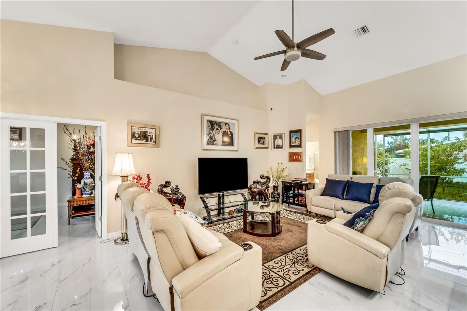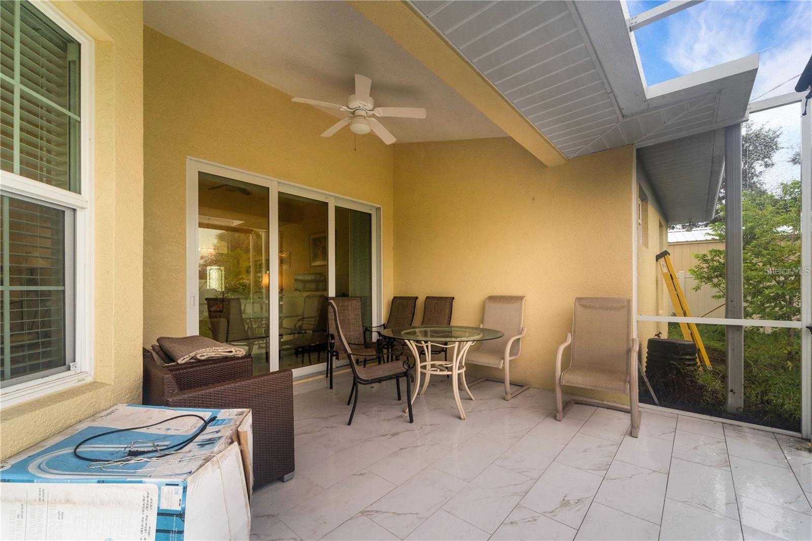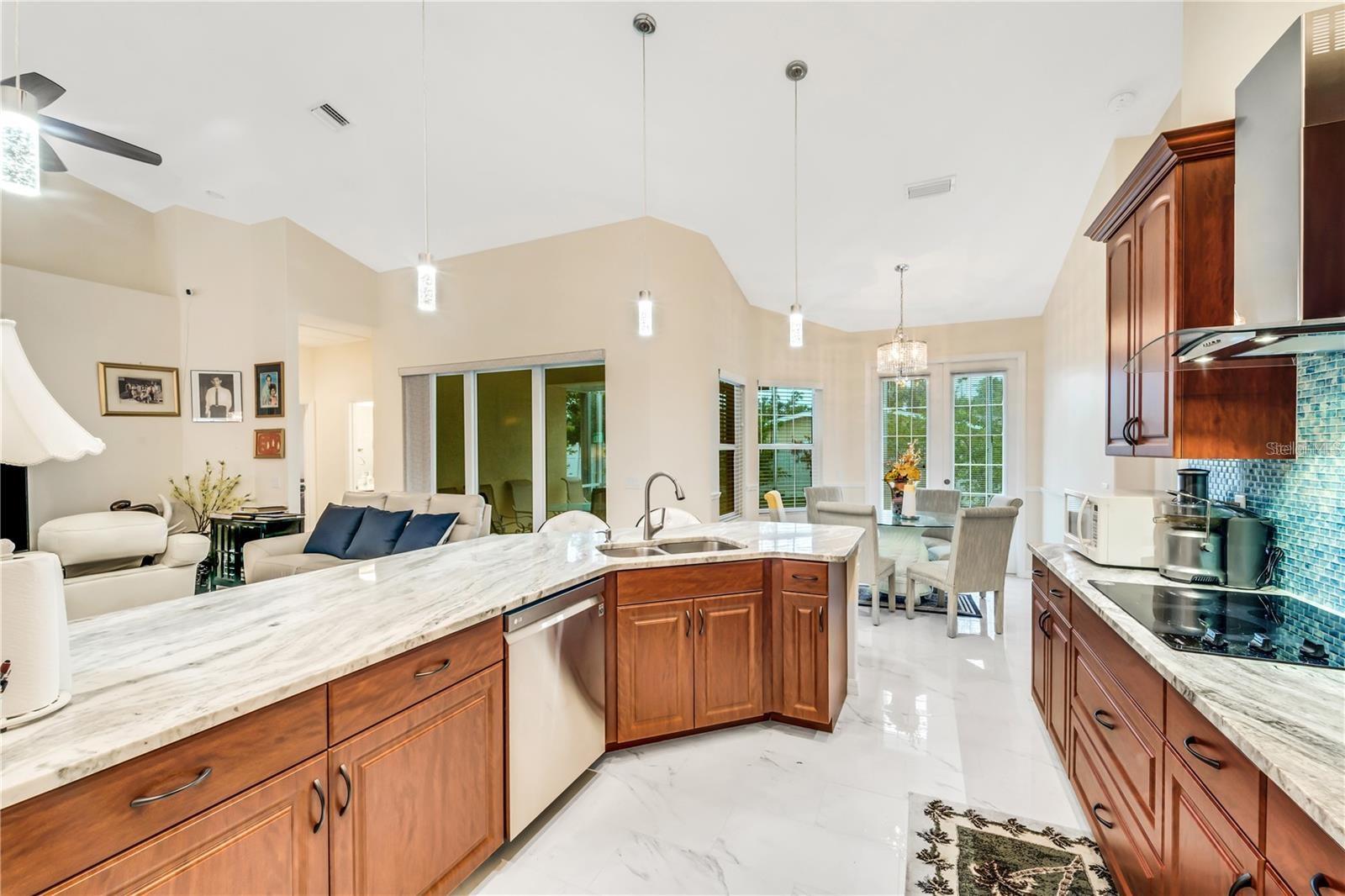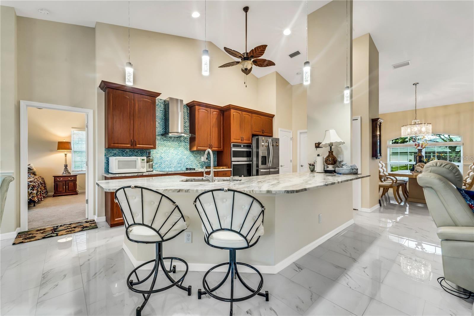 Welcome to your dream home in Venice Gardens, where comfort, style, and functionality come together in perfect harmony. This stunning residence features 3 bedrooms plus a versatile den, offering plenty of space for your family’s needs, with 2 bathrooms and a 2-car garage, convenience is paramount. Nestled in a charming neighborhood with public water and sewer services, this property provides a serene and private retreat. The fenced lot enhances your privacy, while the open floor plan ensures a seamless flow throughout the home, bathed in natural light that brightens every room. The thoughtfully designed split bedroom layout offers personal space for everyone, complemented by ceiling fans throughout to maintain a comfortable atmosphere year-round. Elegant ceramic tile flooring combines beauty with easy maintenance, and high-impact glass windows add both security and sophistication. The property’s curb appeal is enhanced by a stylish brick paver driveway, well-maintained gutters and downspouts, and a freshly installed fence. The beautifully landscaped yard invites you to relax on the screened lanai or enjoy the privacy of the fenced backyard. Step inside to find an expansive and open floor plan that connects the formal dining room and living room effortlessly. Cathedral ceilings and recessed lighting create an inviting ambiance, while sliding glass doors open to the extended lanai, seamlessly blending indoor and outdoor living. The heart of the home is its exquisite kitchen, designed for both functionality and style. Featuring granite countertops, upgraded stainless steel appliances, a flat cooktop with a modern hood that vents outside, and a wall-mounted oven and microwave, this kitchen is perfect for culinary enthusiasts. Ample storage, including two closet pantries, and a spacious breakfast bar make it ideal for family gatherings. The dinette area, surrounded by windows and with two French doors leading to the lanai, is perfect for casual meals and morning coffee. The master bedroom, located for privacy, is a spacious sanctuary with a luxurious en-suite bathroom. Enjoy the dual vanity, jetted bathtub, large tiled shower, and a generous walk-in closet. The expansive study/den overlooks the front yard and offers a versatile space for work or relaxation. The additional bedrooms are equally inviting and generously sized. This property is a masterpiece of modern living, combining stylish design with practical features for an exceptional experience. Located just two miles from Venice Island and the Gulf of Mexico, as well as close to Legacy Trail, dining options, and the quaint shops of historic downtown Venice, it’s ready to welcome you home.