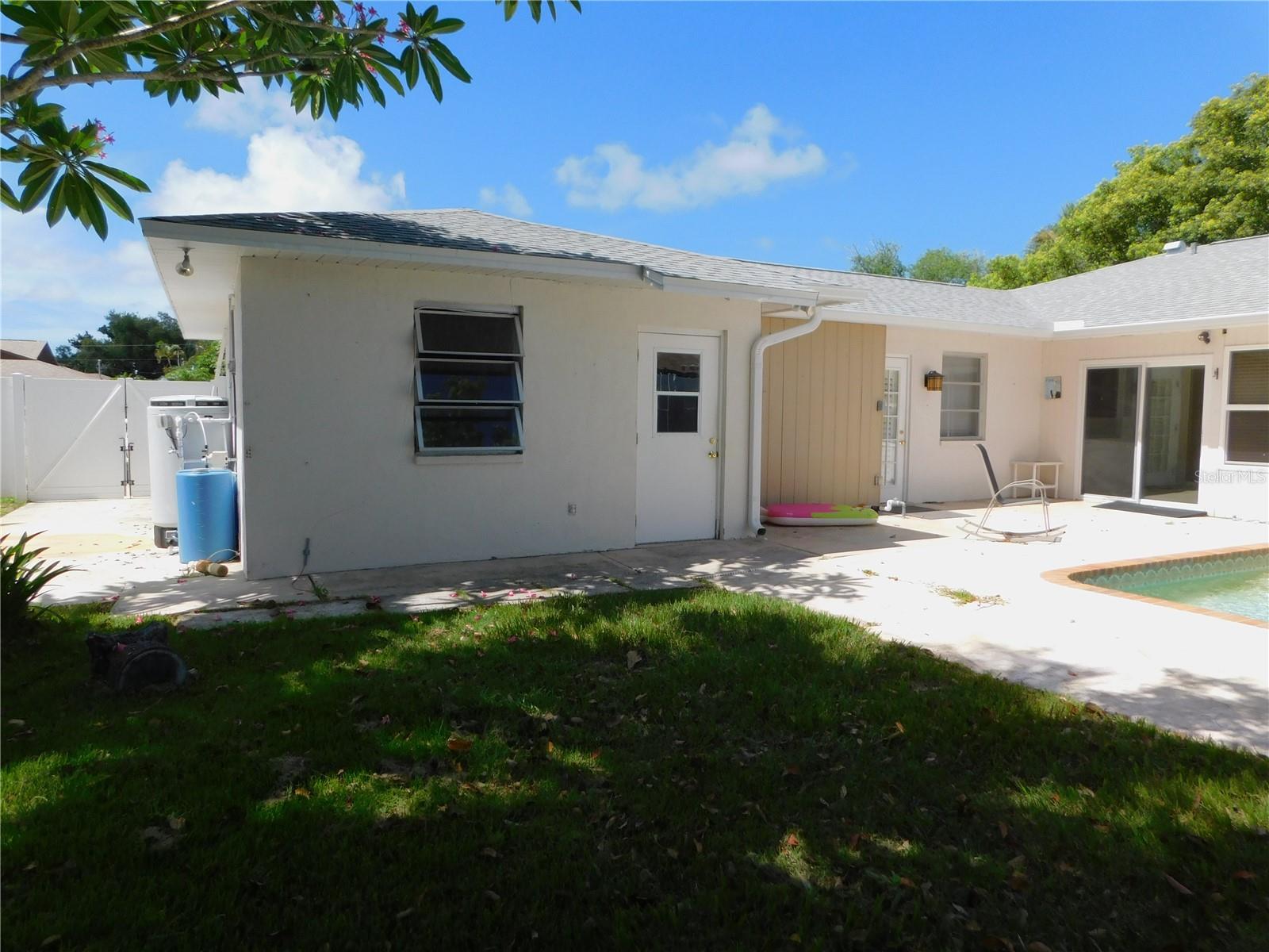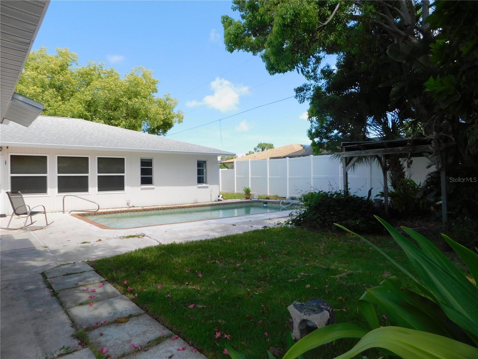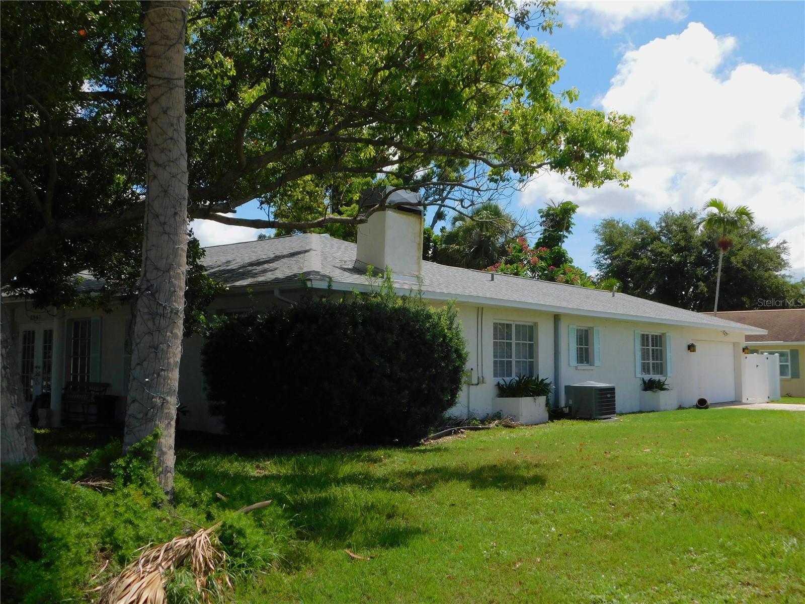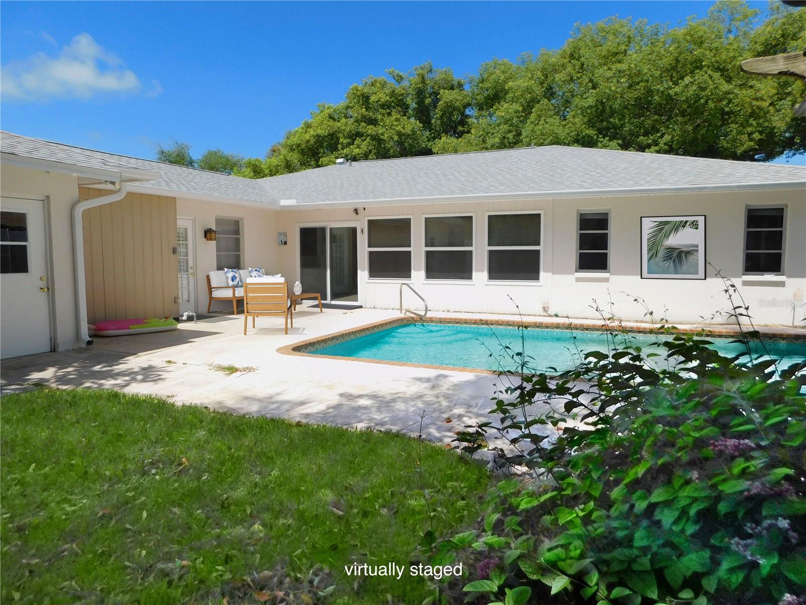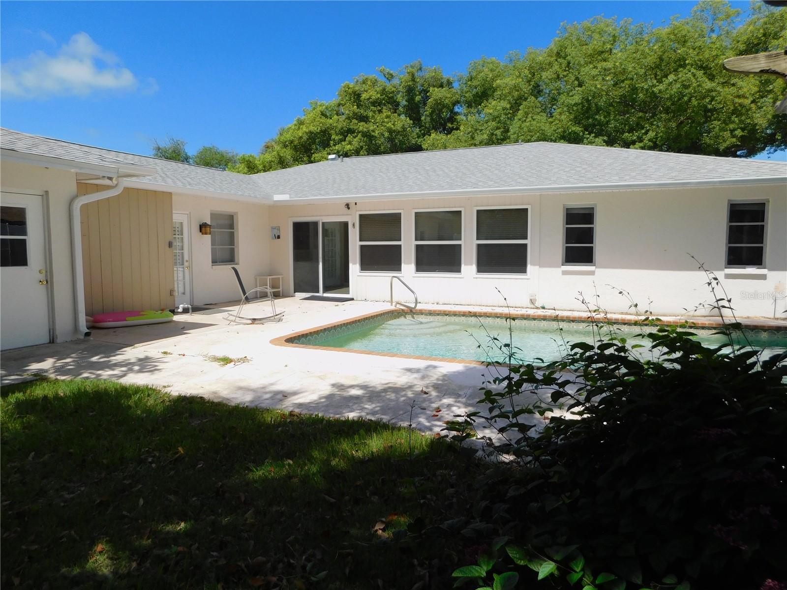 Very distinctive Southern style home with 2 master suites! Large office area with Mexican tile and sliders going to pool area. Large corner lot in the coveted South Venice neighborhood. This lovely home has spacious rooms and an L shape around the backyard pool. Lush landscaping around pool area, and the backyard is totally fenced with PVC fencing and 2 double gates to put a boat, jet skis, or other toys inside the fenced area! Wood burning fireplace adds charm in the living room and there are beautiful Plantation shutters on the windows in the main areas. **Interior walls of home were painted in July 2024. Whole house (except laundry room and office) has been updated with gorgeous luxury vinyl flooring in August 2024. Oversized side load garage with wide driveway. A/C changed out in 2019. New septic tank and drain field in 2021. New roof in 2023.**