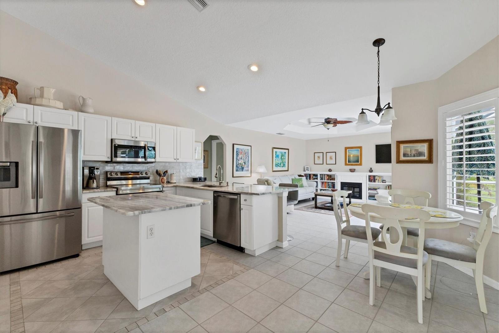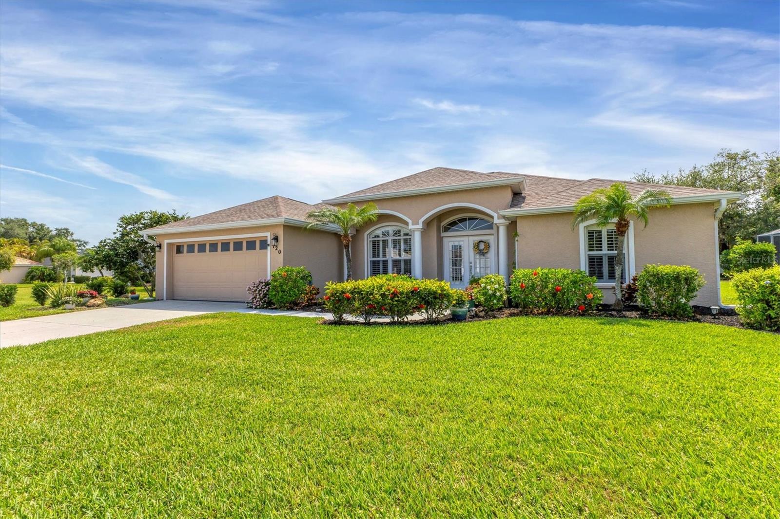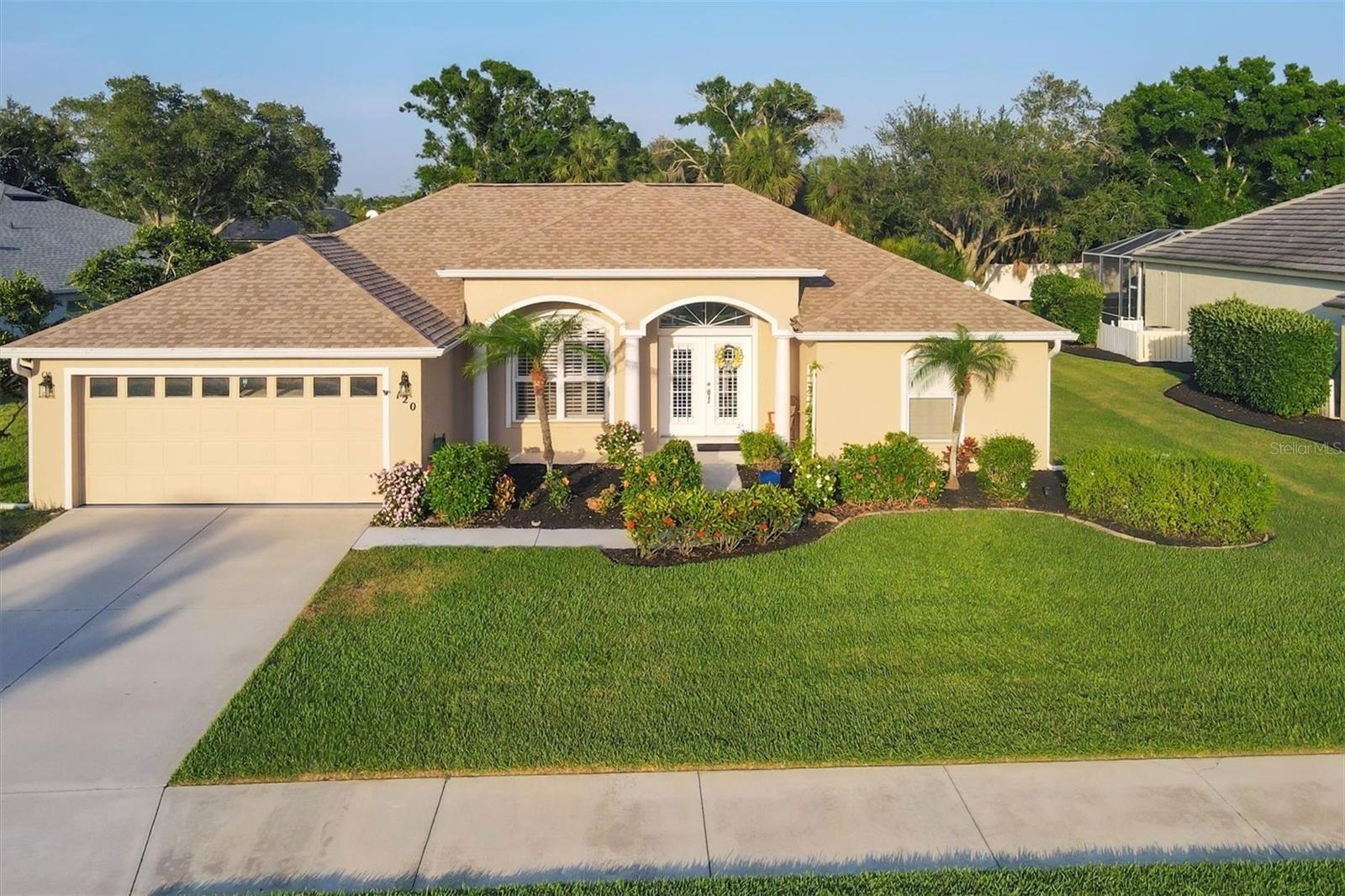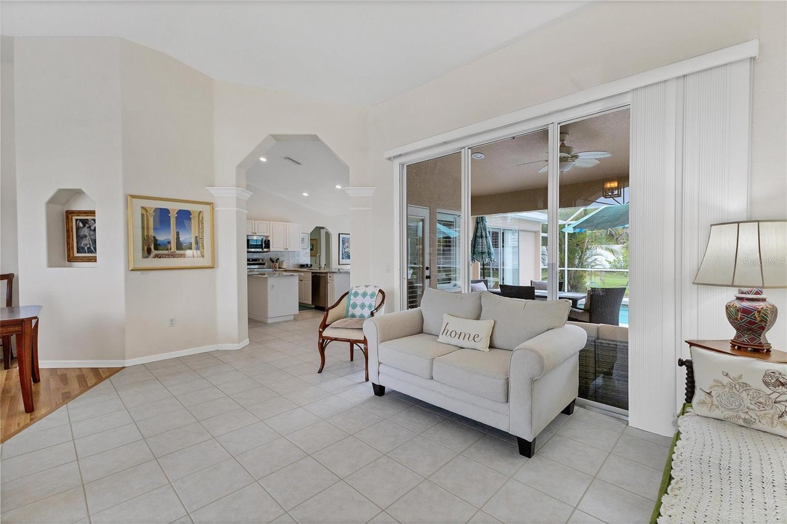 A home with an elegant open floor plan design. A 3/2 with a heated pool on a large lot with lovely landscaping and privacy. Classic details include archways, Roman columns, Palladium windows, vaulted and tray ceilings, and plantation shutters throughout. The recently updated kitchen has granite counters, an island, a seating counter area, and S/S appliances. The dinette has an aquarium window overlooking the lanai and pool. The family room is a relaxing space with an electric fireplace and built in book shelves. This is a split plan with two good size guest bedrooms. The spacious master bedroom is a restful retreat with extra space for a sitting area. A large renovated master bath has a new walk in shower and dual sinks. This well cared for home has a NEW ROOF 2023, two new impact resistant sliding glass doors on the lanai 2024, and exterior painted 2022. Venice Palms has a low HOA fee, sidewalks, a walking trail, and open green space, is dog friendly, and is 4.2 miles to Venice Island and the beach. This home is in move in condition and waiting for you. No damage from recent hurricanes.