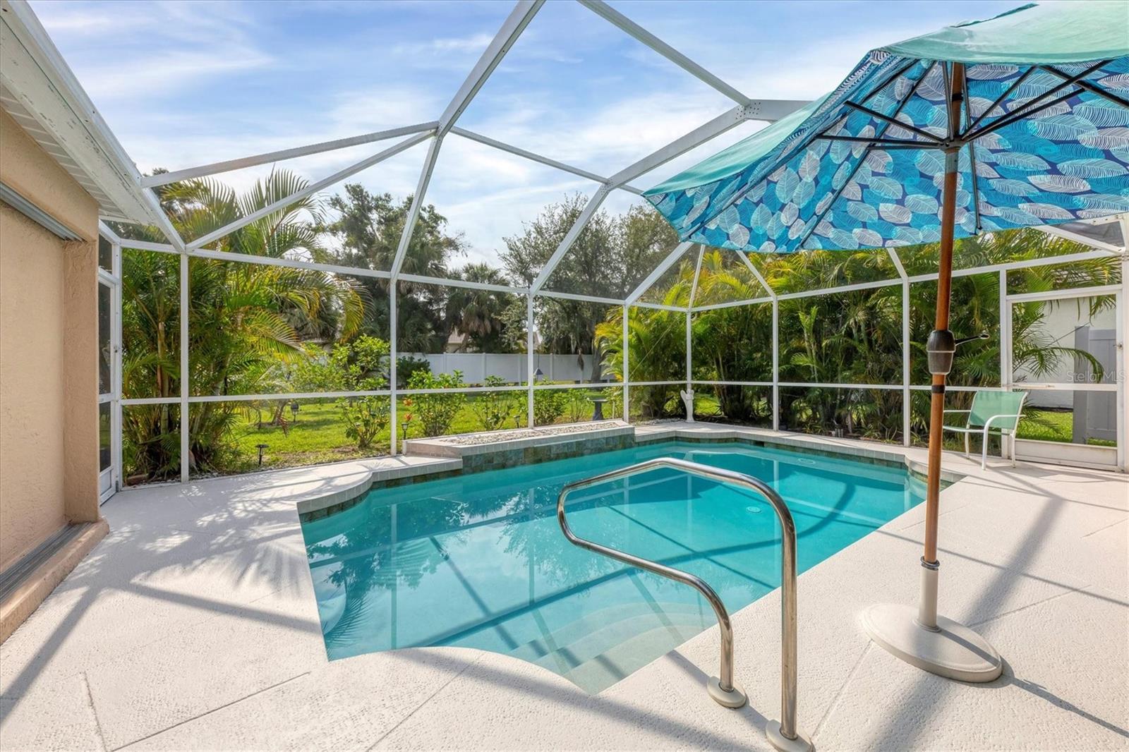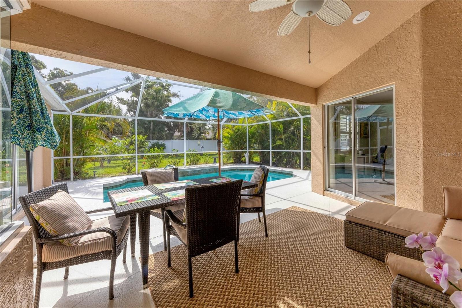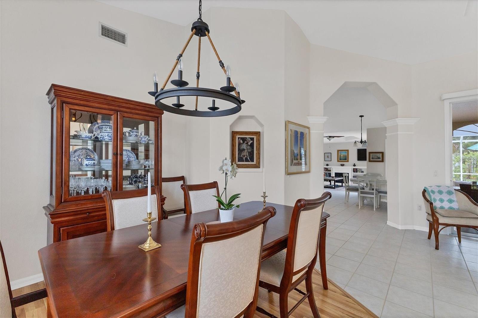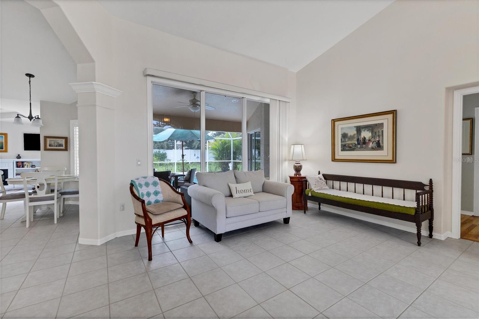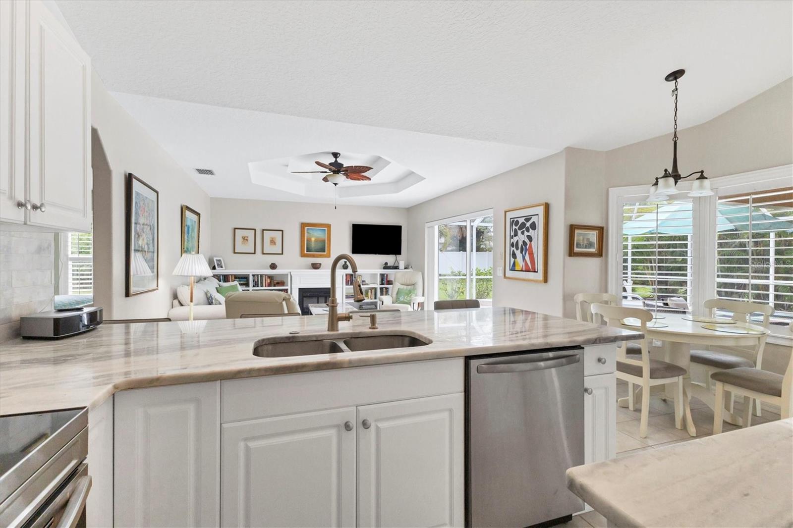 A home with an elegant open floor plan design. A 3/2 with a heated pool on a large lot with lovely landscaping and privacy. Classic details include archways, Roman columns, Palladium windows, vaulted and tray ceilings, and plantation shutters throughout. The recently updated kitchen has granite counters, an island, a seating counter area, and S/S appliances. The dinette has an aquarium window overlooking the lanai and pool. The family room is a relaxing space with an electric fireplace and built in book shelves. This is a split plan with two good size guest bedrooms. The spacious master bedroom is a restful retreat with extra space for a sitting area. A large renovated master bath has a new walk in shower and dual sinks. This well cared for home has a NEW ROOF 2023, two new impact resistant sliding glass doors on the lanai 2024, and exterior painted 2022. Venice Palms has a low HOA fee, sidewalks, a walking trail, and open green space, is dog friendly, and is 4.2 miles to Venice Island and the beach. This home is in move in condition and waiting for you. No damage from recent hurricanes.