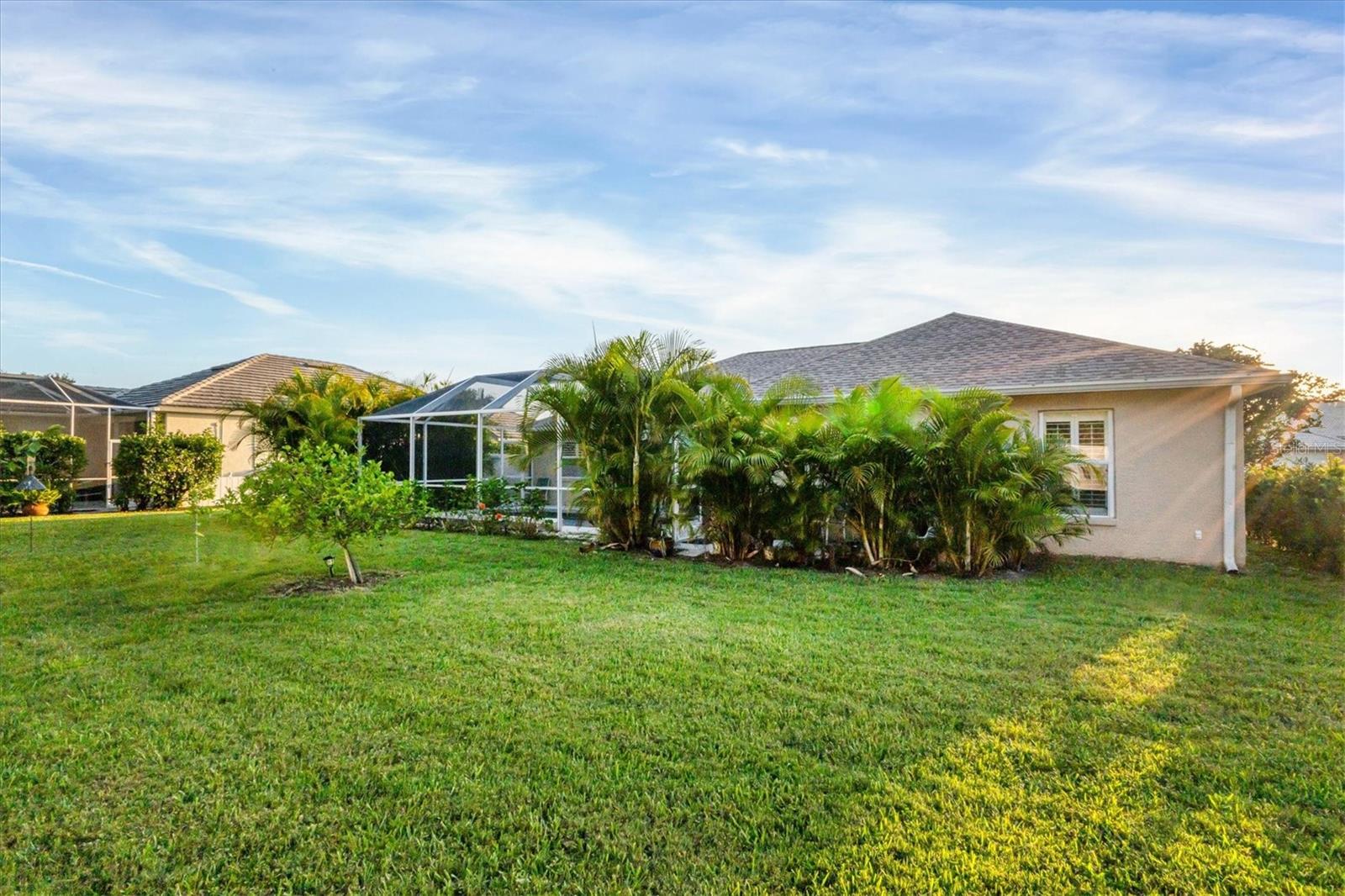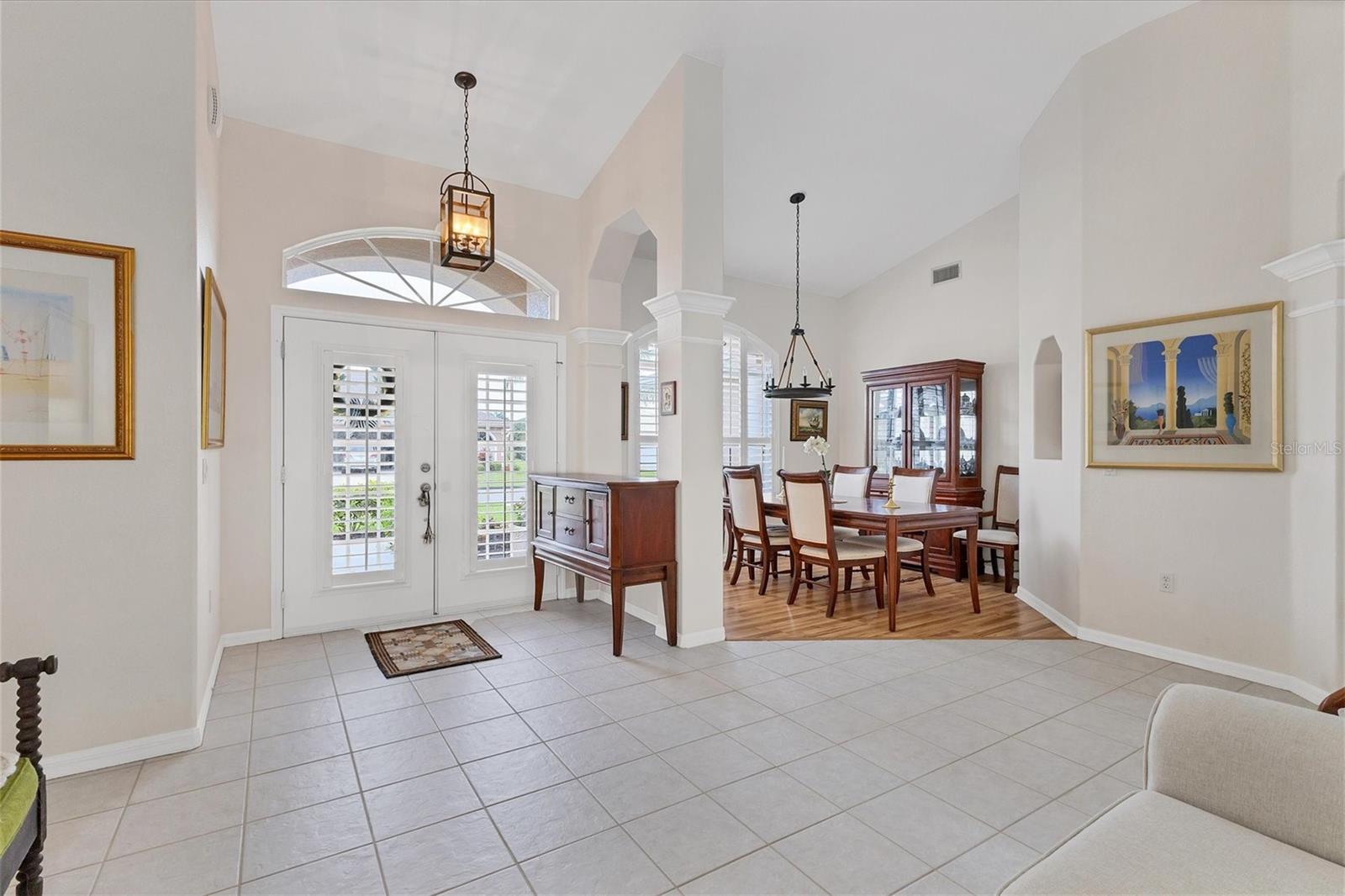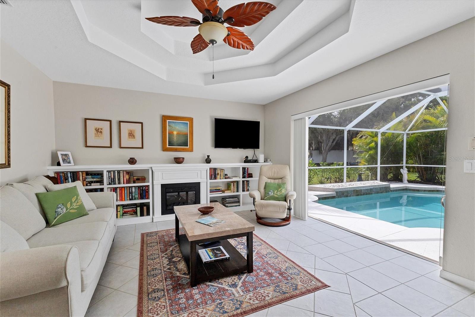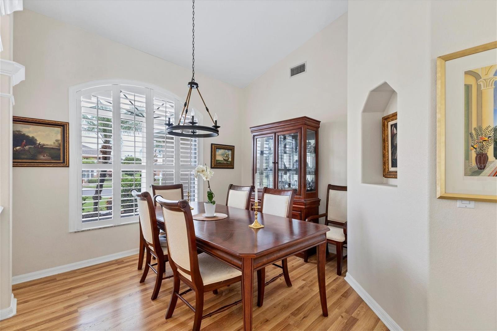 A home with an elegant open floor plan design. A 3/2 with a heated pool on a large lot with lovely landscaping and privacy. Classic details include archways, Roman columns, Palladium windows, vaulted and tray ceilings, and plantation shutters throughout. The recently updated kitchen has granite counters, an island, a seating counter area, and S/S appliances. The dinette has an aquarium window overlooking the lanai and pool. The family room is a relaxing space with an electric fireplace and built in book shelves. This is a split plan with two good size guest bedrooms. The spacious master bedroom is a restful retreat with extra space for a sitting area. A large renovated master bath has a new walk in shower and dual sinks. This well cared for home has a NEW ROOF 2023, two new impact resistant sliding glass doors on the lanai 2024, and exterior painted 2022. Venice Palms has a low HOA fee, sidewalks, a walking trail, and open green space, is dog friendly, and is 4.2 miles to Venice Island and the beach. This home is in move in condition and waiting for you. No damage from recent hurricanes.