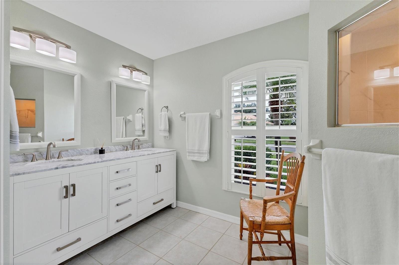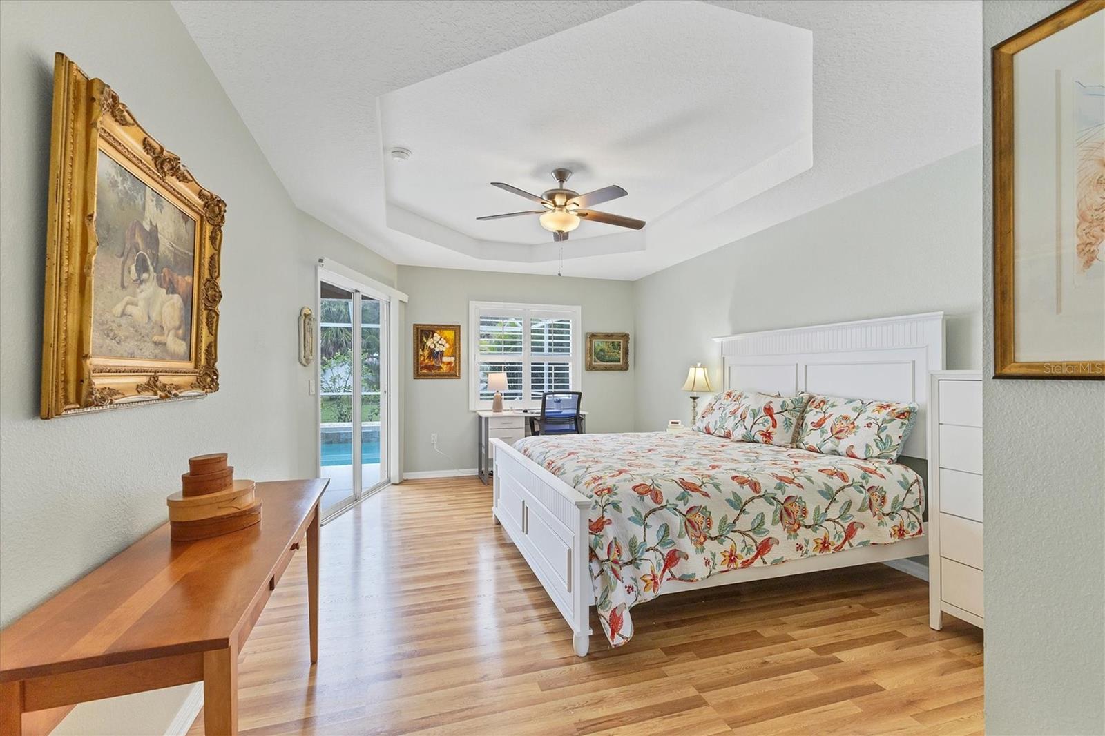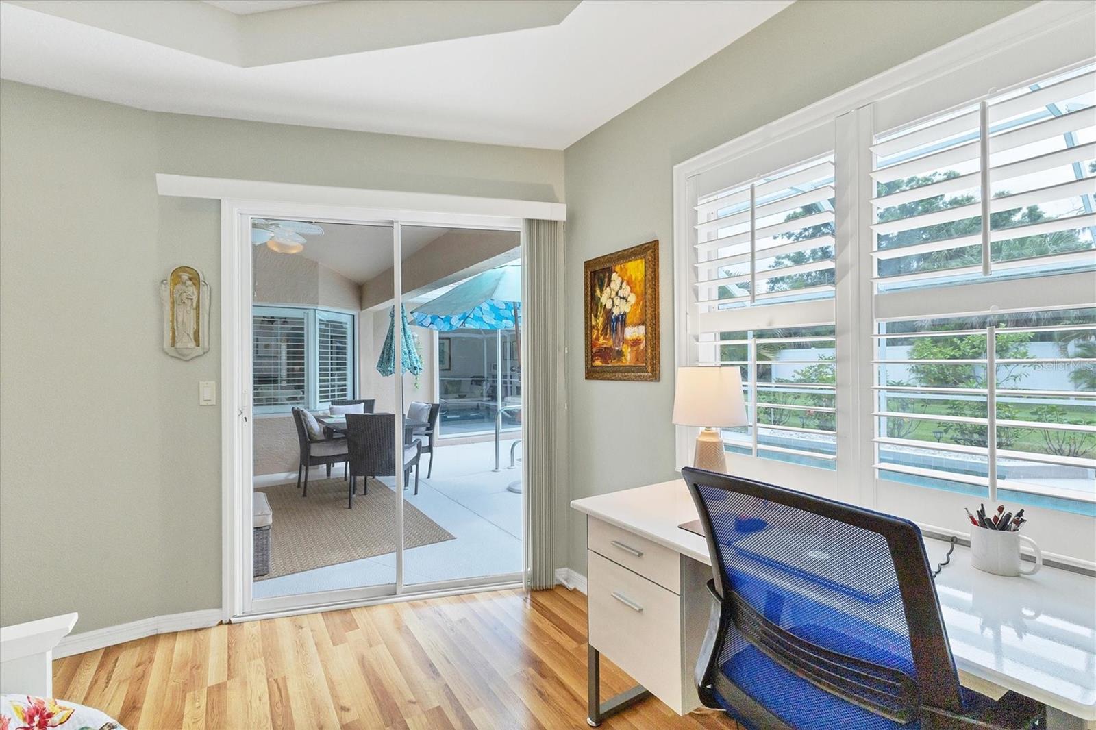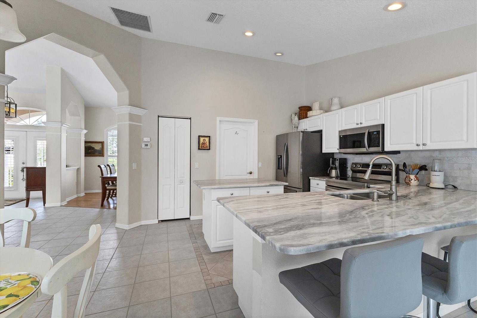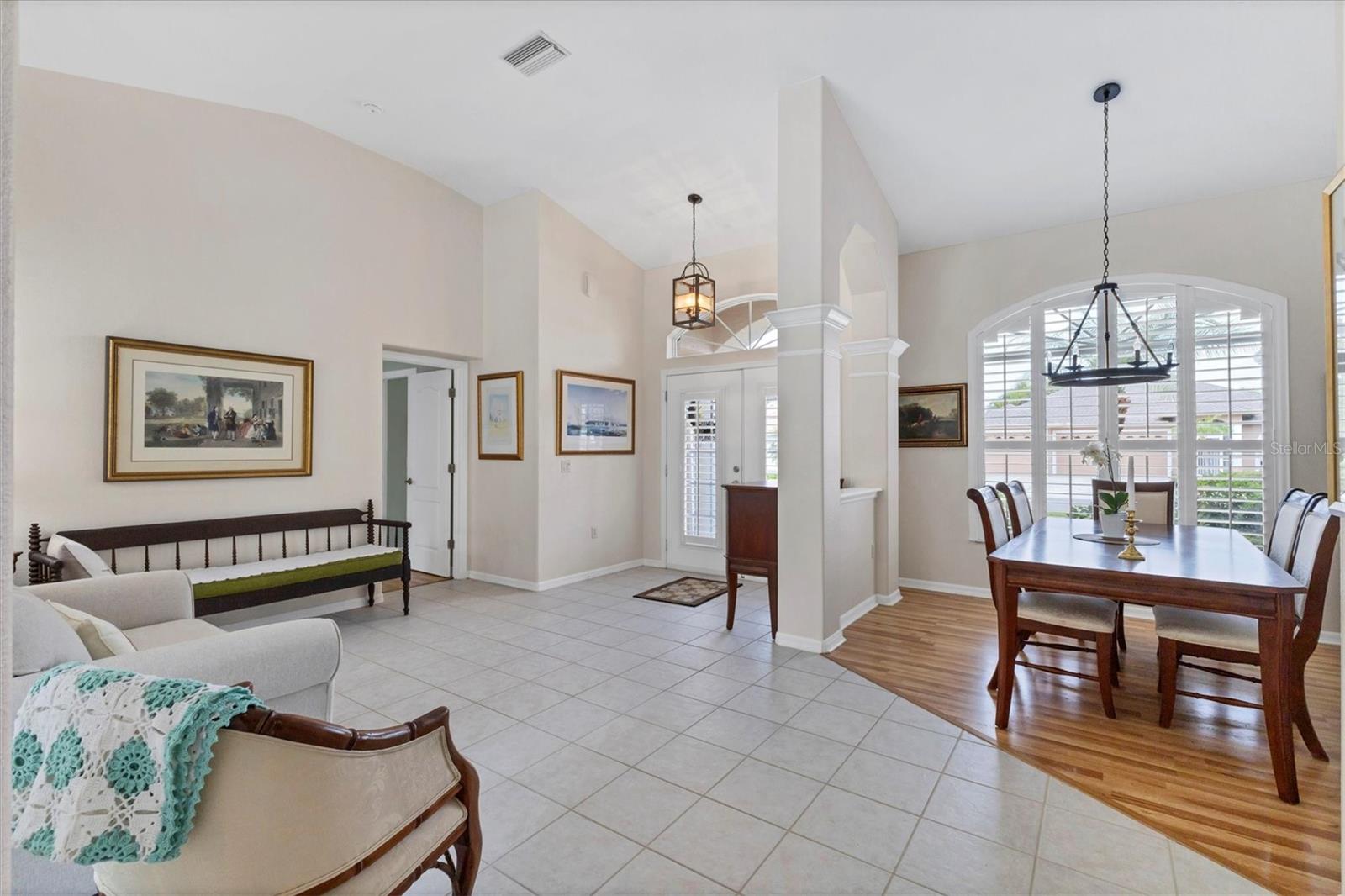 A home with an elegant open floor plan design. A 3/2 with a heated pool on a large lot with lovely landscaping and privacy. Classic details include archways, Roman columns, Palladium windows, vaulted and tray ceilings, and plantation shutters throughout. The recently updated kitchen has granite counters, an island, a seating counter area, and S/S appliances. The dinette has an aquarium window overlooking the lanai and pool. The family room is a relaxing space with an electric fireplace and built in book shelves. This is a split plan with two good size guest bedrooms. The spacious master bedroom is a restful retreat with extra space for a sitting area. A large renovated master bath has a new walk in shower and dual sinks. This well cared for home has a NEW ROOF 2023, two new impact resistant sliding glass doors on the lanai 2024, and exterior painted 2022. Venice Palms has a low HOA fee, sidewalks, a walking trail, and open green space, is dog friendly, and is 4.2 miles to Venice Island and the beach. This home is in move in condition and waiting for you. No damage from recent hurricanes.