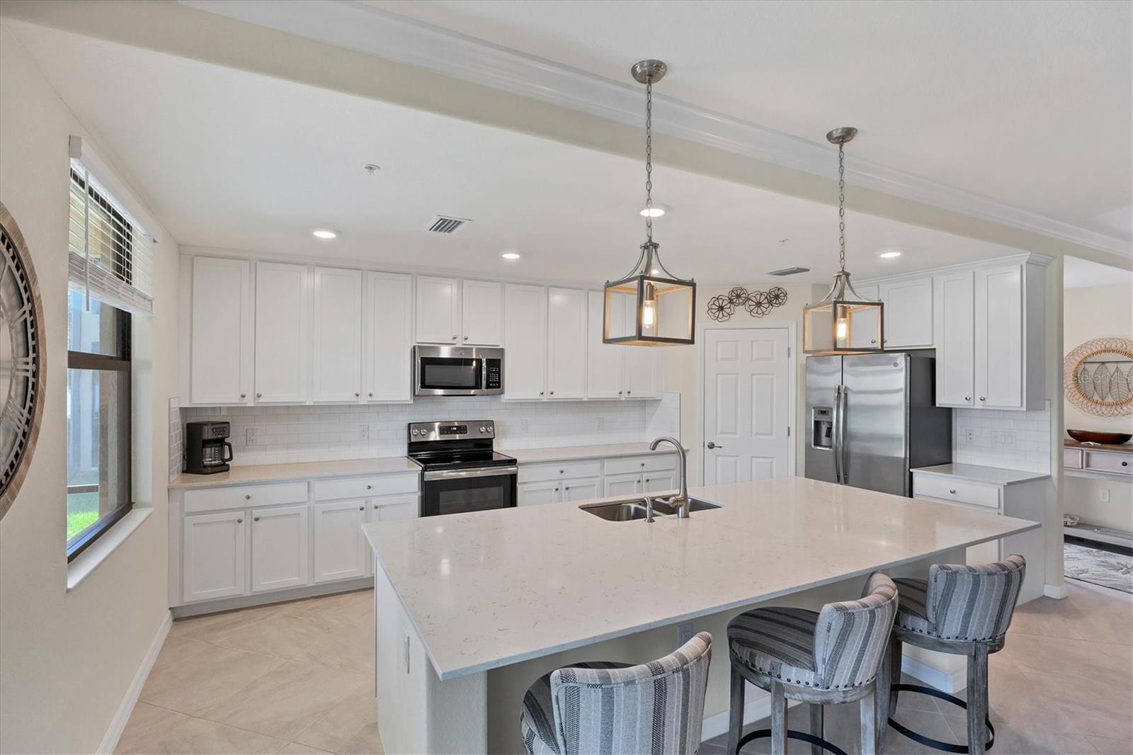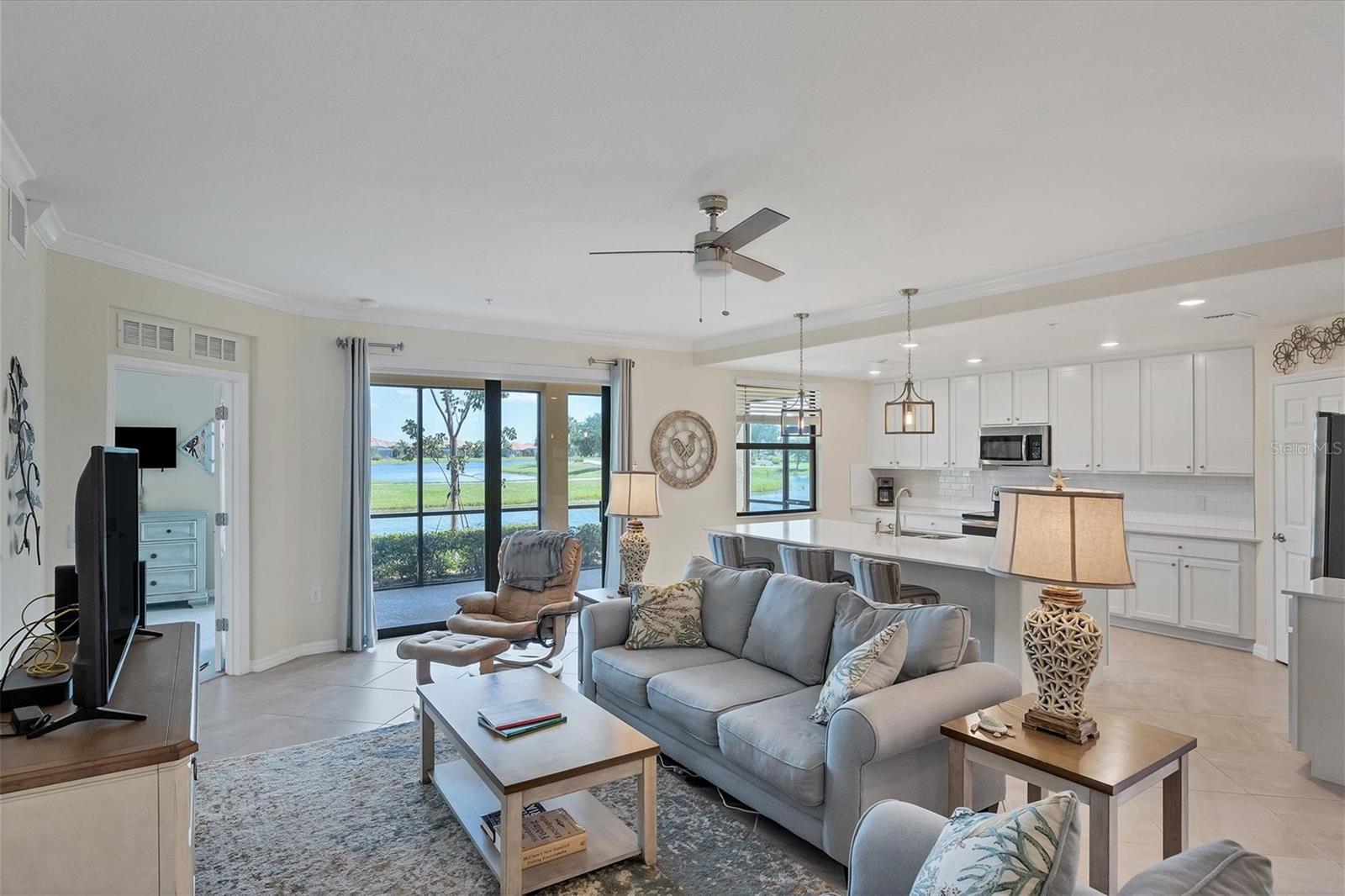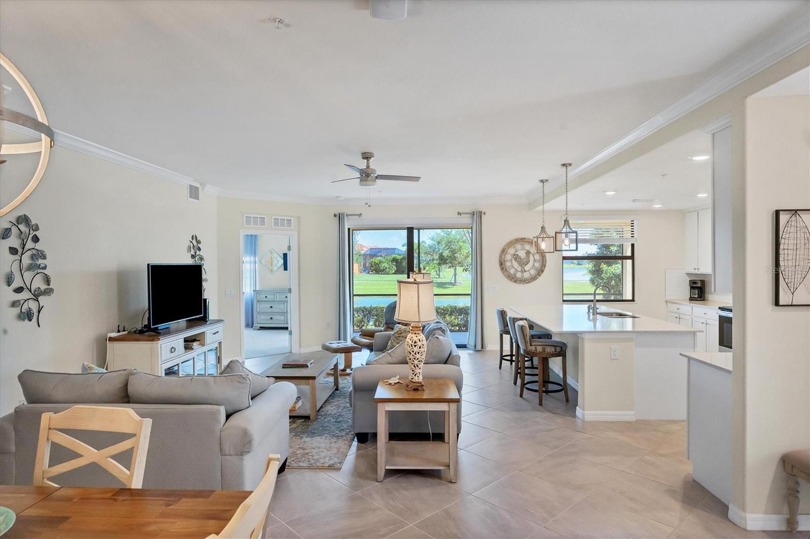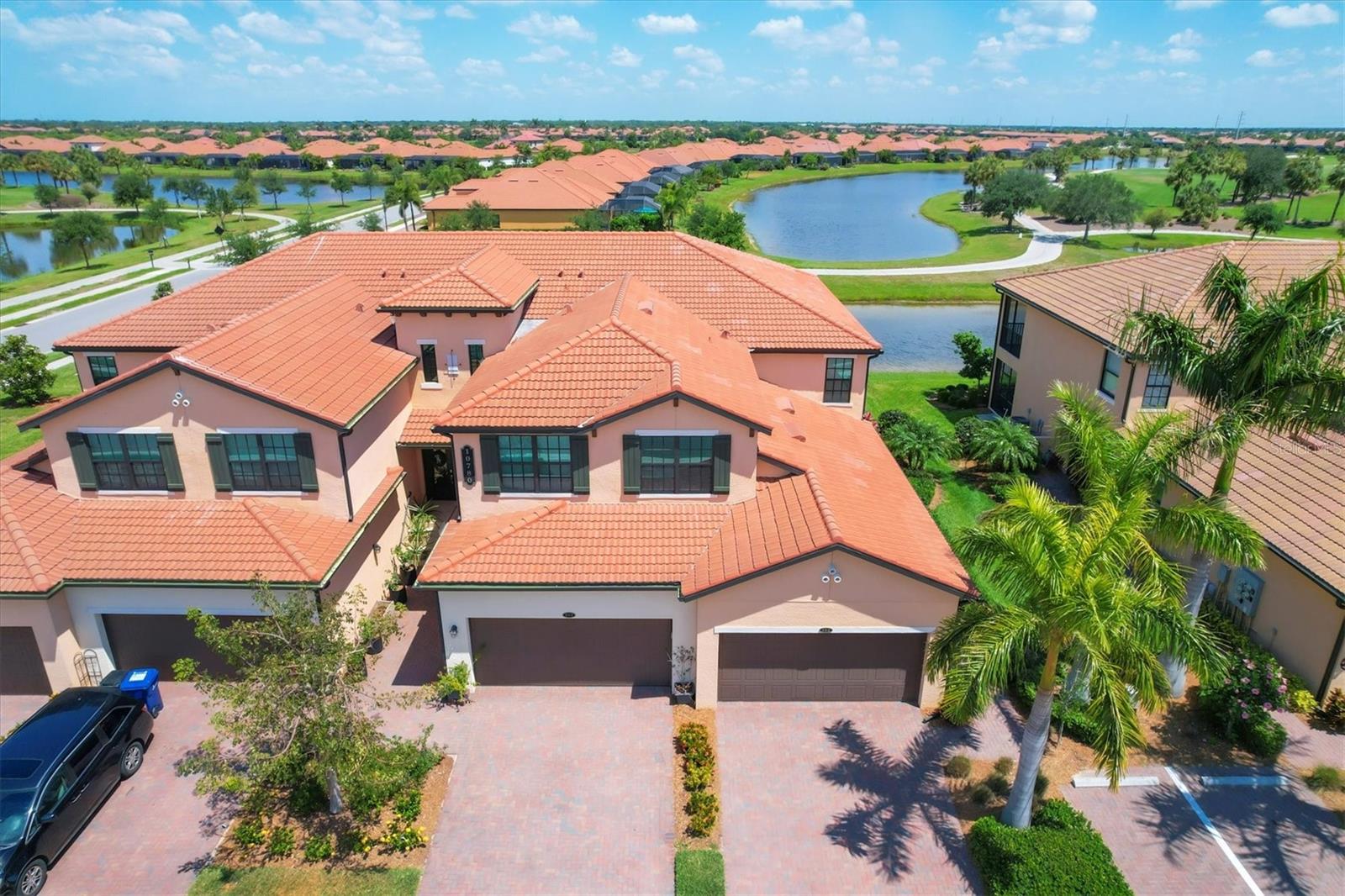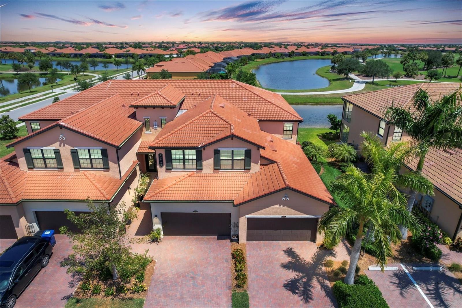 DON'T MISS OUT!! FIRST FLOOR 3BD/2BA/2CG with 2 GOLF MEMBERSHIPS INCLUDED. BEAUTIFUL TURNKEY FURNISHINGS NEGOTIABLE. GORGEOUS PANORAMIC VIEWS OF LAKE AND GOLF COURSE. Great room open floor plan looks straight out to your spacious lanai and STUNNING VIEWS!. 20 inch tile flooring set on the diagonal runs through main and wet areas with carpets in Bedrooms. Crown molding. Kitchen offers quartz counter tops, spacious island with sink, subway tile back splash, stainless steel appliances, and tons of 42 inch high cabinetry. Large master bedroom with en suite bathroom includes dual sinks, walk in shower, garden tub, and linen closet. Suite offers 2 walk in closets and gorgeous views out the window. Guest bedrooms located at other end of house for privacy. Guest bath and extra large storage closet. Separate laundry room. Tastefully decorated with Beach condo theme, condo is available TURNKEY FURNISHINGS NEGOTIABLE. MAKE YOUR APPOINTMENT TO SEE THIS CONDO TODAY BEFORE SOMEONE ELSE DOES! Sarasota National is a marvelous community with over 1300 acres designated for preservation, conservation, lakes, and open space with amazing views, Proclaimed as an Audubon International Certified Sanctuary, making it the most gorgeous and enjoyable golf course to play at in the area. Offering resort style amenities with huge resort style pool and spa,Tiki Bar to serve refreshing drinks and a bite of lunch, tennis courts, pickle ball, Bocce courts, coffee lounge/library/card room/meeting place, 7000 sq ft fitness facilities offering classes and day spa, and a 30,000 sq ft Clubhouse with dining and spectacular views. 18 Hole championship golf course surrounded by native wetlands and preserves provides an exhilarating and dramatic back drop for your golfing adventure. Minutes away from the new Wellen Park shopping area and Atlanta Braves stadium. Venice Beach and Venice Downtown are just a short drive. Your choice of restaurants and outdoor activities await. Come find YOUR Florida lifestyle TODAY and Live everyday like your on vacation!