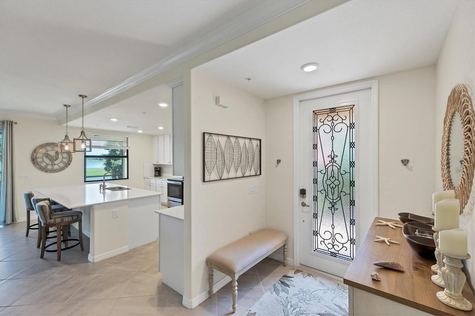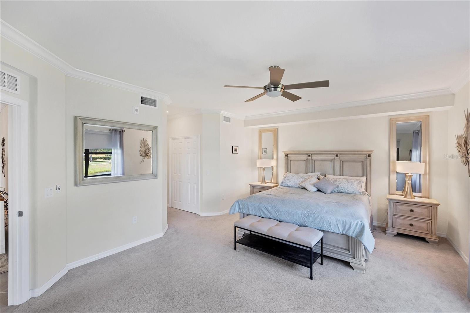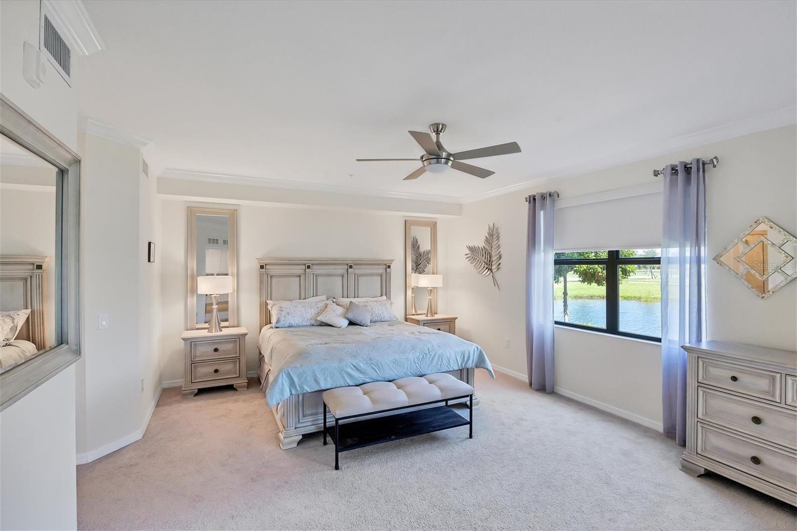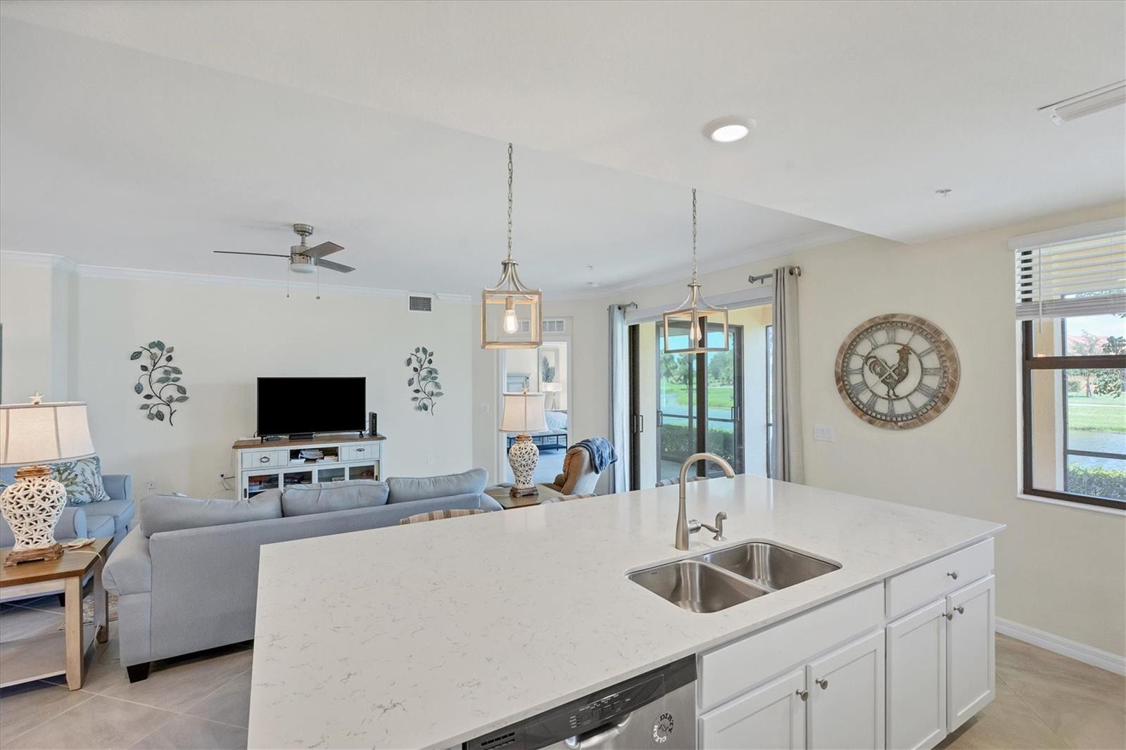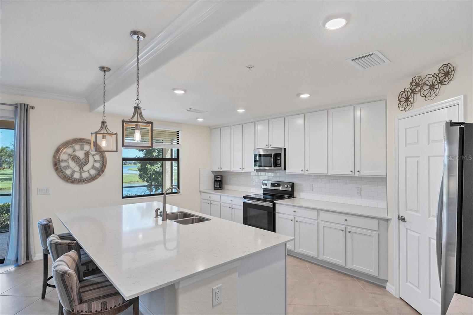 DON'T MISS OUT!! FIRST FLOOR 3BD/2BA/2CG with 2 GOLF MEMBERSHIPS INCLUDED. BEAUTIFUL TURNKEY FURNISHINGS NEGOTIABLE. GORGEOUS PANORAMIC VIEWS OF LAKE AND GOLF COURSE. Great room open floor plan looks straight out to your spacious lanai and STUNNING VIEWS!. 20 inch tile flooring set on the diagonal runs through main and wet areas with carpets in Bedrooms. Crown molding. Kitchen offers quartz counter tops, spacious island with sink, subway tile back splash, stainless steel appliances, and tons of 42 inch high cabinetry. Large master bedroom with en suite bathroom includes dual sinks, walk in shower, garden tub, and linen closet. Suite offers 2 walk in closets and gorgeous views out the window. Guest bedrooms located at other end of house for privacy. Guest bath and extra large storage closet. Separate laundry room. Tastefully decorated with Beach condo theme, condo is available TURNKEY FURNISHINGS NEGOTIABLE. MAKE YOUR APPOINTMENT TO SEE THIS CONDO TODAY BEFORE SOMEONE ELSE DOES! Sarasota National is a marvelous community with over 1300 acres designated for preservation, conservation, lakes, and open space with amazing views, Proclaimed as an Audubon International Certified Sanctuary, making it the most gorgeous and enjoyable golf course to play at in the area. Offering resort style amenities with huge resort style pool and spa,Tiki Bar to serve refreshing drinks and a bite of lunch, tennis courts, pickle ball, Bocce courts, coffee lounge/library/card room/meeting place, 7000 sq ft fitness facilities offering classes and day spa, and a 30,000 sq ft Clubhouse with dining and spectacular views. 18 Hole championship golf course surrounded by native wetlands and preserves provides an exhilarating and dramatic back drop for your golfing adventure. Minutes away from the new Wellen Park shopping area and Atlanta Braves stadium. Venice Beach and Venice Downtown are just a short drive. Your choice of restaurants and outdoor activities await. Come find YOUR Florida lifestyle TODAY and Live everyday like your on vacation!