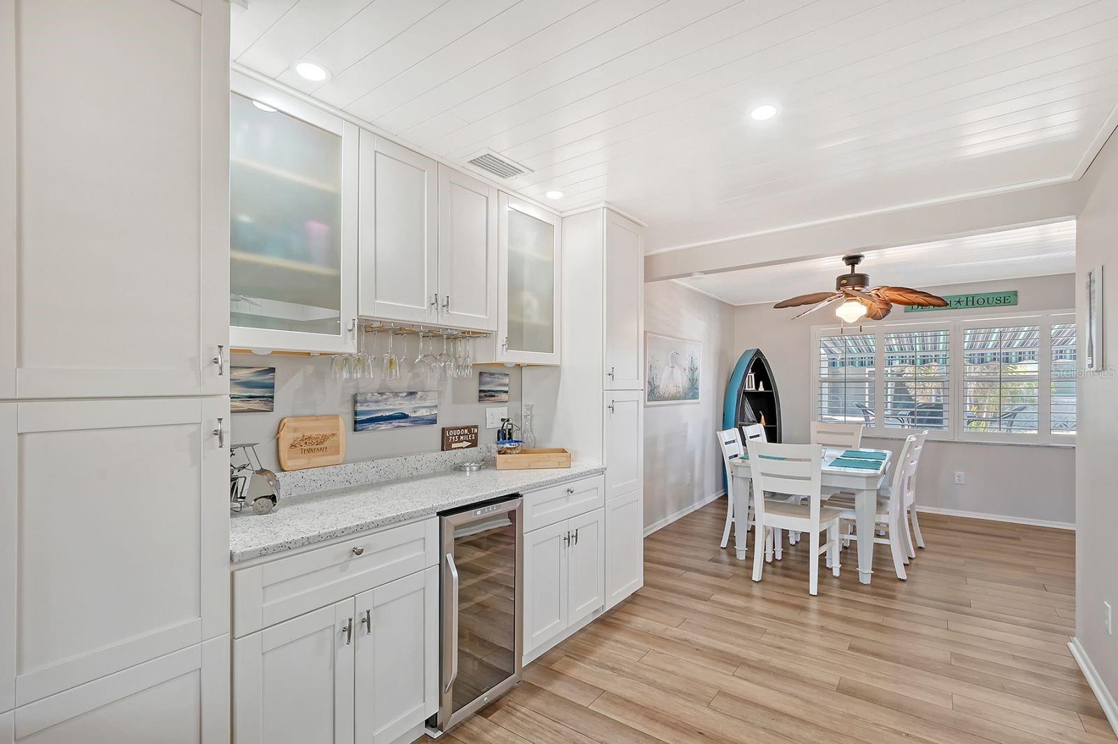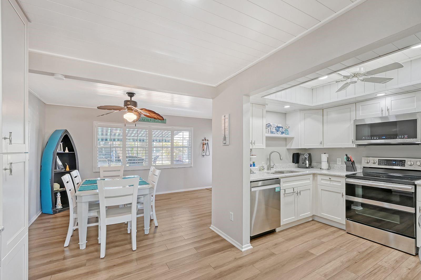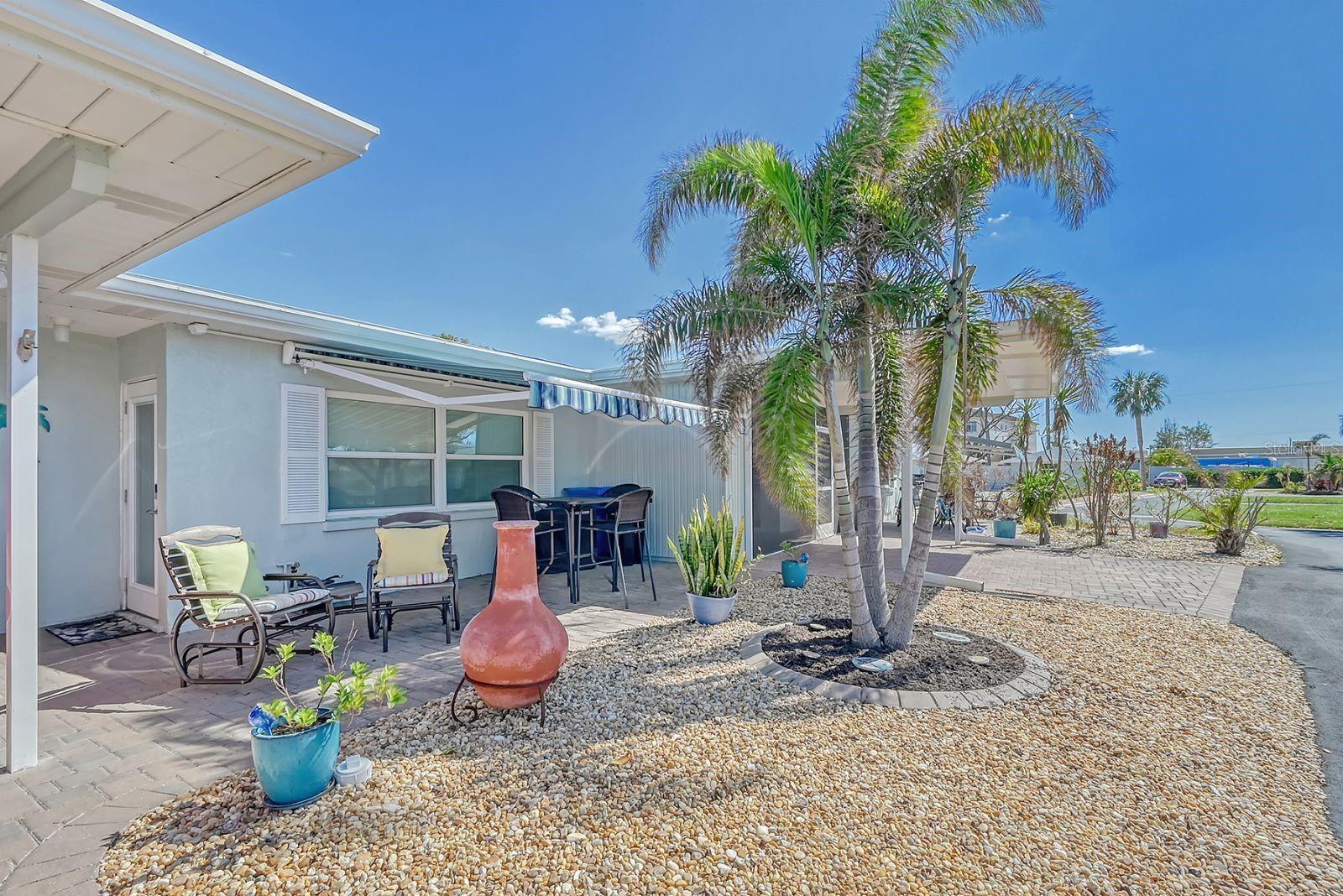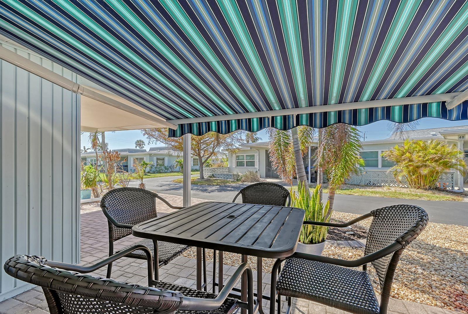 New Price! Discover your dream retreat on the Island of Venice! Nestled in the heart of a friendly 55+ community, this stunningly RENOVATED VILLA features 2 spacious bedrooms & 1.5 updated baths. The chef inspired kitchen is complete with sparkling quartz countertops, newer appliances, double oven and soft-close custom cabinetry. The elegant tray ceiling in the kitchen adds a touch of design to the open living space. Additional features include built-ins with coffee/wine bar & fridge, offering even more storage & versatility. Storm-safe impact windows throughout that are dressed with stylish plantation shutters, ensuring both security & style. Washer & dryer included with this villa. Pet friendly community. Enjoy the sunny weather on the paver patio, equipped with extended electric awning for added shade & comfort. Amenities include Community clubhouse, large pool, shuffleboard and laundry facilities. FEE INCLUDES: Cable TV, Common area tax, community pool, maintenance exterior, maintenance grounds, Manager, pool maintenance, Private road, sewer, & trash. Relax in your private oasis just minutes from pristine beaches, charming boutiques, golf courses, and delightful dining. Don't miss out on this gem--schedule your tour today and experience the best of Venice living!