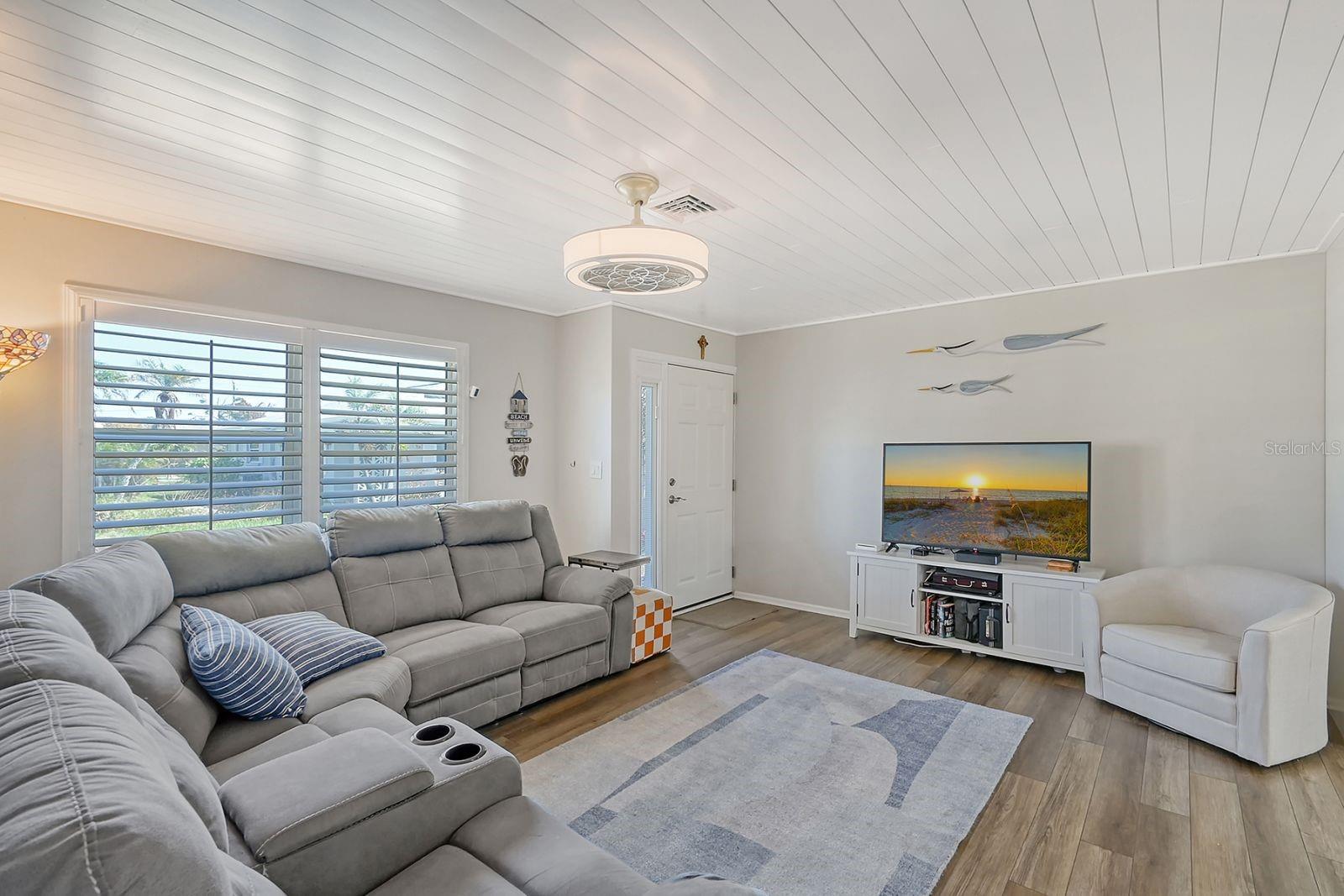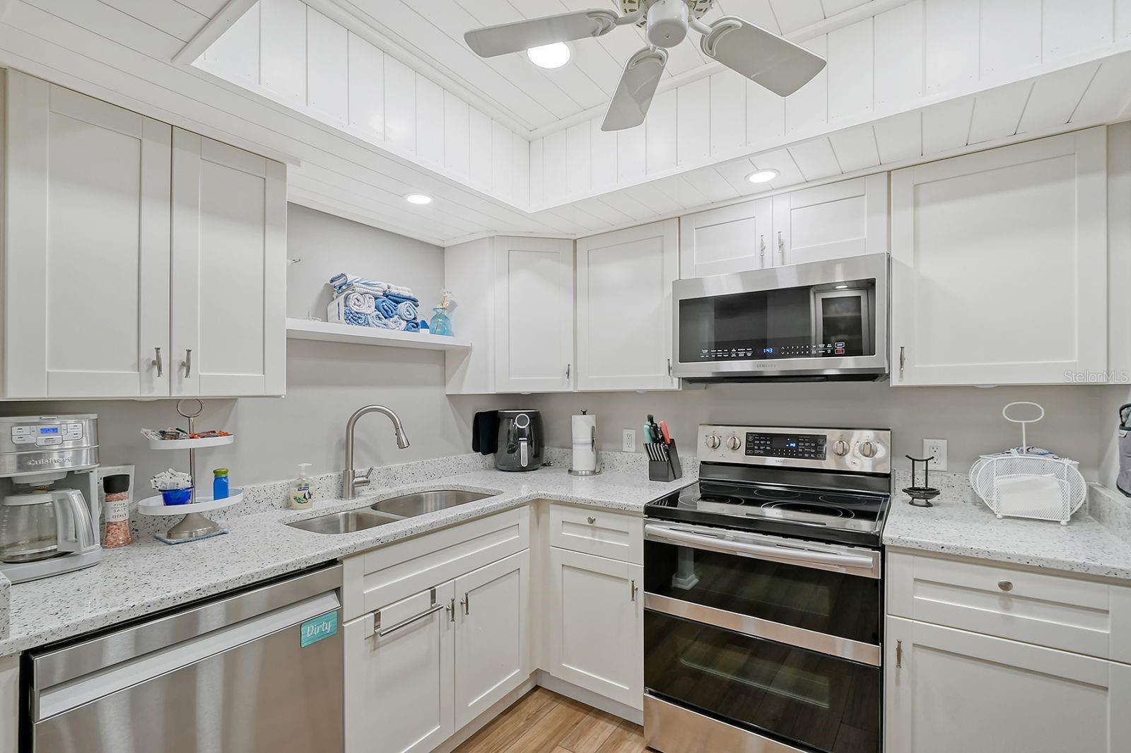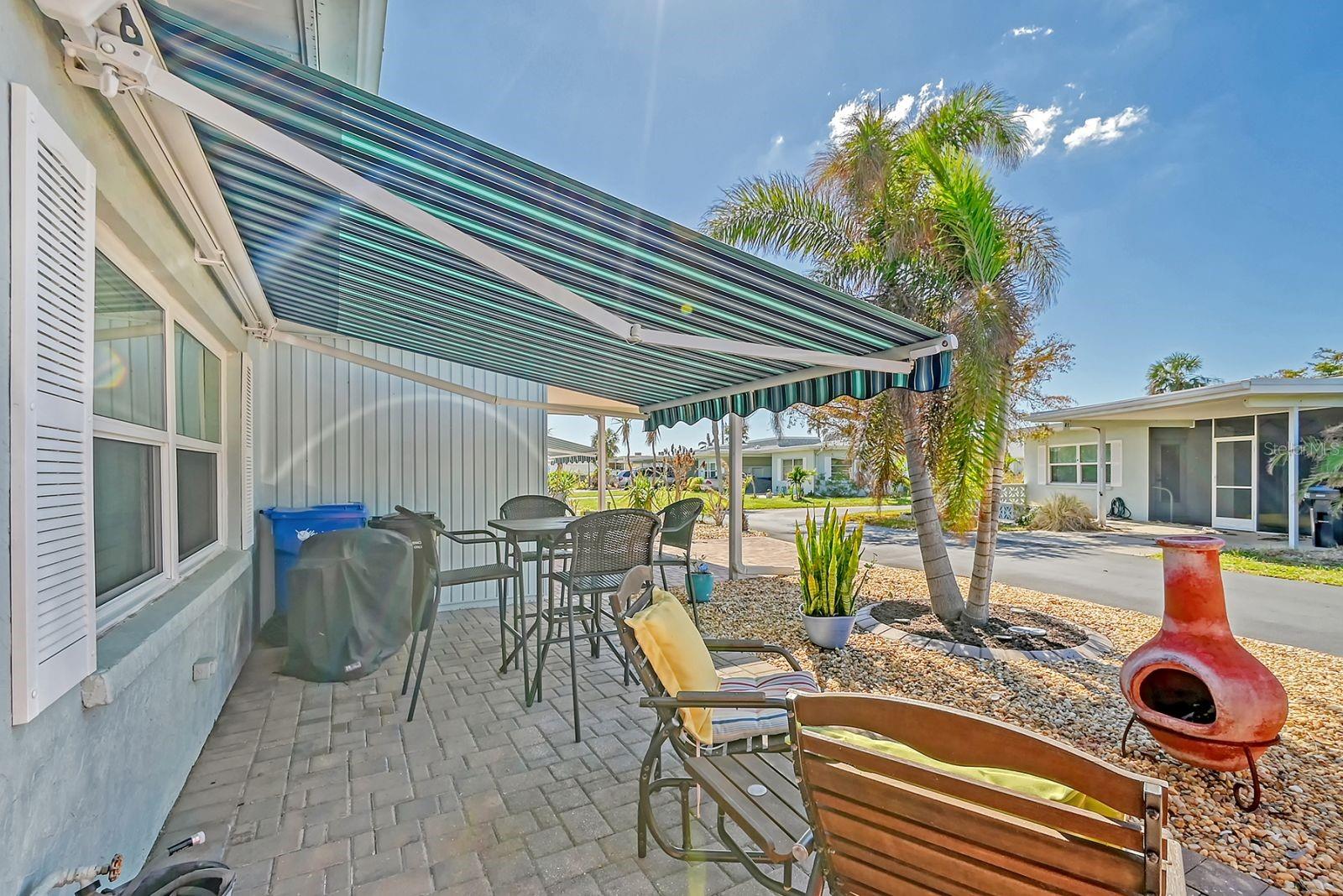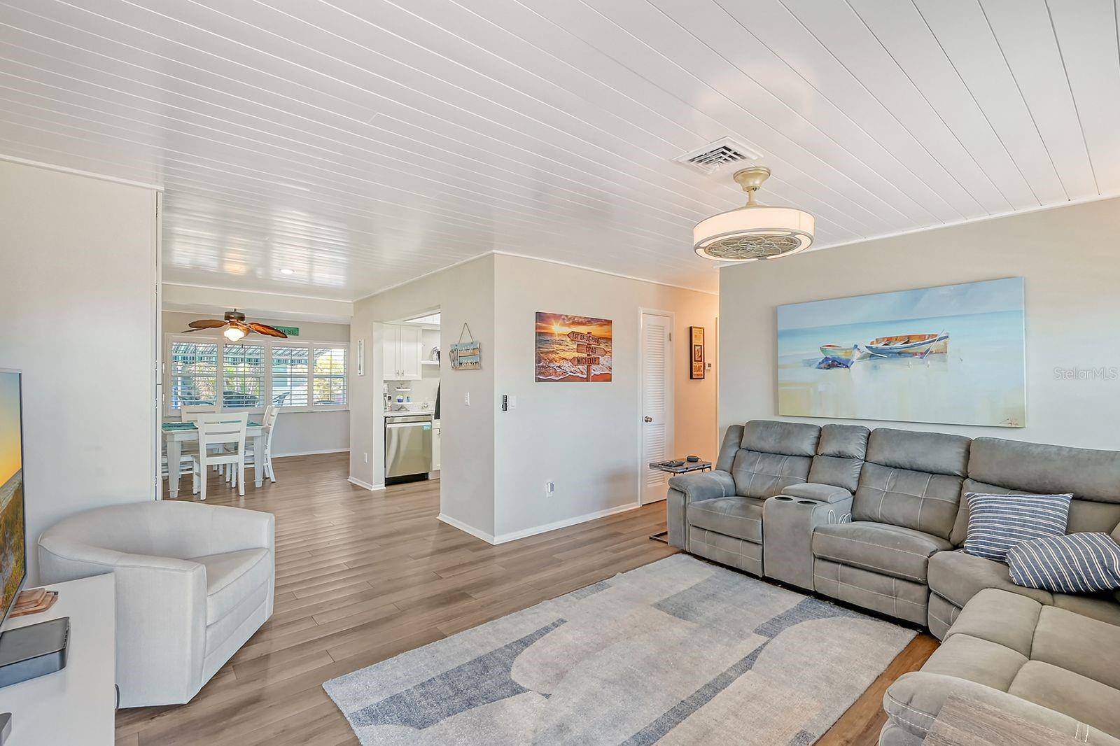 New Price! Discover your dream retreat on the Island of Venice! Nestled in the heart of a friendly 55+ community, this stunningly RENOVATED VILLA features 2 spacious bedrooms & 1.5 updated baths. The chef inspired kitchen is complete with sparkling quartz countertops, newer appliances, double oven and soft-close custom cabinetry. The elegant tray ceiling in the kitchen adds a touch of design to the open living space. Additional features include built-ins with coffee/wine bar & fridge, offering even more storage & versatility. Storm-safe impact windows throughout that are dressed with stylish plantation shutters, ensuring both security & style. Washer & dryer included with this villa. Pet friendly community. Enjoy the sunny weather on the paver patio, equipped with extended electric awning for added shade & comfort. Amenities include Community clubhouse, large pool, shuffleboard and laundry facilities. FEE INCLUDES: Cable TV, Common area tax, community pool, maintenance exterior, maintenance grounds, Manager, pool maintenance, Private road, sewer, & trash. Relax in your private oasis just minutes from pristine beaches, charming boutiques, golf courses, and delightful dining. Don't miss out on this gem--schedule your tour today and experience the best of Venice living!