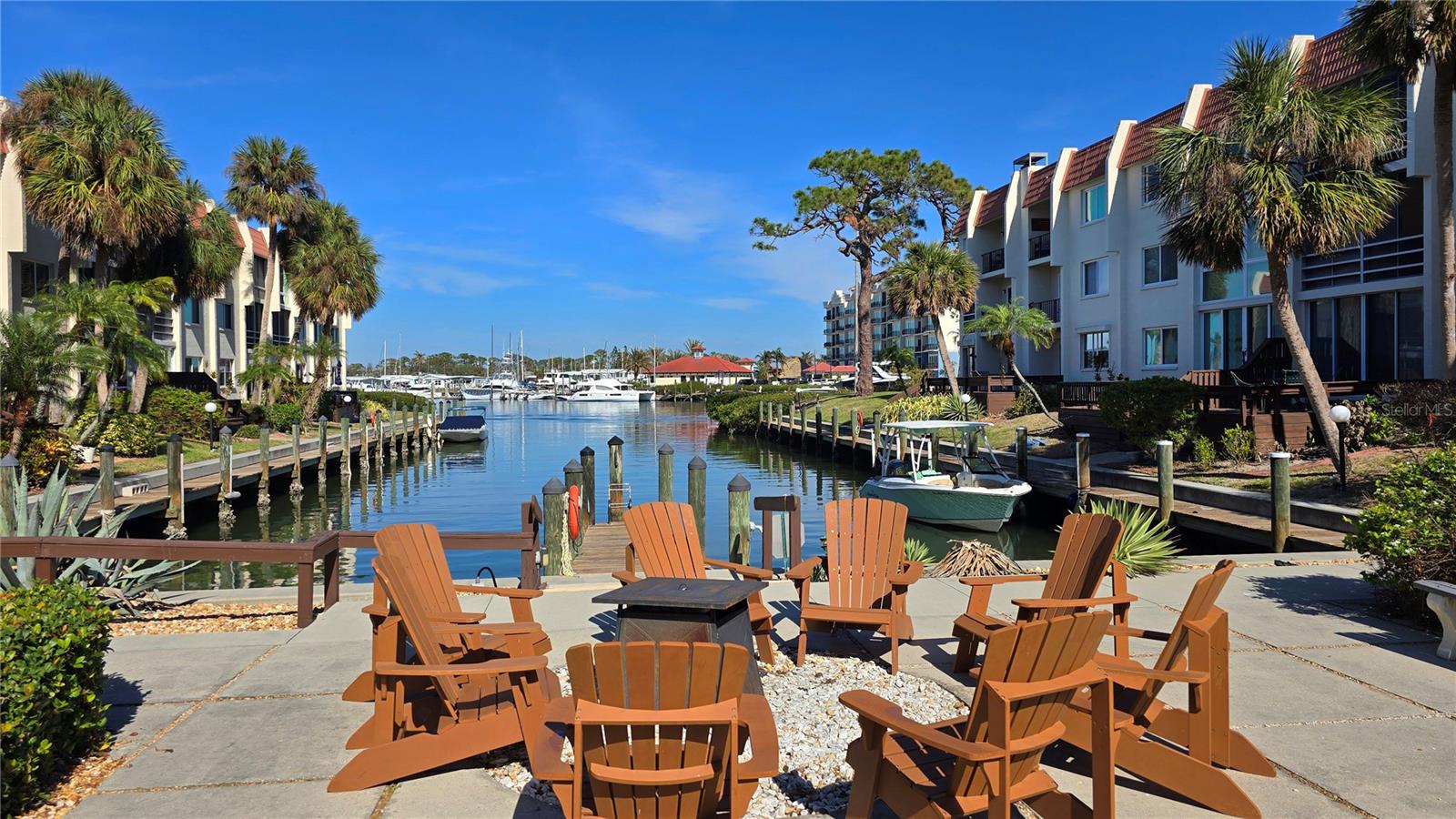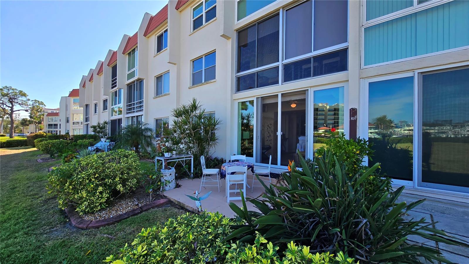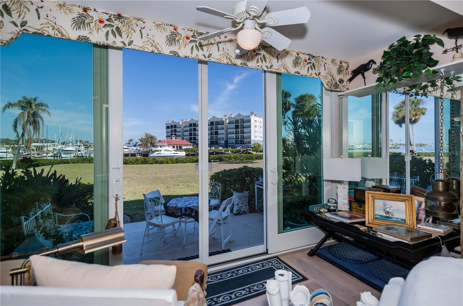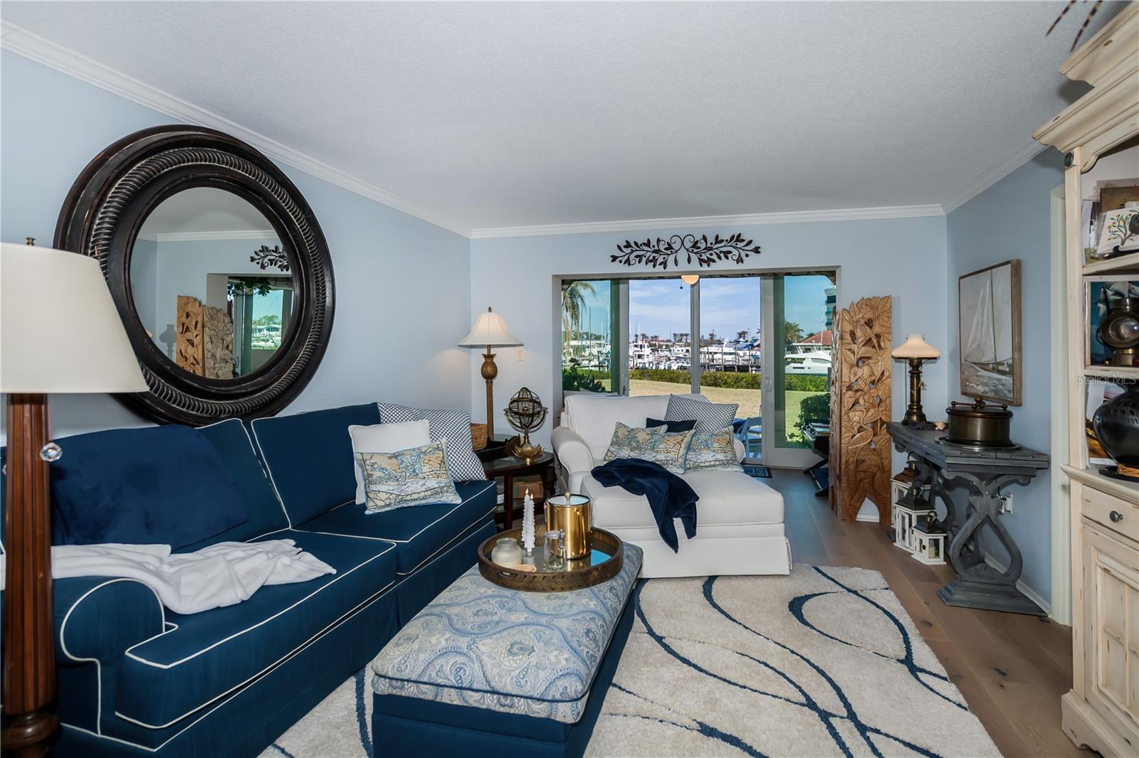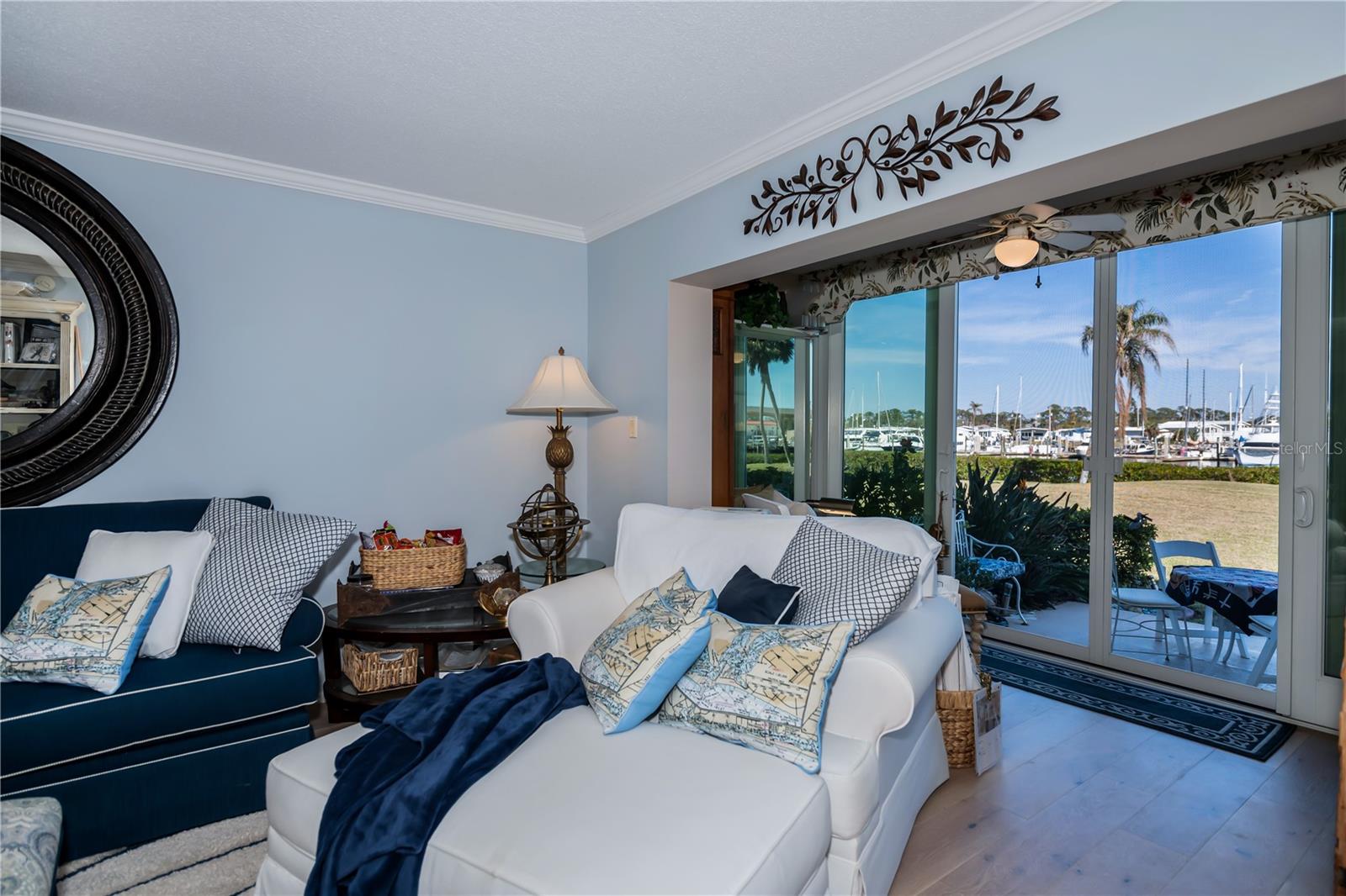 LOCATION-LOCATION-LOCATION... Water views from your living room, with theaters and restaurants just a short walk away. This beautifully updated 2-bedroom, 2-bathroom <b>first-floor</b> condo in Bella Costa offers stunning water views of the Intracoastal Waterway and Roberts Bay, providing a serene backdrop for everyday living. The condo features hurricane windows and sliding glass doors, ensuring both comfort and safety. You'll find beautiful wood floors (installed in 2020) throughout the unit, adding style and charm. The kitchen has been thoughtfully renovated with granite countertops, wood cabinets, and ample storage and counter space—perfect for cooking and entertaining. The spacious living and dining areas are designed to take full advantage of the gorgeous water views, or relax in the bonus enclosed sunroom, an ideal spot for watching boats glide by on warm days. Both bedrooms come with their own ensuites, ensuring privacy and convenience. The master bedroom includes a generous walk-in closet with a built-in washer and dryer, offering plenty of storage space. The guest bedroom is perfect for visitors and work, featuring a built-in Murphy bed, built-in desk, and walk-in closet. Bella Costa is ideally located just a short walk to historic downtown Venice, the Venice Theatre, pristine beaches, shopping, dining, medical facilities, and entertainment. The active community amenities include a clubhouse with a community activity calendar featuring exercise classes, movie nights, a book club, an active pool room, card playing, a small gym, heated pool, outdoor grill, and a fire pit situated between the buildings along the water—perfect for socializing and enjoying the beautiful Florida weather. It's great for watching the holiday boat parade and concerts hosted by the active clubhouse. Whether you're looking for a fantastic seasonal rental investment, a winter retreat, or a year-round residence, this condo offers a wonderful opportunity to live in one of Venice’s most desirable locations. Enjoy watching boats sail by from your private patio and experience the best of waterfront living! Don't miss the opportunity to live where others vacation! This won't last long, so make your appointment today to see this little piece of paradise and island living.