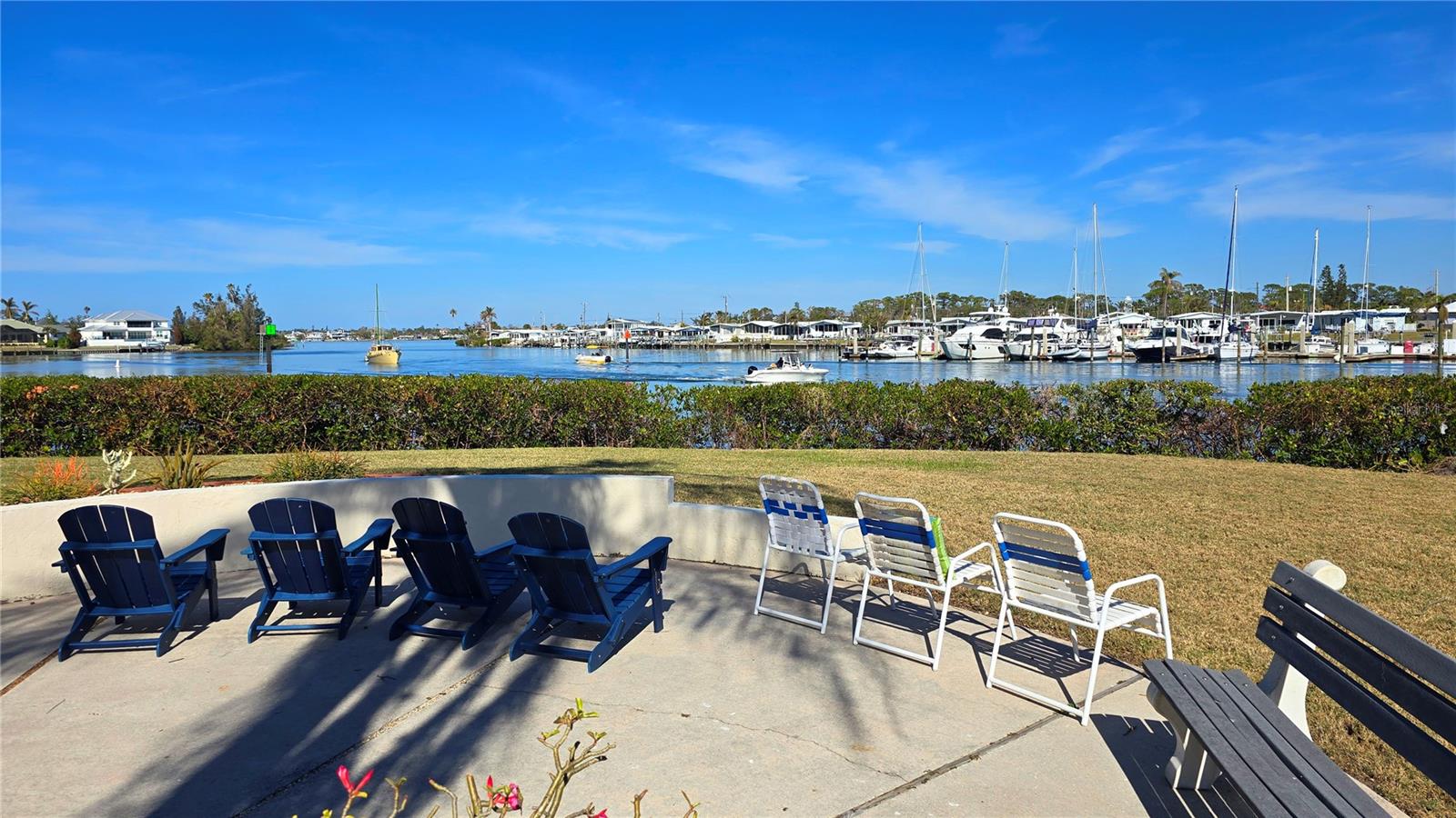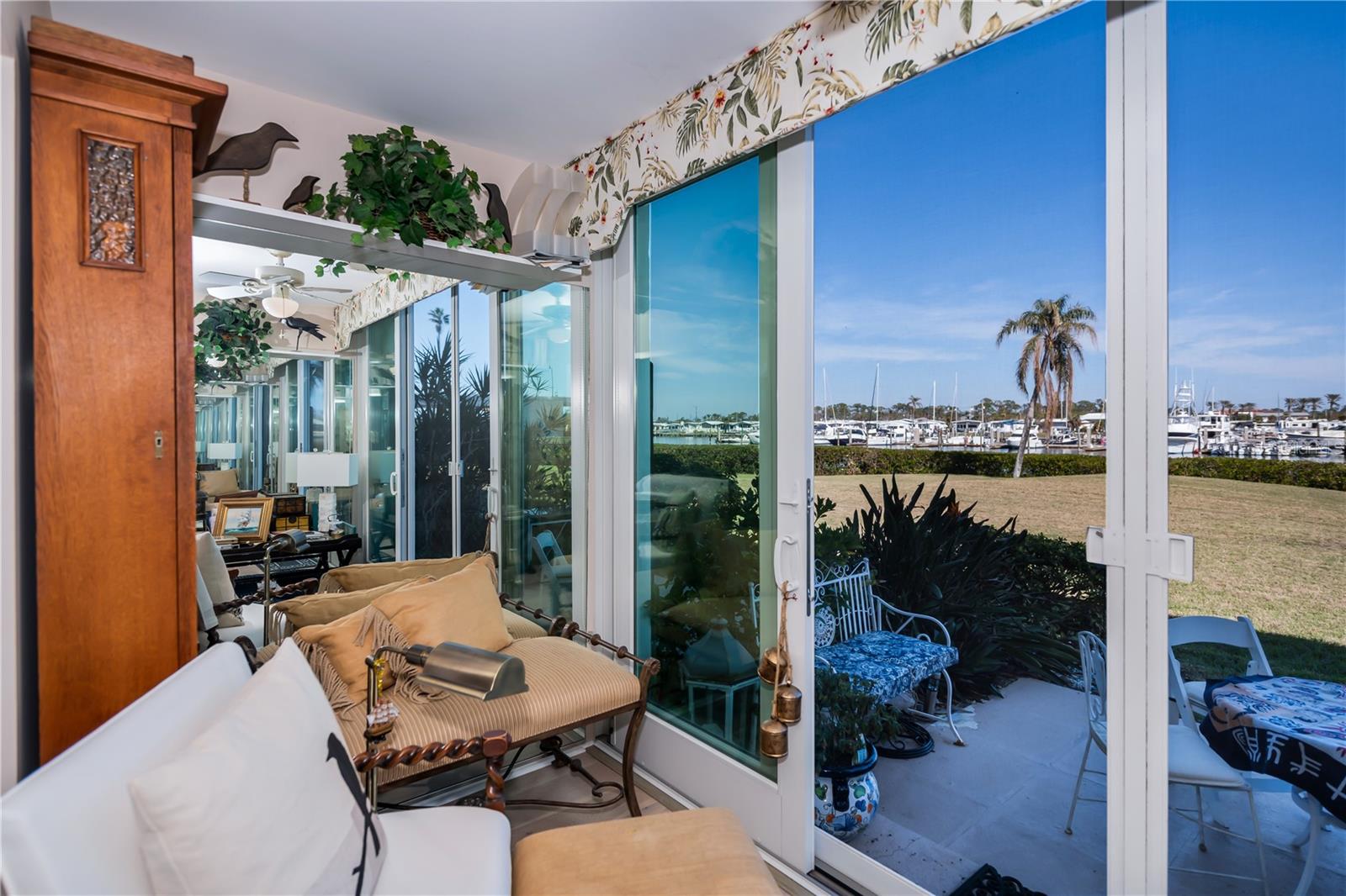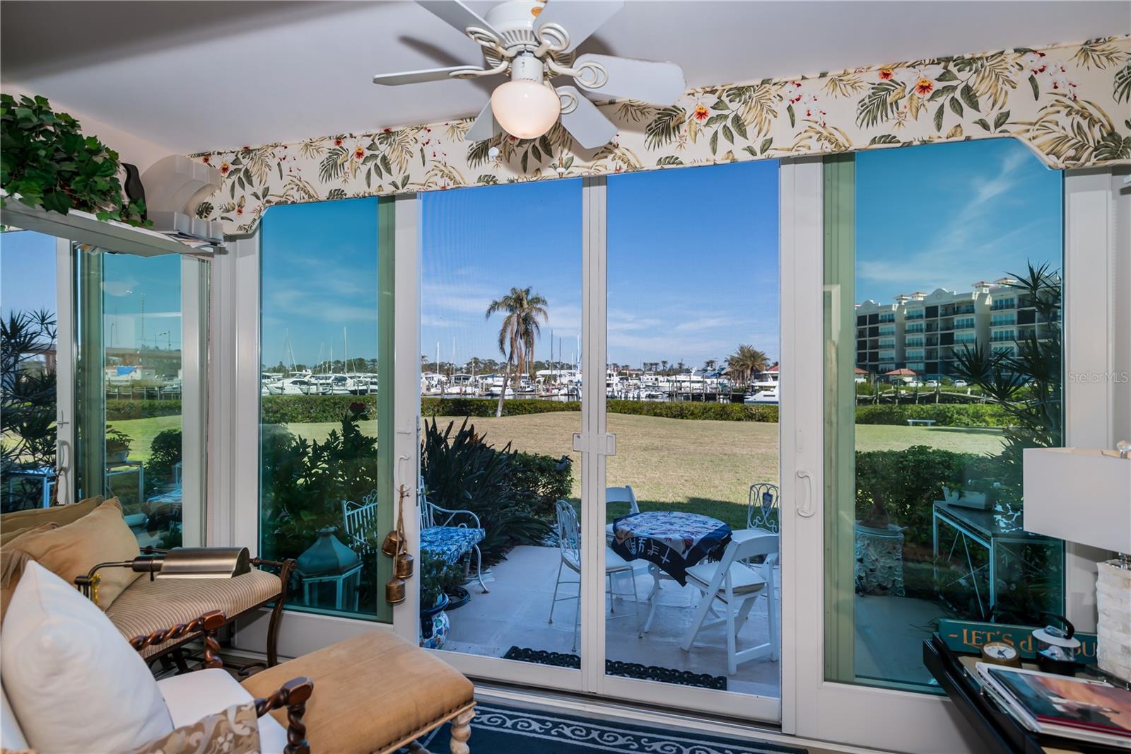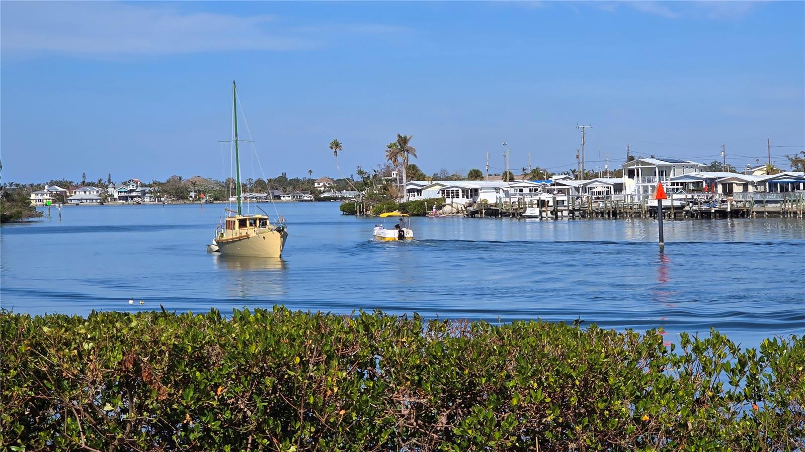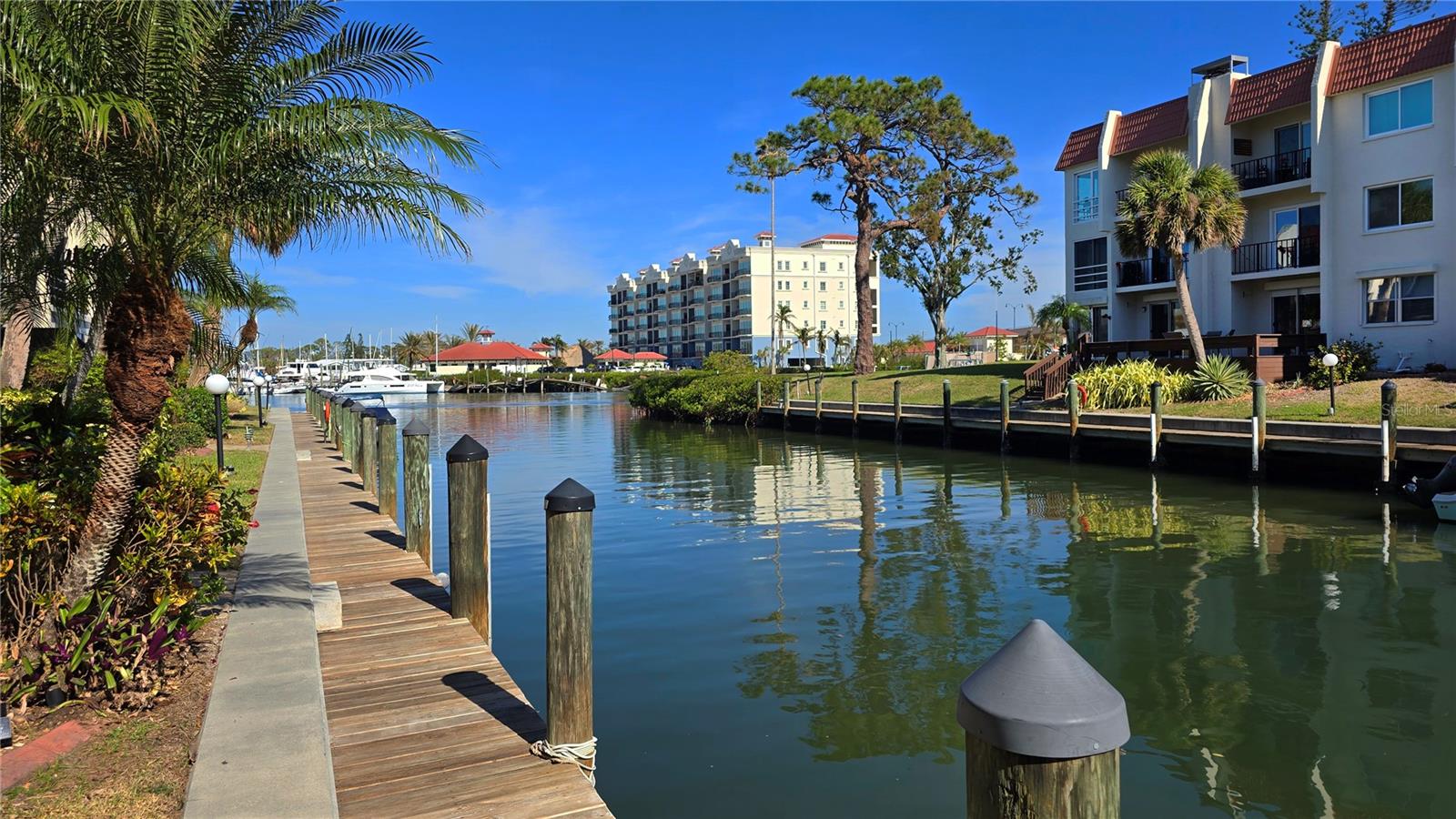 LOCATION-LOCATION-LOCATION... Water views from your living room, with theaters and restaurants just a short walk away. This beautifully updated 2-bedroom, 2-bathroom <b>first-floor</b> condo in Bella Costa offers stunning water views of the Intracoastal Waterway and Roberts Bay, providing a serene backdrop for everyday living. The condo features hurricane windows and sliding glass doors, ensuring both comfort and safety. You'll find beautiful wood floors (installed in 2020) throughout the unit, adding style and charm. The kitchen has been thoughtfully renovated with granite countertops, wood cabinets, and ample storage and counter space—perfect for cooking and entertaining. The spacious living and dining areas are designed to take full advantage of the gorgeous water views, or relax in the bonus enclosed sunroom, an ideal spot for watching boats glide by on warm days. Both bedrooms come with their own ensuites, ensuring privacy and convenience. The master bedroom includes a generous walk-in closet with a built-in washer and dryer, offering plenty of storage space. The guest bedroom is perfect for visitors and work, featuring a built-in Murphy bed, built-in desk, and walk-in closet. Bella Costa is ideally located just a short walk to historic downtown Venice, the Venice Theatre, pristine beaches, shopping, dining, medical facilities, and entertainment. The active community amenities include a clubhouse with a community activity calendar featuring exercise classes, movie nights, a book club, an active pool room, card playing, a small gym, heated pool, outdoor grill, and a fire pit situated between the buildings along the water—perfect for socializing and enjoying the beautiful Florida weather. It's great for watching the holiday boat parade and concerts hosted by the active clubhouse. Whether you're looking for a fantastic seasonal rental investment, a winter retreat, or a year-round residence, this condo offers a wonderful opportunity to live in one of Venice’s most desirable locations. Enjoy watching boats sail by from your private patio and experience the best of waterfront living! Don't miss the opportunity to live where others vacation! This won't last long, so make your appointment today to see this little piece of paradise and island living.