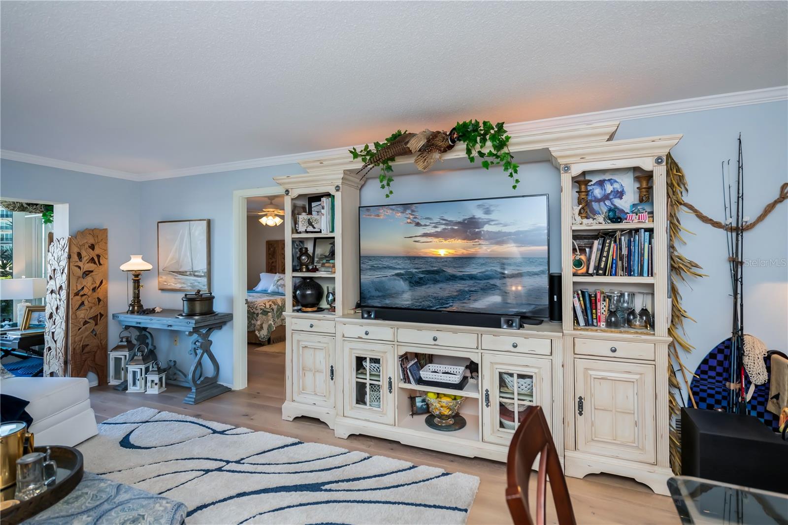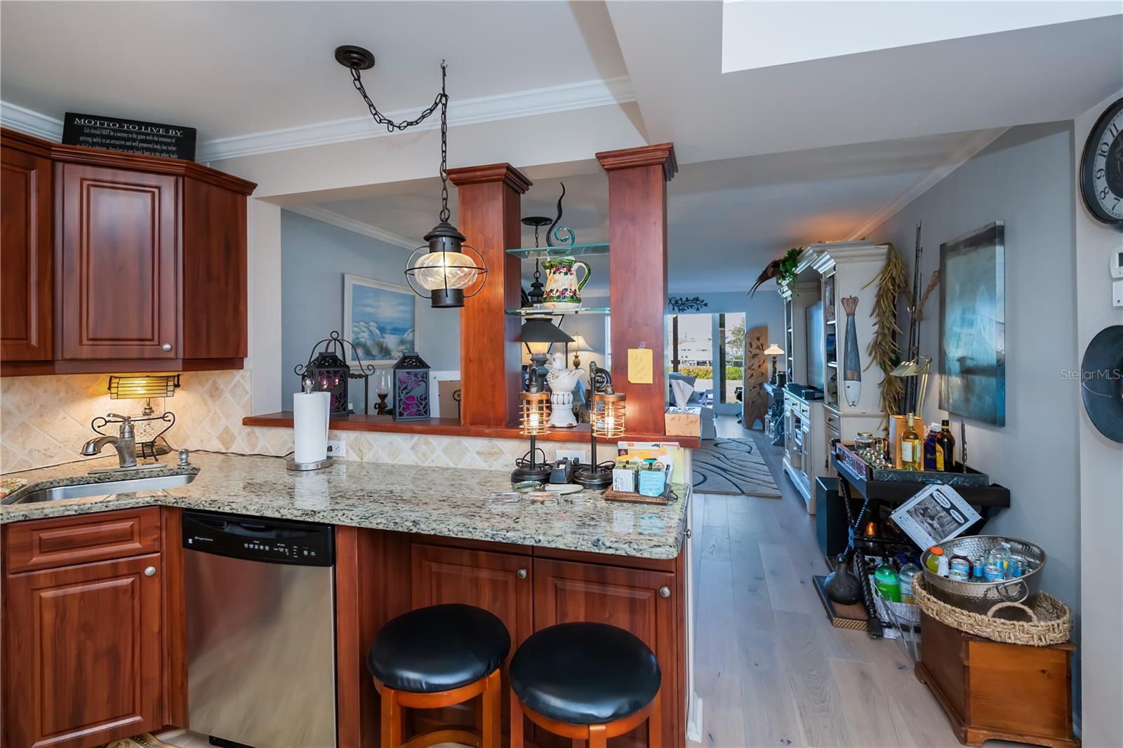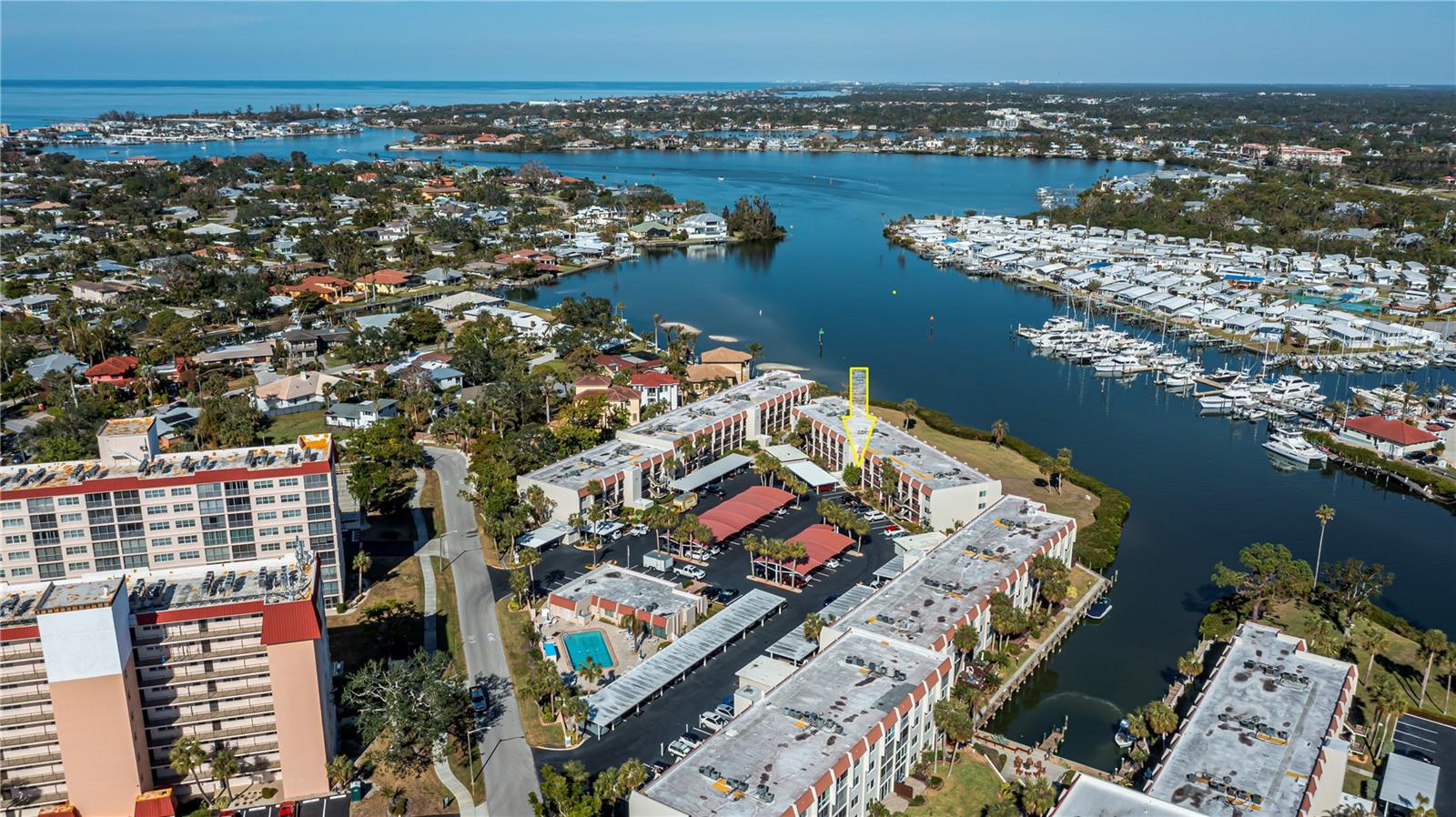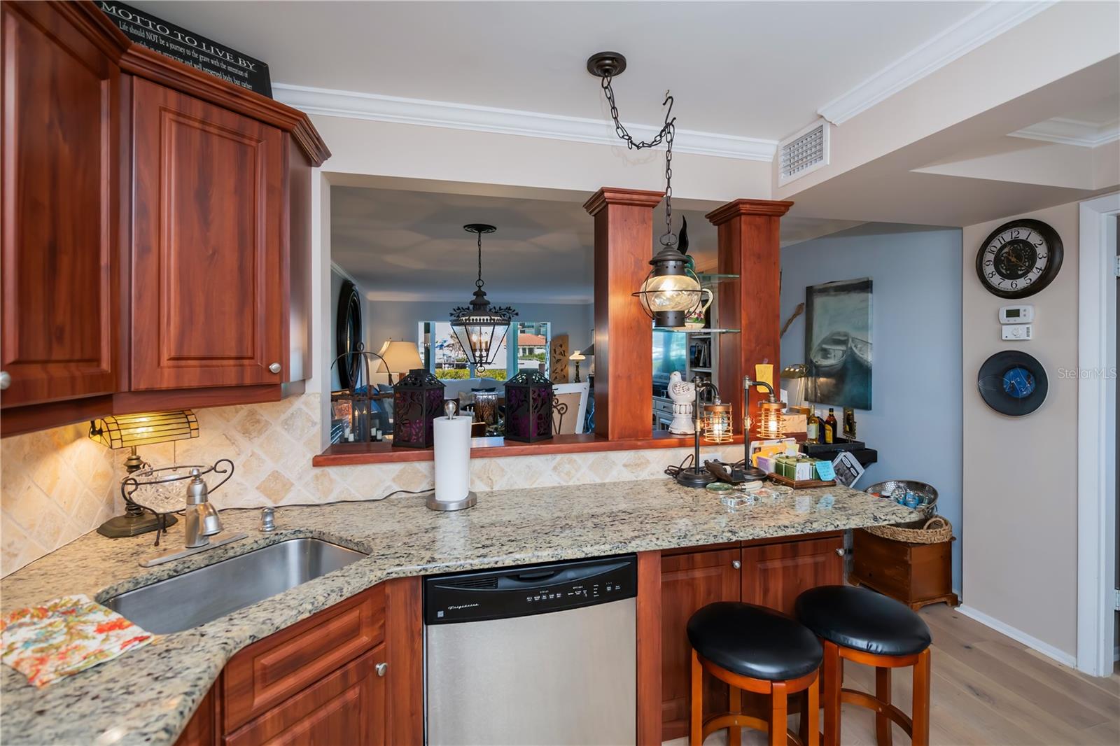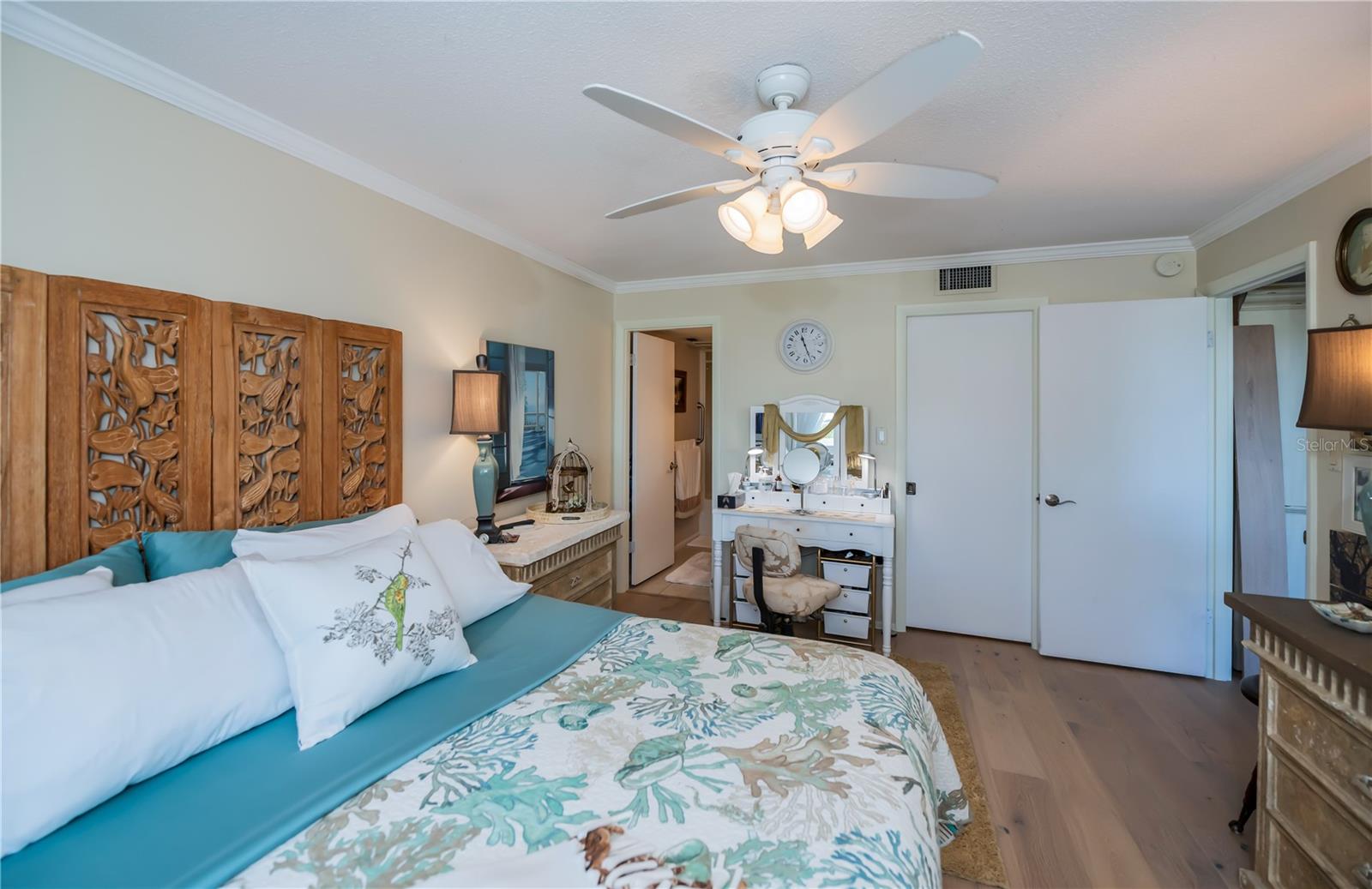 LOCATION-LOCATION-LOCATION... Water views from your living room, with theaters and restaurants just a short walk away. This beautifully updated 2-bedroom, 2-bathroom <b>first-floor</b> condo in Bella Costa offers stunning water views of the Intracoastal Waterway and Roberts Bay, providing a serene backdrop for everyday living. The condo features hurricane windows and sliding glass doors, ensuring both comfort and safety. You'll find beautiful wood floors (installed in 2020) throughout the unit, adding style and charm. The kitchen has been thoughtfully renovated with granite countertops, wood cabinets, and ample storage and counter space—perfect for cooking and entertaining. The spacious living and dining areas are designed to take full advantage of the gorgeous water views, or relax in the bonus enclosed sunroom, an ideal spot for watching boats glide by on warm days. Both bedrooms come with their own ensuites, ensuring privacy and convenience. The master bedroom includes a generous walk-in closet with a built-in washer and dryer, offering plenty of storage space. The guest bedroom is perfect for visitors and work, featuring a built-in Murphy bed, built-in desk, and walk-in closet. Bella Costa is ideally located just a short walk to historic downtown Venice, the Venice Theatre, pristine beaches, shopping, dining, medical facilities, and entertainment. The active community amenities include a clubhouse with a community activity calendar featuring exercise classes, movie nights, a book club, an active pool room, card playing, a small gym, heated pool, outdoor grill, and a fire pit situated between the buildings along the water—perfect for socializing and enjoying the beautiful Florida weather. It's great for watching the holiday boat parade and concerts hosted by the active clubhouse. Whether you're looking for a fantastic seasonal rental investment, a winter retreat, or a year-round residence, this condo offers a wonderful opportunity to live in one of Venice’s most desirable locations. Enjoy watching boats sail by from your private patio and experience the best of waterfront living! Don't miss the opportunity to live where others vacation! This won't last long, so make your appointment today to see this little piece of paradise and island living.