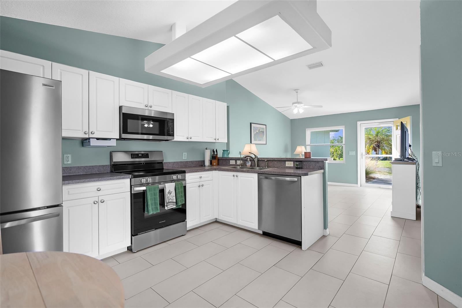 GREAT LOCATION ~ MOVE-IN READY! This adorable and well maintained 2 bedroom, 2 bathroom home features an open floor plan with vaulted ceilings. The kitchen offers new appliances, breakfast bar and reverse osmosis water filtration system. Several recent updates include fresh EXTERIOR PAINT (2024), NEW TRIPLE PANE IMPACT WINDOWS (2023), NEW ROOF (2022), EXTENDED LANAI (2021), NEW TILE FLOORING THROUGHOUT (2021), WATER CONDITIONING SYSTEM (2022) and WATER HEATER (2021). The guest bedroom includes a murphy bed and bookshelves installed in 2021. You’ll love covered extended lanai, which adds plenty of outdoor space to enjoy! The backyard features a patio and mature landscape for privacy. Have peace of mind knowing that this home did not sustain any storm damage. OFFERED PARTIALLY FURNISHED. Membership to the South Venice Civic Association is optional, however community features with fee include access to the South Venice Beach Ferry and South Venice Boat Ramp. Close to everything including parks, beaches, bike trails, Historic Downtown Venice and much more. NO HOA FEE, NO CDD, FLOOD ZONE X. Don't miss the opportunity to see this adorable home! Schedule a showing today!