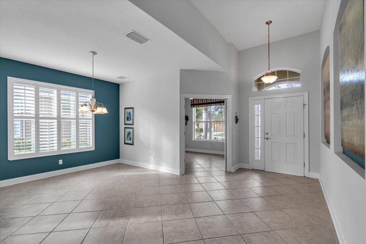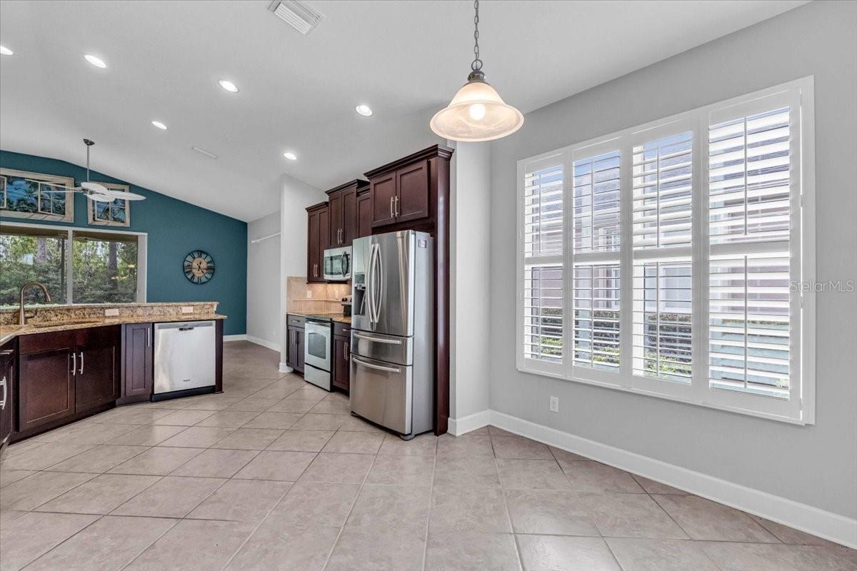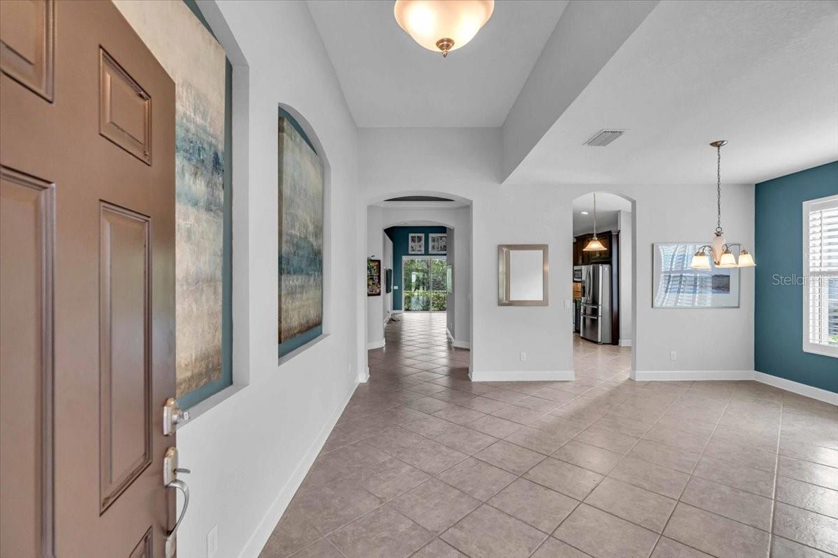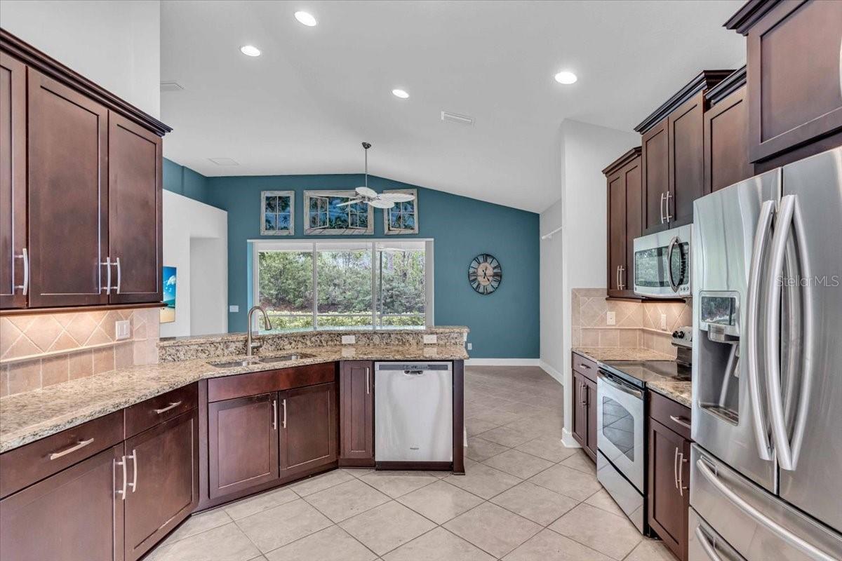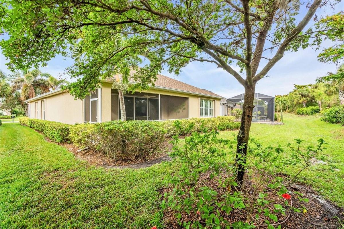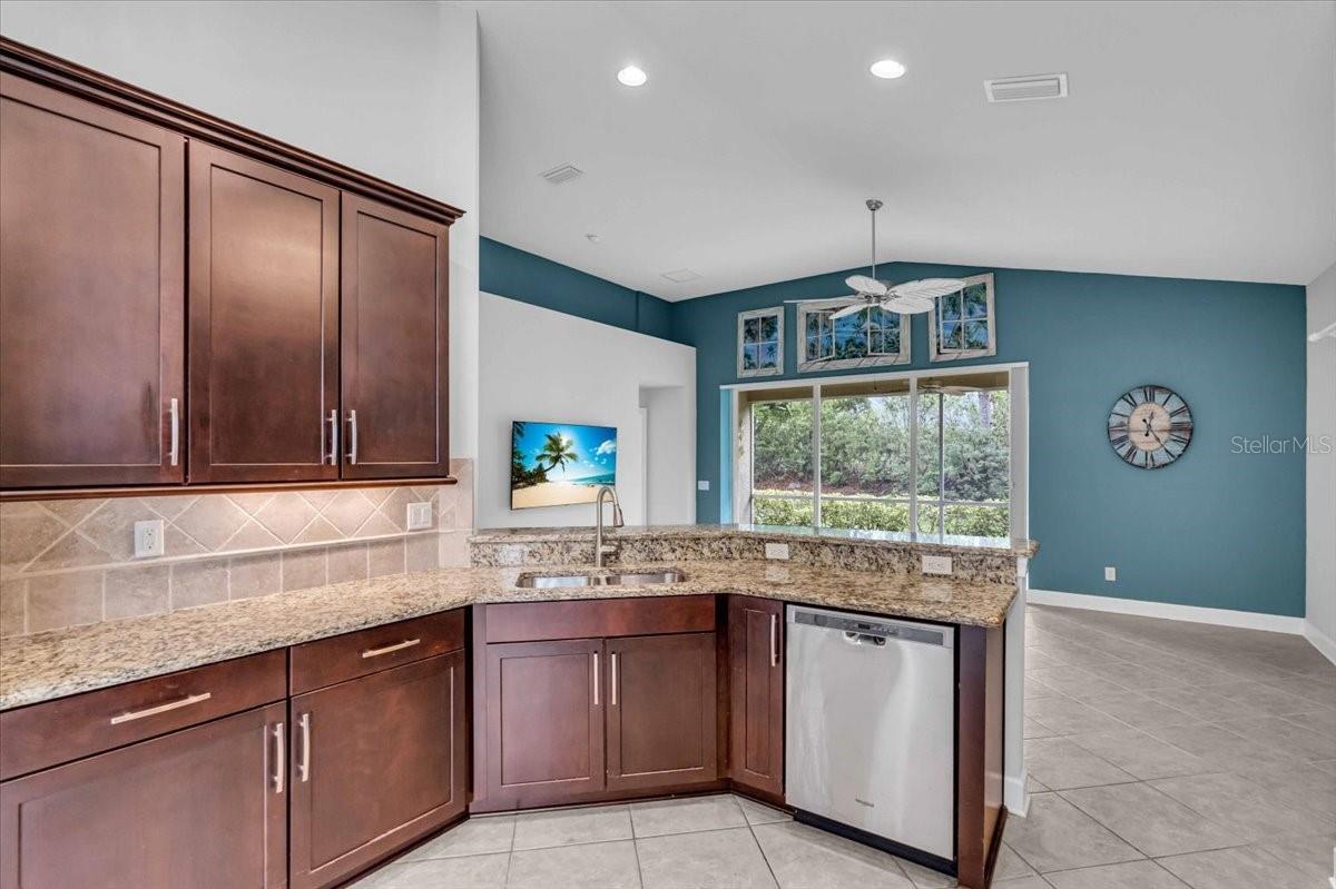 This charming 3-bedroom, 2-bathroom home, nestled in the sought-after Verona Reserve, offers an ideal blend of comfort, style, and convenience. The spacious interior features tile flooring throughout the living areas and bathrooms, with cozy carpet in the bedrooms for added warmth. The heart of the home is the large, open kitchen, complete with beautiful granite countertops, shaker-style cabinets, and a cozy breakfast nook that flows seamlessly into the family room with soaring high ceilings, creating a perfect space for both daily living and entertaining. Off the foyer, you’ll find a separate dining room, ideal for hosting formal meals or special gatherings. The home also includes a dedicated office/den space, perfect for remote work or quiet relaxation. A convenient laundry room adds to the home's functionality, and plantation shutters provide both style and privacy. The master bedroom offers a peaceful retreat, featuring two walk-in closets and an ensuite bathroom with dual sinks, a soaking tub, and a walk-in shower. It’s a perfect space to unwind after a long day. Outside, the screened lanai offers a tranquil setting to enjoy the serene preserve views, along with a corner glimpse of the lake, making it a peaceful place to relax. This home is just minutes from the historic downtown Venice, pristine beaches, shopping, dining, entertainment, I-75, and hospitals, combining a serene lifestyle with easy access to all the essentials. With its spacious layout, desirable location, and beautiful finishes, this home is truly a gem in Verona Reserve.