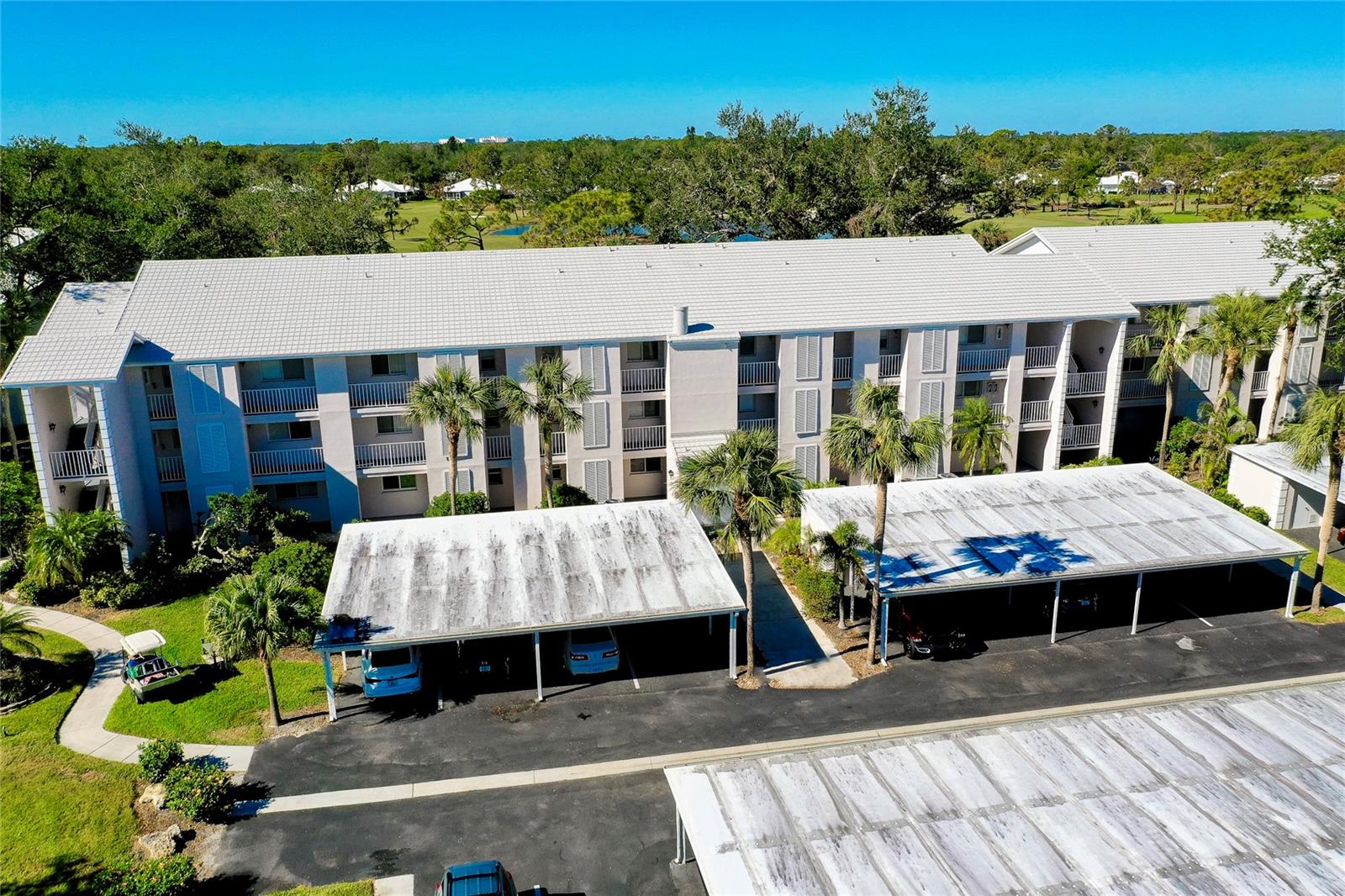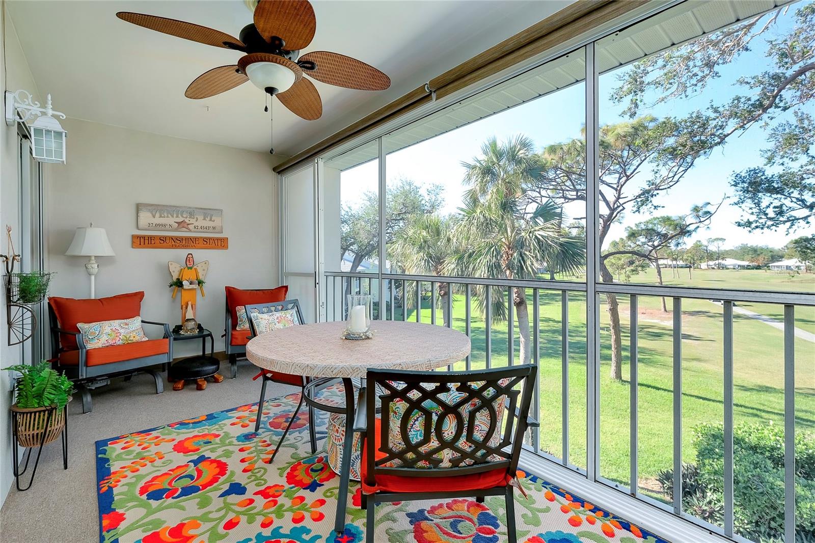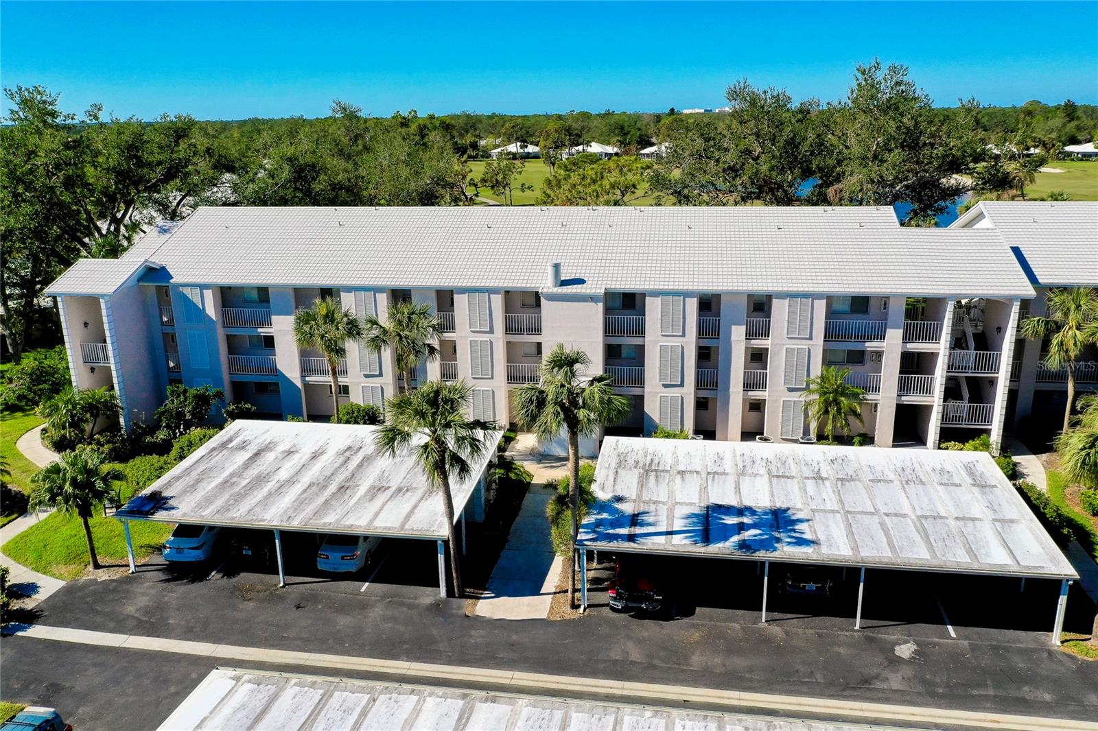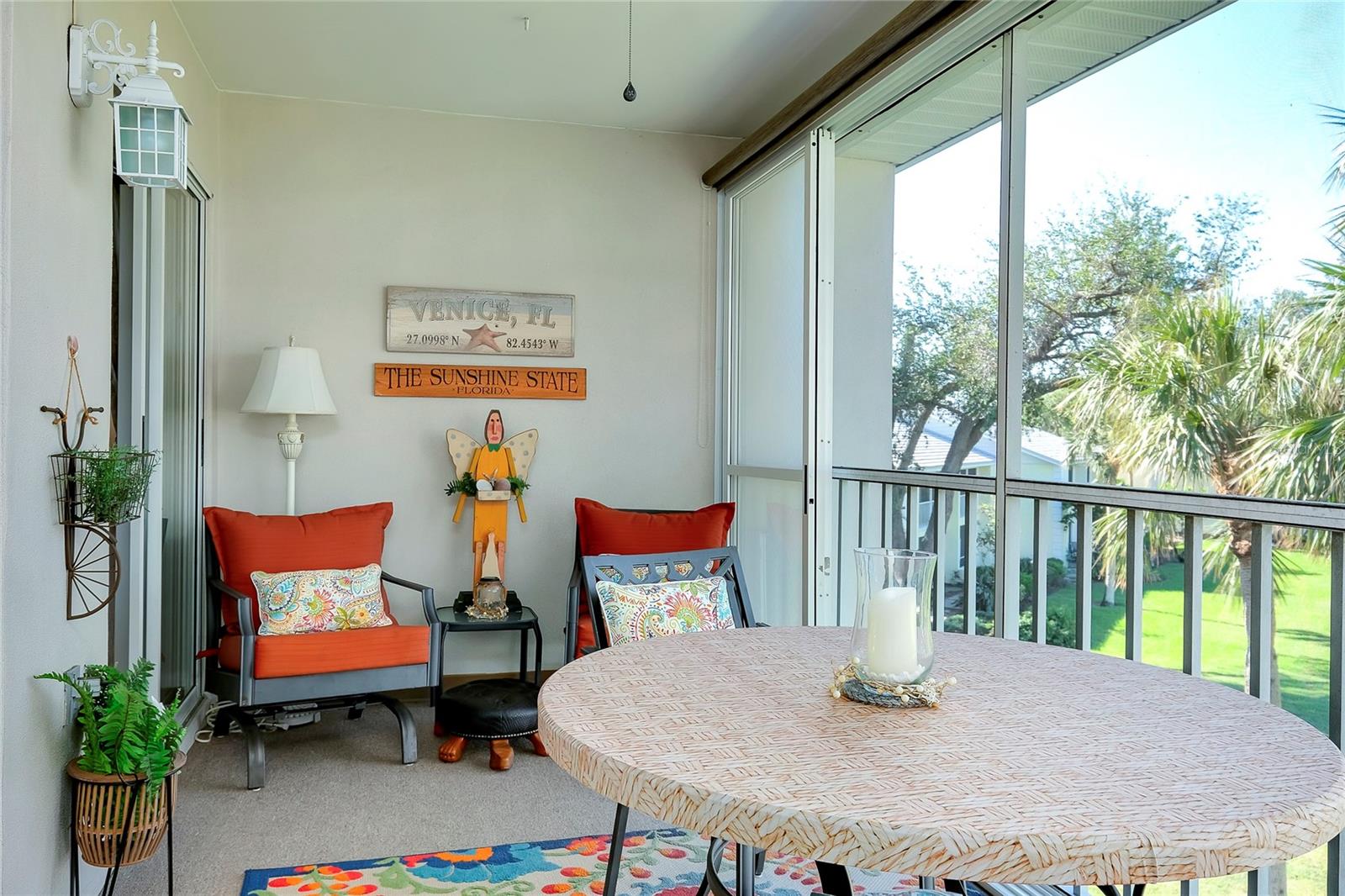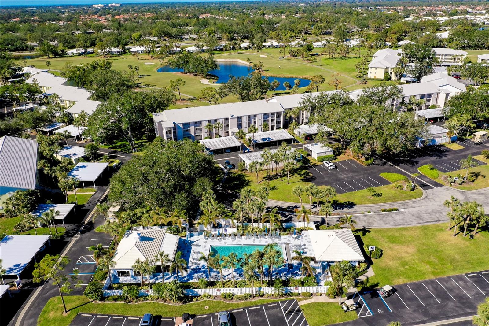 Whether a seasonal retreat or a full-time residence, this tasteful and meticulous home is a delight for the senses and spirit. Located on the 3rd level (with stairs or elevator access) you’ll feel “on top of the world” with expansive views front and back and yet grounded in a lovely well-groomed established community among tropical plantings. The residential buildings all have brand new (2024) metal tile roofs! The home’s palette and décor boast a tasteful combo of easy-living seaside with traditional styling. Enter from the tiled foyer to the main living area with cathedral ceilings where dining and living areas are open to one another creating a feeling of spaciousness yet connection. Wood-look laminate flooring in the dining and living areas complement the tones of the tile floors in the entry foyer, kitchen and baths. The kitchen features easy-clean cabinetry with easy-close doors and granite counter tops. A plantation-shuttered window allows both light and privacy. The primary bedroom has a private en suite bath featuring separate dual vanities with granite counter tops, an ample shower, a walk-in closet and a separate and convenient enclosed closet for the stack-able washer and dryer. Separation of bedrooms adds a level of privacy. The secondary bedroom is cozy and comfortable offering easy access to the second full bath. Sliders from the living room and primary bedroom access the rear covered lanai overlooking the lake with a view of the 5th green of the Bobcat course. With its westerly position, it’s a great place for a morning beverage, reading a good book in the afternoon or watching blazing sunsets. The lanai also features the bonus of having a full set of both “interior” and “exterior” sliders providing the option to easily enclose the area to create a delightful living area in any season, weather or temperature. The detached carport with parking for one vehicle has an attached locking storage room. There is plenty of additional parking very nearby. All this, and with one of the best locations within the Farmington Vistas complex, set back with a westerly rear view, and yet convenient and just steps away to the easterly positioned clubhouse and pool and outside grills amid mature tropical landscaping. The master Plantation community is a wonderful place to enjoy the Florida lifestyle. Membership to Plantation Golf and Country Club is optional and offers additional amenities including two 18-hole golf courses, clubhouse with a restaurant, fitness room, tennis, bocce and pickle ball courts, and a large community pool. All of this located close to some of the Gulf coast’s most beautiful beaches, historic downtown Venice with cultural and art centers, shopping, dining, parks and recreation areas.