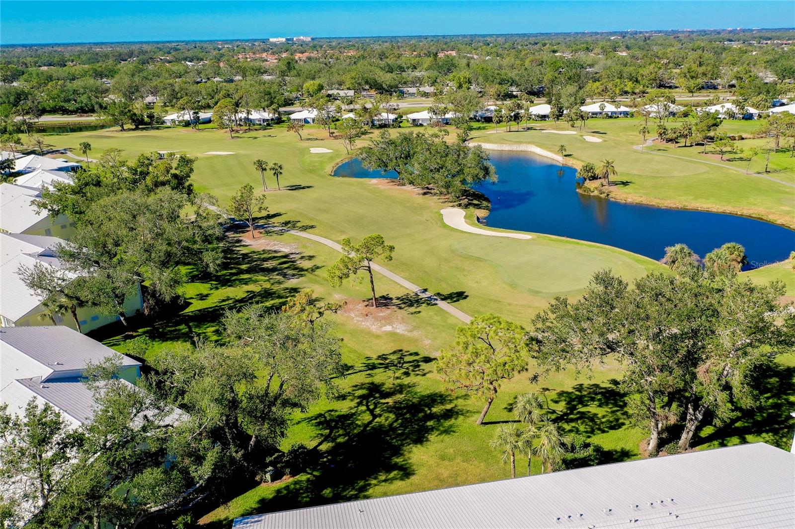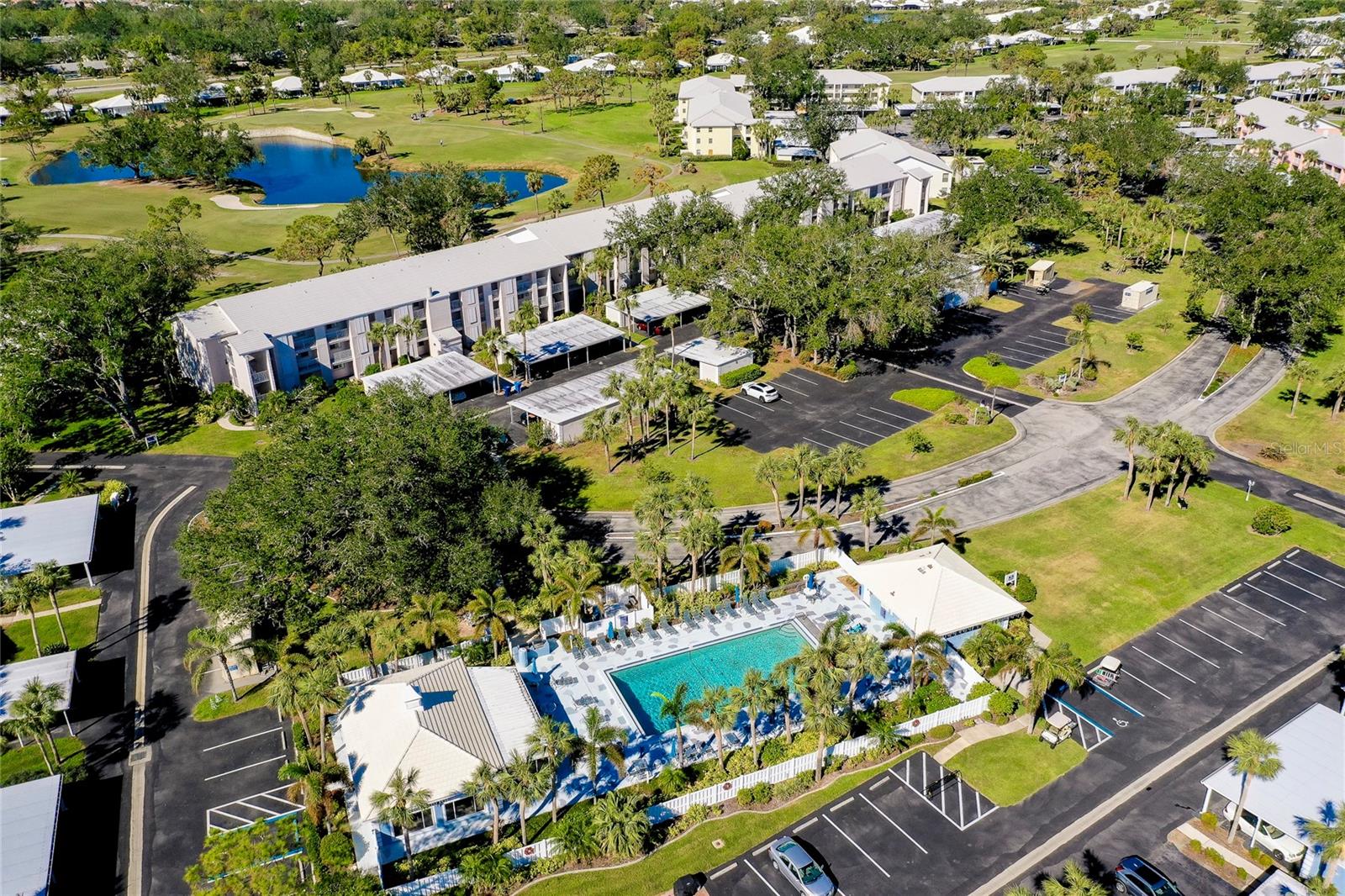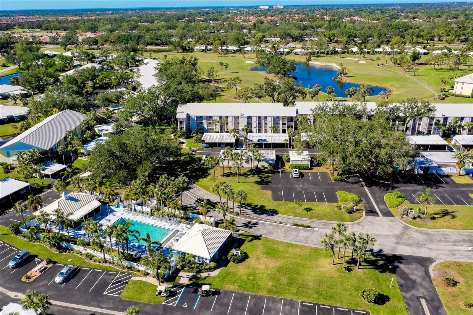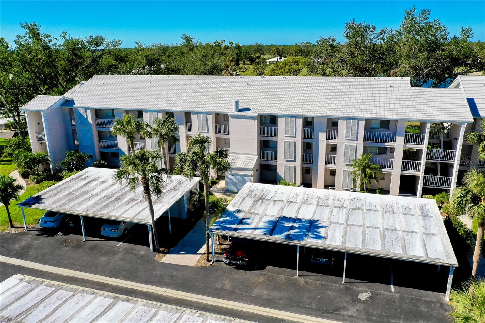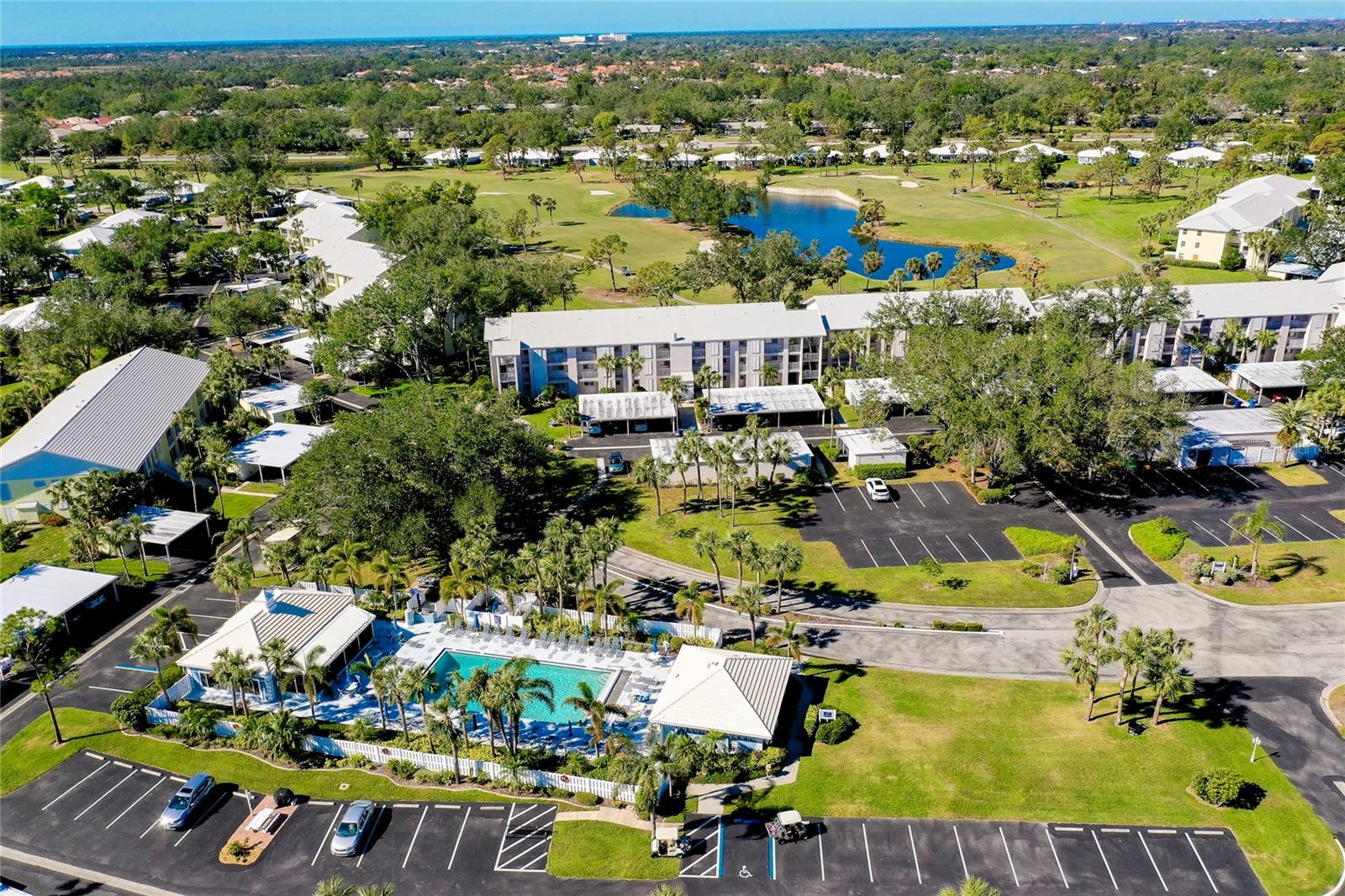 Whether a seasonal retreat or a full-time residence, this tasteful and meticulous home is a delight for the senses and spirit. Located on the 3rd level (with stairs or elevator access) you’ll feel “on top of the world” with expansive views front and back and yet grounded in a lovely well-groomed established community among tropical plantings. The residential buildings all have brand new (2024) metal tile roofs! The home’s palette and décor boast a tasteful combo of easy-living seaside with traditional styling. Enter from the tiled foyer to the main living area with cathedral ceilings where dining and living areas are open to one another creating a feeling of spaciousness yet connection. Wood-look laminate flooring in the dining and living areas complement the tones of the tile floors in the entry foyer, kitchen and baths. The kitchen features easy-clean cabinetry with easy-close doors and granite counter tops. A plantation-shuttered window allows both light and privacy. The primary bedroom has a private en suite bath featuring separate dual vanities with granite counter tops, an ample shower, a walk-in closet and a separate and convenient enclosed closet for the stack-able washer and dryer. Separation of bedrooms adds a level of privacy. The secondary bedroom is cozy and comfortable offering easy access to the second full bath. Sliders from the living room and primary bedroom access the rear covered lanai overlooking the lake with a view of the 5th green of the Bobcat course. With its westerly position, it’s a great place for a morning beverage, reading a good book in the afternoon or watching blazing sunsets. The lanai also features the bonus of having a full set of both “interior” and “exterior” sliders providing the option to easily enclose the area to create a delightful living area in any season, weather or temperature. The detached carport with parking for one vehicle has an attached locking storage room. There is plenty of additional parking very nearby. All this, and with one of the best locations within the Farmington Vistas complex, set back with a westerly rear view, and yet convenient and just steps away to the easterly positioned clubhouse and pool and outside grills amid mature tropical landscaping. The master Plantation community is a wonderful place to enjoy the Florida lifestyle. Membership to Plantation Golf and Country Club is optional and offers additional amenities including two 18-hole golf courses, clubhouse with a restaurant, fitness room, tennis, bocce and pickle ball courts, and a large community pool. All of this located close to some of the Gulf coast’s most beautiful beaches, historic downtown Venice with cultural and art centers, shopping, dining, parks and recreation areas.