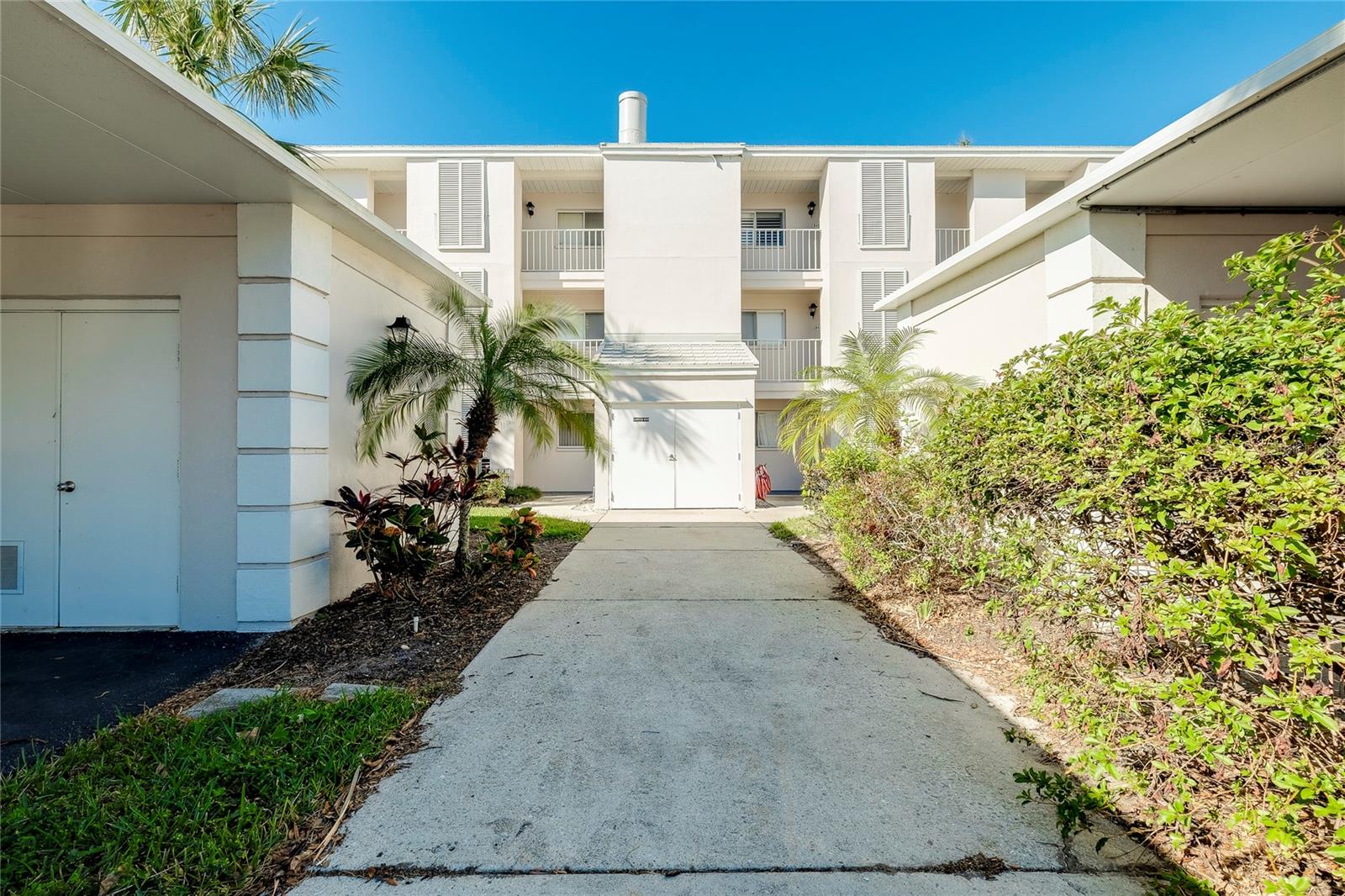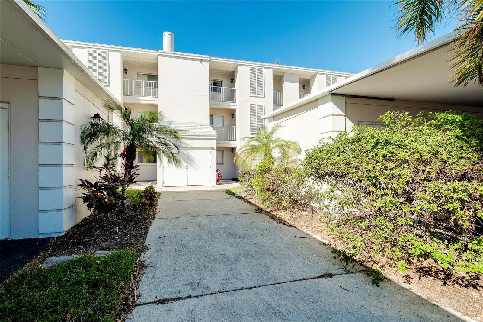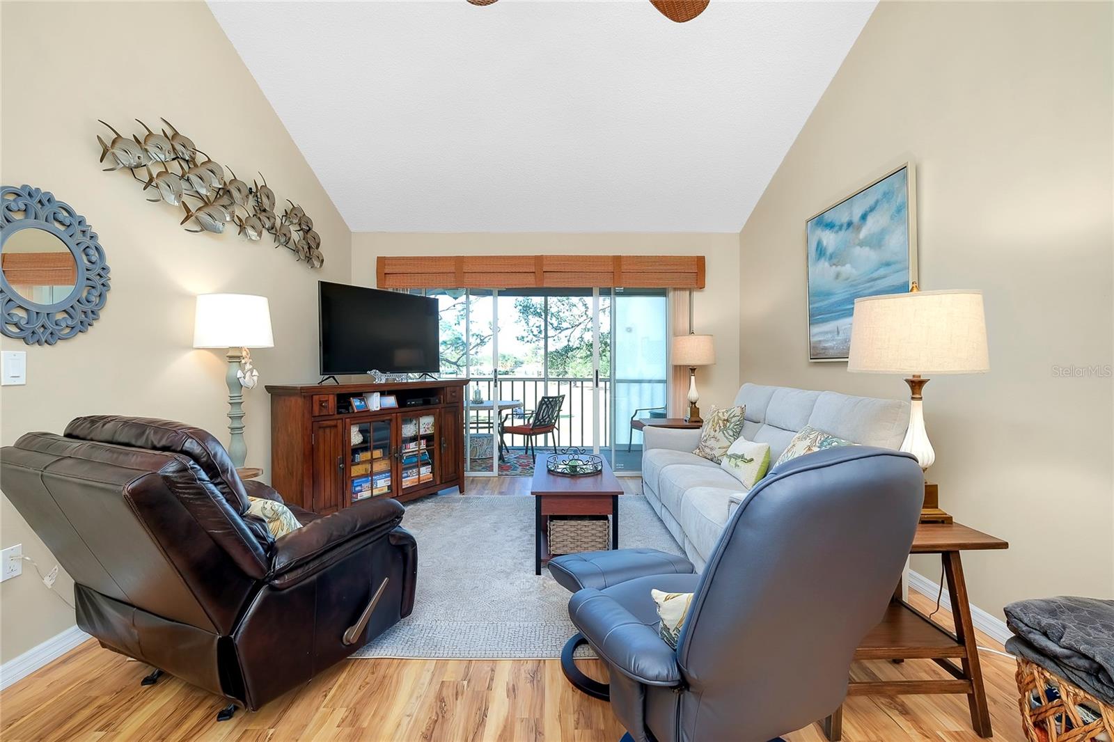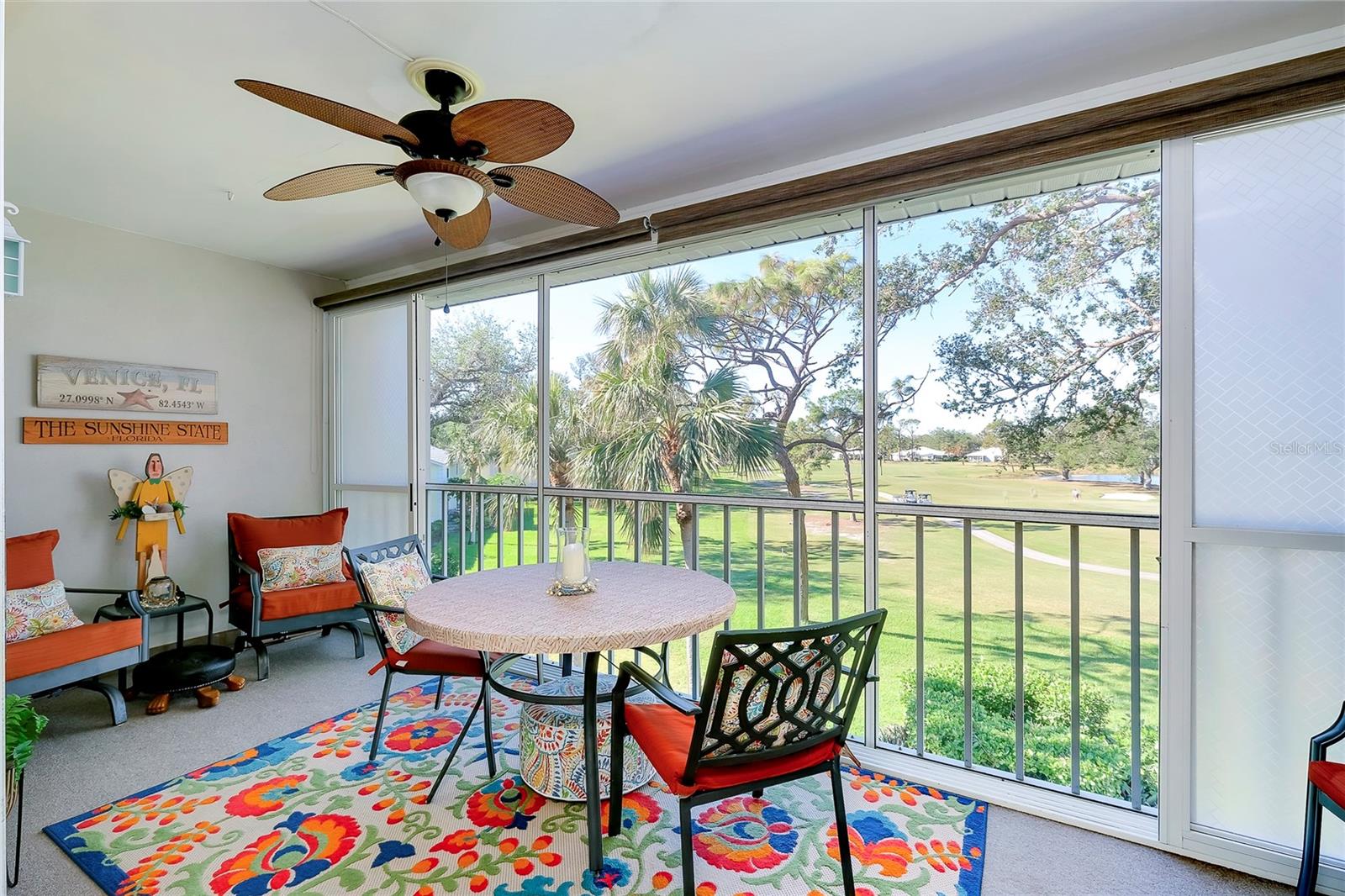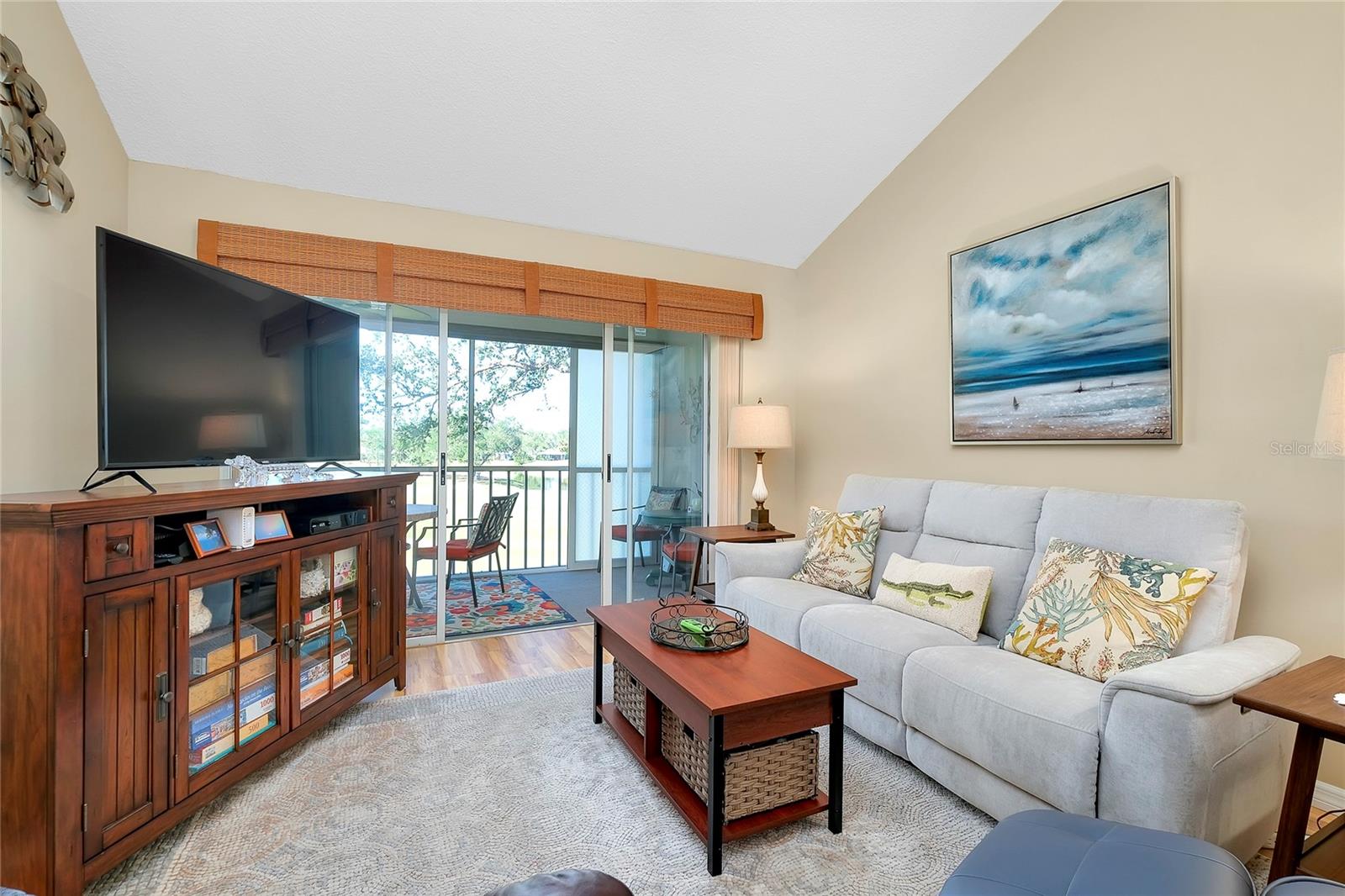 Whether a seasonal retreat or a full-time residence, this tasteful and meticulous home is a delight for the senses and spirit. Located on the 3rd level (with stairs or elevator access) you’ll feel “on top of the world” with expansive views front and back and yet grounded in a lovely well-groomed established community among tropical plantings. The residential buildings all have brand new (2024) metal tile roofs! The home’s palette and décor boast a tasteful combo of easy-living seaside with traditional styling. Enter from the tiled foyer to the main living area with cathedral ceilings where dining and living areas are open to one another creating a feeling of spaciousness yet connection. Wood-look laminate flooring in the dining and living areas complement the tones of the tile floors in the entry foyer, kitchen and baths. The kitchen features easy-clean cabinetry with easy-close doors and granite counter tops. A plantation-shuttered window allows both light and privacy. The primary bedroom has a private en suite bath featuring separate dual vanities with granite counter tops, an ample shower, a walk-in closet and a separate and convenient enclosed closet for the stack-able washer and dryer. Separation of bedrooms adds a level of privacy. The secondary bedroom is cozy and comfortable offering easy access to the second full bath. Sliders from the living room and primary bedroom access the rear covered lanai overlooking the lake with a view of the 5th green of the Bobcat course. With its westerly position, it’s a great place for a morning beverage, reading a good book in the afternoon or watching blazing sunsets. The lanai also features the bonus of having a full set of both “interior” and “exterior” sliders providing the option to easily enclose the area to create a delightful living area in any season, weather or temperature. The detached carport with parking for one vehicle has an attached locking storage room. There is plenty of additional parking very nearby. All this, and with one of the best locations within the Farmington Vistas complex, set back with a westerly rear view, and yet convenient and just steps away to the easterly positioned clubhouse and pool and outside grills amid mature tropical landscaping. The master Plantation community is a wonderful place to enjoy the Florida lifestyle. Membership to Plantation Golf and Country Club is optional and offers additional amenities including two 18-hole golf courses, clubhouse with a restaurant, fitness room, tennis, bocce and pickle ball courts, and a large community pool. All of this located close to some of the Gulf coast’s most beautiful beaches, historic downtown Venice with cultural and art centers, shopping, dining, parks and recreation areas.