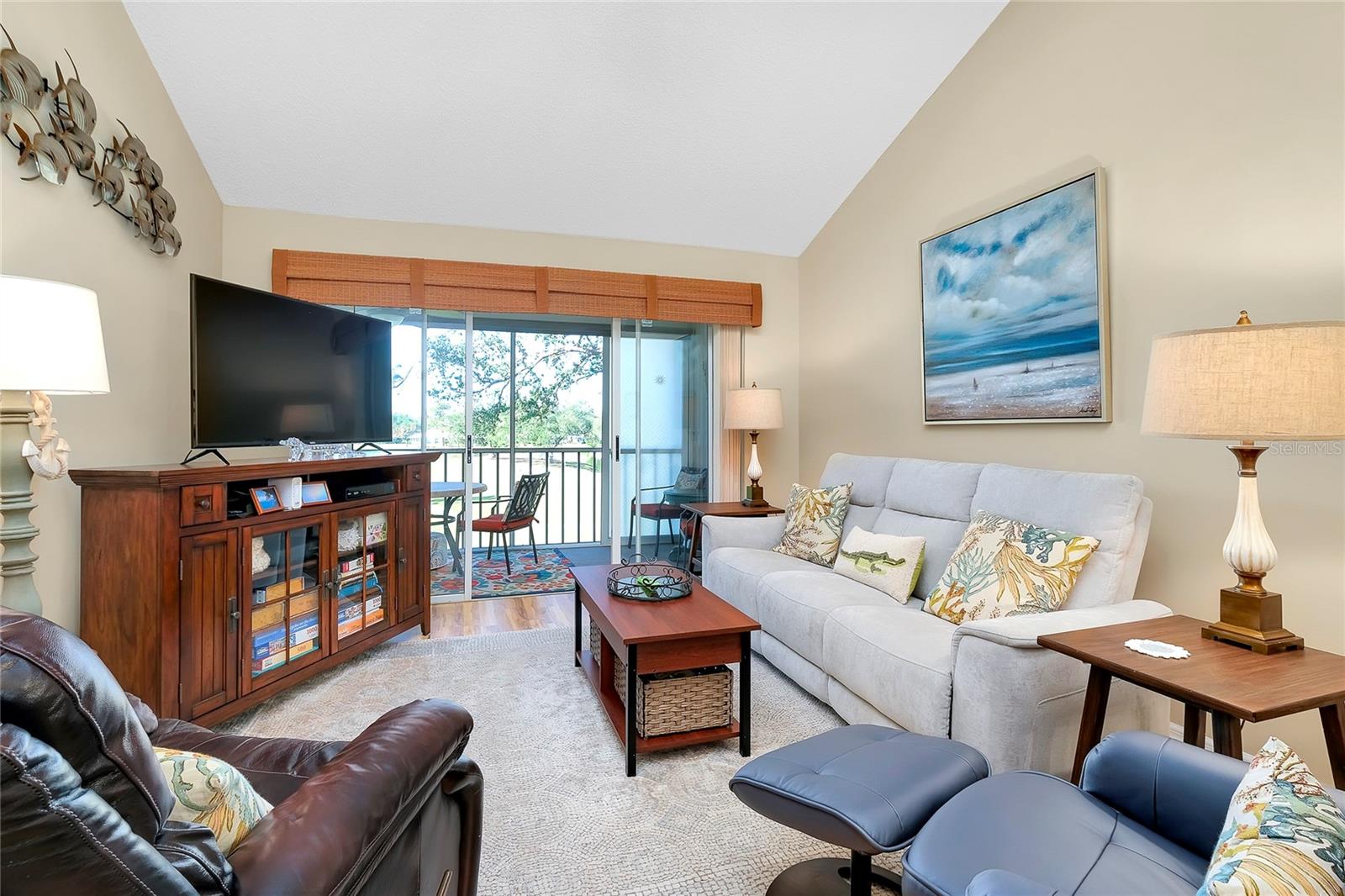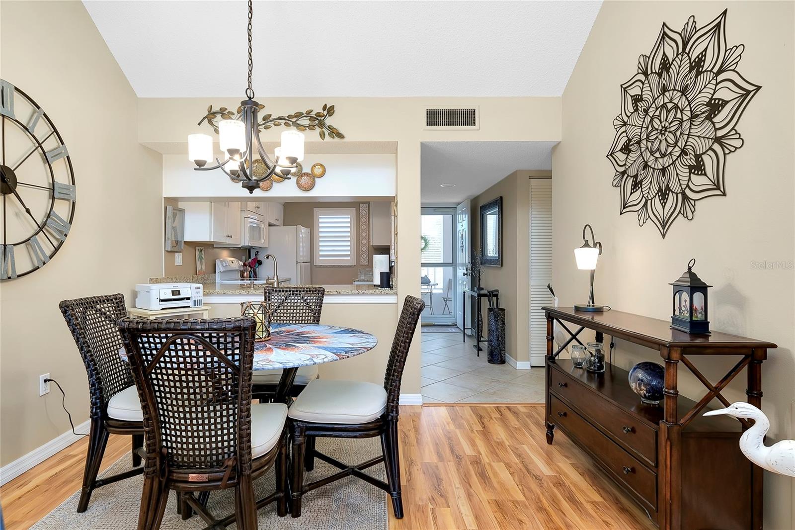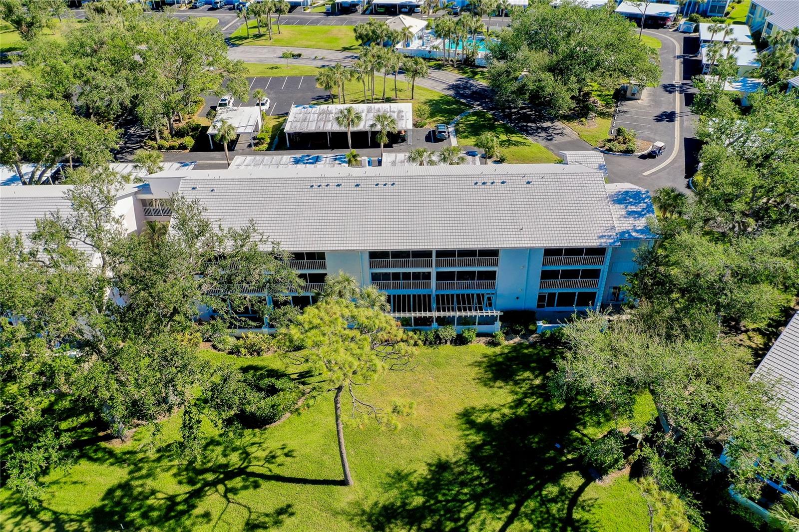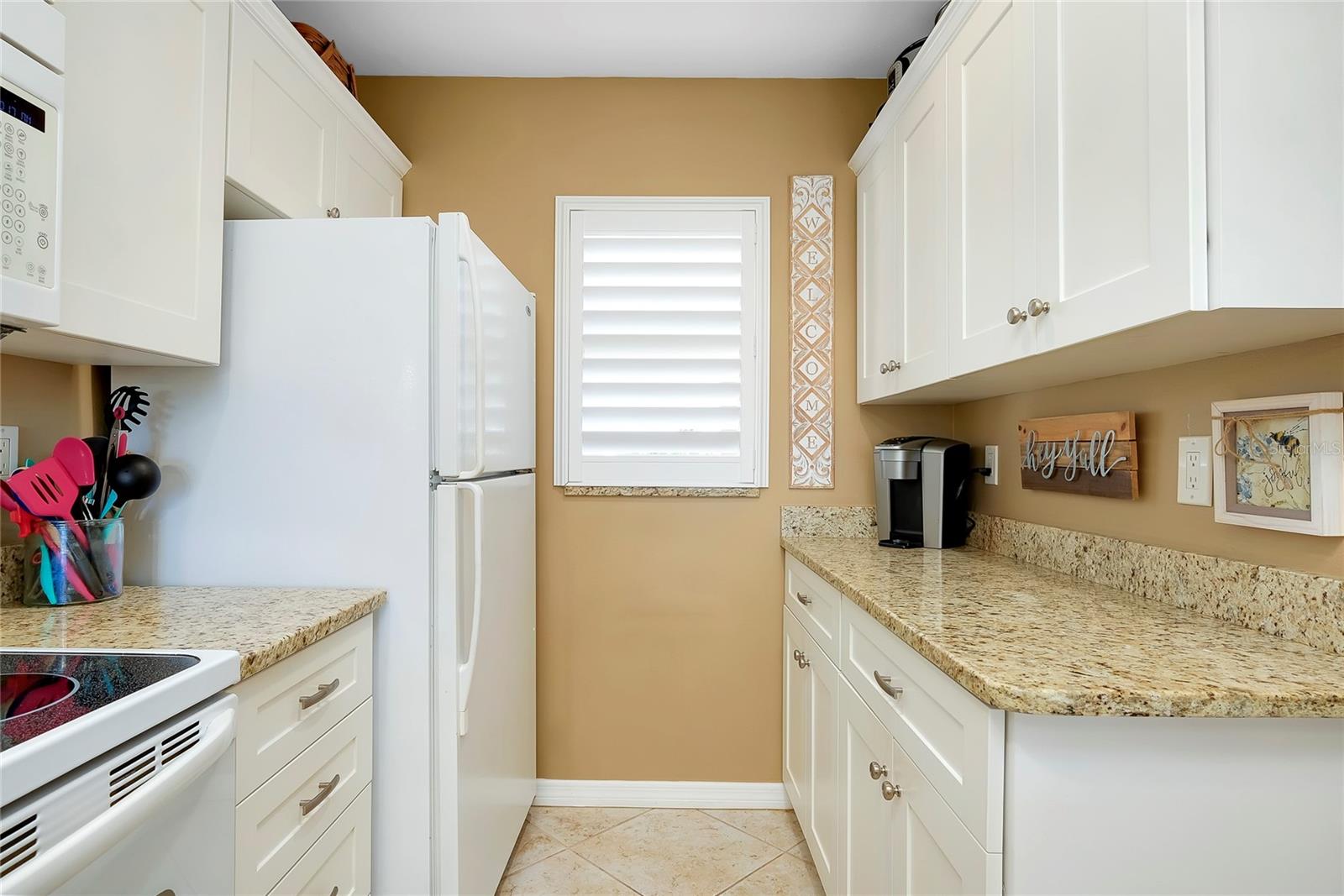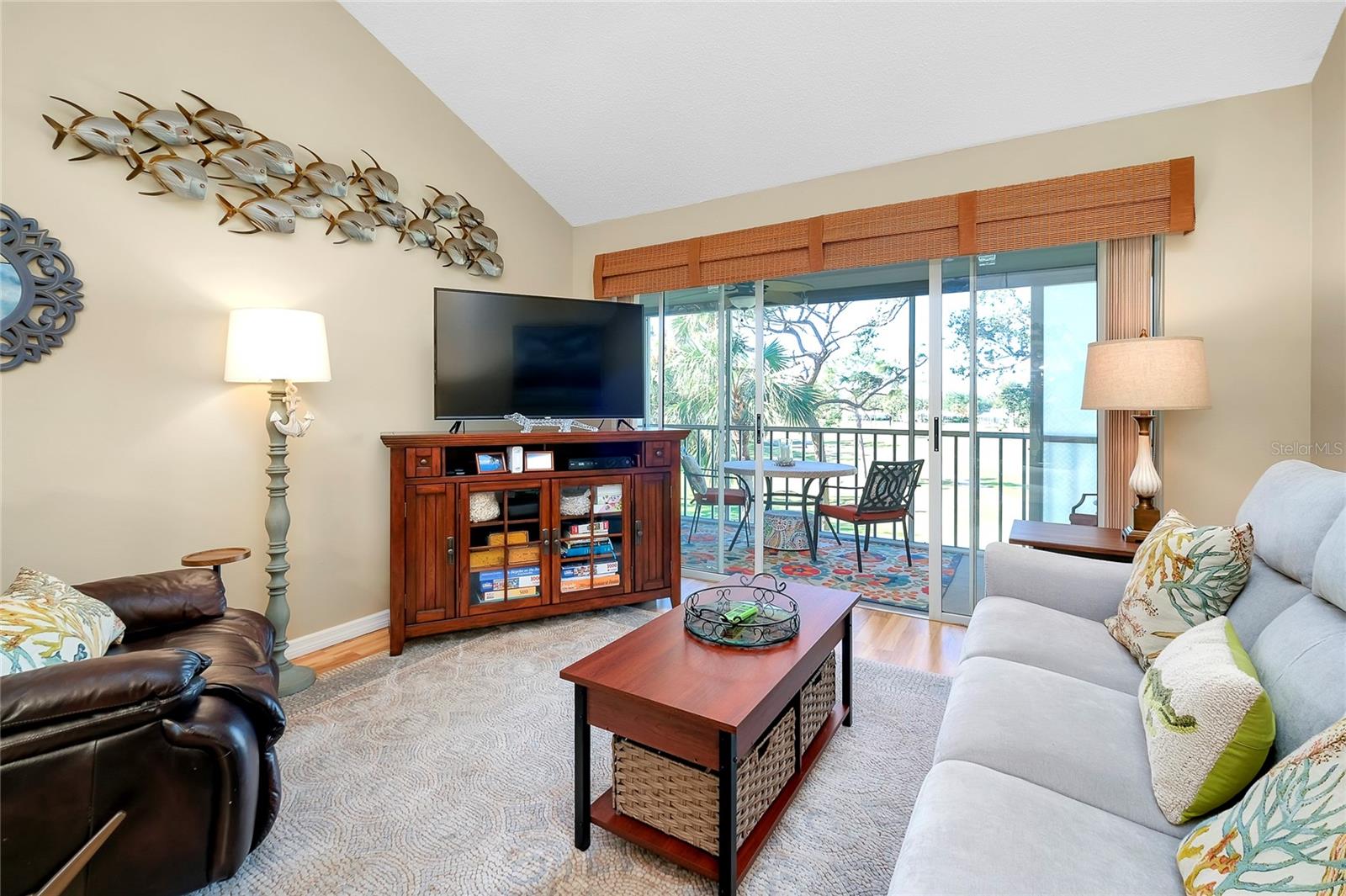 Whether a seasonal retreat or a full-time residence, this tasteful and meticulous home is a delight for the senses and spirit. Located on the 3rd level (with stairs or elevator access) you’ll feel “on top of the world” with expansive views front and back and yet grounded in a lovely well-groomed established community among tropical plantings. The residential buildings all have brand new (2024) metal tile roofs! The home’s palette and décor boast a tasteful combo of easy-living seaside with traditional styling. Enter from the tiled foyer to the main living area with cathedral ceilings where dining and living areas are open to one another creating a feeling of spaciousness yet connection. Wood-look laminate flooring in the dining and living areas complement the tones of the tile floors in the entry foyer, kitchen and baths. The kitchen features easy-clean cabinetry with easy-close doors and granite counter tops. A plantation-shuttered window allows both light and privacy. The primary bedroom has a private en suite bath featuring separate dual vanities with granite counter tops, an ample shower, a walk-in closet and a separate and convenient enclosed closet for the stack-able washer and dryer. Separation of bedrooms adds a level of privacy. The secondary bedroom is cozy and comfortable offering easy access to the second full bath. Sliders from the living room and primary bedroom access the rear covered lanai overlooking the lake with a view of the 5th green of the Bobcat course. With its westerly position, it’s a great place for a morning beverage, reading a good book in the afternoon or watching blazing sunsets. The lanai also features the bonus of having a full set of both “interior” and “exterior” sliders providing the option to easily enclose the area to create a delightful living area in any season, weather or temperature. The detached carport with parking for one vehicle has an attached locking storage room. There is plenty of additional parking very nearby. All this, and with one of the best locations within the Farmington Vistas complex, set back with a westerly rear view, and yet convenient and just steps away to the easterly positioned clubhouse and pool and outside grills amid mature tropical landscaping. The master Plantation community is a wonderful place to enjoy the Florida lifestyle. Membership to Plantation Golf and Country Club is optional and offers additional amenities including two 18-hole golf courses, clubhouse with a restaurant, fitness room, tennis, bocce and pickle ball courts, and a large community pool. All of this located close to some of the Gulf coast’s most beautiful beaches, historic downtown Venice with cultural and art centers, shopping, dining, parks and recreation areas.