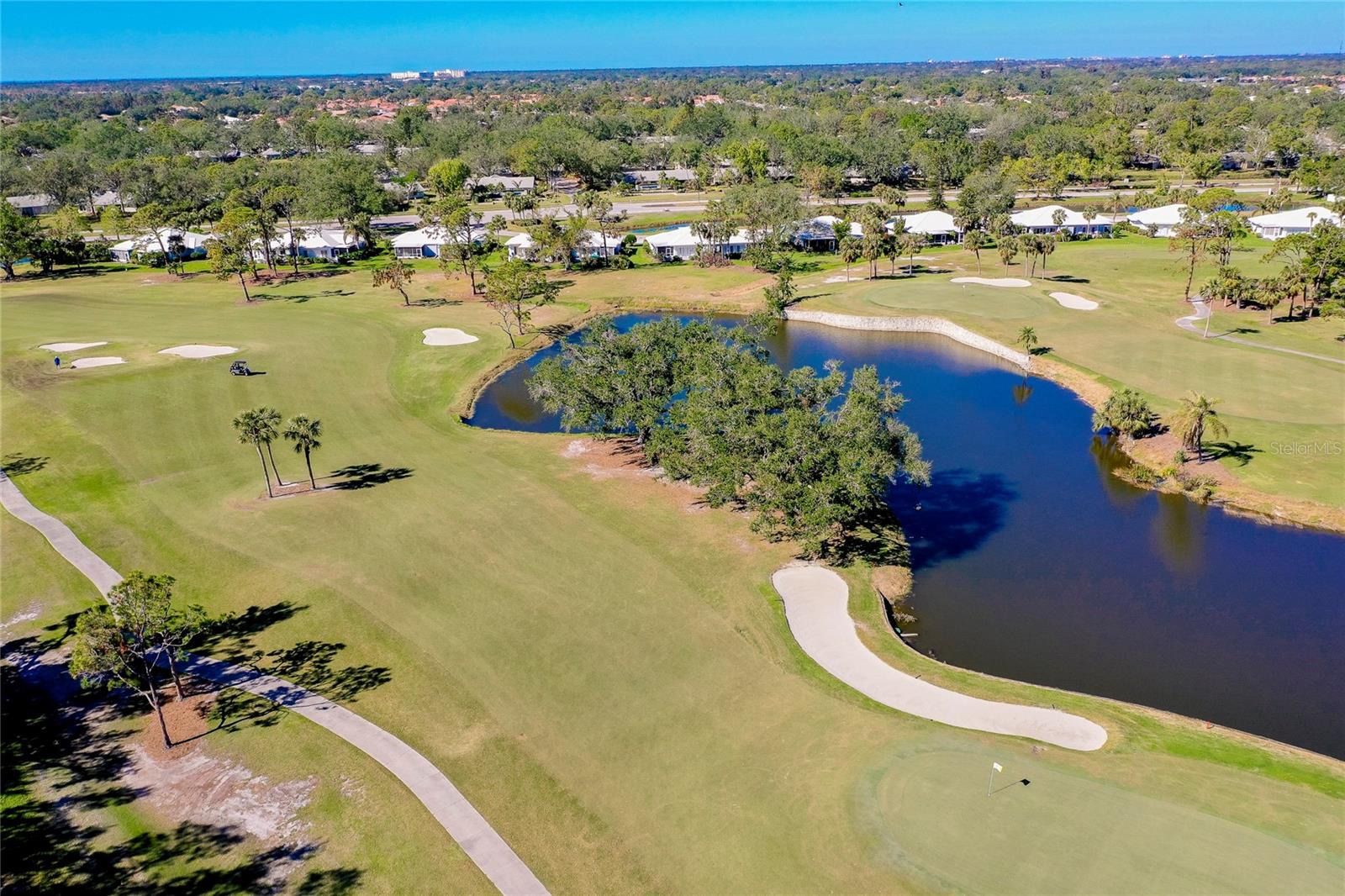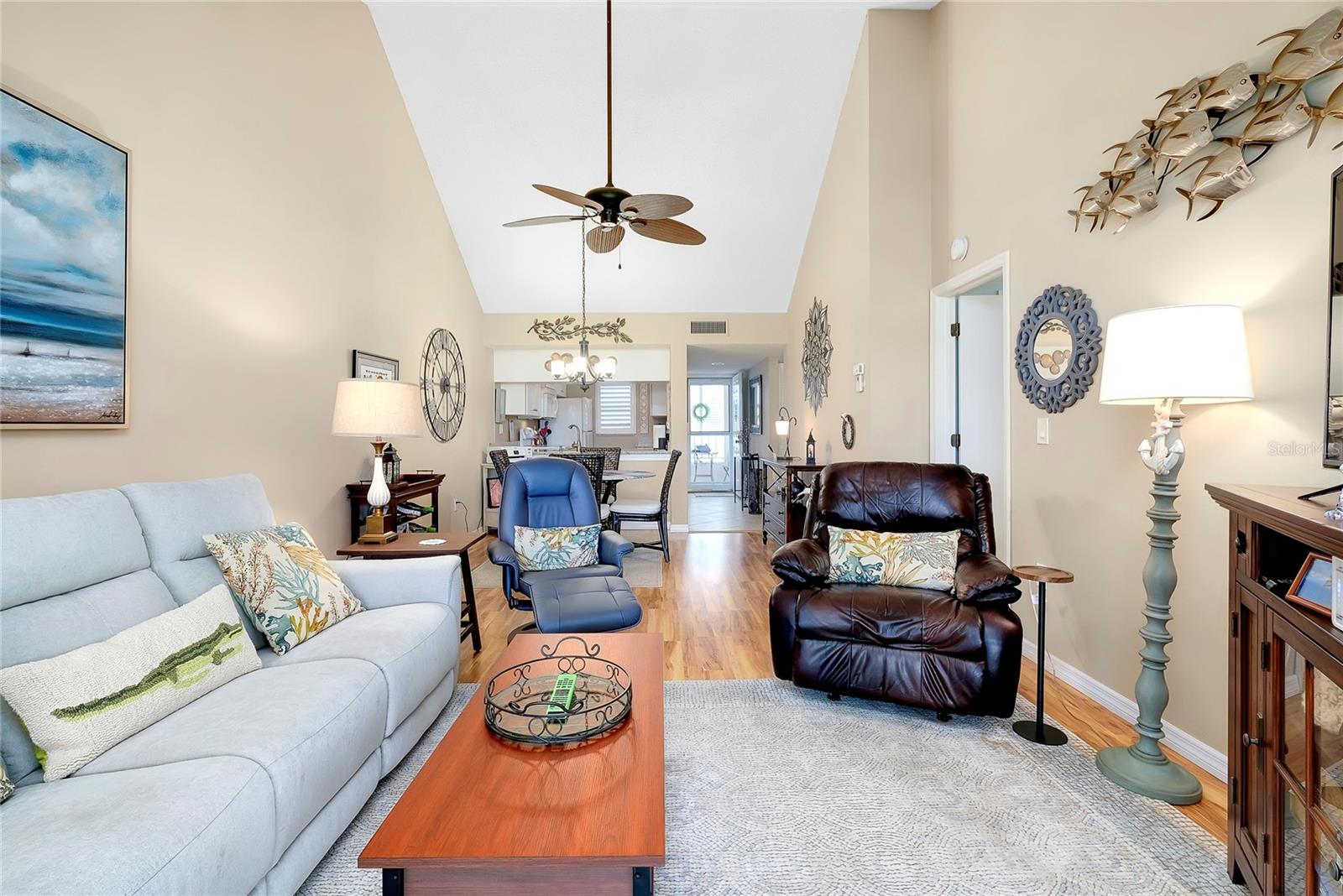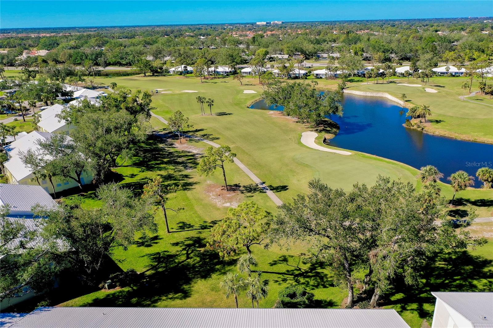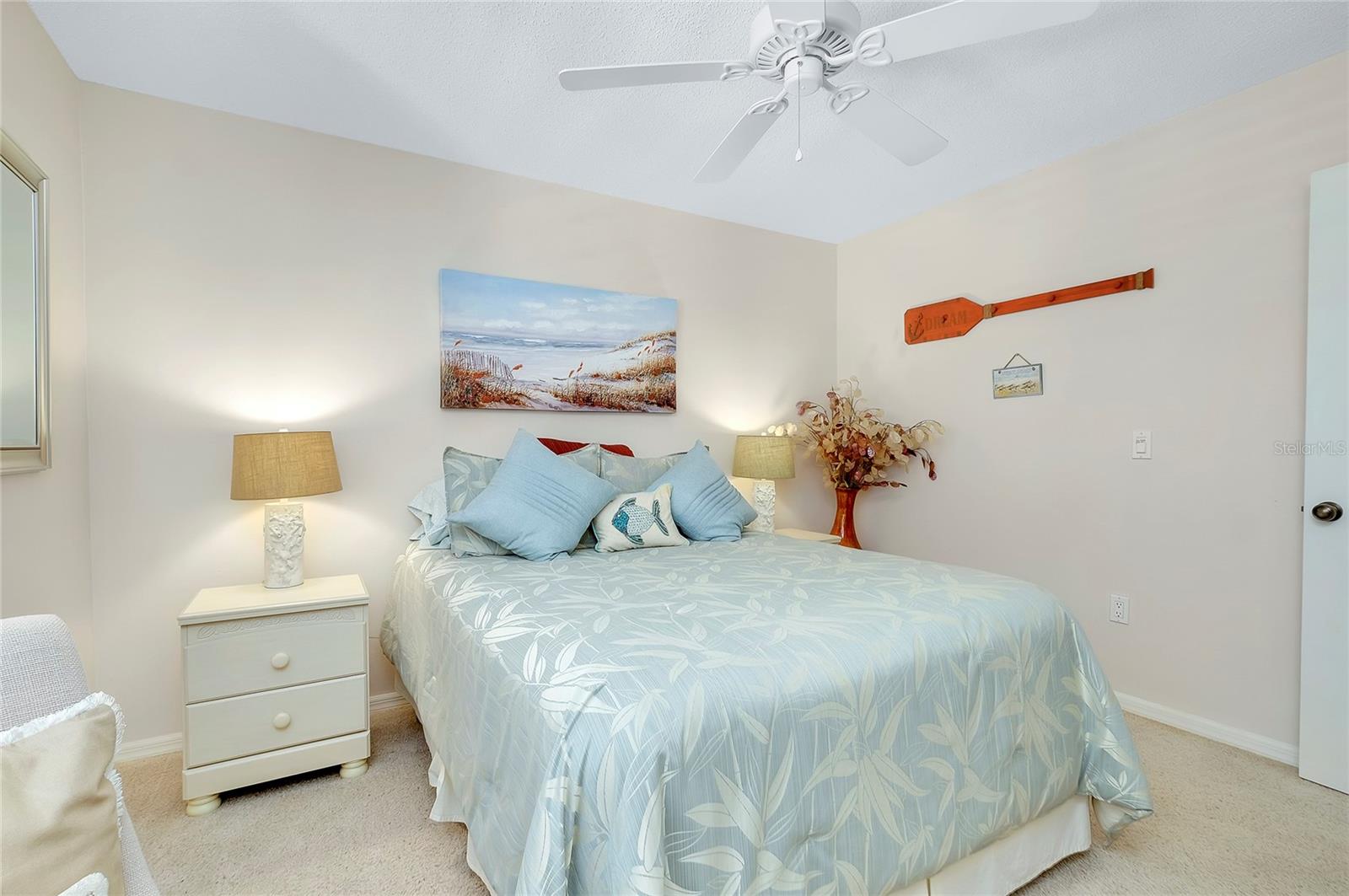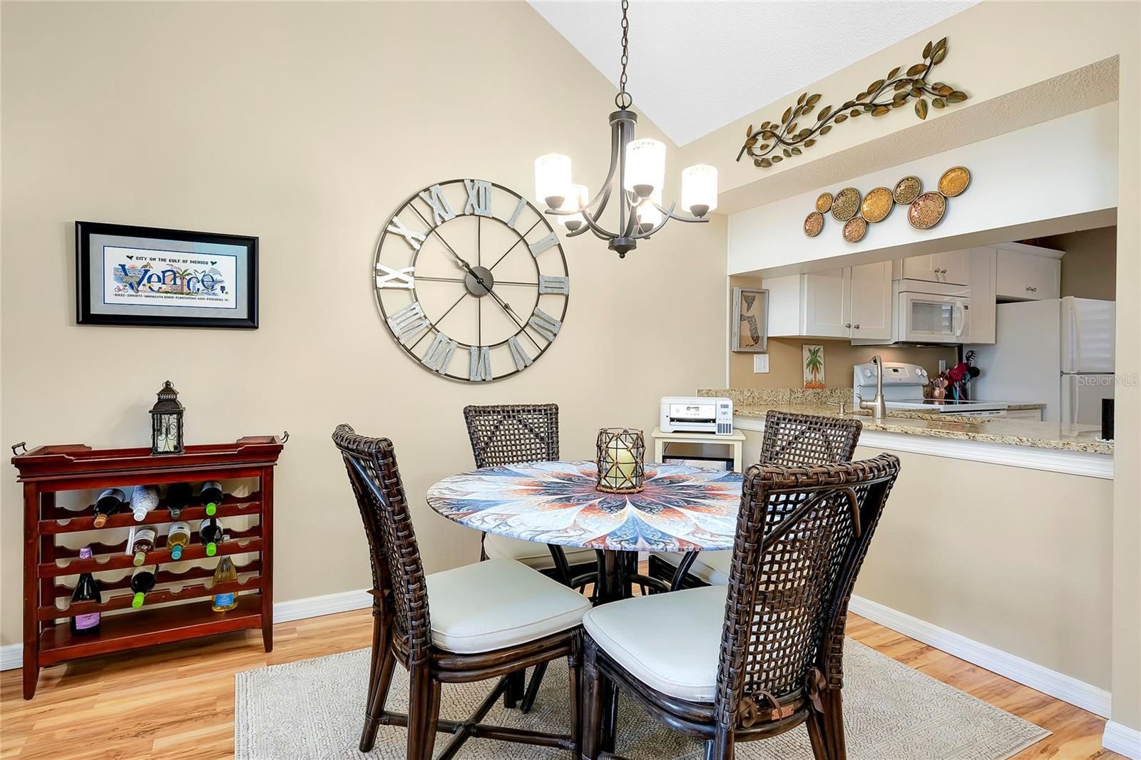 Whether a seasonal retreat or a full-time residence, this tasteful and meticulous home is a delight for the senses and spirit. Located on the 3rd level (with stairs or elevator access) you’ll feel “on top of the world” with expansive views front and back and yet grounded in a lovely well-groomed established community among tropical plantings. The residential buildings all have brand new (2024) metal tile roofs! The home’s palette and décor boast a tasteful combo of easy-living seaside with traditional styling. Enter from the tiled foyer to the main living area with cathedral ceilings where dining and living areas are open to one another creating a feeling of spaciousness yet connection. Wood-look laminate flooring in the dining and living areas complement the tones of the tile floors in the entry foyer, kitchen and baths. The kitchen features easy-clean cabinetry with easy-close doors and granite counter tops. A plantation-shuttered window allows both light and privacy. The primary bedroom has a private en suite bath featuring separate dual vanities with granite counter tops, an ample shower, a walk-in closet and a separate and convenient enclosed closet for the stack-able washer and dryer. Separation of bedrooms adds a level of privacy. The secondary bedroom is cozy and comfortable offering easy access to the second full bath. Sliders from the living room and primary bedroom access the rear covered lanai overlooking the lake with a view of the 5th green of the Bobcat course. With its westerly position, it’s a great place for a morning beverage, reading a good book in the afternoon or watching blazing sunsets. The lanai also features the bonus of having a full set of both “interior” and “exterior” sliders providing the option to easily enclose the area to create a delightful living area in any season, weather or temperature. The detached carport with parking for one vehicle has an attached locking storage room. There is plenty of additional parking very nearby. All this, and with one of the best locations within the Farmington Vistas complex, set back with a westerly rear view, and yet convenient and just steps away to the easterly positioned clubhouse and pool and outside grills amid mature tropical landscaping. The master Plantation community is a wonderful place to enjoy the Florida lifestyle. Membership to Plantation Golf and Country Club is optional and offers additional amenities including two 18-hole golf courses, clubhouse with a restaurant, fitness room, tennis, bocce and pickle ball courts, and a large community pool. All of this located close to some of the Gulf coast’s most beautiful beaches, historic downtown Venice with cultural and art centers, shopping, dining, parks and recreation areas.