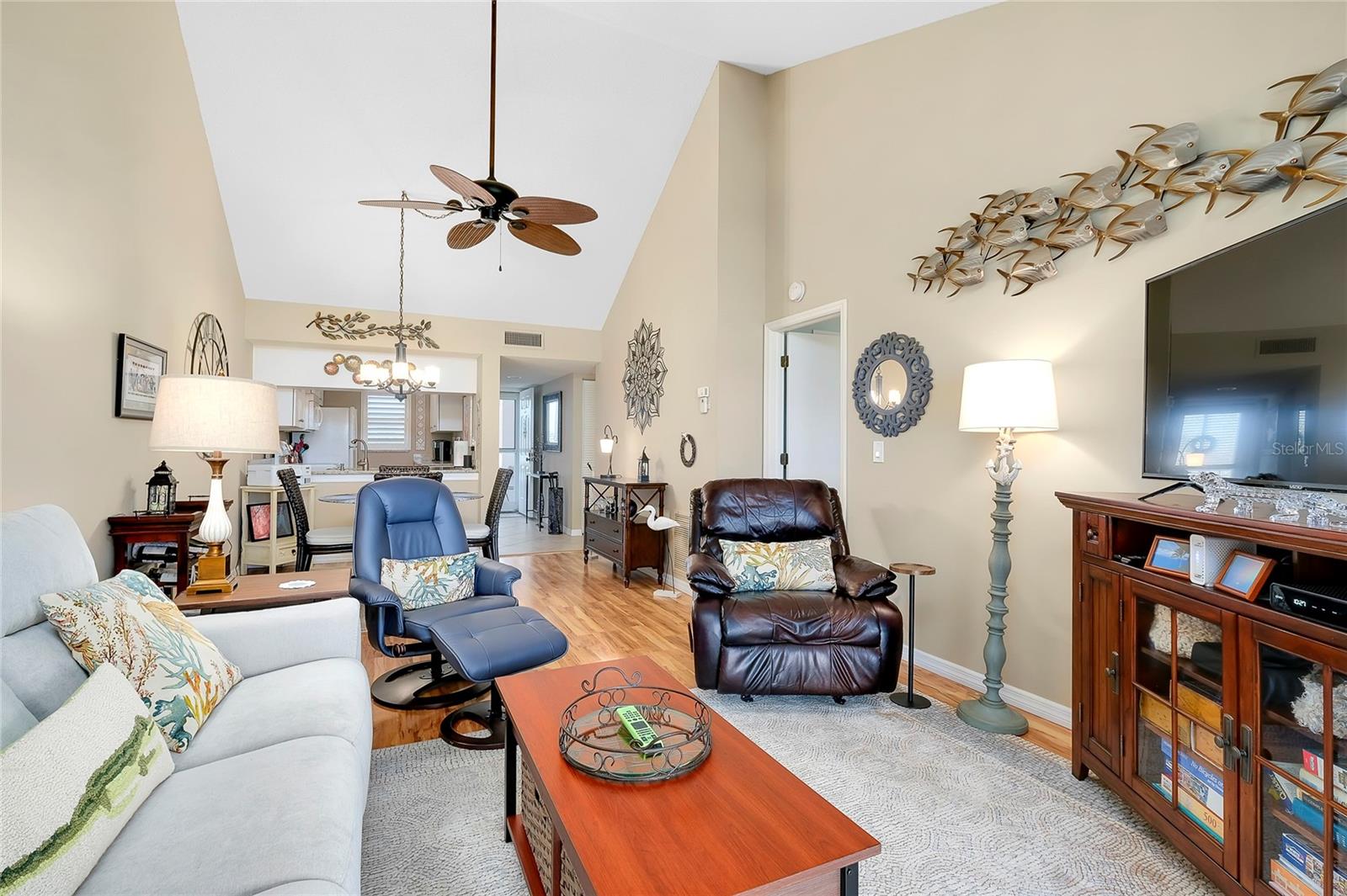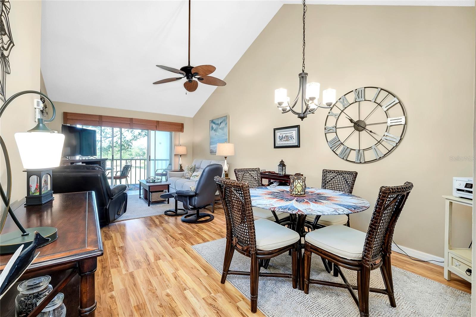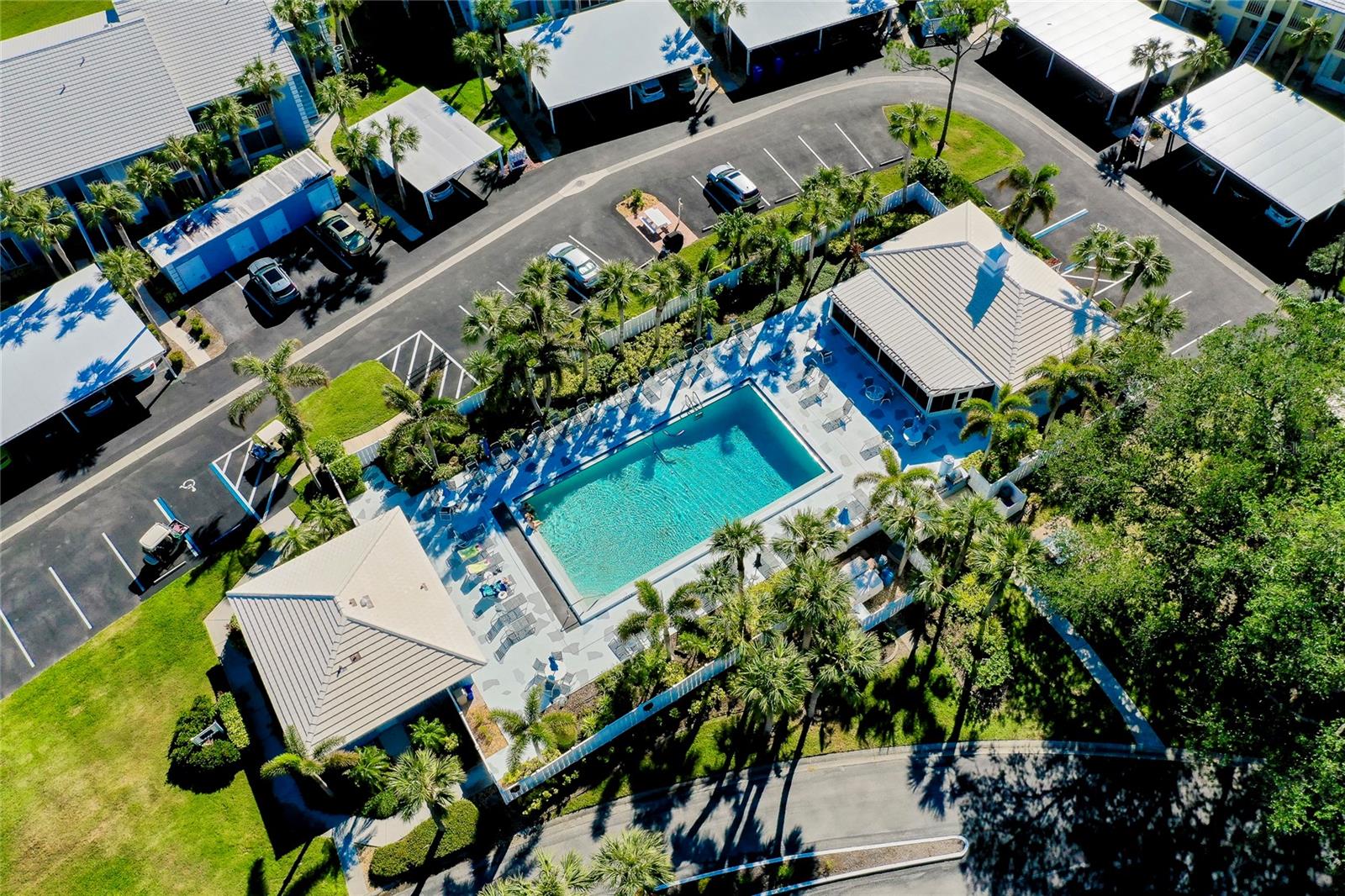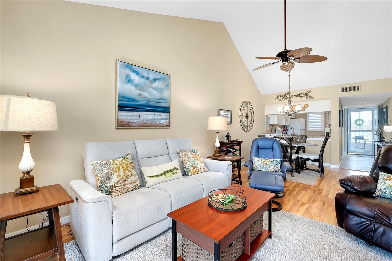 Whether a seasonal retreat or a full-time residence, this tasteful and meticulous home is a delight for the senses and spirit. Located on the 3rd level (with stairs or elevator access) you’ll feel “on top of the world” with expansive views front and back and yet grounded in a lovely well-groomed established community among tropical plantings. The residential buildings all have brand new (2024) metal tile roofs! The home’s palette and décor boast a tasteful combo of easy-living seaside with traditional styling. Enter from the tiled foyer to the main living area with cathedral ceilings where dining and living areas are open to one another creating a feeling of spaciousness yet connection. Wood-look laminate flooring in the dining and living areas complement the tones of the tile floors in the entry foyer, kitchen and baths. The kitchen features easy-clean cabinetry with easy-close doors and granite counter tops. A plantation-shuttered window allows both light and privacy. The primary bedroom has a private en suite bath featuring separate dual vanities with granite counter tops, an ample shower, a walk-in closet and a separate and convenient enclosed closet for the stack-able washer and dryer. Separation of bedrooms adds a level of privacy. The secondary bedroom is cozy and comfortable offering easy access to the second full bath. Sliders from the living room and primary bedroom access the rear covered lanai overlooking the lake with a view of the 5th green of the Bobcat course. With its westerly position, it’s a great place for a morning beverage, reading a good book in the afternoon or watching blazing sunsets. The lanai also features the bonus of having a full set of both “interior” and “exterior” sliders providing the option to easily enclose the area to create a delightful living area in any season, weather or temperature. The detached carport with parking for one vehicle has an attached locking storage room. There is plenty of additional parking very nearby. All this, and with one of the best locations within the Farmington Vistas complex, set back with a westerly rear view, and yet convenient and just steps away to the easterly positioned clubhouse and pool and outside grills amid mature tropical landscaping. The master Plantation community is a wonderful place to enjoy the Florida lifestyle. Membership to Plantation Golf and Country Club is optional and offers additional amenities including two 18-hole golf courses, clubhouse with a restaurant, fitness room, tennis, bocce and pickle ball courts, and a large community pool. All of this located close to some of the Gulf coast’s most beautiful beaches, historic downtown Venice with cultural and art centers, shopping, dining, parks and recreation areas.