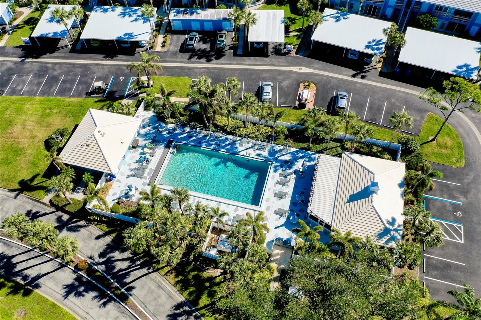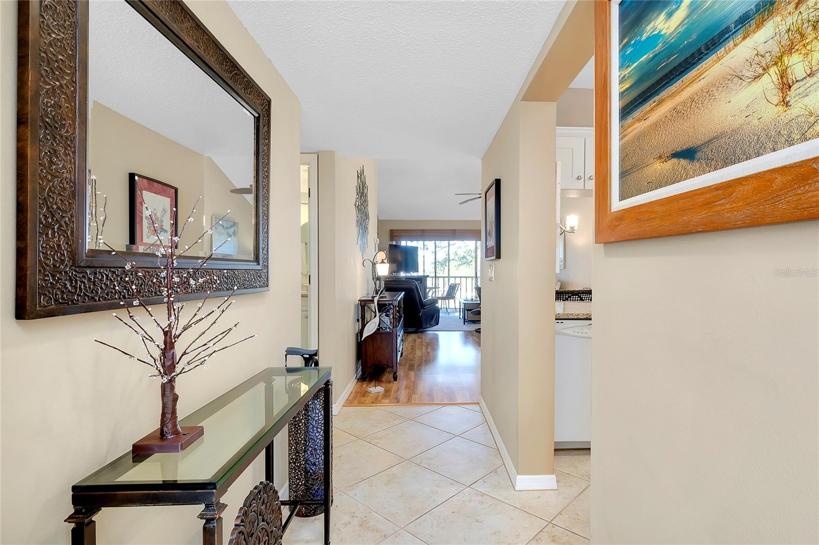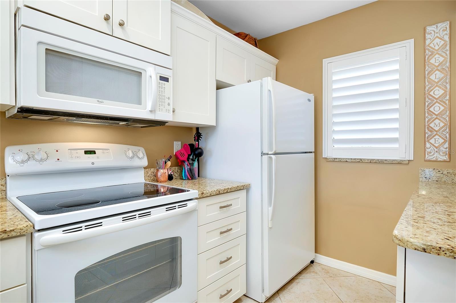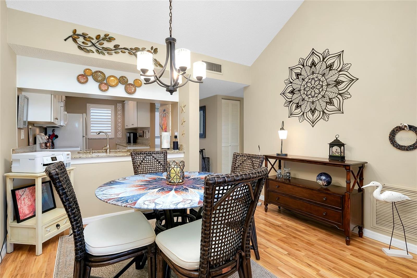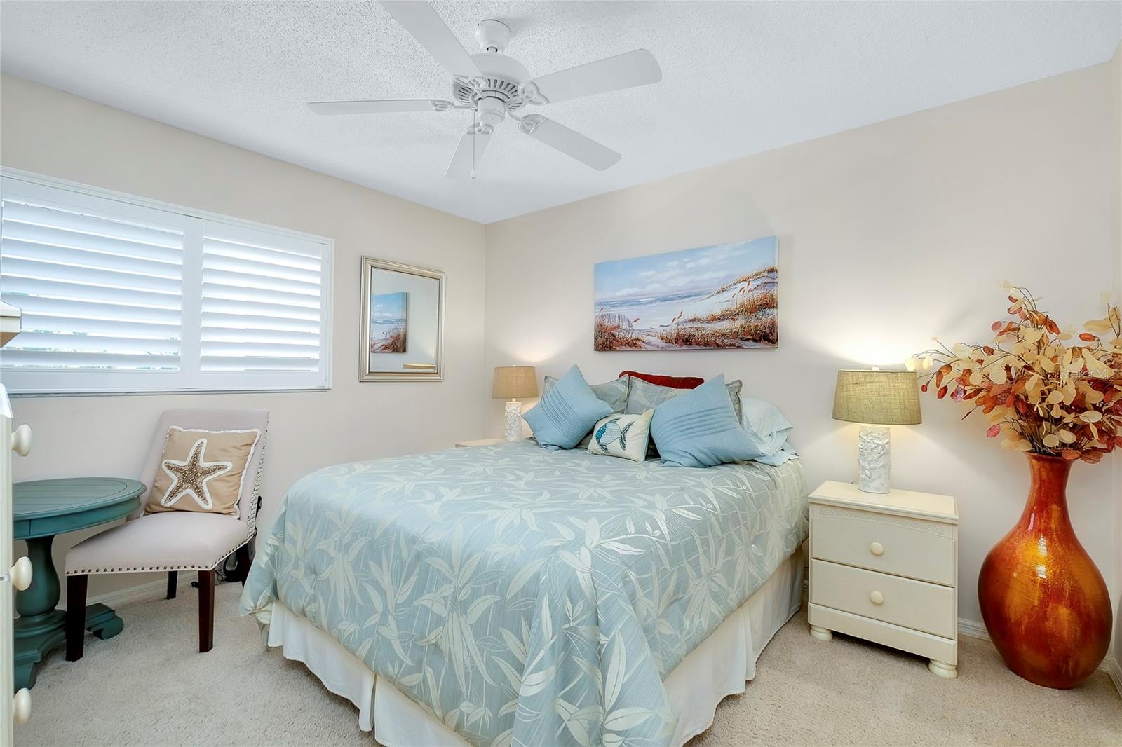Whether a seasonal retreat or a full-time residence, this tasteful and meticulous home is a delight for the senses and spirit. Located on the 3rd level (with stairs or elevator access) you’ll feel “on top of the world” with expansive views front and back and yet grounded in a lovely well-groomed established community among tropical plantings. The residential buildings all have brand new (2024) metal tile roofs! The home’s palette and décor boast a tasteful combo of easy-living seaside with traditional styling. Enter from the tiled foyer to the main living area with cathedral ceilings where dining and living areas are open to one another creating a feeling of spaciousness yet connection. Wood-look laminate flooring in the dining and living areas complement the tones of the tile floors in the entry foyer, kitchen and baths. The kitchen features easy-clean cabinetry with easy-close doors and granite counter tops. A plantation-shuttered window allows both light and privacy. The primary bedroom has a private en suite bath featuring separate dual vanities with granite counter tops, an ample shower, a walk-in closet and a separate and convenient enclosed closet for the stack-able washer and dryer. Separation of bedrooms adds a level of privacy. The secondary bedroom is cozy and comfortable offering easy access to the second full bath. Sliders from the living room and primary bedroom access the rear covered lanai overlooking the lake with a view of the 5th green of the Bobcat course. With its westerly position, it’s a great place for a morning beverage, reading a good book in the afternoon or watching blazing sunsets. The lanai also features the bonus of having a full set of both “interior” and “exterior” sliders providing the option to easily enclose the area to create a delightful living area in any season, weather or temperature. The detached carport with parking for one vehicle has an attached locking storage room. There is plenty of additional parking very nearby. All this, and with one of the best locations within the Farmington Vistas complex, set back with a westerly rear view, and yet convenient and just steps away to the easterly positioned clubhouse and pool and outside grills amid mature tropical landscaping. The master Plantation community is a wonderful place to enjoy the Florida lifestyle. Membership to Plantation Golf and Country Club is optional and offers additional amenities including two 18-hole golf courses, clubhouse with a restaurant, fitness room, tennis, bocce and pickle ball courts, and a large community pool. All of this located close to some of the Gulf coast’s most beautiful beaches, historic downtown Venice with cultural and art centers, shopping, dining, parks and recreation areas.