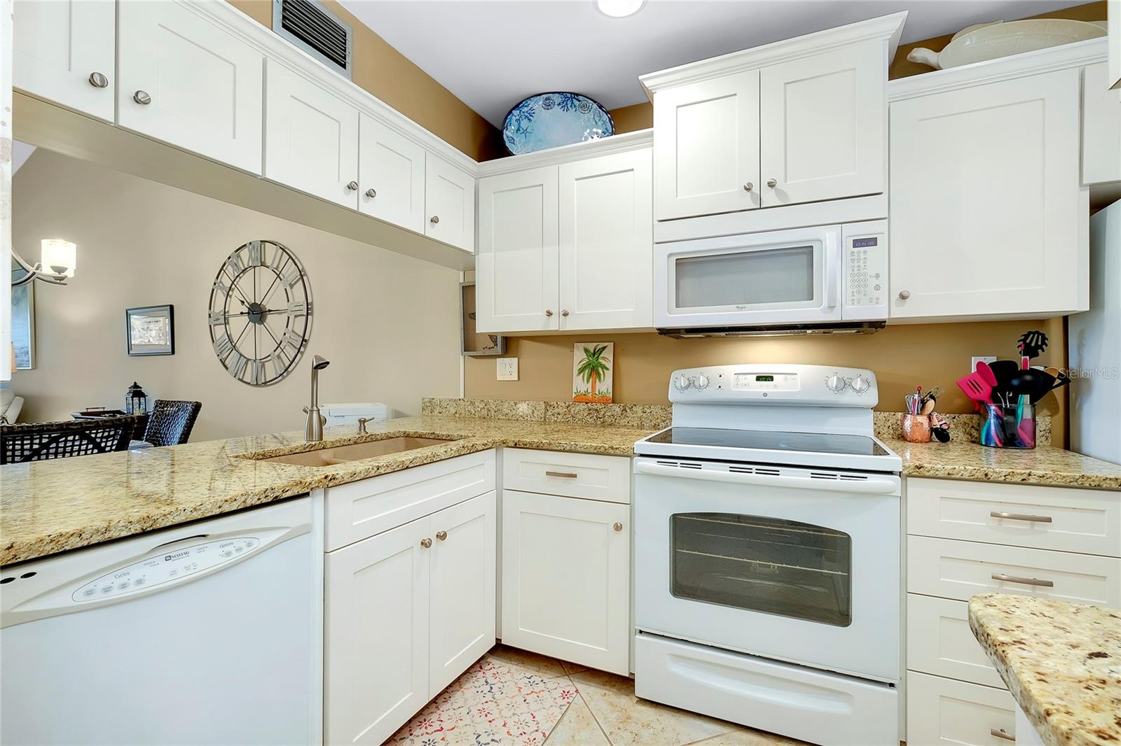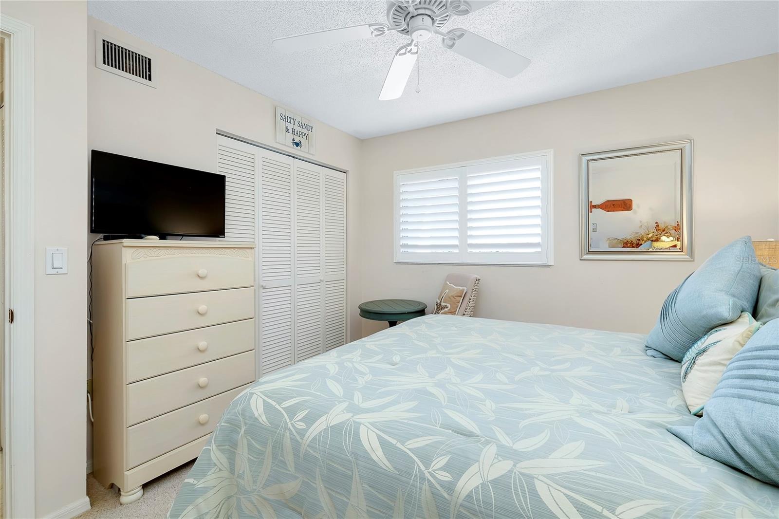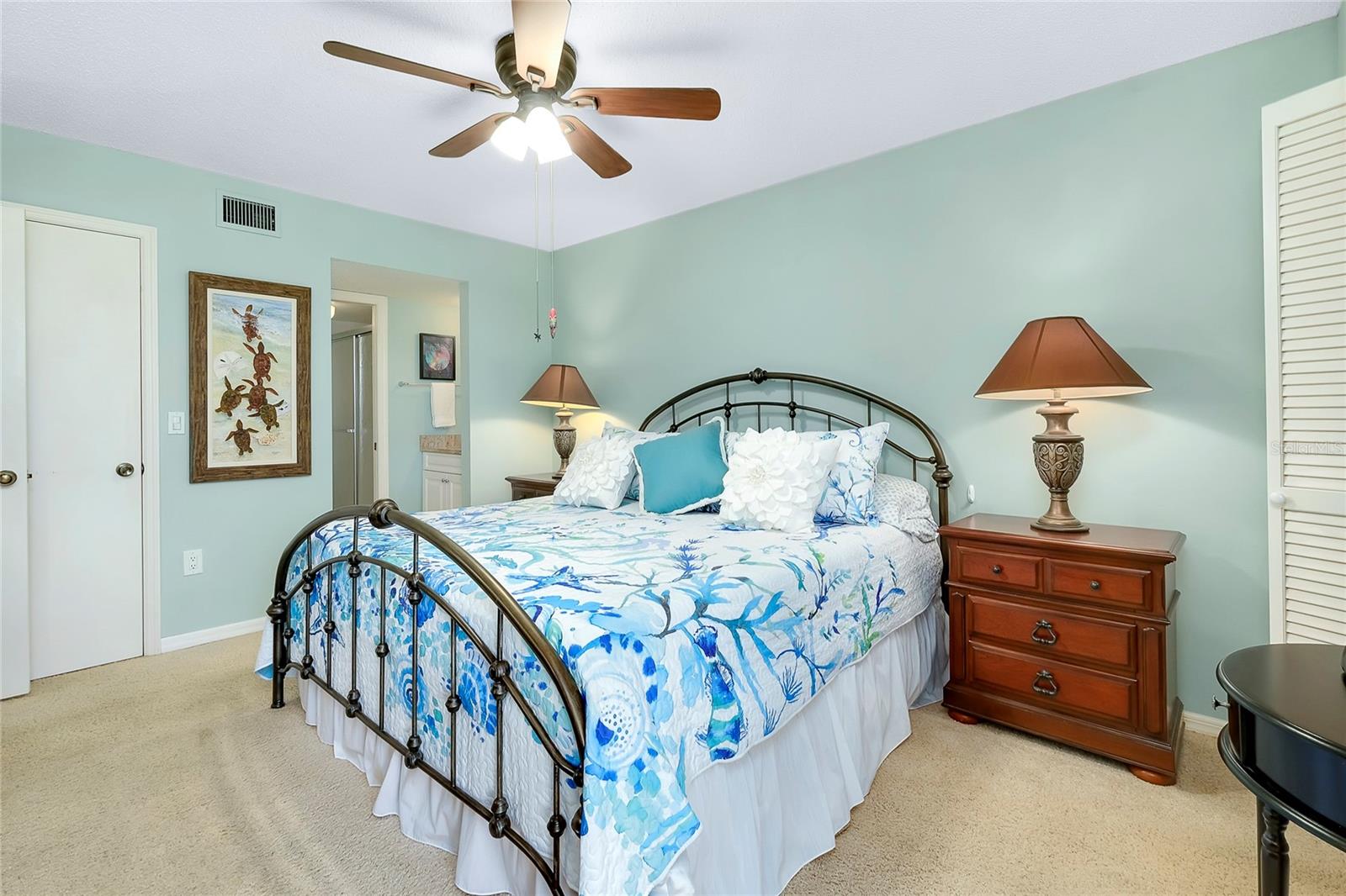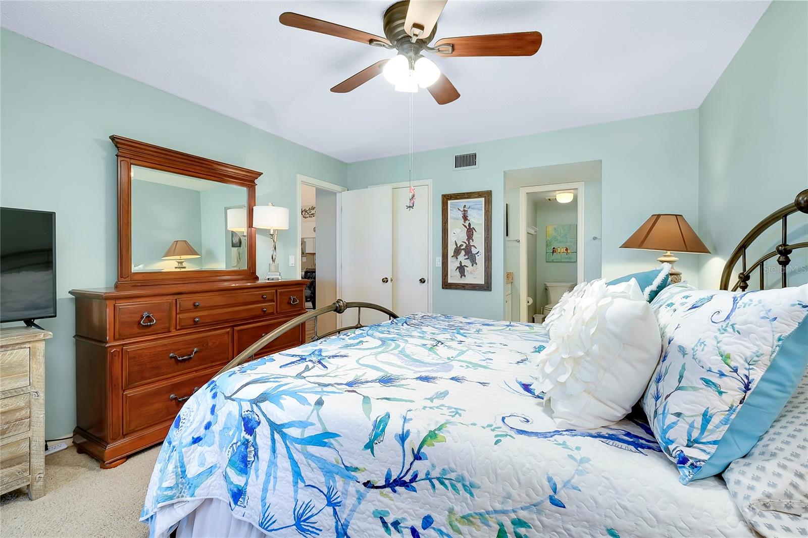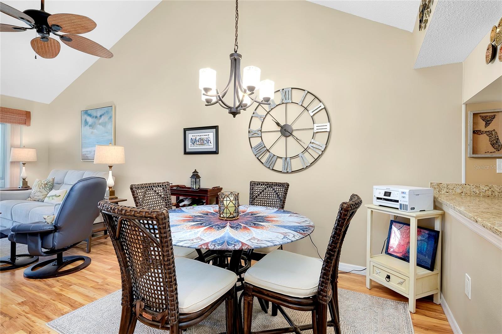 Whether a seasonal retreat or a full-time residence, this tasteful and meticulous home is a delight for the senses and spirit. Located on the 3rd level (with stairs or elevator access) you’ll feel “on top of the world” with expansive views front and back and yet grounded in a lovely well-groomed established community among tropical plantings. The residential buildings all have brand new (2024) metal tile roofs! The home’s palette and décor boast a tasteful combo of easy-living seaside with traditional styling. Enter from the tiled foyer to the main living area with cathedral ceilings where dining and living areas are open to one another creating a feeling of spaciousness yet connection. Wood-look laminate flooring in the dining and living areas complement the tones of the tile floors in the entry foyer, kitchen and baths. The kitchen features easy-clean cabinetry with easy-close doors and granite counter tops. A plantation-shuttered window allows both light and privacy. The primary bedroom has a private en suite bath featuring separate dual vanities with granite counter tops, an ample shower, a walk-in closet and a separate and convenient enclosed closet for the stack-able washer and dryer. Separation of bedrooms adds a level of privacy. The secondary bedroom is cozy and comfortable offering easy access to the second full bath. Sliders from the living room and primary bedroom access the rear covered lanai overlooking the lake with a view of the 5th green of the Bobcat course. With its westerly position, it’s a great place for a morning beverage, reading a good book in the afternoon or watching blazing sunsets. The lanai also features the bonus of having a full set of both “interior” and “exterior” sliders providing the option to easily enclose the area to create a delightful living area in any season, weather or temperature. The detached carport with parking for one vehicle has an attached locking storage room. There is plenty of additional parking very nearby. All this, and with one of the best locations within the Farmington Vistas complex, set back with a westerly rear view, and yet convenient and just steps away to the easterly positioned clubhouse and pool and outside grills amid mature tropical landscaping. The master Plantation community is a wonderful place to enjoy the Florida lifestyle. Membership to Plantation Golf and Country Club is optional and offers additional amenities including two 18-hole golf courses, clubhouse with a restaurant, fitness room, tennis, bocce and pickle ball courts, and a large community pool. All of this located close to some of the Gulf coast’s most beautiful beaches, historic downtown Venice with cultural and art centers, shopping, dining, parks and recreation areas.