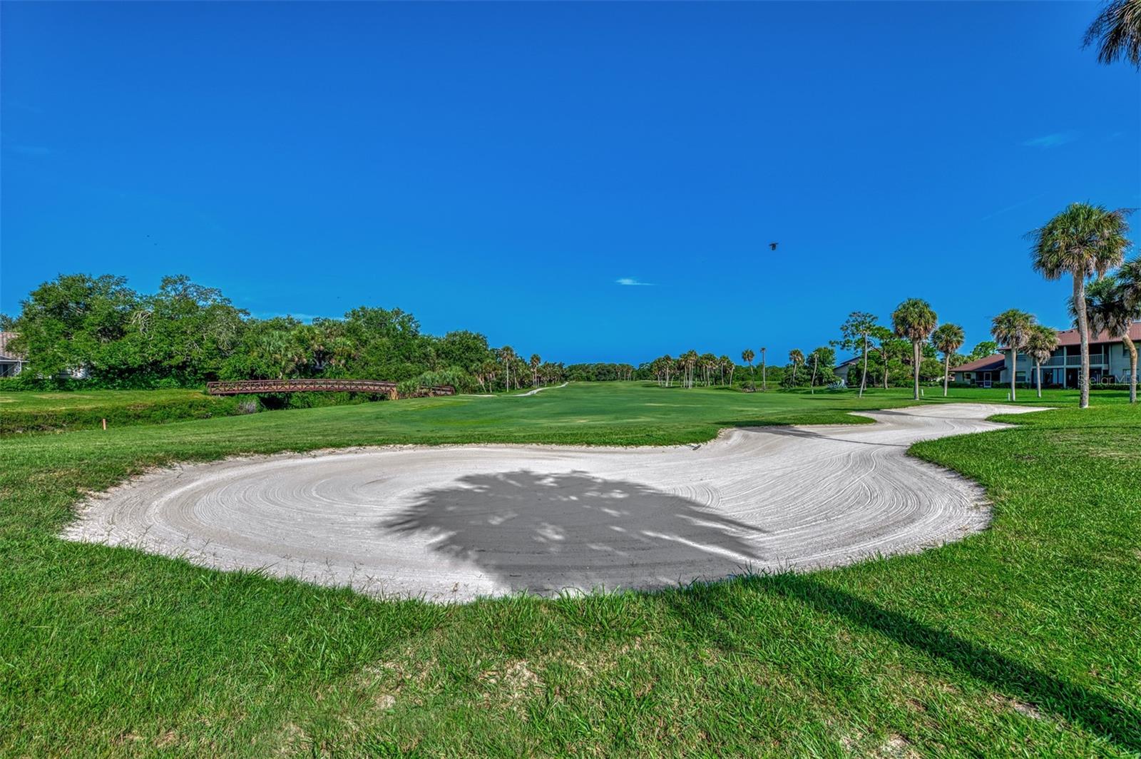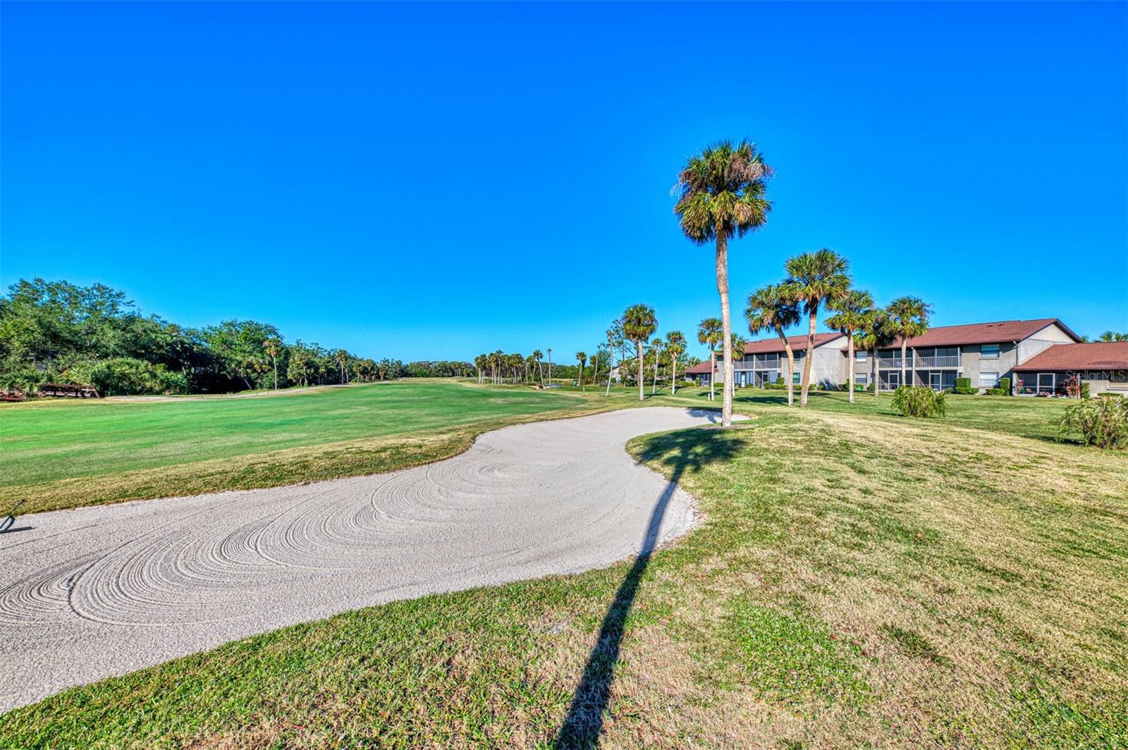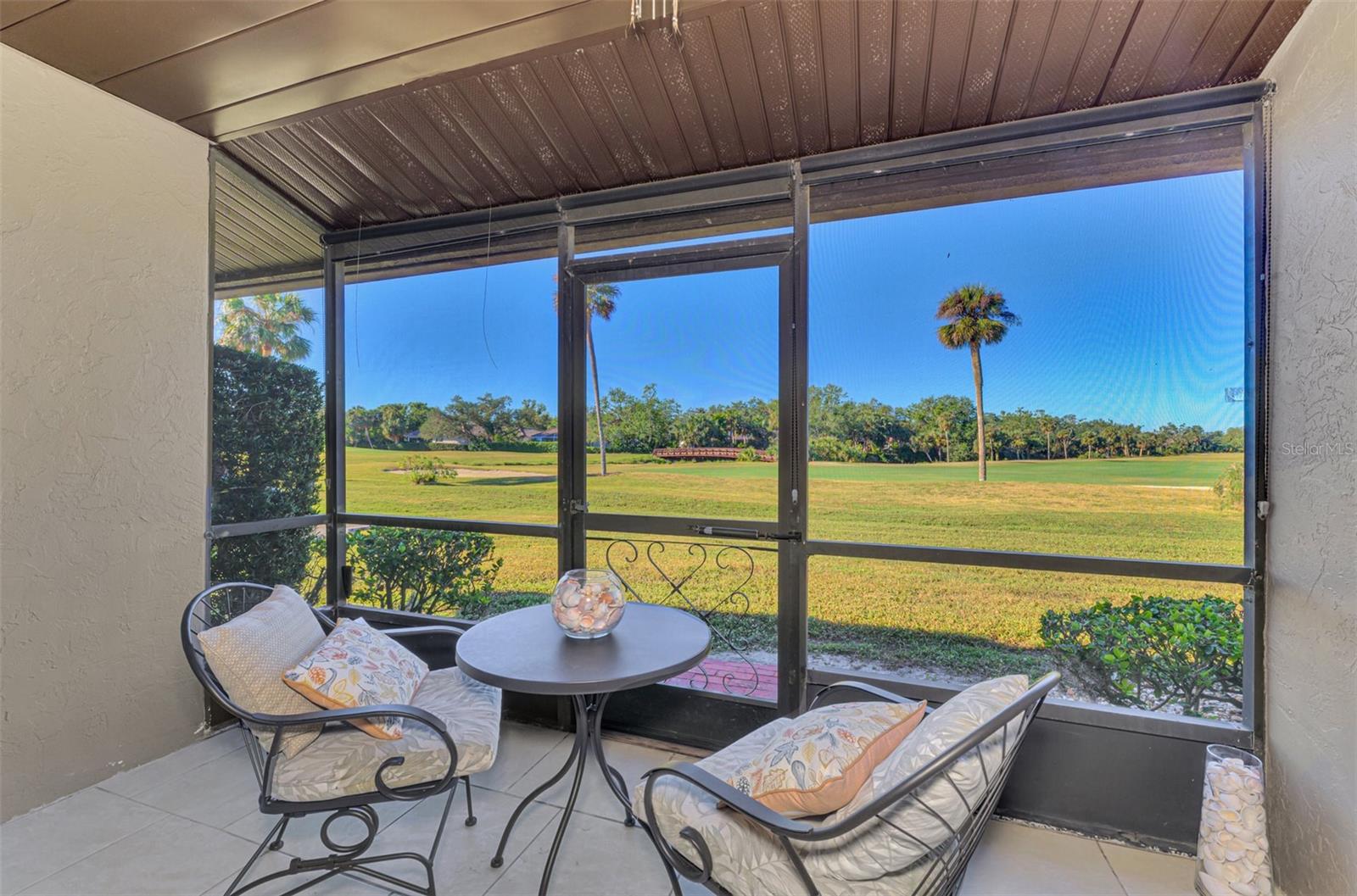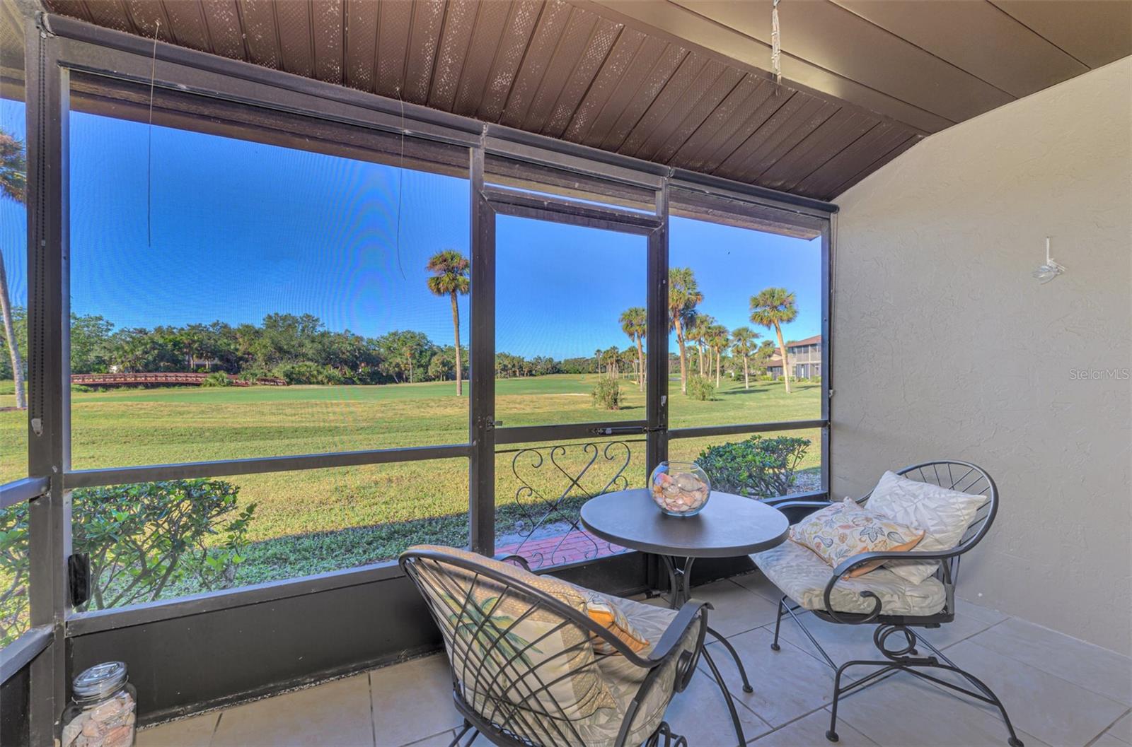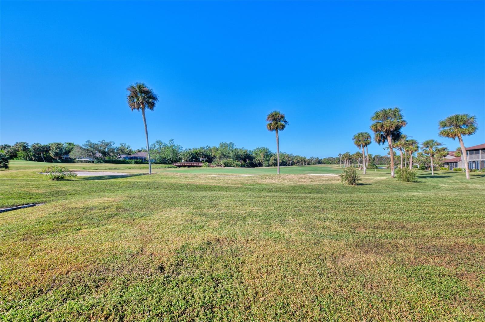 Highly sought after Capri Isles leads you to this amazing end unit "villa" with no neighbors above or below you! This wonderful condo features sweeping views of the 18th fairway of Capri Isles Golf Course. Walking up to the front door, you will notice the private fenced in courtyard area which adds to the appeal of this residence. Inside you will find an open floor plan, cathedral ceiling and a pleasant neutral decor. Tumbled ceramic tile floors through much of the condo laid on the diagonal and the bedrooms feature new carpets. An appealing kitchen with nice workspace on the granite counters, plenty of cabinet space and comes with appliances. Open living room features cathedral ceilings and flows with the dining room for easy entertaining. A real plus is the condo has PGT hurricane windows and slider! Off the living room, the slider leads out to the wonderful lanai to watch the golfers. The primary bedroom features a walk in closet, bathroom with a new double vanity. The secondary bedroom is also spacious. The second bath also features a new vanity! Washer and dryer inside the condo, good storage space with the private storage area. The reasonable condo fee includes water and cable! Par Four has social events if you wish to participate and a nice clubhouse and heated pool. The location is amazing with easy access to pristine beaches, renowned dining establishments, shopping centers and close to Sarasota Memorial. Whether you are an avid golfer, nature enthusiast or simply seeking a tranquil haven to call home, this condo will appeal to you!