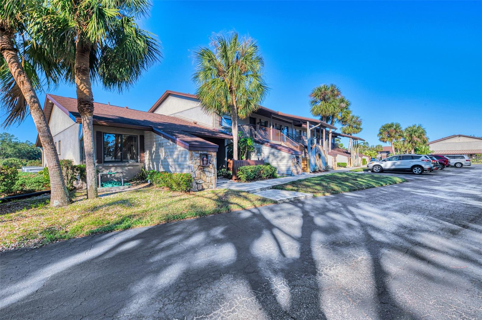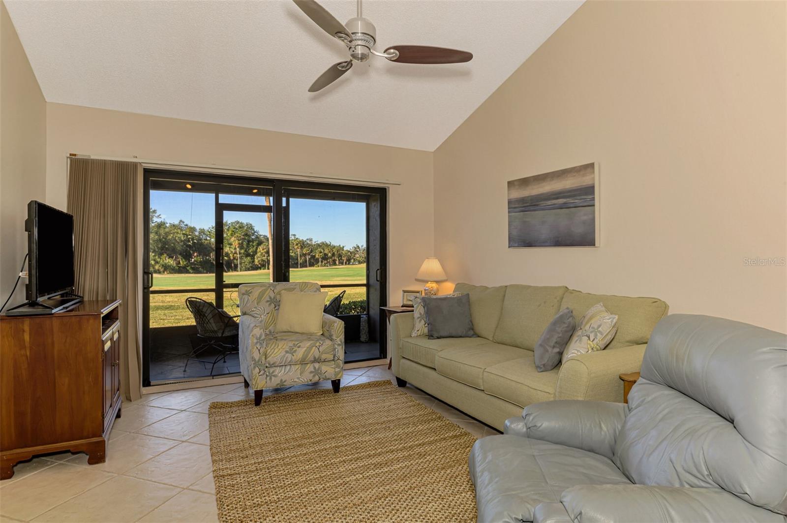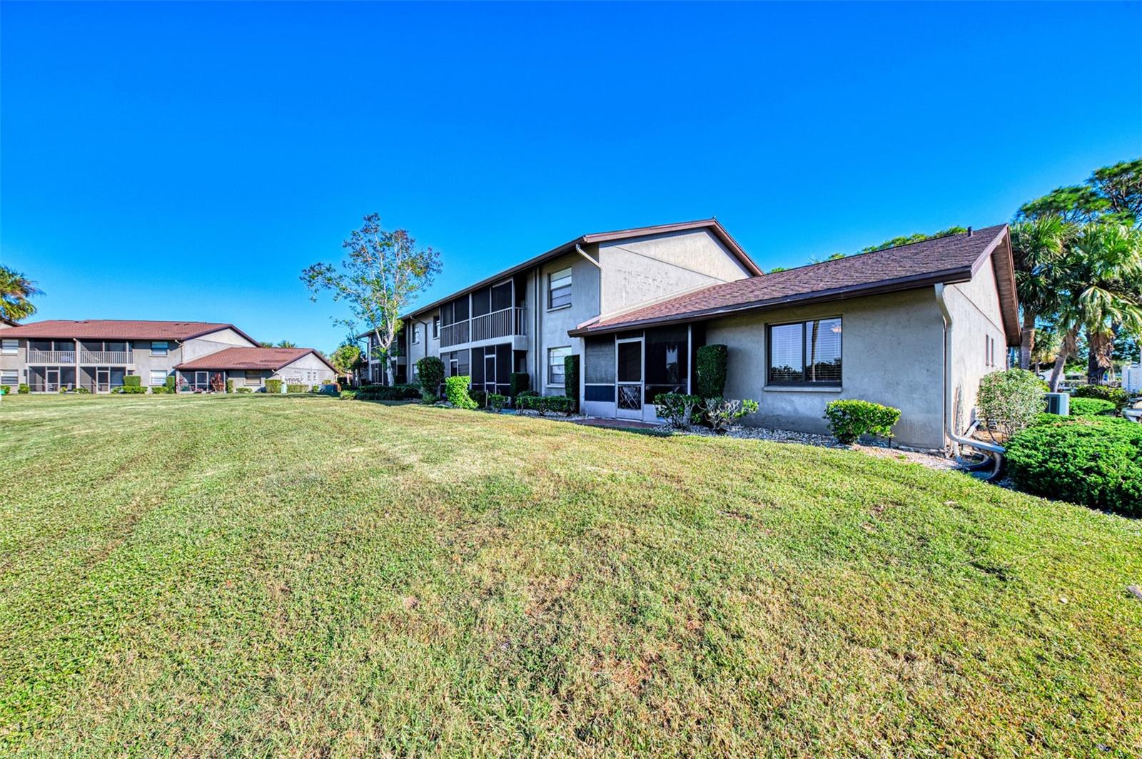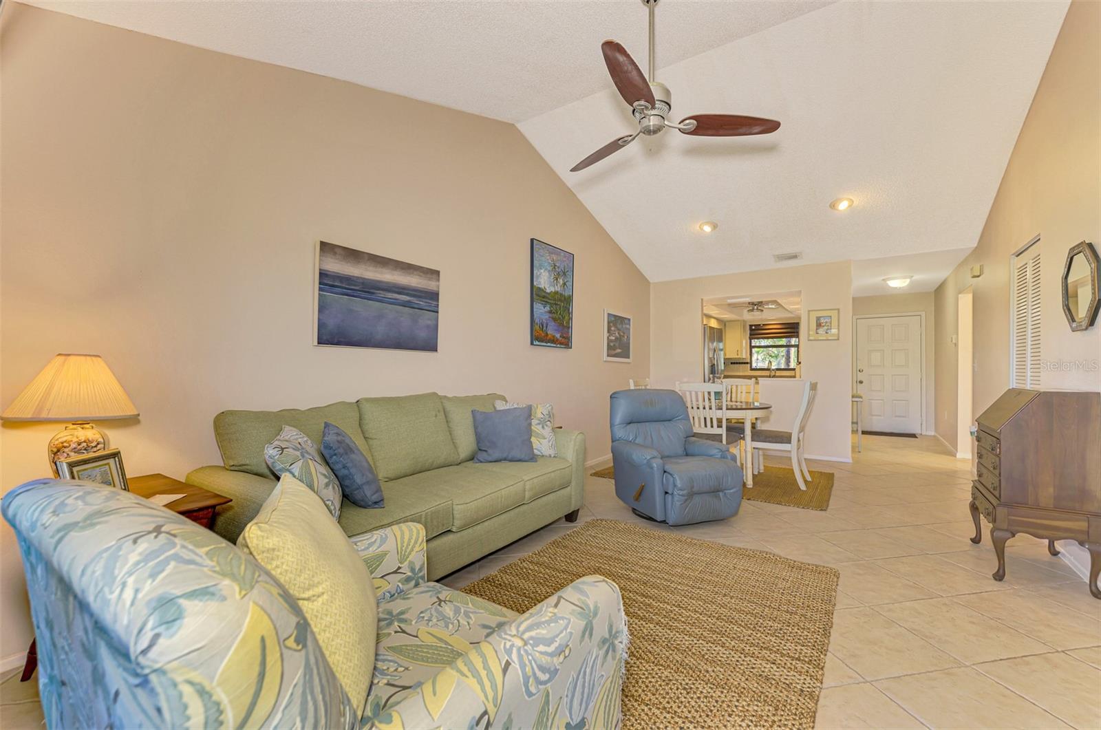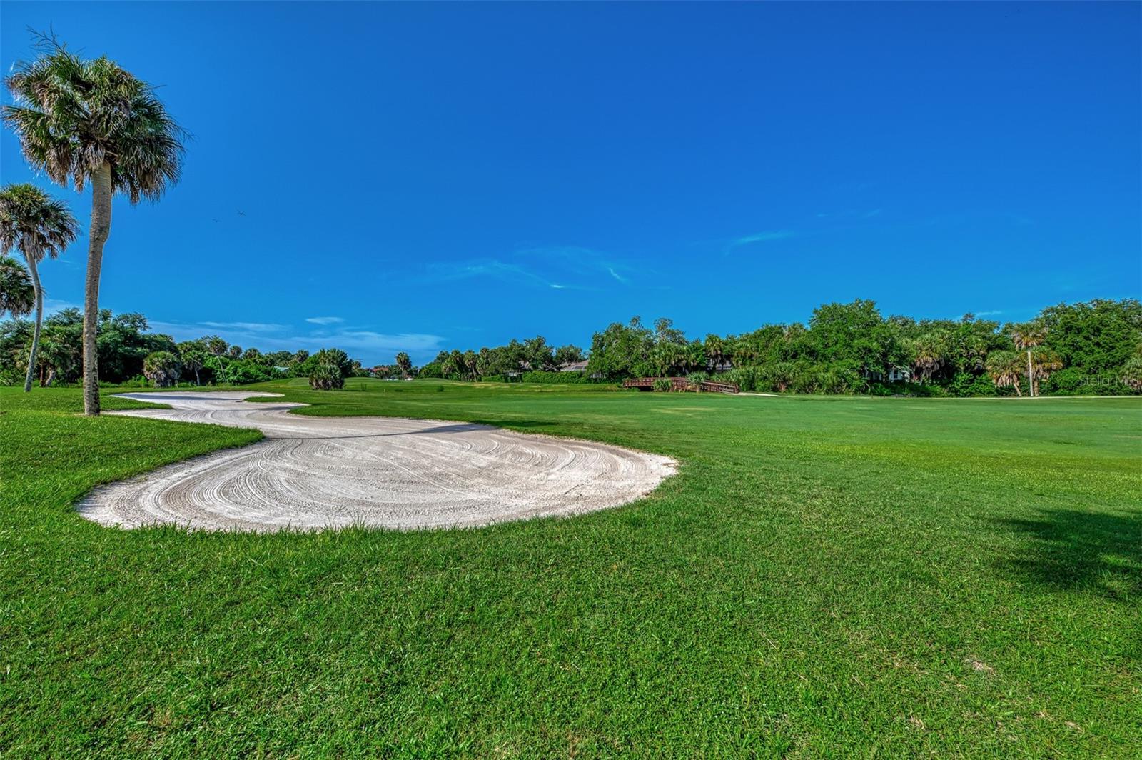 Highly sought after Capri Isles leads you to this amazing end unit "villa" with no neighbors above or below you! This wonderful condo features sweeping views of the 18th fairway of Capri Isles Golf Course. Walking up to the front door, you will notice the private fenced in courtyard area which adds to the appeal of this residence. Inside you will find an open floor plan, cathedral ceiling and a pleasant neutral decor. Tumbled ceramic tile floors through much of the condo laid on the diagonal and the bedrooms feature new carpets. An appealing kitchen with nice workspace on the granite counters, plenty of cabinet space and comes with appliances. Open living room features cathedral ceilings and flows with the dining room for easy entertaining. A real plus is the condo has PGT hurricane windows and slider! Off the living room, the slider leads out to the wonderful lanai to watch the golfers. The primary bedroom features a walk in closet, bathroom with a new double vanity. The secondary bedroom is also spacious. The second bath also features a new vanity! Washer and dryer inside the condo, good storage space with the private storage area. The reasonable condo fee includes water and cable! Par Four has social events if you wish to participate and a nice clubhouse and heated pool. The location is amazing with easy access to pristine beaches, renowned dining establishments, shopping centers and close to Sarasota Memorial. Whether you are an avid golfer, nature enthusiast or simply seeking a tranquil haven to call home, this condo will appeal to you!