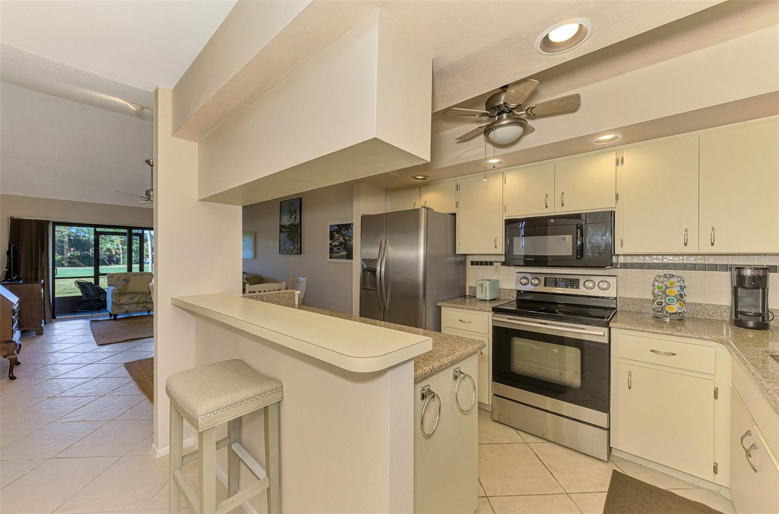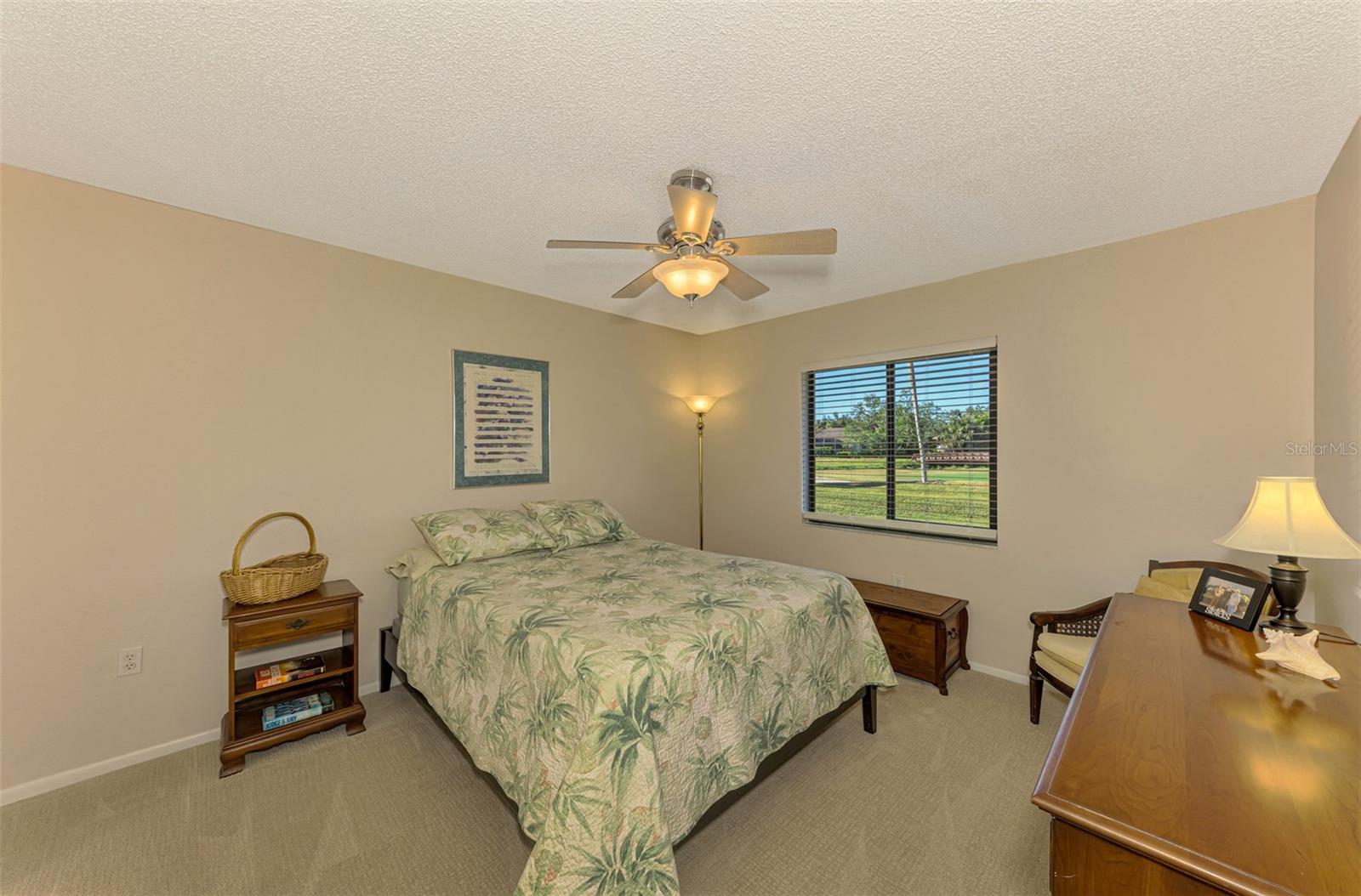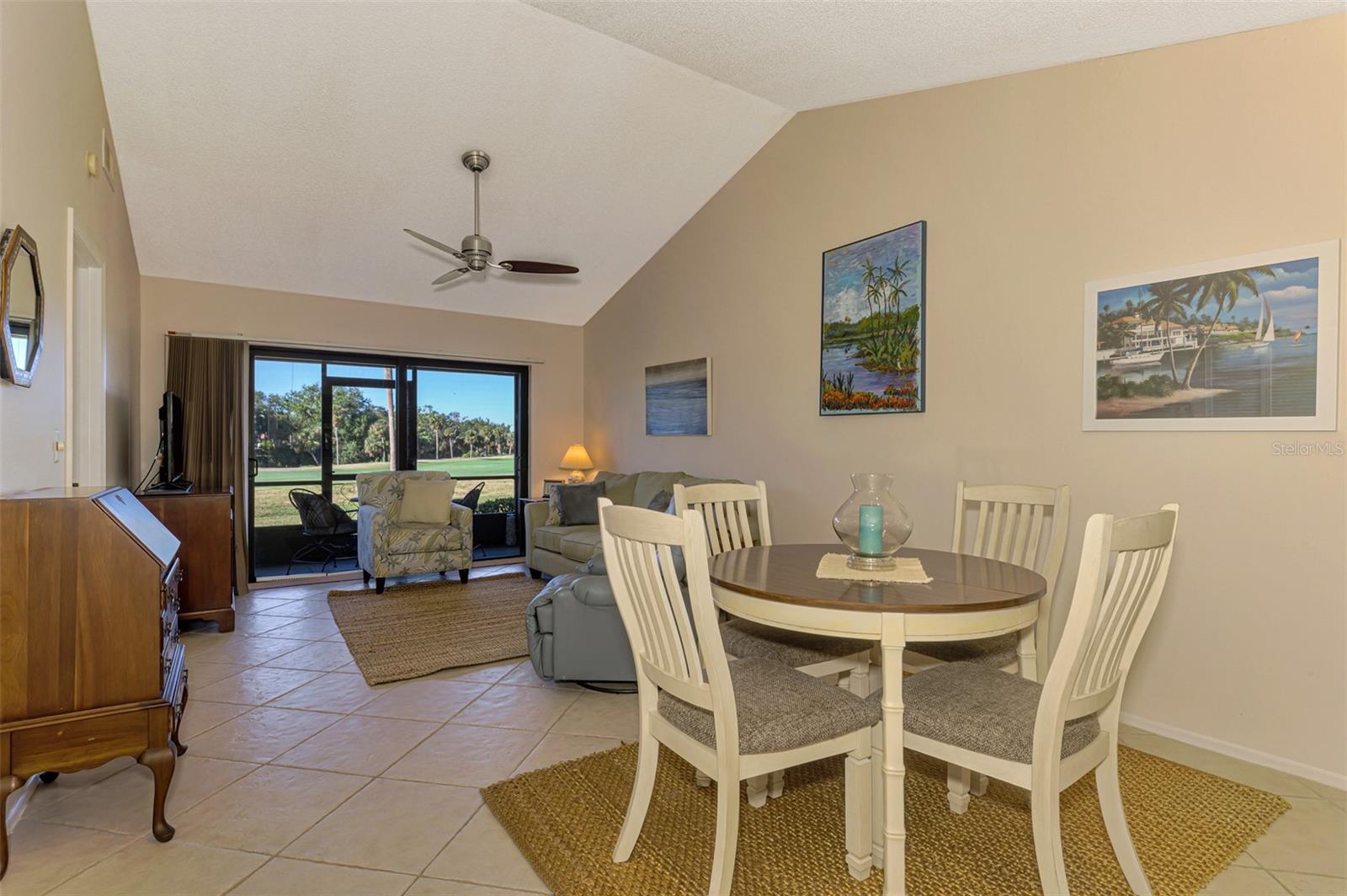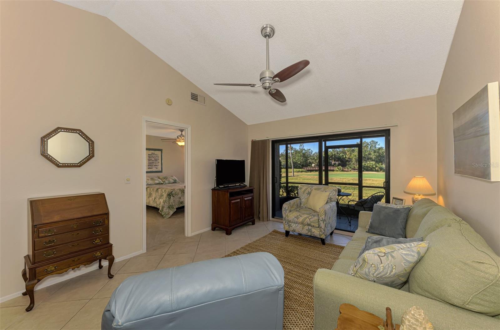 Highly sought after Capri Isles leads you to this amazing end unit "villa" with no neighbors above or below you! This wonderful condo features sweeping views of the 18th fairway of Capri Isles Golf Course. Walking up to the front door, you will notice the private fenced in courtyard area which adds to the appeal of this residence. Inside you will find an open floor plan, cathedral ceiling and a pleasant neutral decor. Tumbled ceramic tile floors through much of the condo laid on the diagonal and the bedrooms feature new carpets. An appealing kitchen with nice workspace on the granite counters, plenty of cabinet space and comes with appliances. Open living room features cathedral ceilings and flows with the dining room for easy entertaining. A real plus is the condo has PGT hurricane windows and slider! Off the living room, the slider leads out to the wonderful lanai to watch the golfers. The primary bedroom features a walk in closet, bathroom with a new double vanity. The secondary bedroom is also spacious. The second bath also features a new vanity! Washer and dryer inside the condo, good storage space with the private storage area. The reasonable condo fee includes water and cable! Par Four has social events if you wish to participate and a nice clubhouse and heated pool. The location is amazing with easy access to pristine beaches, renowned dining establishments, shopping centers and close to Sarasota Memorial. Whether you are an avid golfer, nature enthusiast or simply seeking a tranquil haven to call home, this condo will appeal to you!
