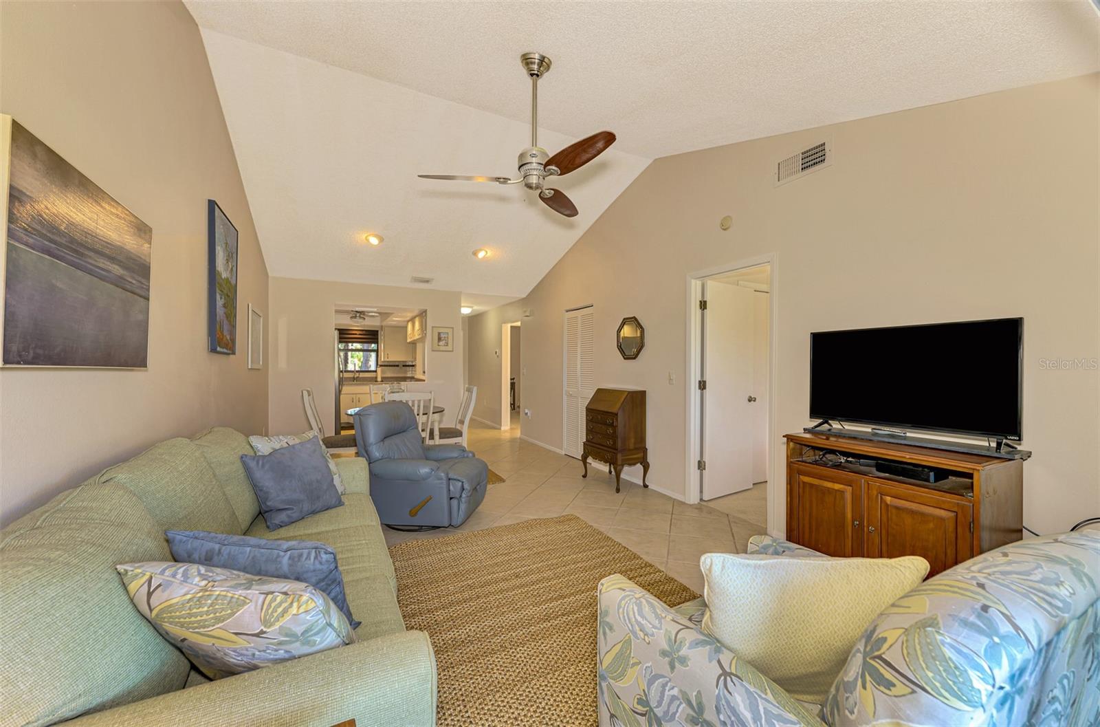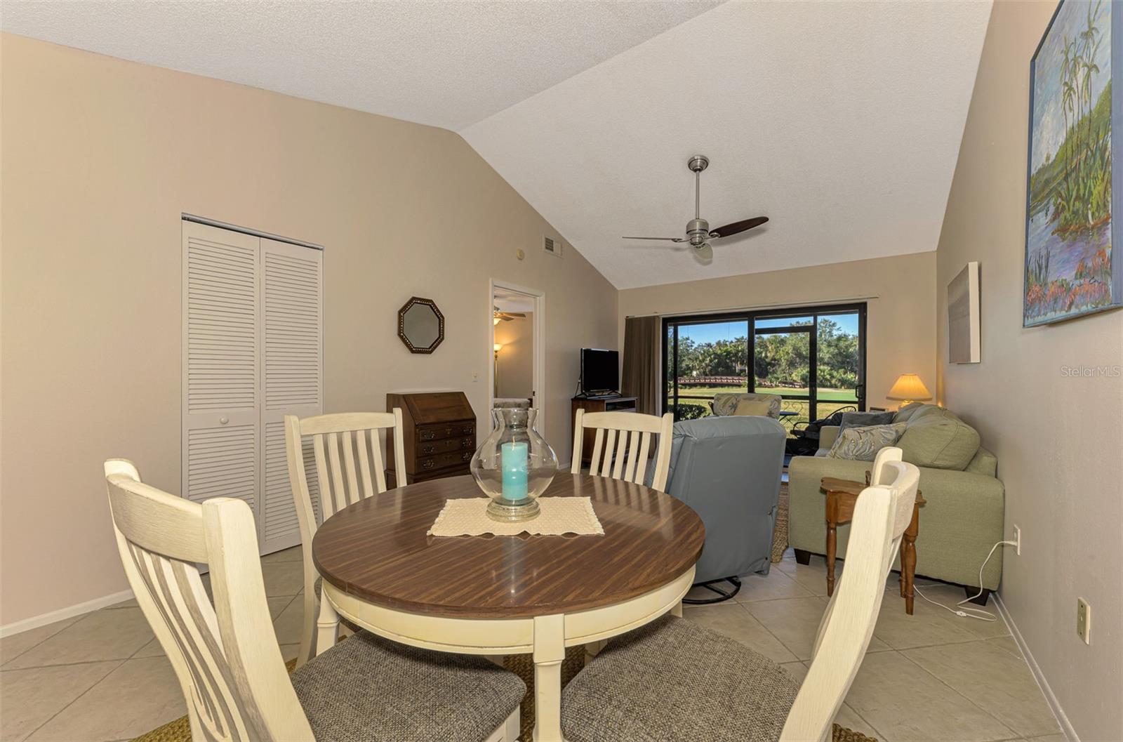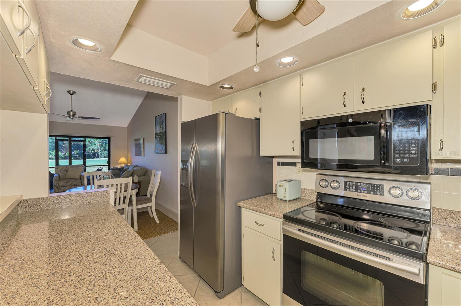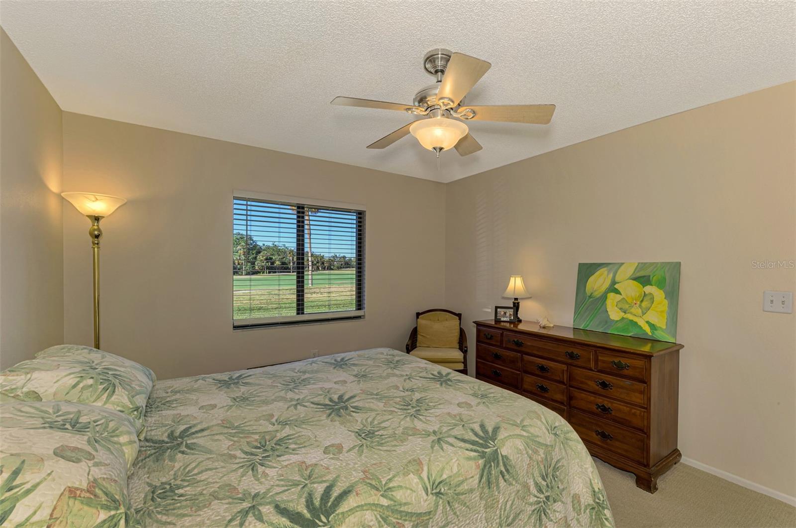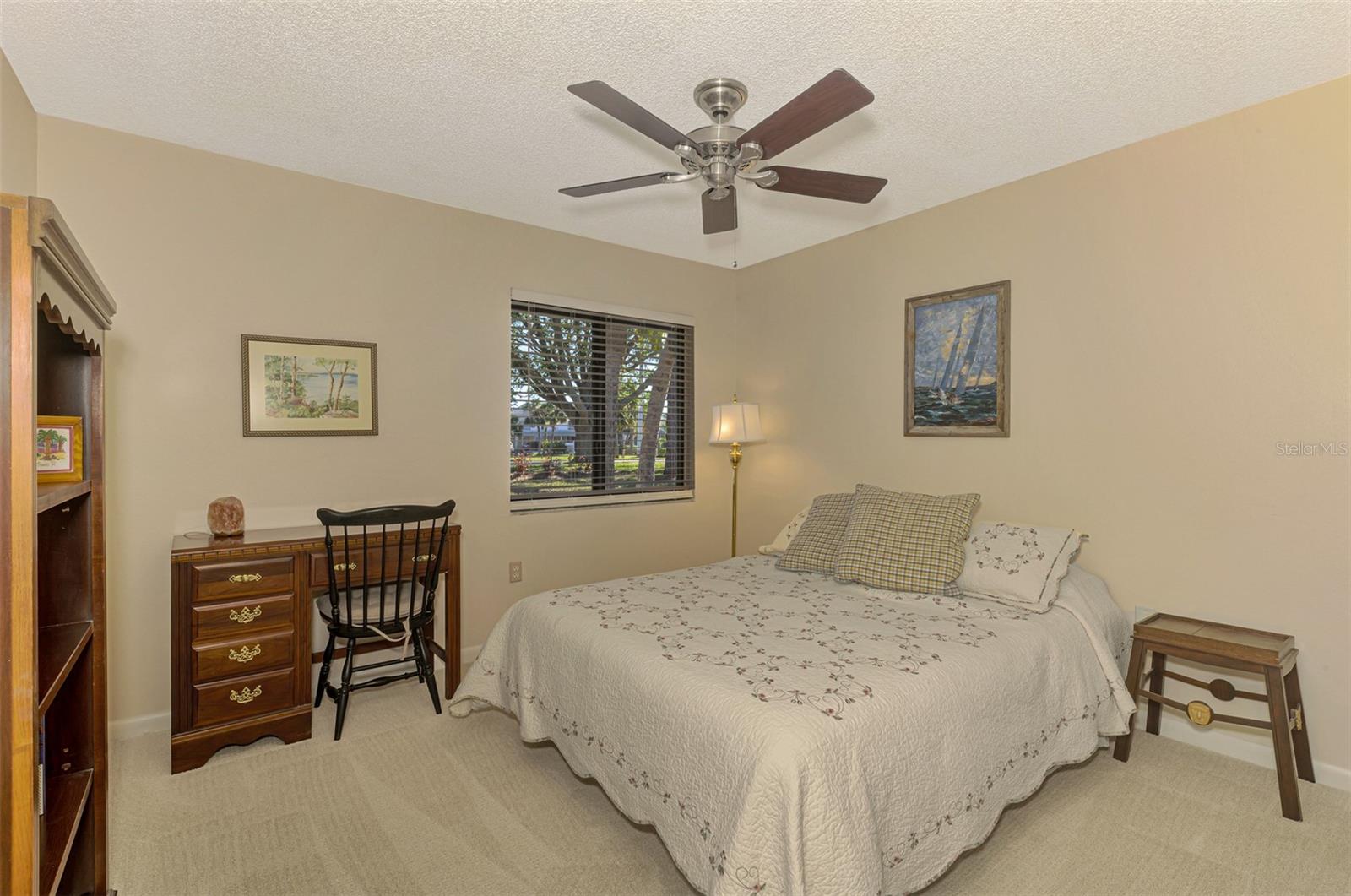 Highly sought after Capri Isles leads you to this amazing end unit "villa" with no neighbors above or below you! This wonderful condo features sweeping views of the 18th fairway of Capri Isles Golf Course. Walking up to the front door, you will notice the private fenced in courtyard area which adds to the appeal of this residence. Inside you will find an open floor plan, cathedral ceiling and a pleasant neutral decor. Tumbled ceramic tile floors through much of the condo laid on the diagonal and the bedrooms feature new carpets. An appealing kitchen with nice workspace on the granite counters, plenty of cabinet space and comes with appliances. Open living room features cathedral ceilings and flows with the dining room for easy entertaining. A real plus is the condo has PGT hurricane windows and slider! Off the living room, the slider leads out to the wonderful lanai to watch the golfers. The primary bedroom features a walk in closet, bathroom with a new double vanity. The secondary bedroom is also spacious. The second bath also features a new vanity! Washer and dryer inside the condo, good storage space with the private storage area. The reasonable condo fee includes water and cable! Par Four has social events if you wish to participate and a nice clubhouse and heated pool. The location is amazing with easy access to pristine beaches, renowned dining establishments, shopping centers and close to Sarasota Memorial. Whether you are an avid golfer, nature enthusiast or simply seeking a tranquil haven to call home, this condo will appeal to you!