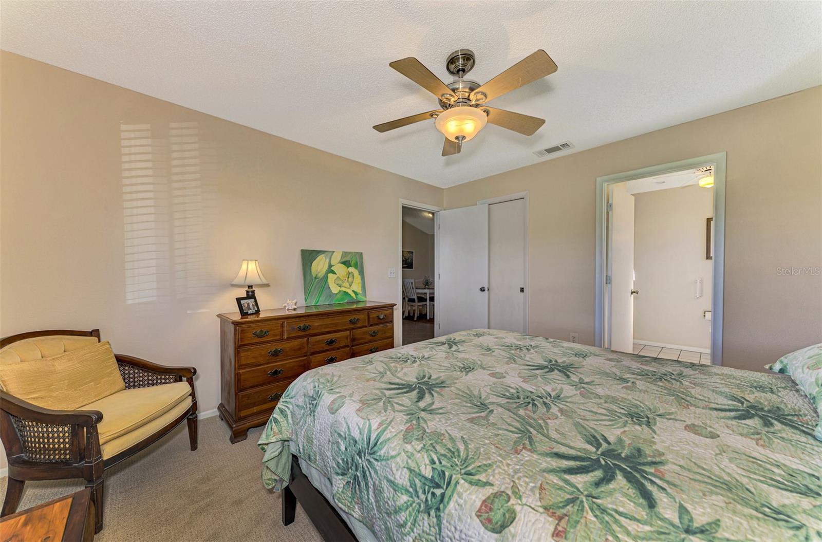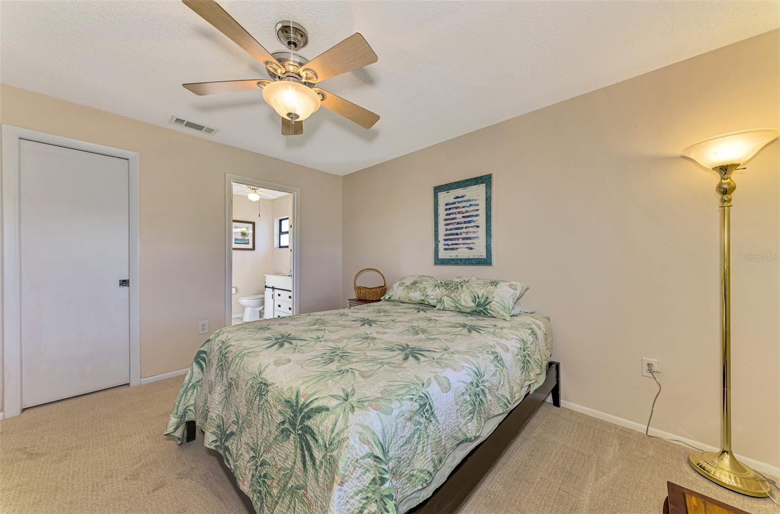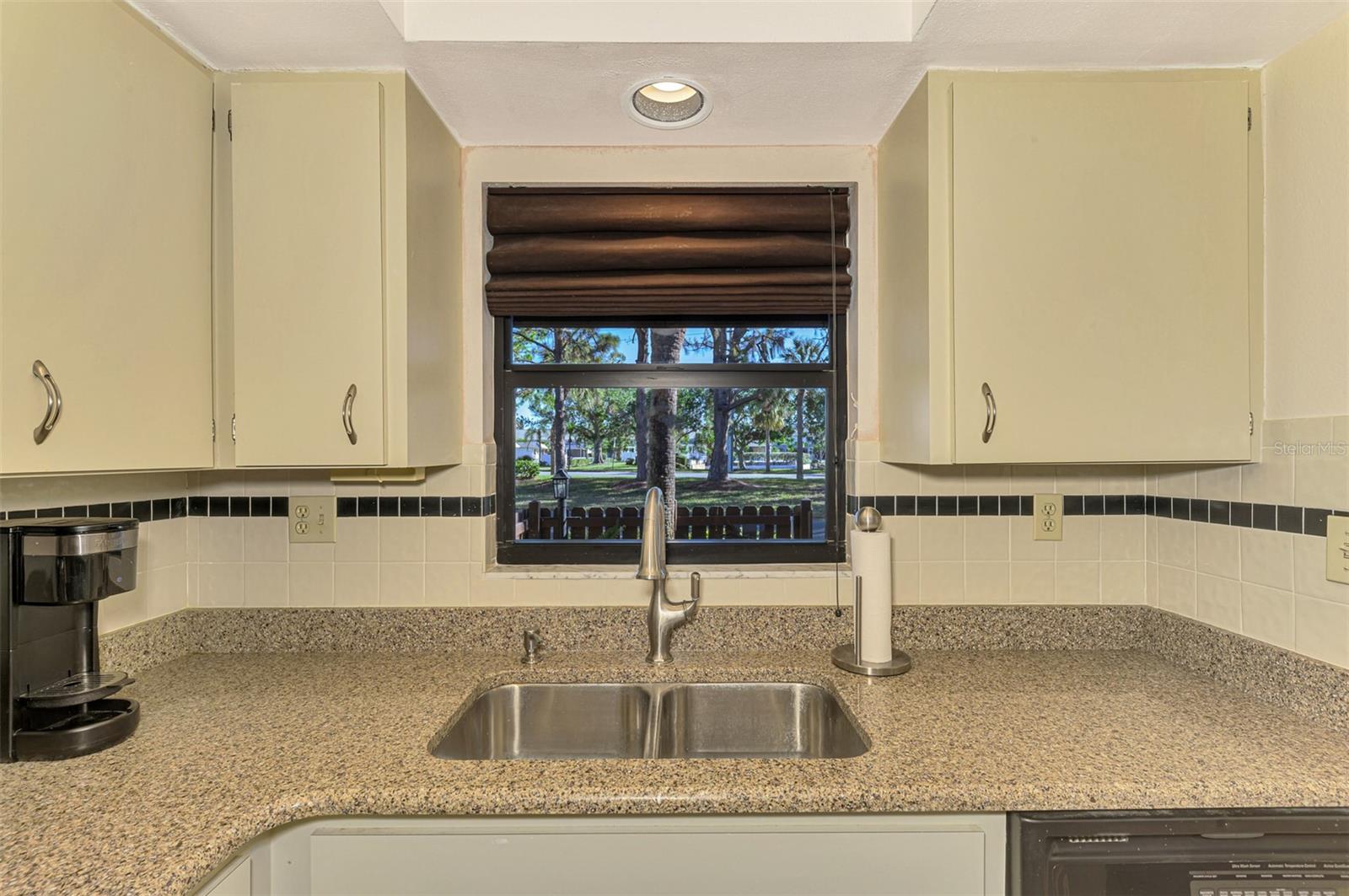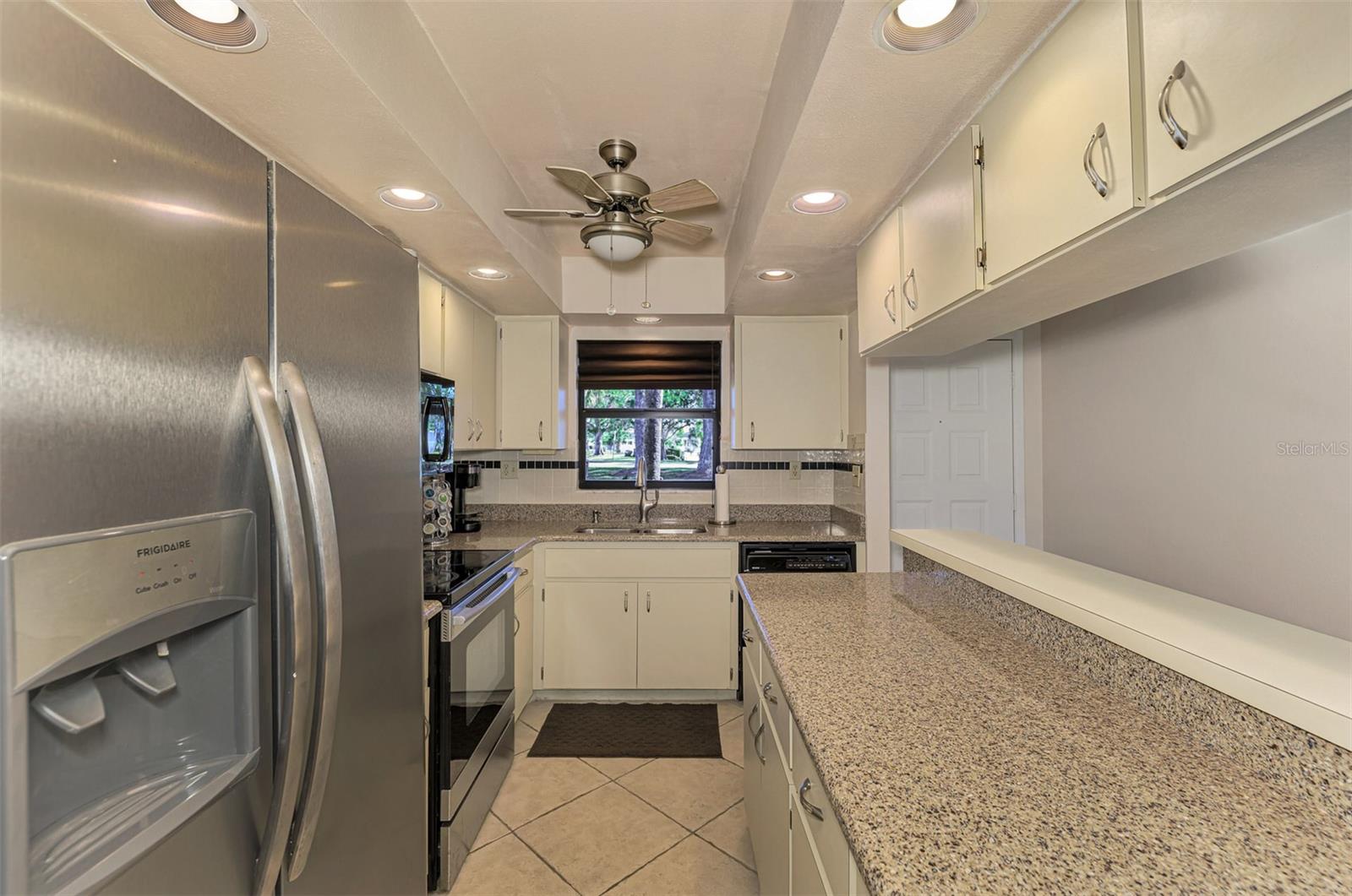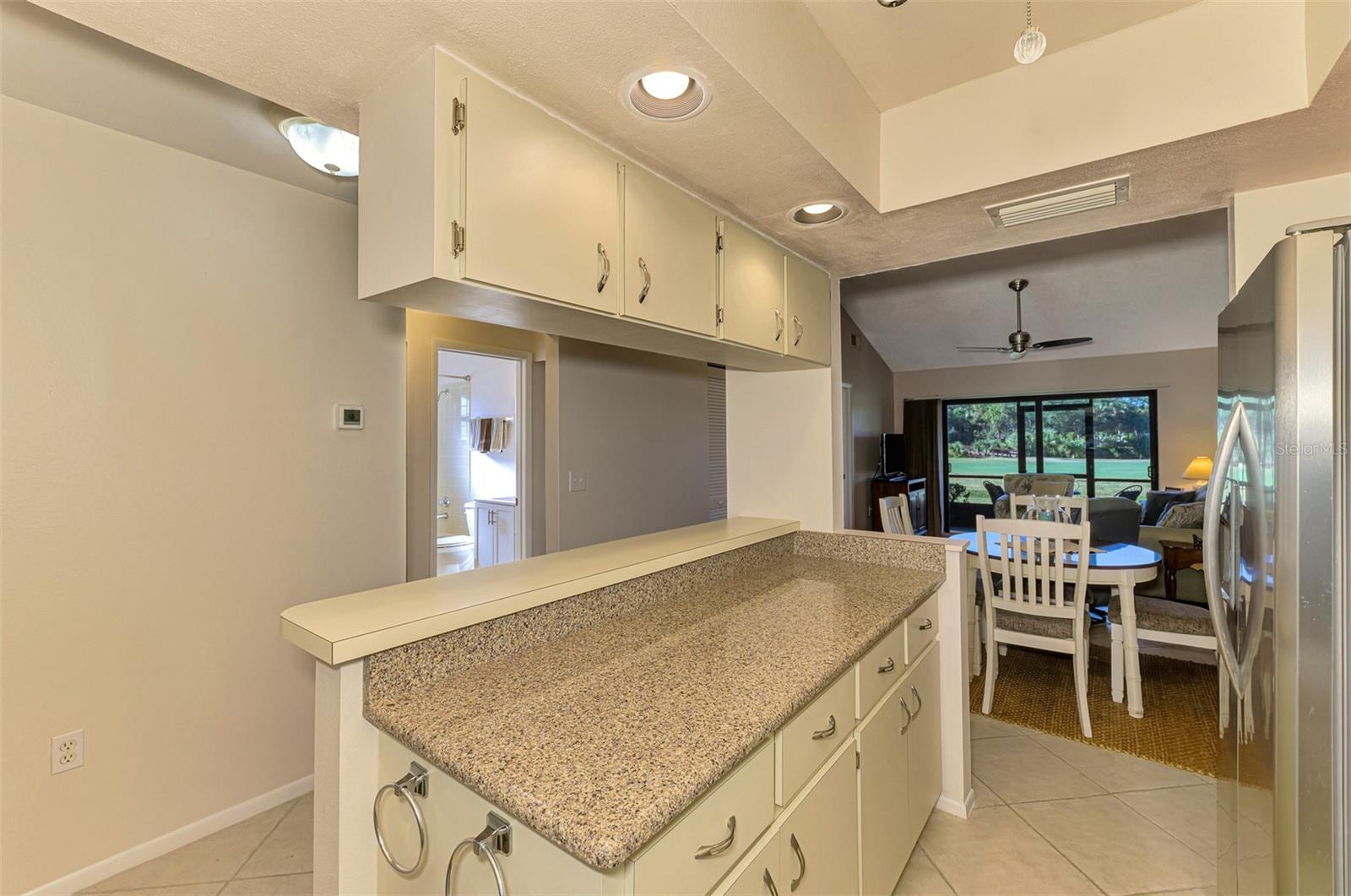 Highly sought after Capri Isles leads you to this amazing end unit "villa" with no neighbors above or below you! This wonderful condo features sweeping views of the 18th fairway of Capri Isles Golf Course. Walking up to the front door, you will notice the private fenced in courtyard area which adds to the appeal of this residence. Inside you will find an open floor plan, cathedral ceiling and a pleasant neutral decor. Tumbled ceramic tile floors through much of the condo laid on the diagonal and the bedrooms feature new carpets. An appealing kitchen with nice workspace on the granite counters, plenty of cabinet space and comes with appliances. Open living room features cathedral ceilings and flows with the dining room for easy entertaining. A real plus is the condo has PGT hurricane windows and slider! Off the living room, the slider leads out to the wonderful lanai to watch the golfers. The primary bedroom features a walk in closet, bathroom with a new double vanity. The secondary bedroom is also spacious. The second bath also features a new vanity! Washer and dryer inside the condo, good storage space with the private storage area. The reasonable condo fee includes water and cable! Par Four has social events if you wish to participate and a nice clubhouse and heated pool. The location is amazing with easy access to pristine beaches, renowned dining establishments, shopping centers and close to Sarasota Memorial. Whether you are an avid golfer, nature enthusiast or simply seeking a tranquil haven to call home, this condo will appeal to you!