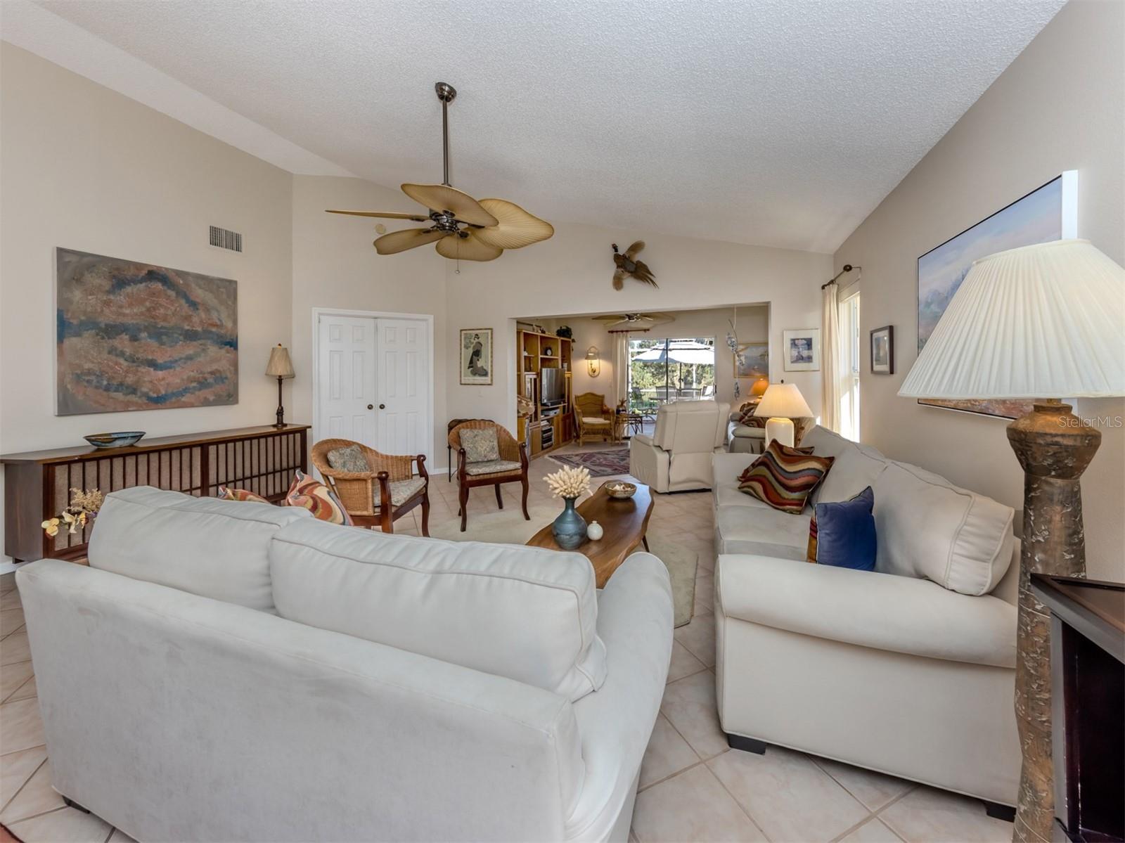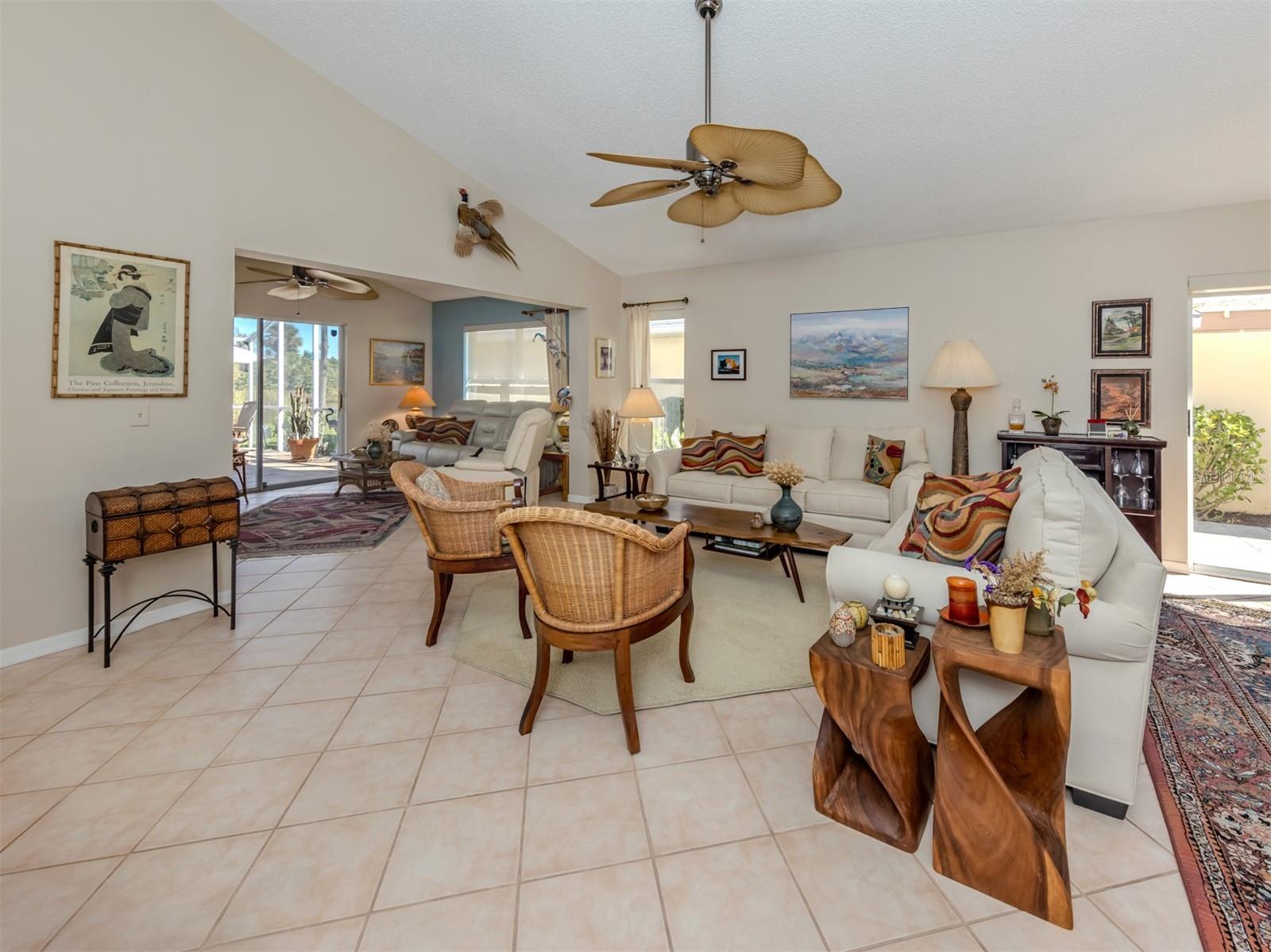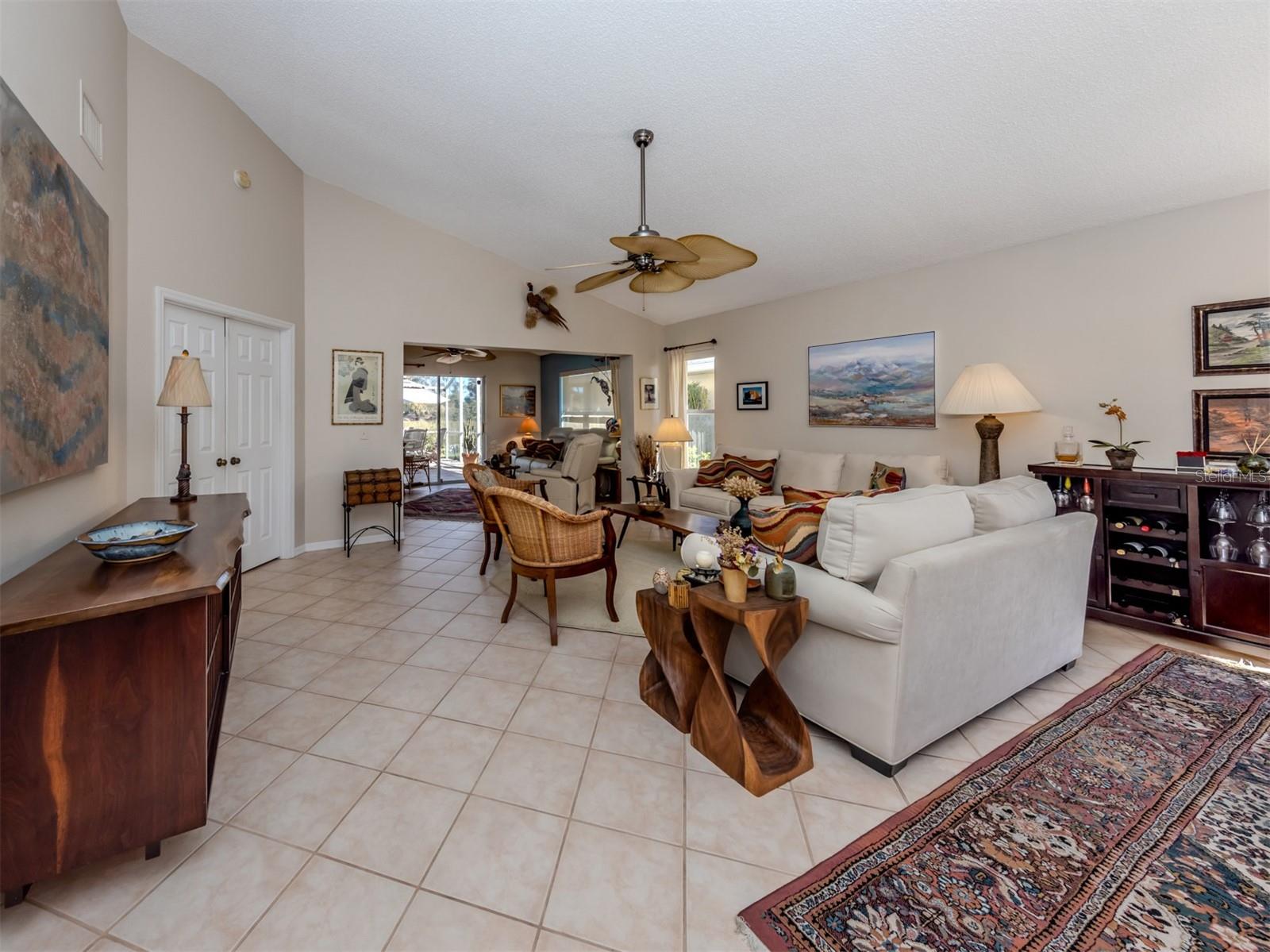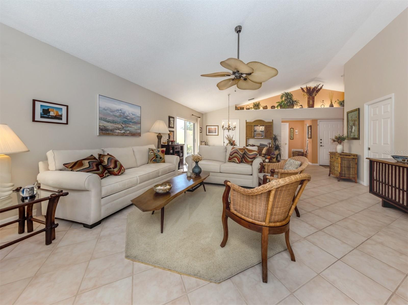 Desirable location with a lake view, privacy, and room for a pool, in Harrington Lake at The Plantation in Venice, Florida. Harrington Lake is a unique maintenance free community of villas with its own pool and very active clubhouse. Beautifully landscaped front entrance welcomes you into this delightful 1492 sq ft villa with an expansive lake view from the living areas. The home has a spacious primary suite and a guest bedroom, both with tastefully updated bathrooms. All floors are tiled except the guest room which is carpeted. Well equipped kitchen with lots of cabinets, and counter space, a kitchen nook, a closet pantry, and recessed lighting. Open dining/living area and family room connect seamlessly with the 20ft by 35ft screened, pavered lanai which draws you to this outdoor living space for entertaining, bird watching, or just enjoying the view. A pavered side patio , accessible from the kitchen and dining area, is perfect for barbequing, and enjoying morning coffee. The villa has been replumbed. Roof was replaced in April 2022. 2 car attached garage. The Plantation Golf & Country Club is nearby where a choice of memberships are available if you wish to join. A number of Florida's Gulf Coast beaches are 15 minutes away. Within a short drive there is everything to discover....historic Downtown Venice, vibrant Wellen Park, Cool Today Stadium, theater, performing arts, and limitless events and activities. Restaurants, shopping, and all services are conveniently located close to home.